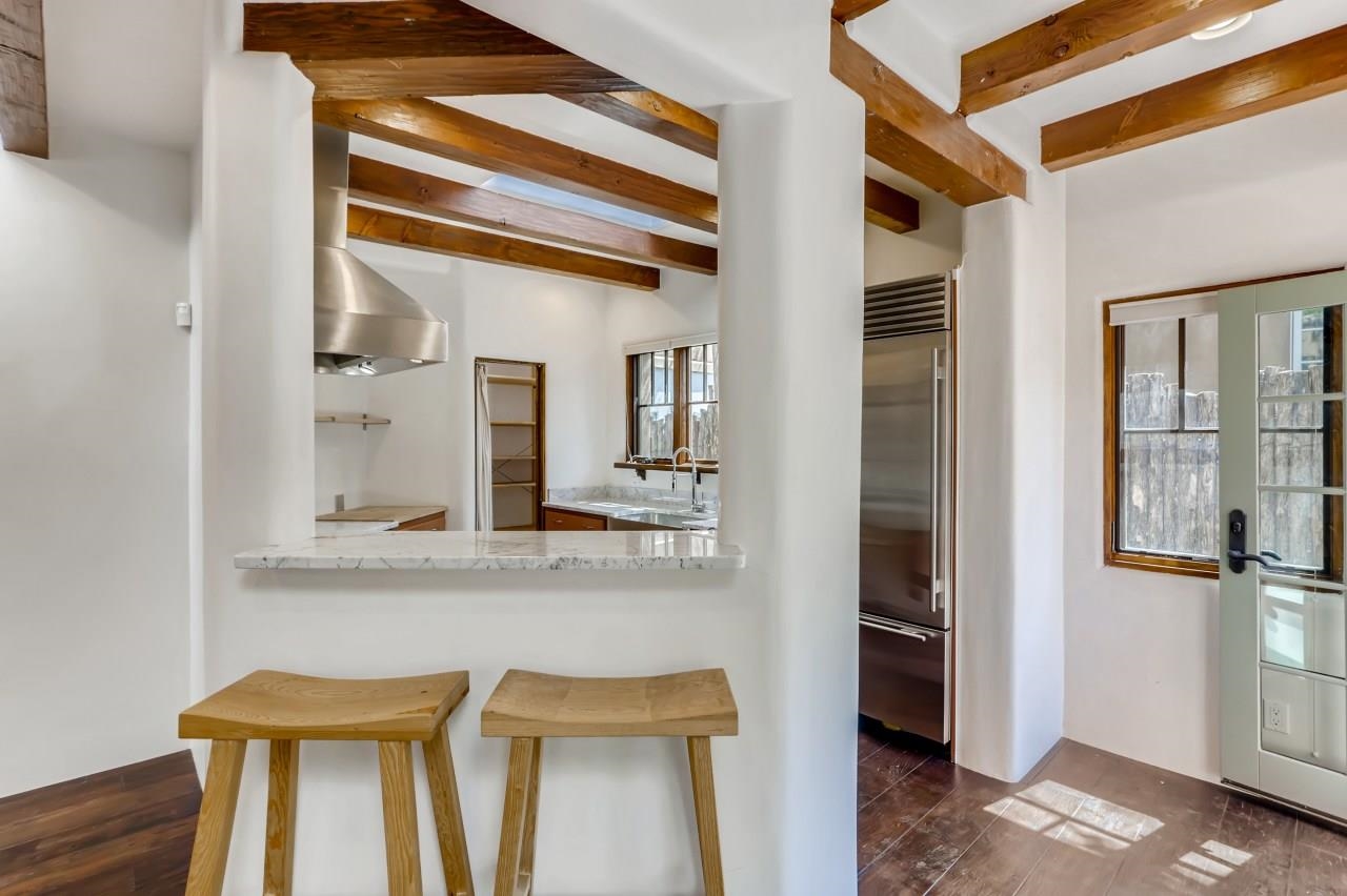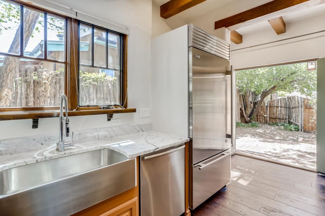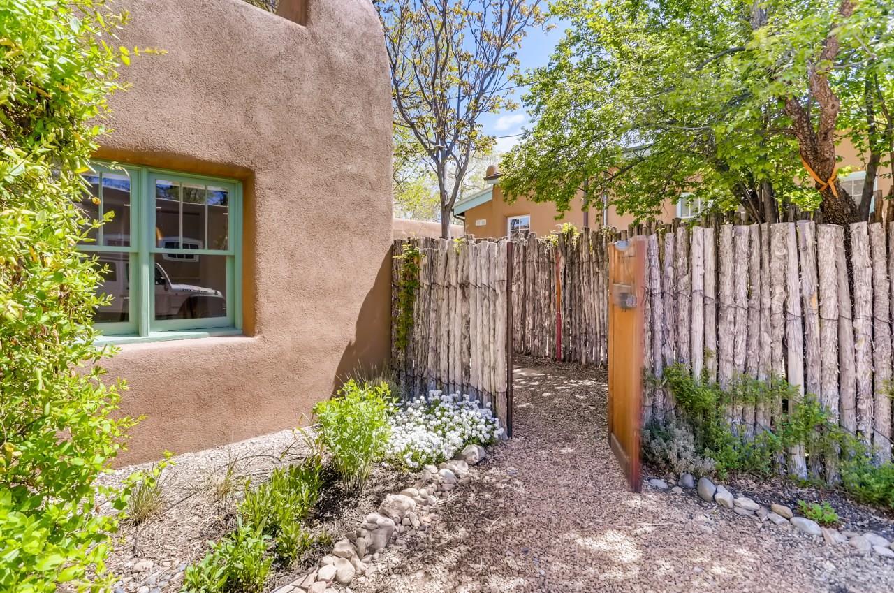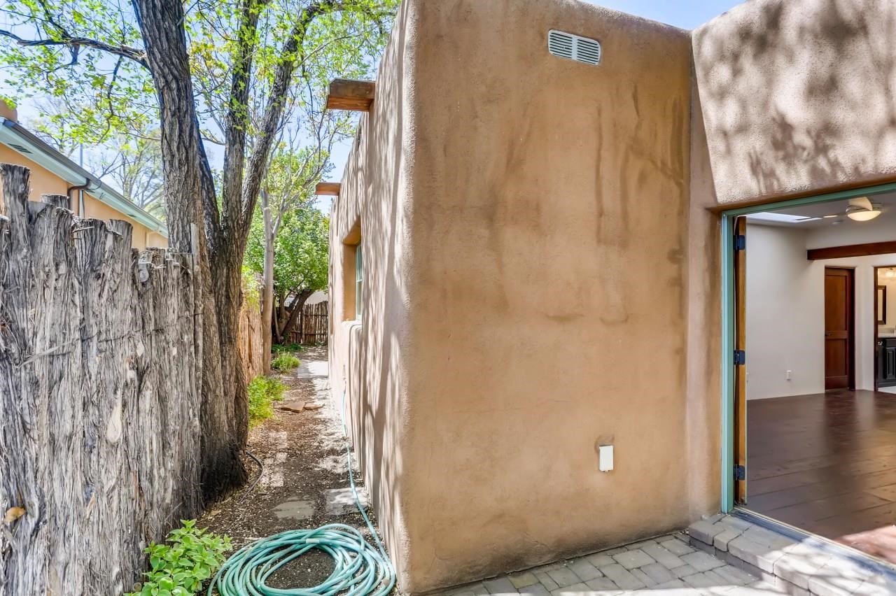 Rare find in the heart of the old east-side. This quintessential adobe (and frame) home is quietly tucked off the historic Acequia Madre stream and was gutted and restored 13 years ago to the elegant home it is today. The interior of the property is Santa Fe charming yet contemporary, light and functional. Generous and gorgeous kitchen space with top of the line appliances. Counter surfaces throughout are a tasteful marble and the floors are a warm wood plank and tile flooring. Lovely and private master suite opens up to a patio. Numerous upgrades include in-floor radiant heat, kiva fireplace, numerous skylights, custom cabinetry, beamed ceilings, central vac system and tasteful storage tucked behind the home. Intimate and private outdoor patios for warm weather dining or a quiet space to read a book with a glass of wine. After a long day, its only a few short steps to some of Santa Fe's most popular galleries and restaurants or walk to the plaza for evening entertainment, shopping or one of the many on-going annual activities.