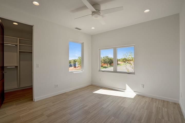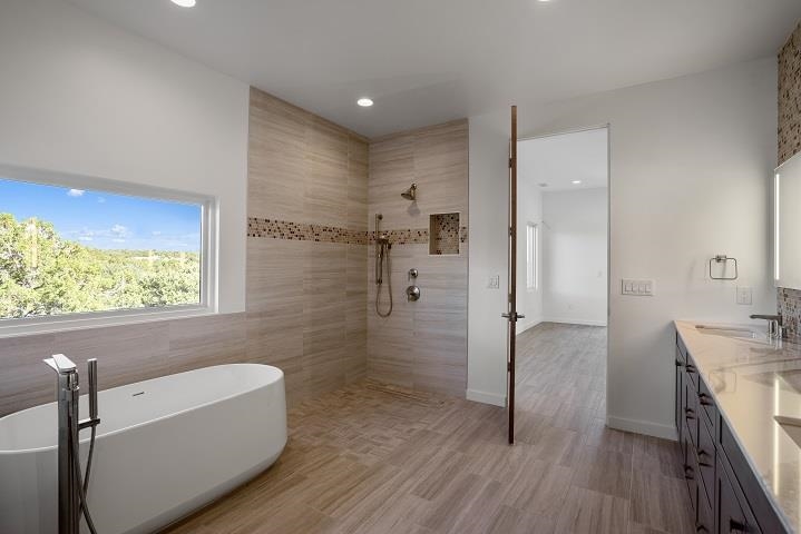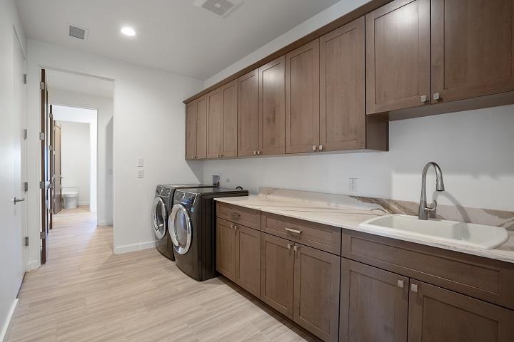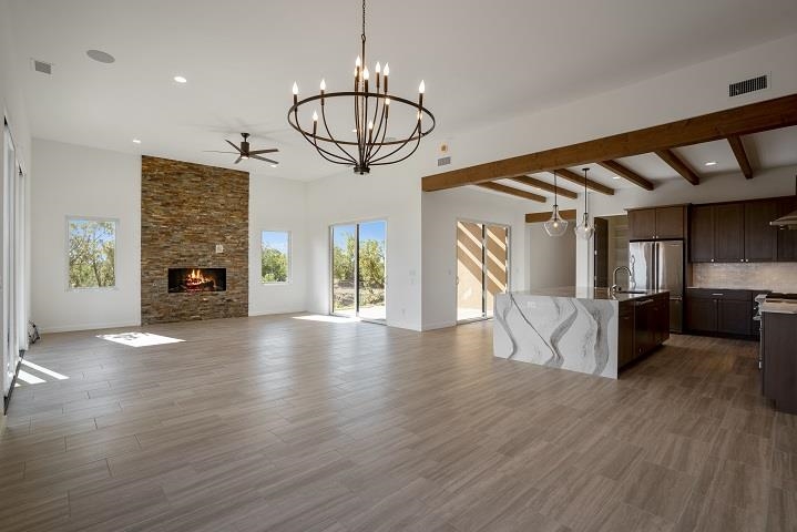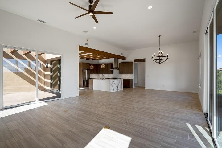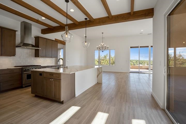 To Be Built near the Sunset Golf Course! Valverde's Sunrise Contemporary floor plan, Elevation A, has 2,802 SF, and is designed for comfort and easy livability. This single-level home has three bedrooms and 3 bathrooms. The living space includes a gourmet kitchen with solid wood cabinets, stainless-steel Viking appliances, quartz countertops, a huge pantry, and opens to the dining area and great room with 12-ft ceilings, and a low-profile gas fireplace with stone surround. A courtyard connects to the kitchen and great room for outdoor dining. A third portal beautifully captures the views. The large master suite has a portal, master bathroom with curbless, walk-in shower, soaking tub, dual sinks, and walk-in closet. The guest bedrooms are on the opposite side of the home, each with their own bathroom. The two-car garage has the option to add a third garage or studio. Choose your interior finishes, color choices and other options. A low-maintenance landscape package is included and can be expanded with water features, fire pit, outdoor kitchen/BBQ. HOA fees include road and common area maintenance, 24-hour roaming security, and 24-hour EMTs on site. Membership to The Club at Las Campanas is optional. Amenities include indoor and outdoor swimming, tennis, fitness facility, equestrian, fine dining, and two Jack Nicklaus Signature Golf Courses. (Photos are representational only.)