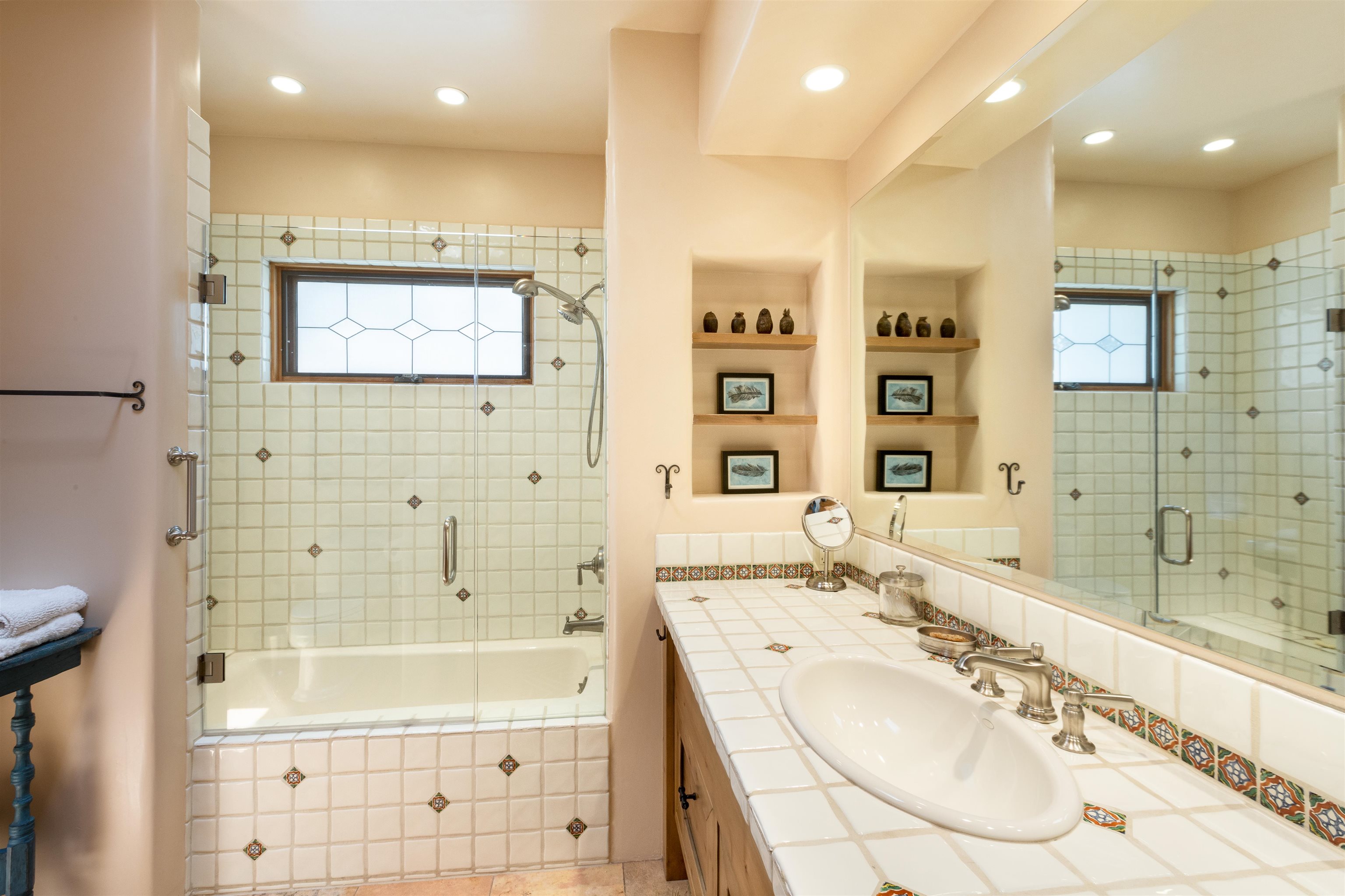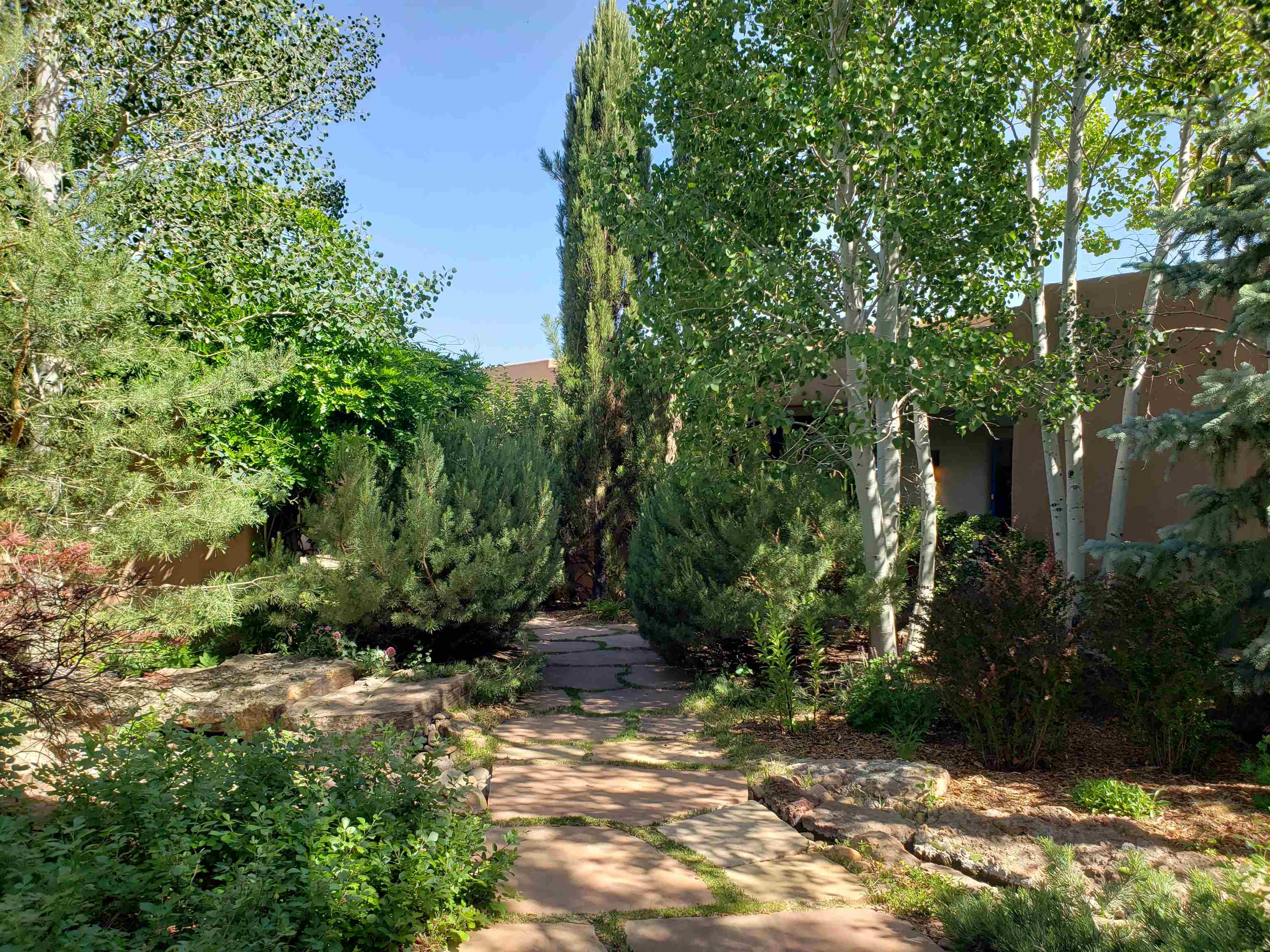 Minutes from the Plaza and above the historic Eastside this inviting home captures magnificent mountain and city light views all behind the gated sought after community of Ocaso Del Sol. Enter through a lovely gated entrance into lush Courtyard with a stream cascading through rocks and under the entry walk way. The main pueblo home has rich finishes of plaster walls, tile floors, and fabulous ceiling treatments throughout with beams, corbels & vigas. This estate exudes timeless old-world style such as the shepherd fireplace in the formal living room. The main house has a desirable floorplan with 3 bedrooms each ensuite with fireplaces offering privacy and French doors to wonderful outdoor living spaces. Live comfortably in the many lovely informal and formal rooms including an office. Enjoy the extensive West portal with custom kiva fireplace, built in bancos, built in grill and exceptional views, perfect for entertaining. Also accessed through the entry courtyard is the separate, fully appointed, one bedroom guest house. The style continues with a river rock fireplace, wood floors, kitchen and spacious bath. Off the west portal there is a studio with its own comfortable portal and separate entrance. Mature landscaping, a 3-car heated garage and so much ambiance...it's all here!