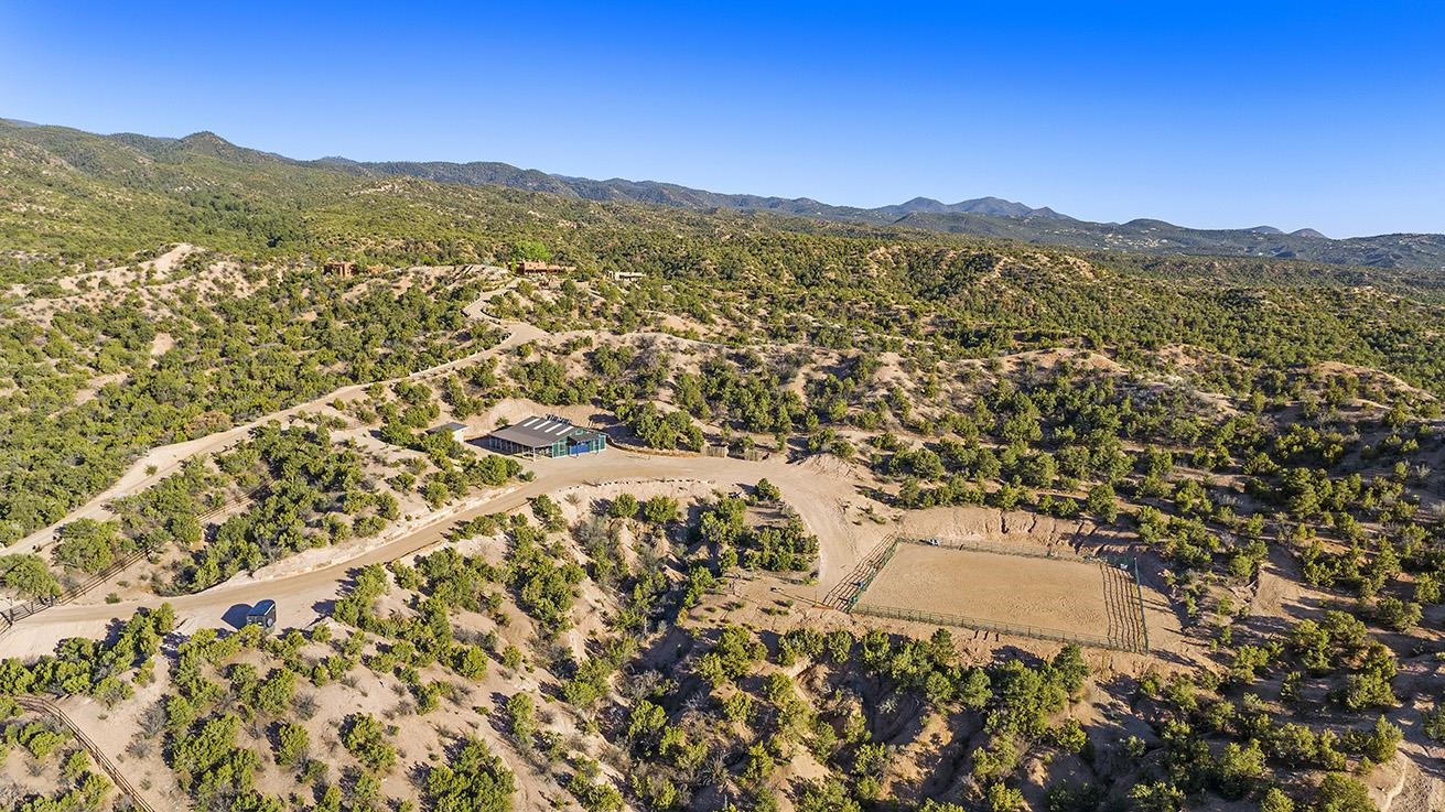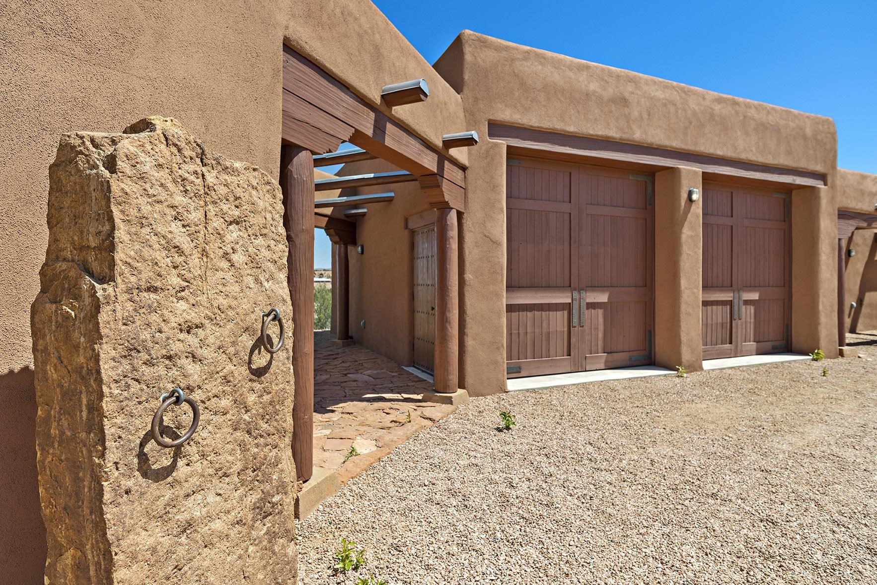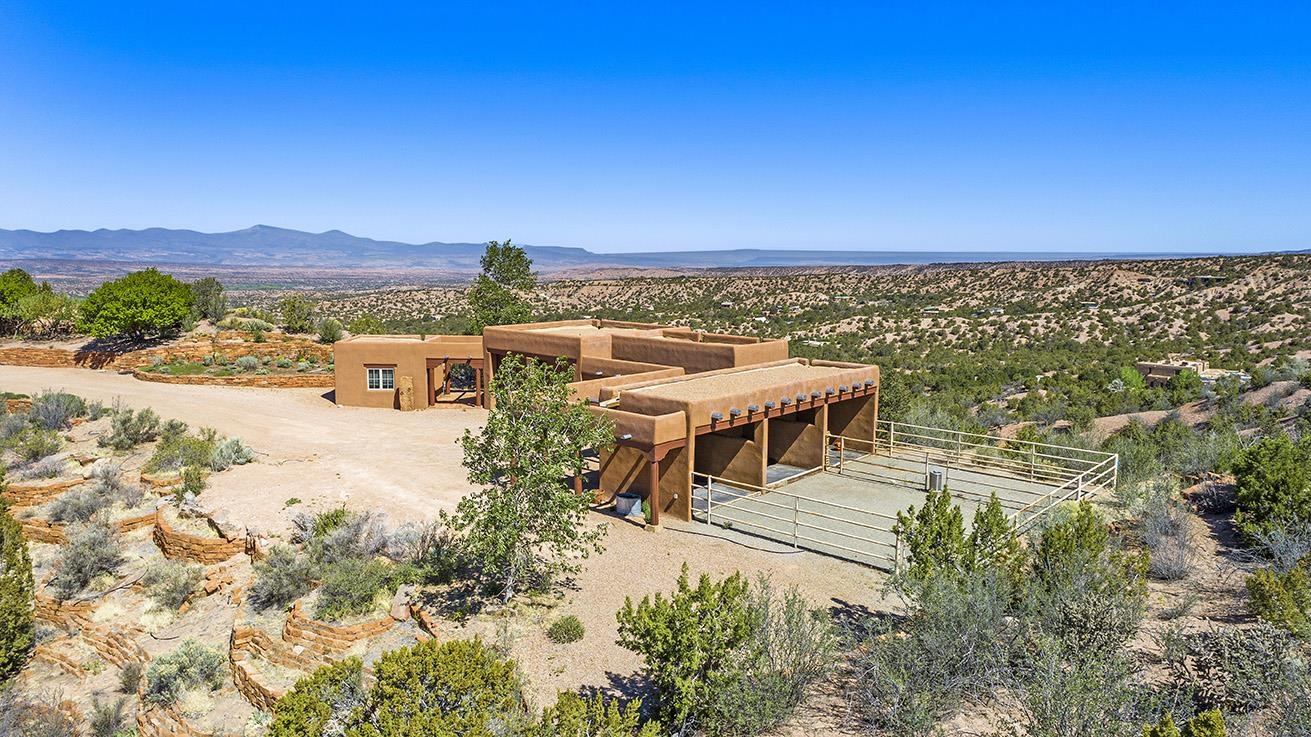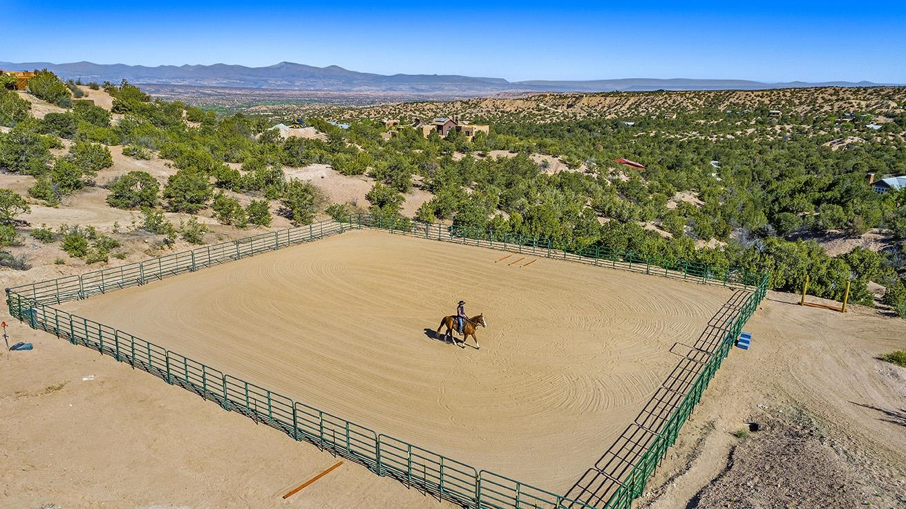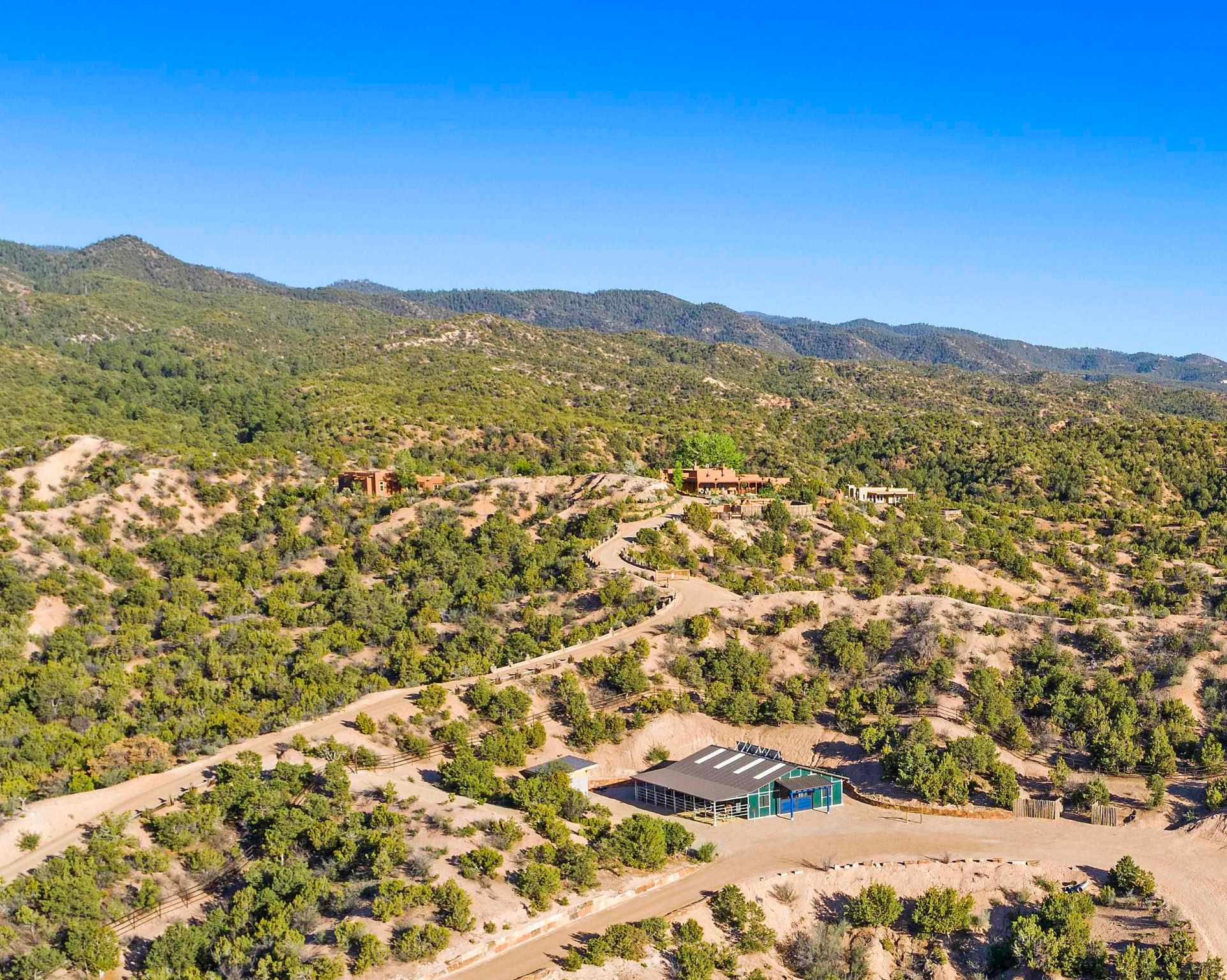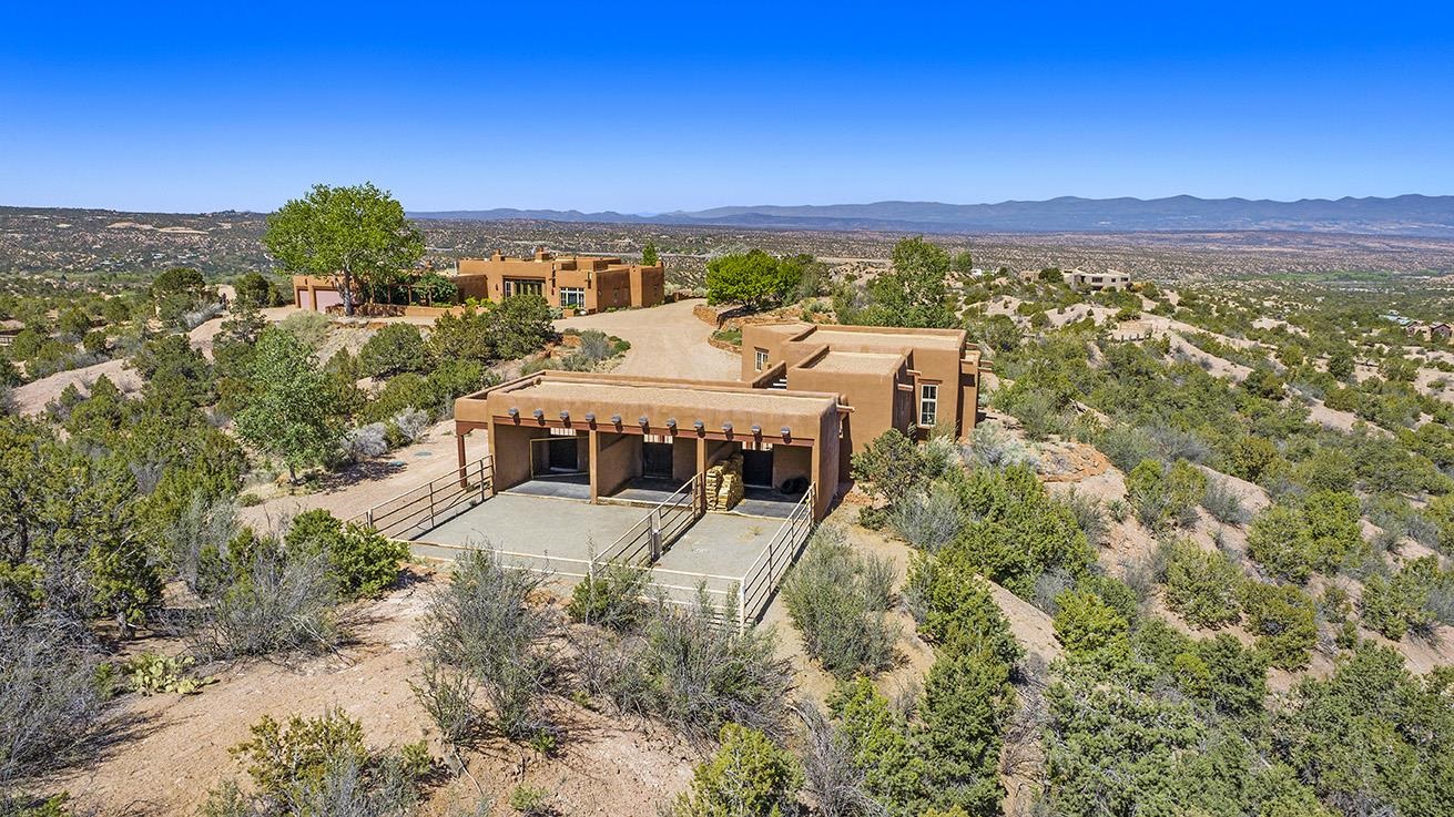 Newly transformed, this updated 25-acre compound in the Tesuque foothills has been reimagined to include a custom-developed equestrian facility, a separate and secure dog park, a bocce court overlooking the Sangre de Cristo Mountains, and much more, making this a unique offering where one can experience private living and ranch amenities just 15 minutes from historic downtown Santa Fe.Gated and at the end of the road, the property is nestled against National Forest, and features unobstructed 360 views and access to an expansive trail system. The beautifully appointed 3,278 square foot main house boasts timeless details and finishes to accent artful living inside and out.The warmth of thick adobe walls, hand-honed custom cabinetry, and hardware resonates with old-world charm. Cascading rock gardens, a romantic rose garden, and portals lead to a wine cellar and an inviting 838-square-foot guest house.The new equestrian features include a custom MD Barnmaster stable with four stalls with heated waterers and geothermal radiant heat, a wash stall, and a 288 square foot tack room lounge with bathroom and wet bar, including mini-split systems. The electricity is powered by solar with a propane generator backup system. Connected to the barn is a beautiful open-air arena with sweeping views surrounded by a private hand-dug trail system adding to the expansiveness of the property. Additionally, the newly extended water and electrical infrastructure allows one to customize the facility further.Other features near the main house include 5-car garages, an office/personal gym, beautiful courtyards and vista views throughout the property, a private gated entry and a security system in the main house, as well as the original three-stall barn with turnouts, a tack room, and access to Santa Fe National Forest. So whether you are interested in a custom luxury equestrian compound or creating a private retreat, the infrastructure is ready for you and your imagination.