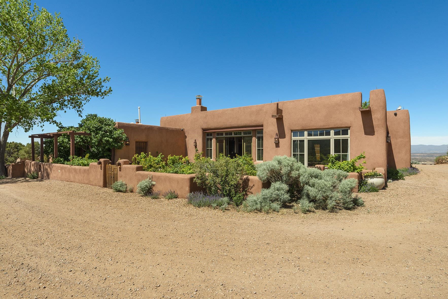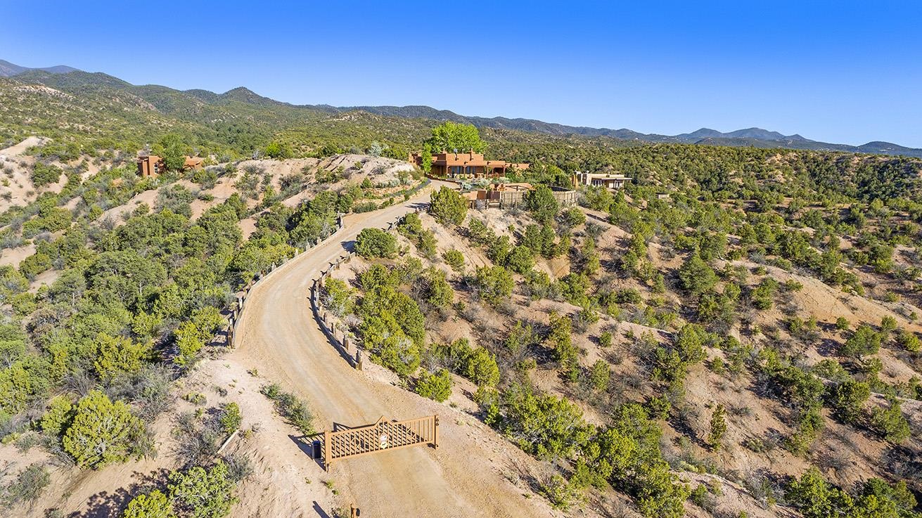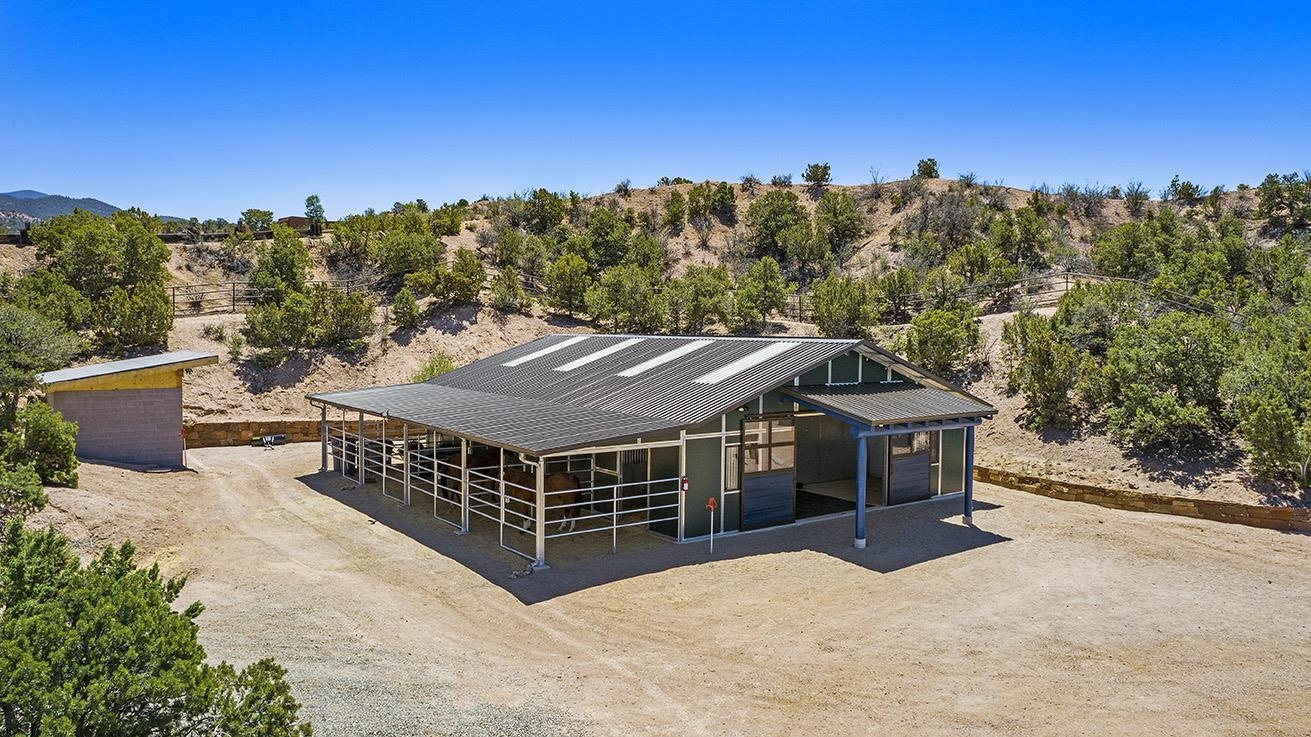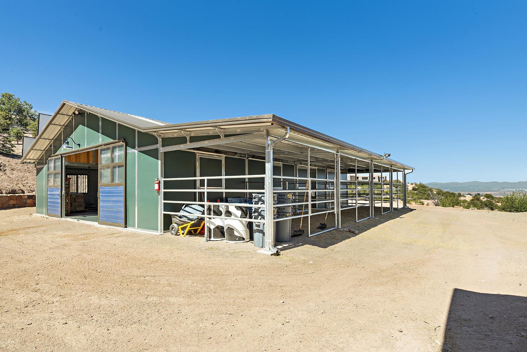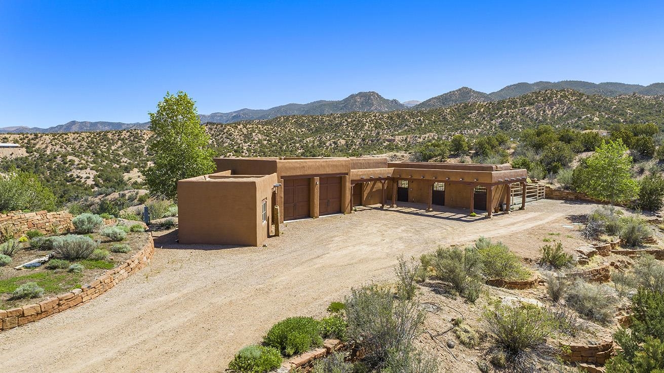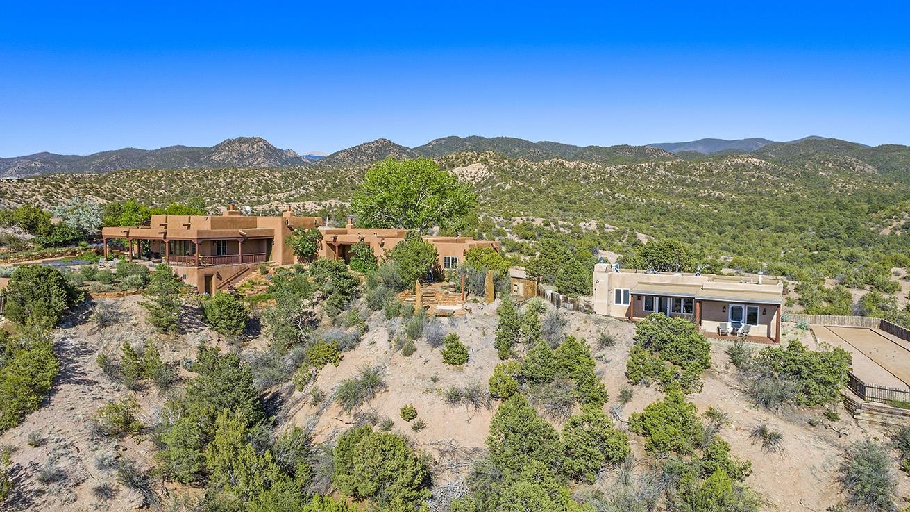 Newly transformed, this updated 25-acre compound in the Tesuque foothills has been reimagined to include a custom-developed equestrian facility, a separate and secure dog park, a bocce court overlooking the Sangre de Cristo Mountains, and much more, making this a unique offering where one can experience private living and ranch amenities just 15 minutes from historic downtown Santa Fe.Gated and at the end of the road, the property is nestled against National Forest, and features unobstructed 360 views and access to an expansive trail system. The beautifully appointed 3,278 square foot main house boasts timeless details and finishes to accent artful living inside and out.The warmth of thick adobe walls, hand-honed custom cabinetry, and hardware resonates with old-world charm. Cascading rock gardens, a romantic rose garden, and portals lead to a wine cellar and an inviting 838-square-foot guest house.The new equestrian features include a custom MD Barnmaster stable with four stalls with heated waterers and geothermal radiant heat, a wash stall, and a 288 square foot tack room lounge with bathroom and wet bar, including mini-split systems. The electricity is powered by solar with a propane generator backup system. Connected to the barn is a beautiful open-air arena with sweeping views surrounded by a private hand-dug trail system adding to the expansiveness of the property. Additionally, the newly extended water and electrical infrastructure allows one to customize the facility further.Other features near the main house include 5-car garages, an office/personal gym, beautiful courtyards and vista views throughout the property, a private gated entry and a security system in the main house, as well as the original three-stall barn with turnouts, a tack room, and access to Santa Fe National Forest. So whether you are interested in a custom luxury equestrian compound or creating a private retreat, the infrastructure is ready for you and your imagination.