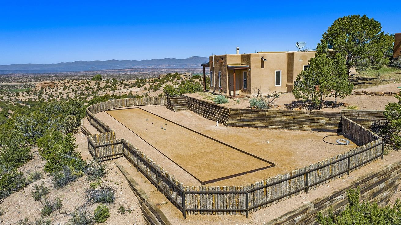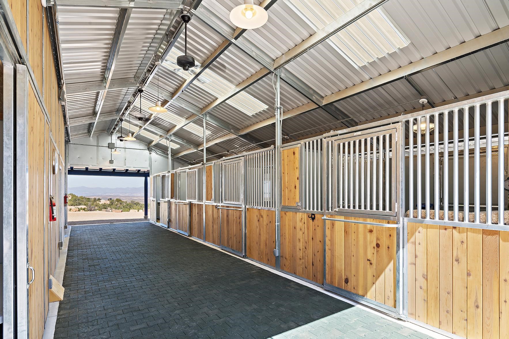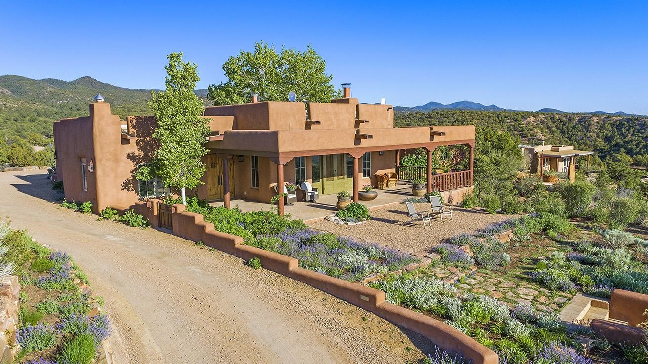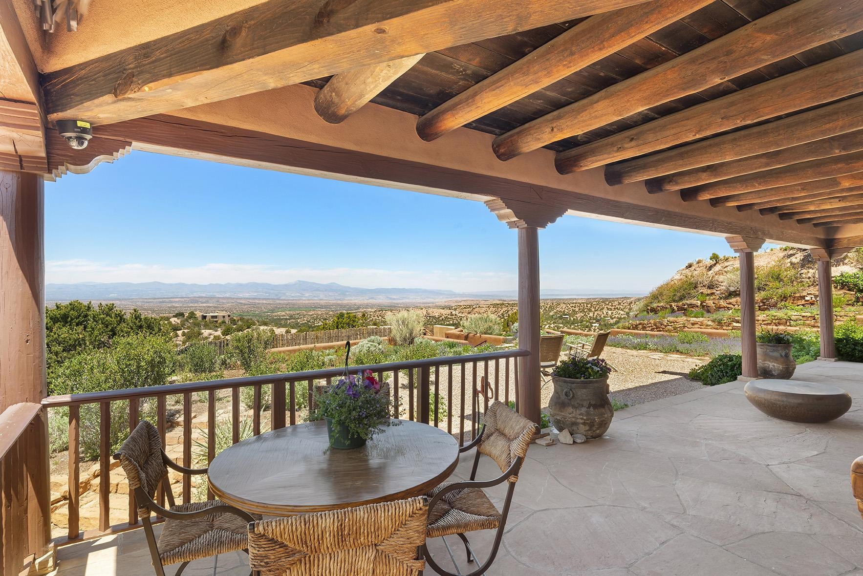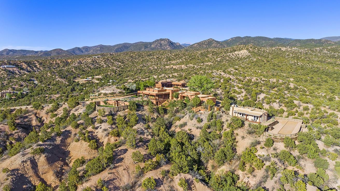 Newly transformed, this updated 25-acre compound in the Tesuque foothills has been reimagined to include a custom-developed equestrian facility, a separate and secure dog park, a bocce court overlooking the Sangre de Cristo Mountains, and much more, making this a unique offering where one can experience private living and ranch amenities just 15 minutes from historic downtown Santa Fe.Gated and at the end of the road, the property is nestled against National Forest, and features unobstructed 360 views and access to an expansive trail system. The beautifully appointed 3,278 square foot main house boasts timeless details and finishes to accent artful living inside and out.The warmth of thick adobe walls, hand-honed custom cabinetry, and hardware resonates with old-world charm. Cascading rock gardens, a romantic rose garden, and portals lead to a wine cellar and an inviting 838-square-foot guest house.The new equestrian features include a custom MD Barnmaster stable with four stalls with heated waterers and geothermal radiant heat, a wash stall, and a 288 square foot tack room lounge with bathroom and wet bar, including mini-split systems. The electricity is powered by solar with a propane generator backup system. Connected to the barn is a beautiful open-air arena with sweeping views surrounded by a private hand-dug trail system adding to the expansiveness of the property. Additionally, the newly extended water and electrical infrastructure allows one to customize the facility further.Other features near the main house include 5-car garages, an office/personal gym, beautiful courtyards and vista views throughout the property, a private gated entry and a security system in the main house, as well as the original three-stall barn with turnouts, a tack room, and access to Santa Fe National Forest. So whether you are interested in a custom luxury equestrian compound or creating a private retreat, the infrastructure is ready for you and your imagination.