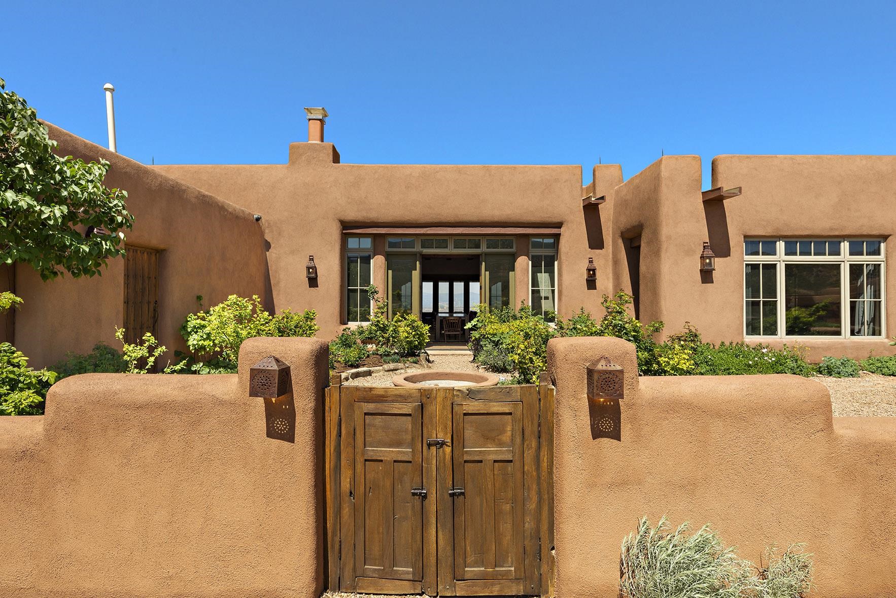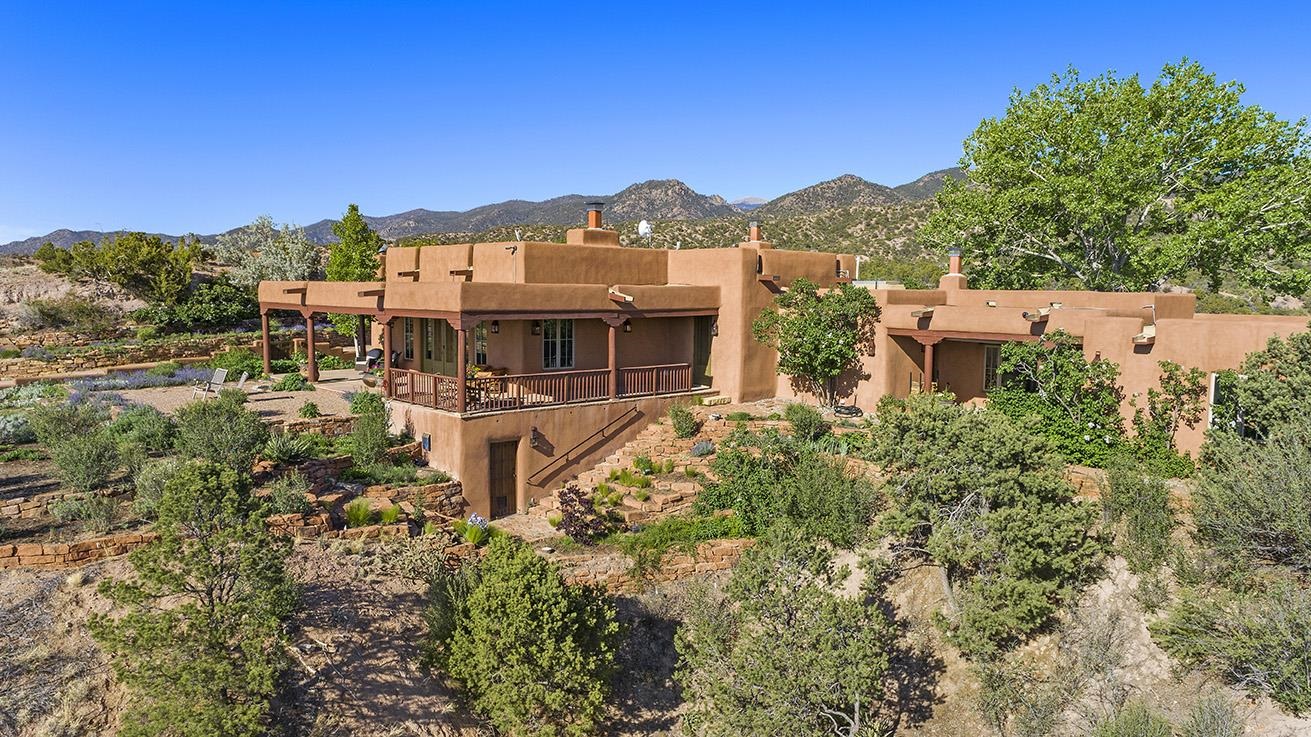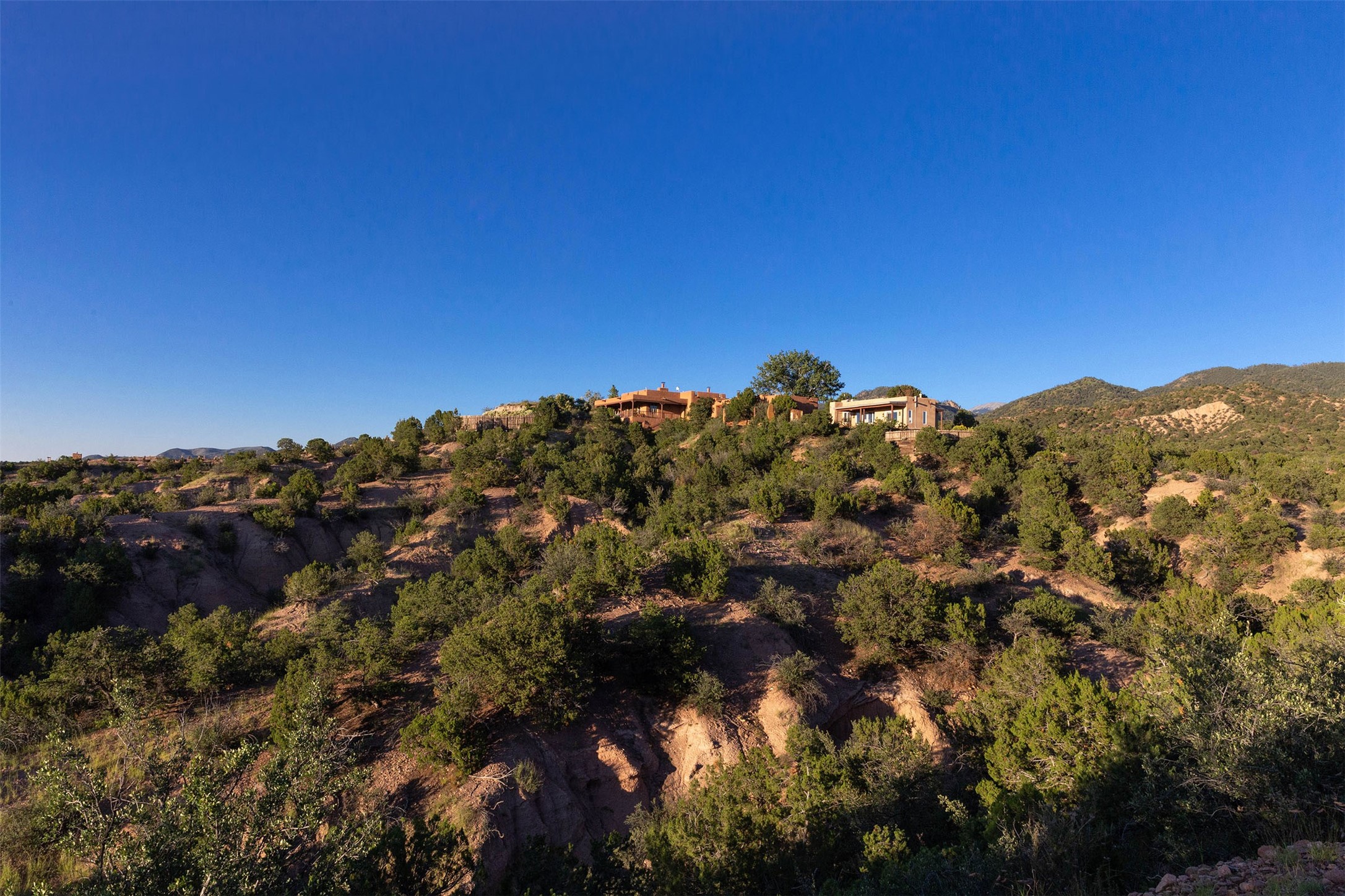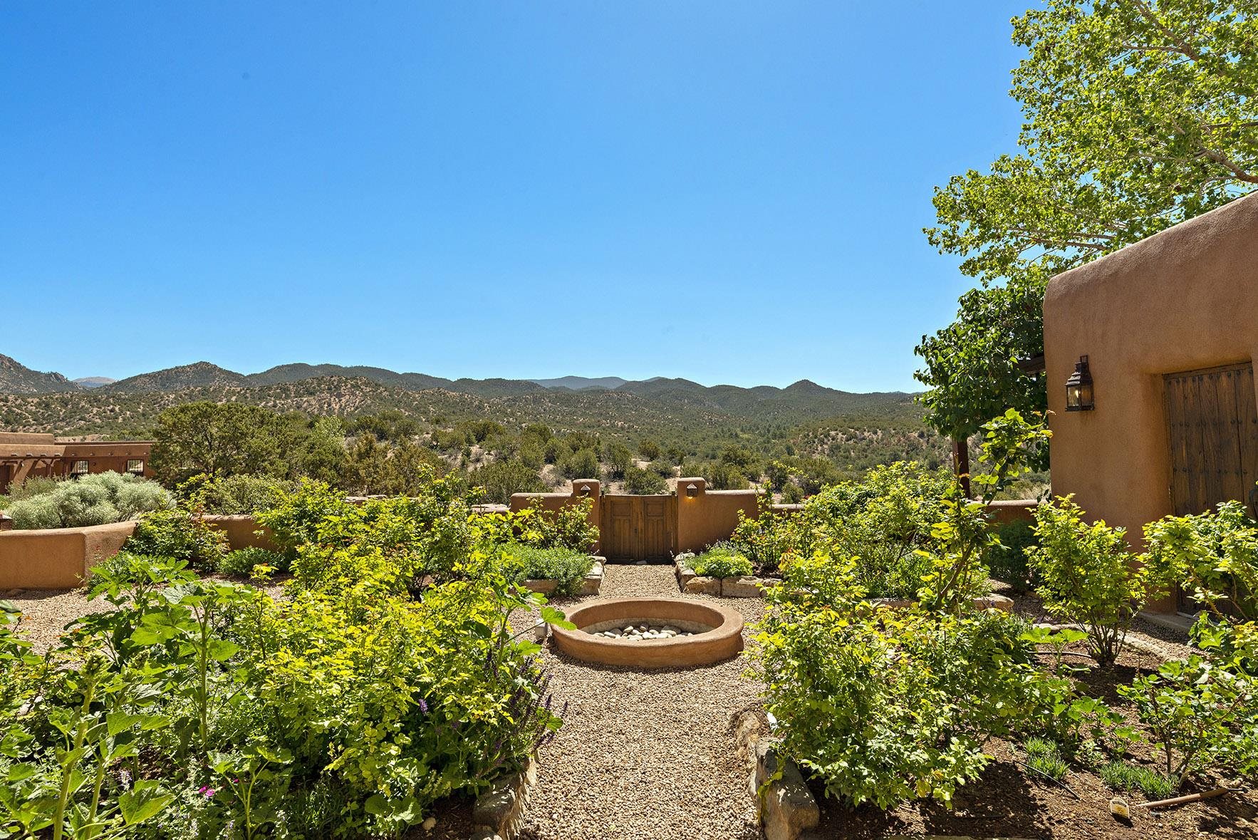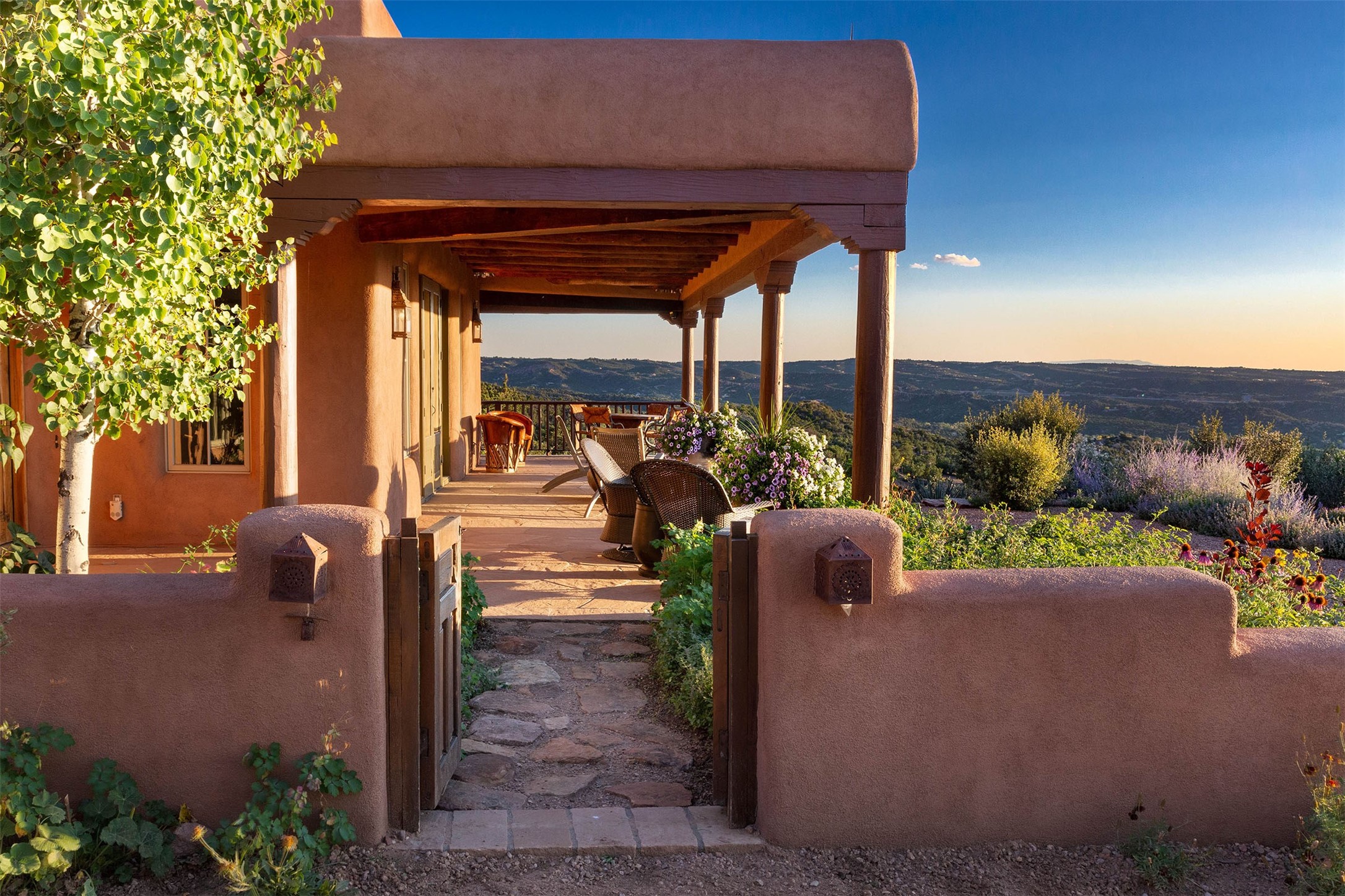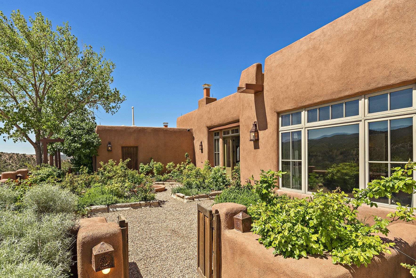 Newly transformed, this updated 25-acre compound in the Tesuque foothills has been reimagined to include a custom-developed equestrian facility, a separate and secure dog park, a bocce court overlooking the Sangre de Cristo Mountains, and much more, making this a unique offering where one can experience private living and ranch amenities just 15 minutes from historic downtown Santa Fe.Gated and at the end of the road, the property is nestled against National Forest, and features unobstructed 360 views and access to an expansive trail system. The beautifully appointed 3,278 square foot main house boasts timeless details and finishes to accent artful living inside and out.The warmth of thick adobe walls, hand-honed custom cabinetry, and hardware resonates with old-world charm. Cascading rock gardens, a romantic rose garden, and portals lead to a wine cellar and an inviting 838-square-foot guest house.The new equestrian features include a custom MD Barnmaster stable with four stalls with heated waterers and geothermal radiant heat, a wash stall, and a 288 square foot tack room lounge with bathroom and wet bar, including mini-split systems. The electricity is powered by solar with a propane generator backup system. Connected to the barn is a beautiful open-air arena with sweeping views surrounded by a private hand-dug trail system adding to the expansiveness of the property. Additionally, the newly extended water and electrical infrastructure allows one to customize the facility further.Other features near the main house include 5-car garages, an office/personal gym, beautiful courtyards and vista views throughout the property, a private gated entry and a security system in the main house, as well as the original three-stall barn with turnouts, a tack room, and access to Santa Fe National Forest. So whether you are interested in a custom luxury equestrian compound or creating a private retreat, the infrastructure is ready for you and your imagination.