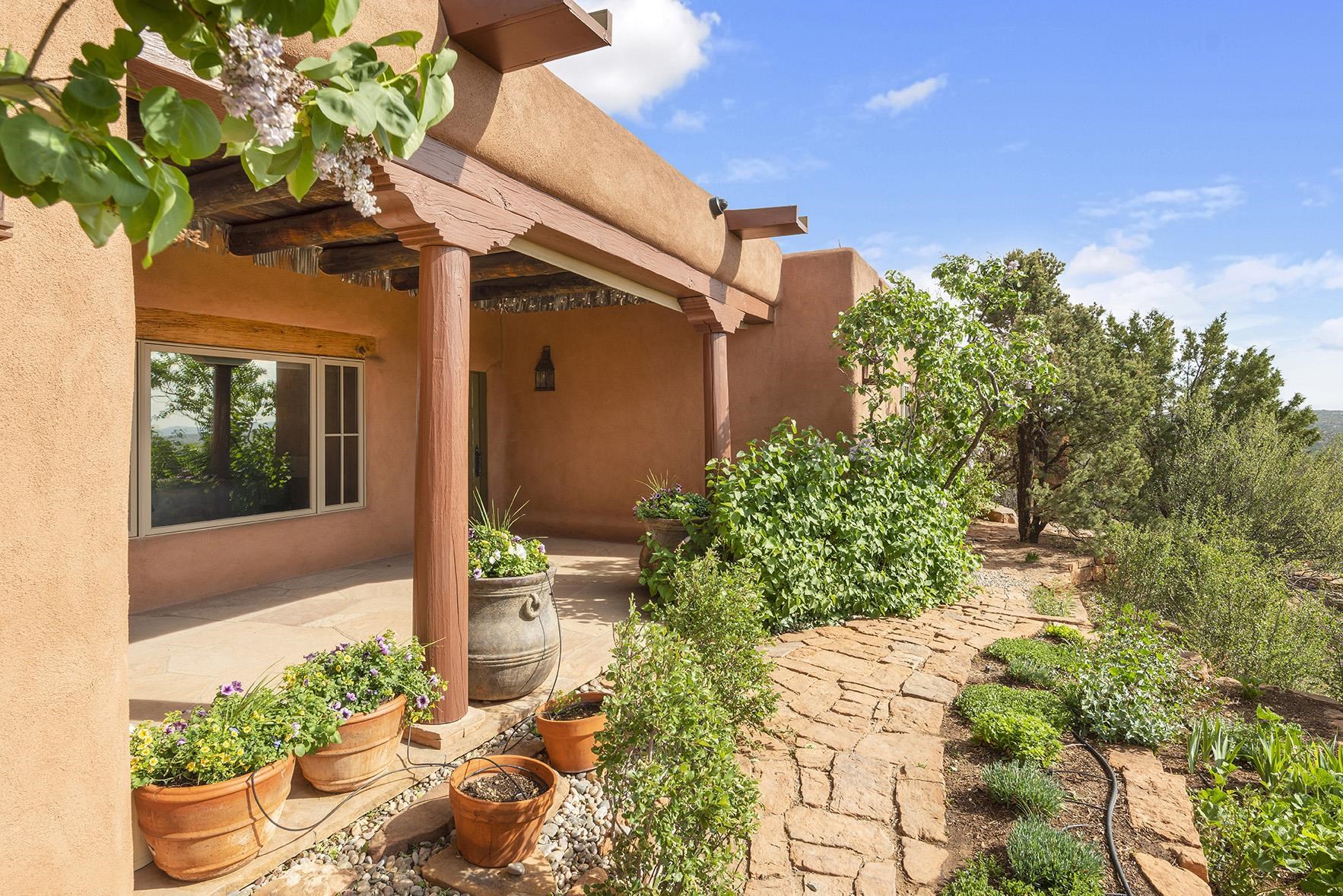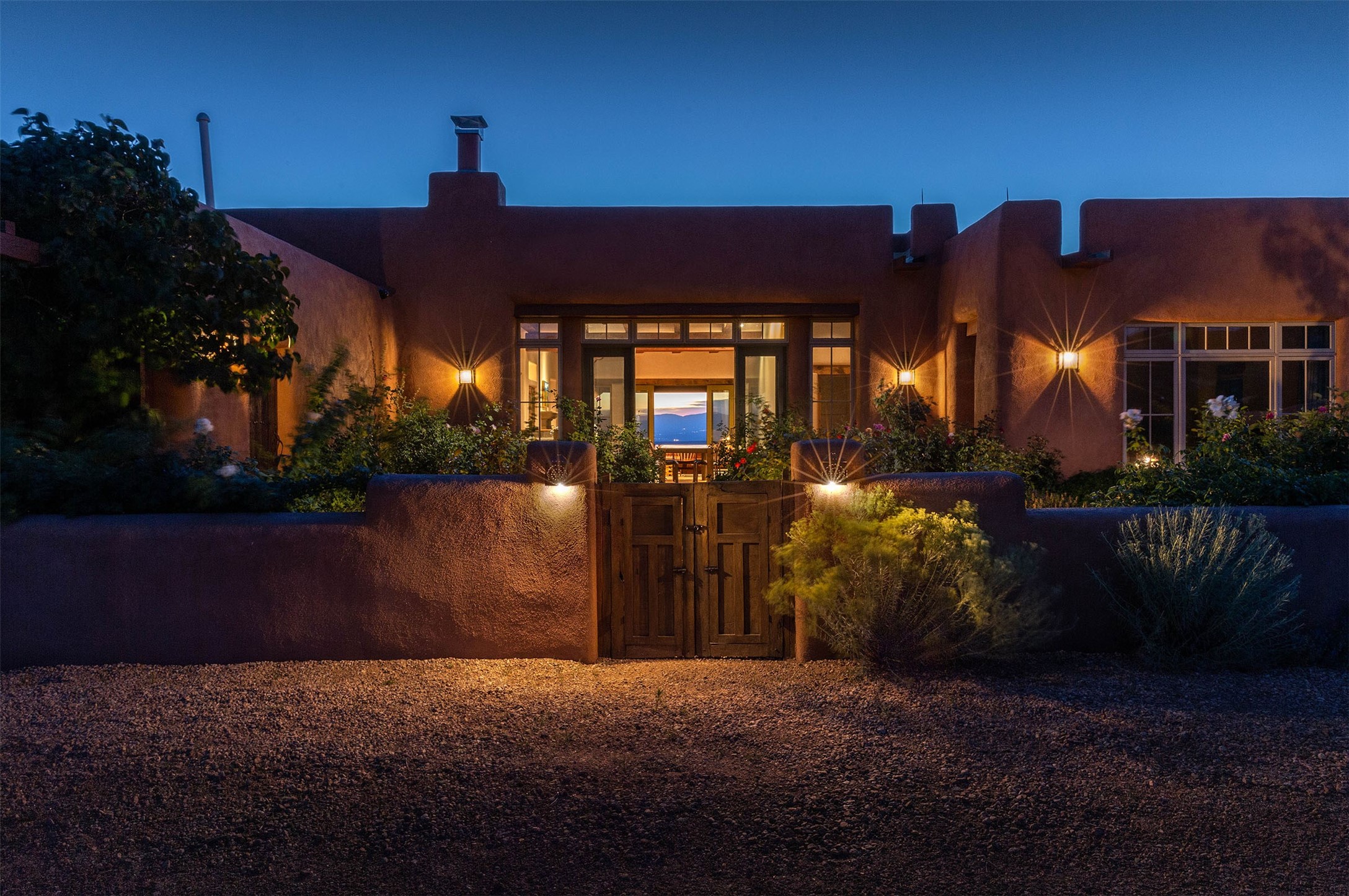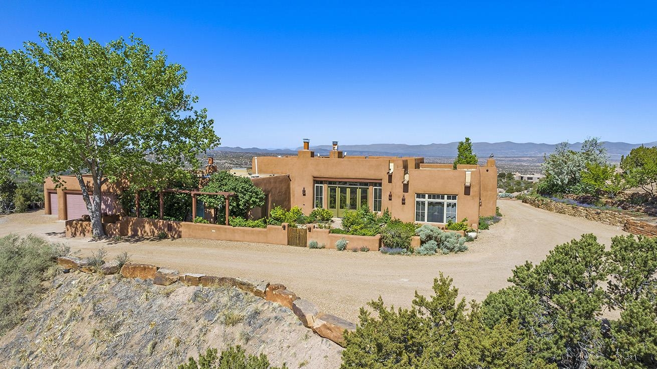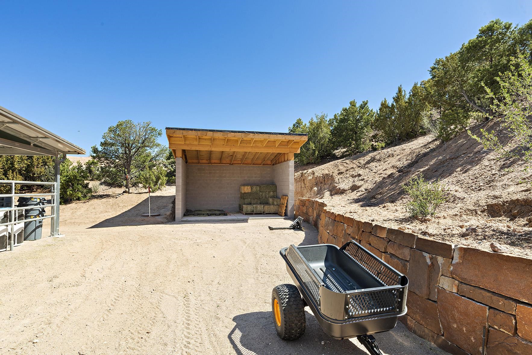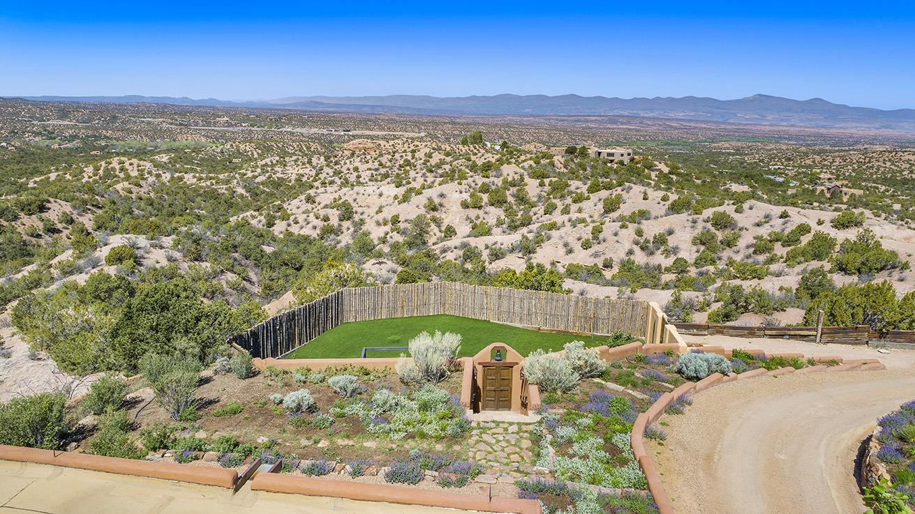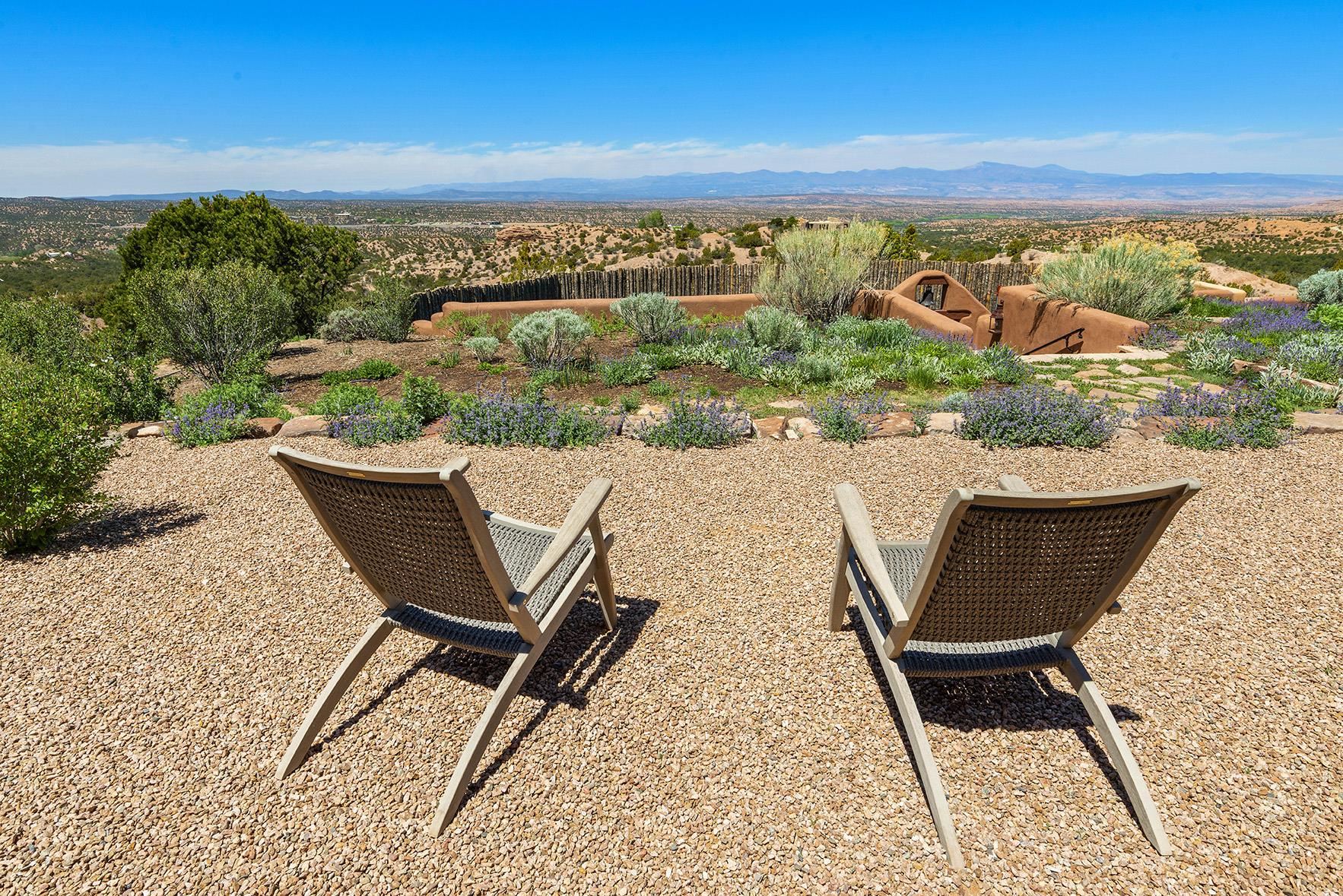 Newly transformed, this updated 25-acre compound in the Tesuque foothills has been reimagined to include a custom-developed equestrian facility, a separate and secure dog park, a bocce court overlooking the Sangre de Cristo Mountains, and much more, making this a unique offering where one can experience private living and ranch amenities just 15 minutes from historic downtown Santa Fe.Gated and at the end of the road, the property is nestled against National Forest, and features unobstructed 360 views and access to an expansive trail system. The beautifully appointed 3,278 square foot main house boasts timeless details and finishes to accent artful living inside and out.The warmth of thick adobe walls, hand-honed custom cabinetry, and hardware resonates with old-world charm. Cascading rock gardens, a romantic rose garden, and portals lead to a wine cellar and an inviting 838-square-foot guest house.The new equestrian features include a custom MD Barnmaster stable with four stalls with heated waterers and geothermal radiant heat, a wash stall, and a 288 square foot tack room lounge with bathroom and wet bar, including mini-split systems. The electricity is powered by solar with a propane generator backup system. Connected to the barn is a beautiful open-air arena with sweeping views surrounded by a private hand-dug trail system adding to the expansiveness of the property. Additionally, the newly extended water and electrical infrastructure allows one to customize the facility further.Other features near the main house include 5-car garages, an office/personal gym, beautiful courtyards and vista views throughout the property, a private gated entry and a security system in the main house, as well as the original three-stall barn with turnouts, a tack room, and access to Santa Fe National Forest. So whether you are interested in a custom luxury equestrian compound or creating a private retreat, the infrastructure is ready for you and your imagination.