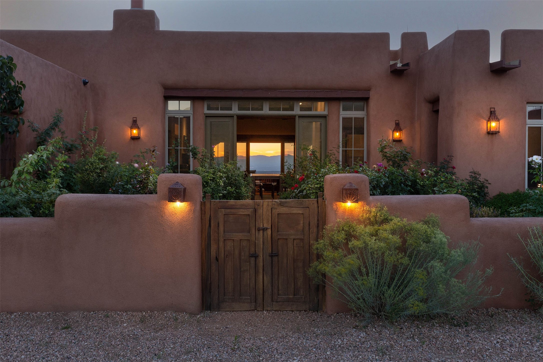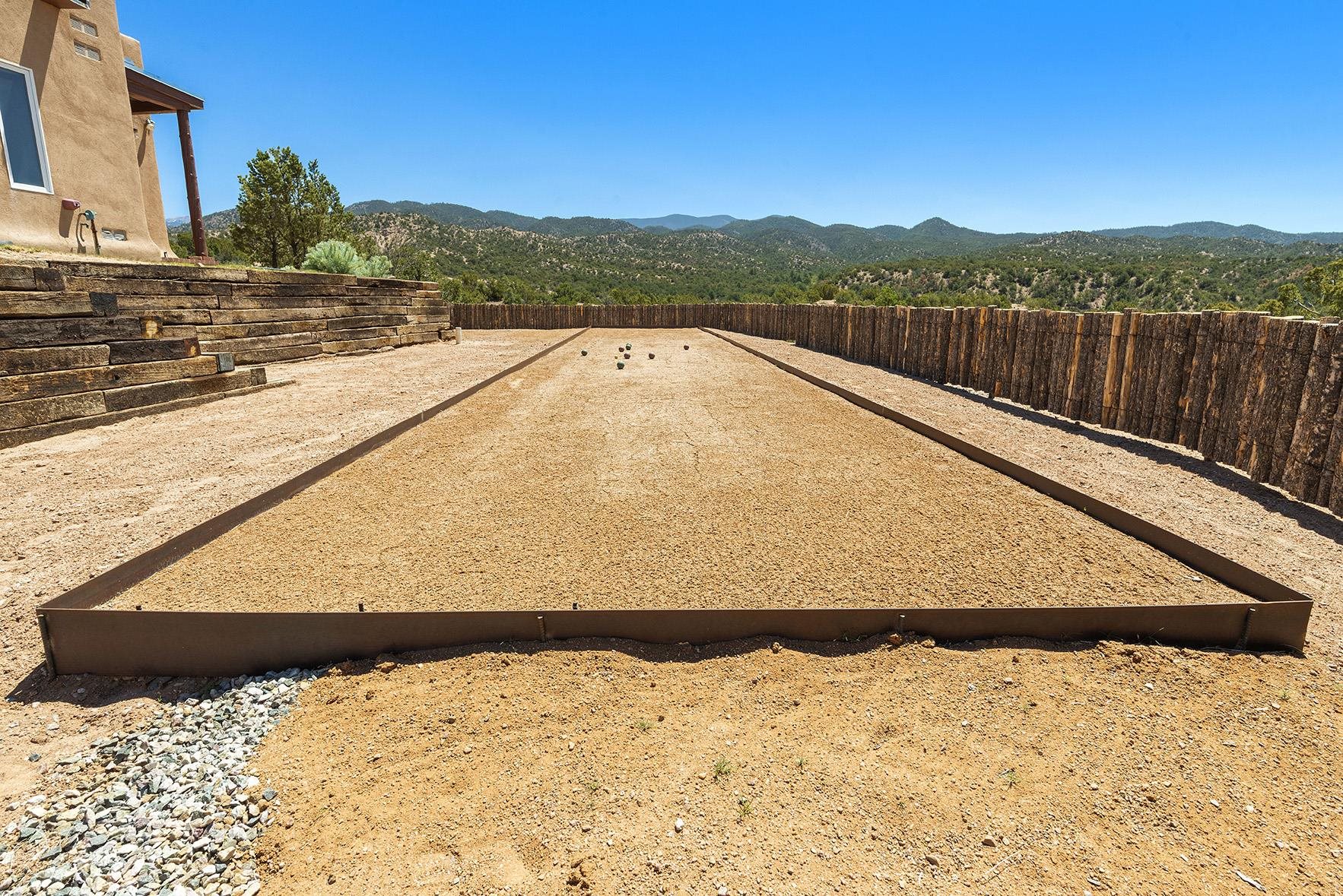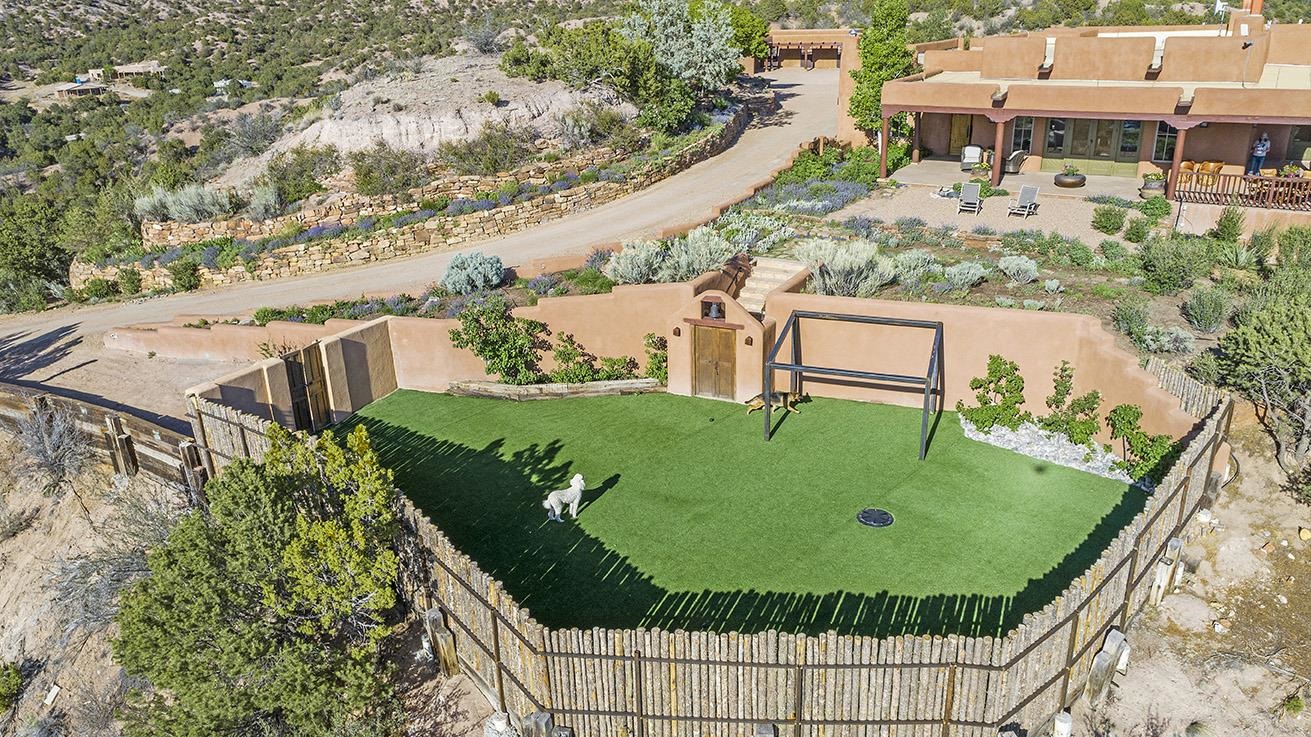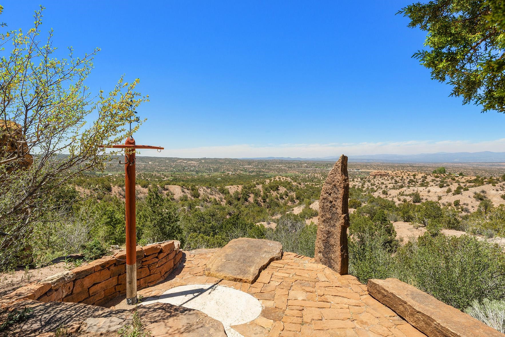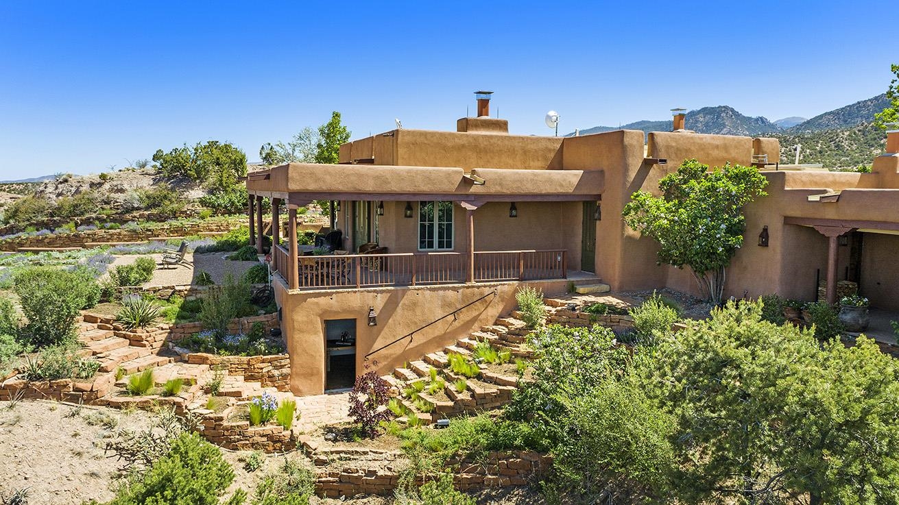 Newly transformed, this updated 25-acre compound in the Tesuque foothills has been reimagined to include a custom-developed equestrian facility, a separate and secure dog park, a bocce court overlooking the Sangre de Cristo Mountains, and much more, making this a unique offering where one can experience private living and ranch amenities just 15 minutes from historic downtown Santa Fe.Gated and at the end of the road, the property is nestled against National Forest, and features unobstructed 360 views and access to an expansive trail system. The beautifully appointed 3,278 square foot main house boasts timeless details and finishes to accent artful living inside and out.The warmth of thick adobe walls, hand-honed custom cabinetry, and hardware resonates with old-world charm. Cascading rock gardens, a romantic rose garden, and portals lead to a wine cellar and an inviting 838-square-foot guest house.The new equestrian features include a custom MD Barnmaster stable with four stalls with heated waterers and geothermal radiant heat, a wash stall, and a 288 square foot tack room lounge with bathroom and wet bar, including mini-split systems. The electricity is powered by solar with a propane generator backup system. Connected to the barn is a beautiful open-air arena with sweeping views surrounded by a private hand-dug trail system adding to the expansiveness of the property. Additionally, the newly extended water and electrical infrastructure allows one to customize the facility further.Other features near the main house include 5-car garages, an office/personal gym, beautiful courtyards and vista views throughout the property, a private gated entry and a security system in the main house, as well as the original three-stall barn with turnouts, a tack room, and access to Santa Fe National Forest. So whether you are interested in a custom luxury equestrian compound or creating a private retreat, the infrastructure is ready for you and your imagination.
