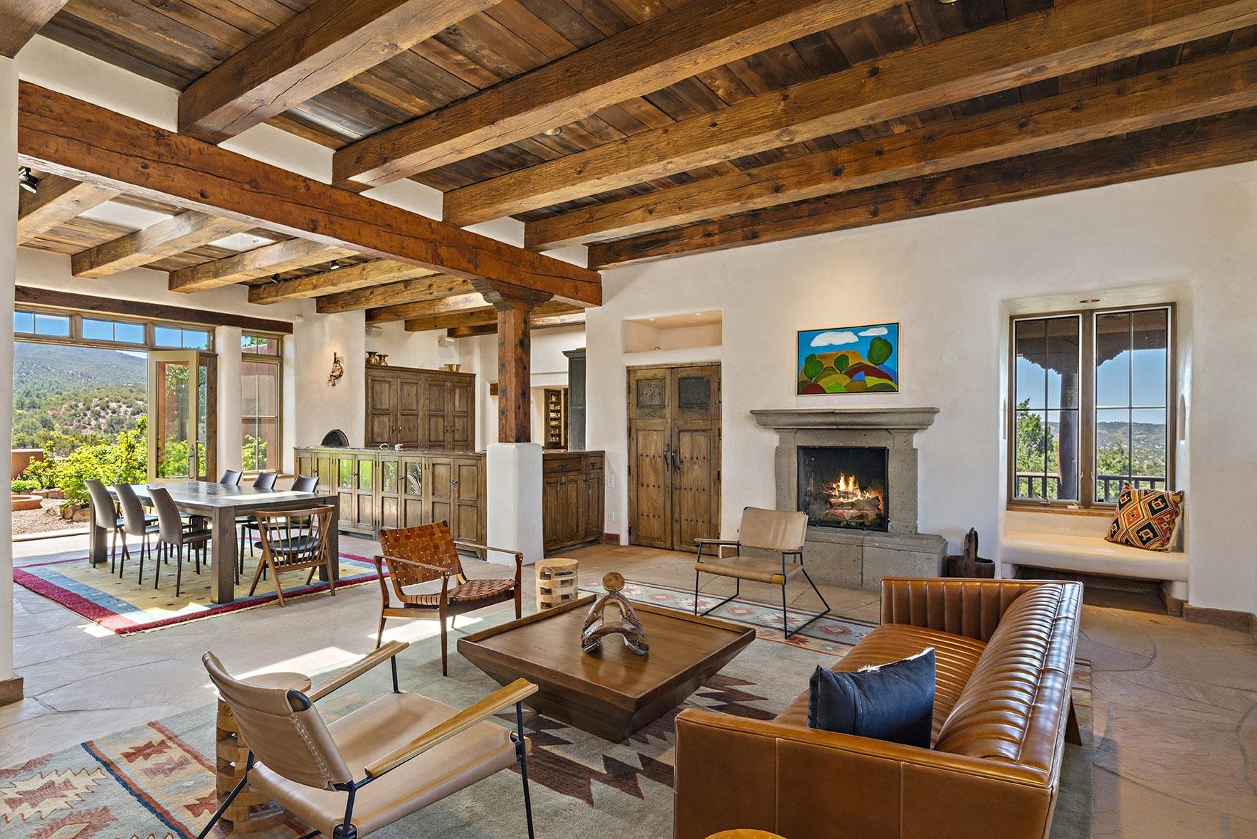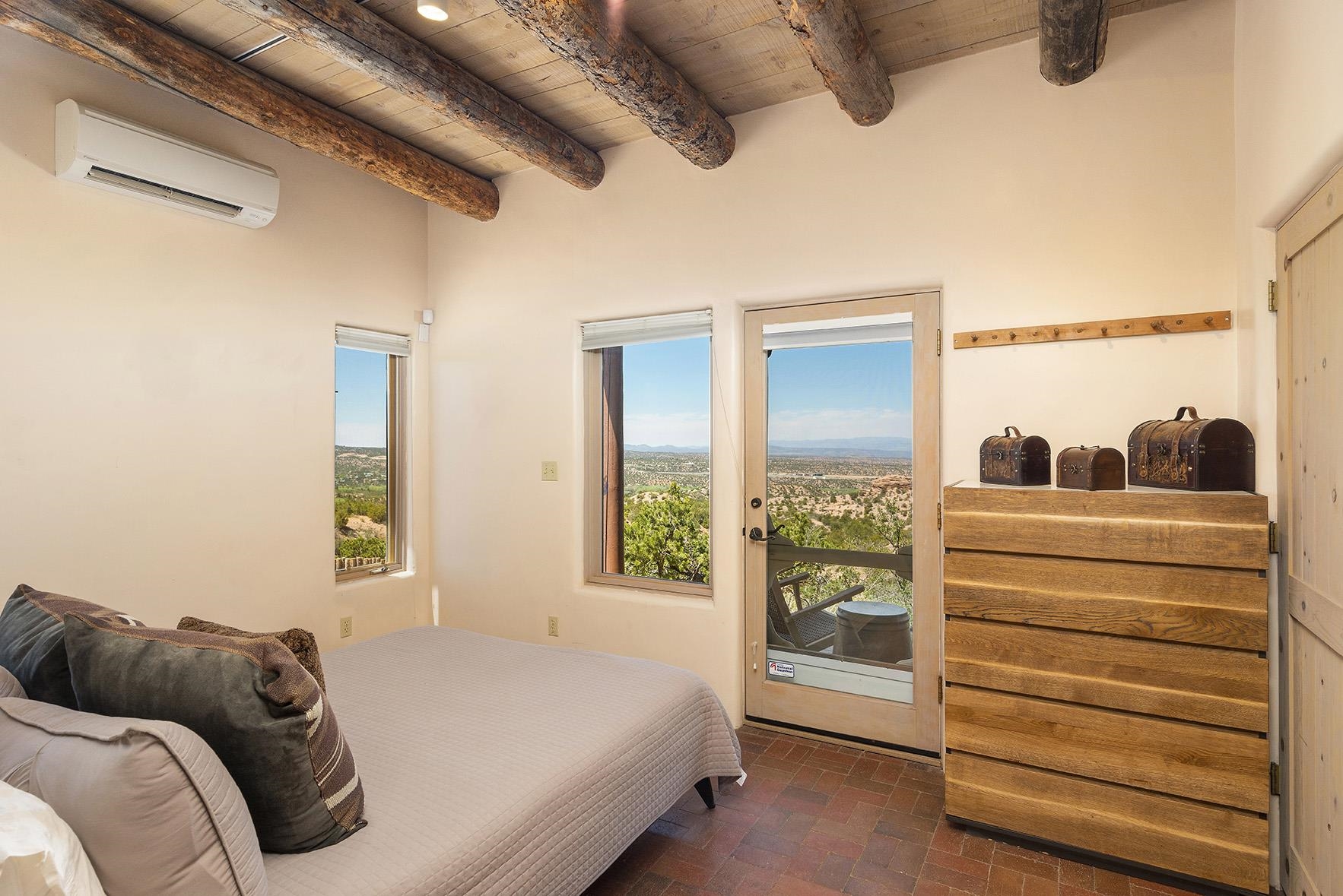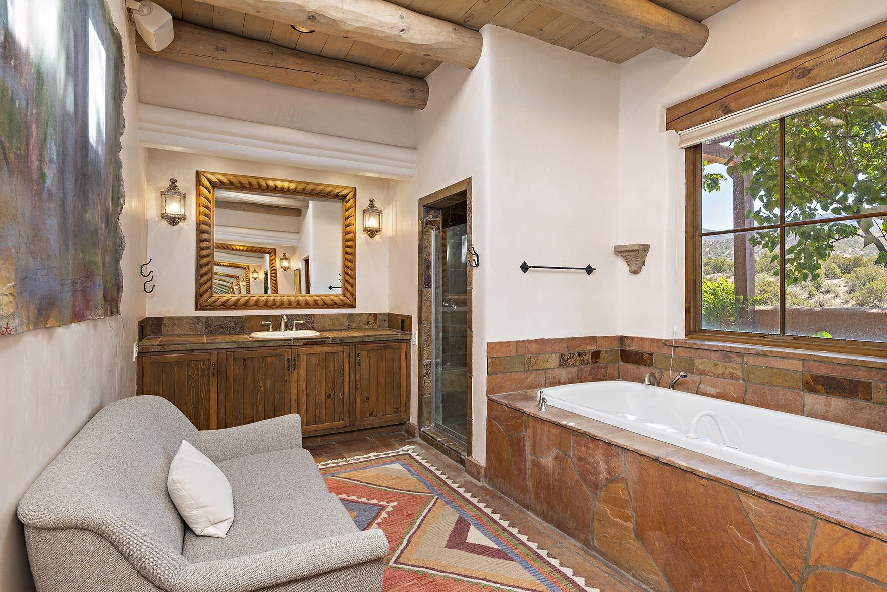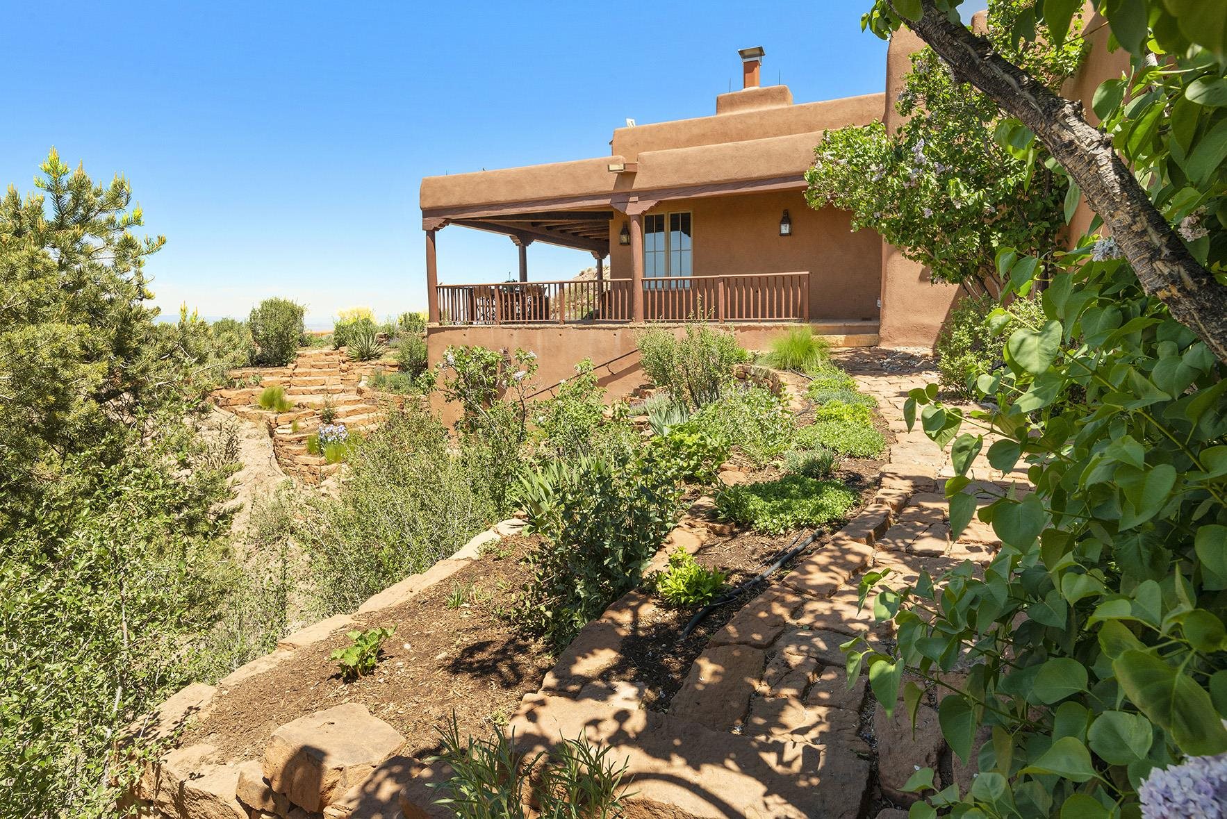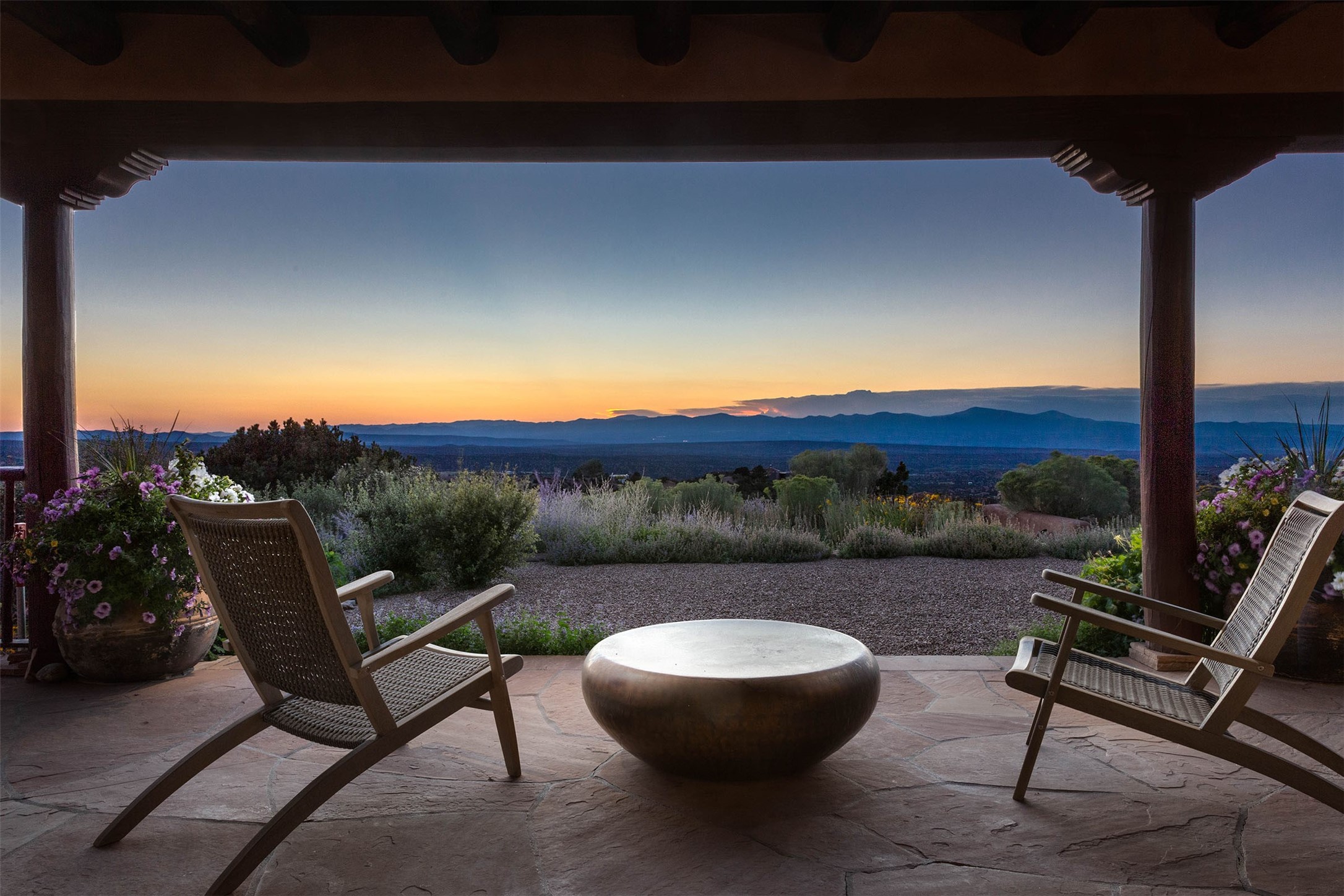Newly transformed, this updated 25-acre compound in the Tesuque foothills has been reimagined to include a custom-developed equestrian facility, a separate and secure dog park, a bocce court overlooking the Sangre de Cristo Mountains, and much more, making this a unique offering where one can experience private living and ranch amenities just 15 minutes from historic downtown Santa Fe.Gated and at the end of the road, the property is nestled against National Forest, and features unobstructed 360 views and access to an expansive trail system. The beautifully appointed 3,278 square foot main house boasts timeless details and finishes to accent artful living inside and out.The warmth of thick adobe walls, hand-honed custom cabinetry, and hardware resonates with old-world charm. Cascading rock gardens, a romantic rose garden, and portals lead to a wine cellar and an inviting 838-square-foot guest house.The new equestrian features include a custom MD Barnmaster stable with four stalls with heated waterers and geothermal radiant heat, a wash stall, and a 288 square foot tack room lounge with bathroom and wet bar, including mini-split systems. The electricity is powered by solar with a propane generator backup system. Connected to the barn is a beautiful open-air arena with sweeping views surrounded by a private hand-dug trail system adding to the expansiveness of the property. Additionally, the newly extended water and electrical infrastructure allows one to customize the facility further.Other features near the main house include 5-car garages, an office/personal gym, beautiful courtyards and vista views throughout the property, a private gated entry and a security system in the main house, as well as the original three-stall barn with turnouts, a tack room, and access to Santa Fe National Forest. So whether you are interested in a custom luxury equestrian compound or creating a private retreat, the infrastructure is ready for you and your imagination.