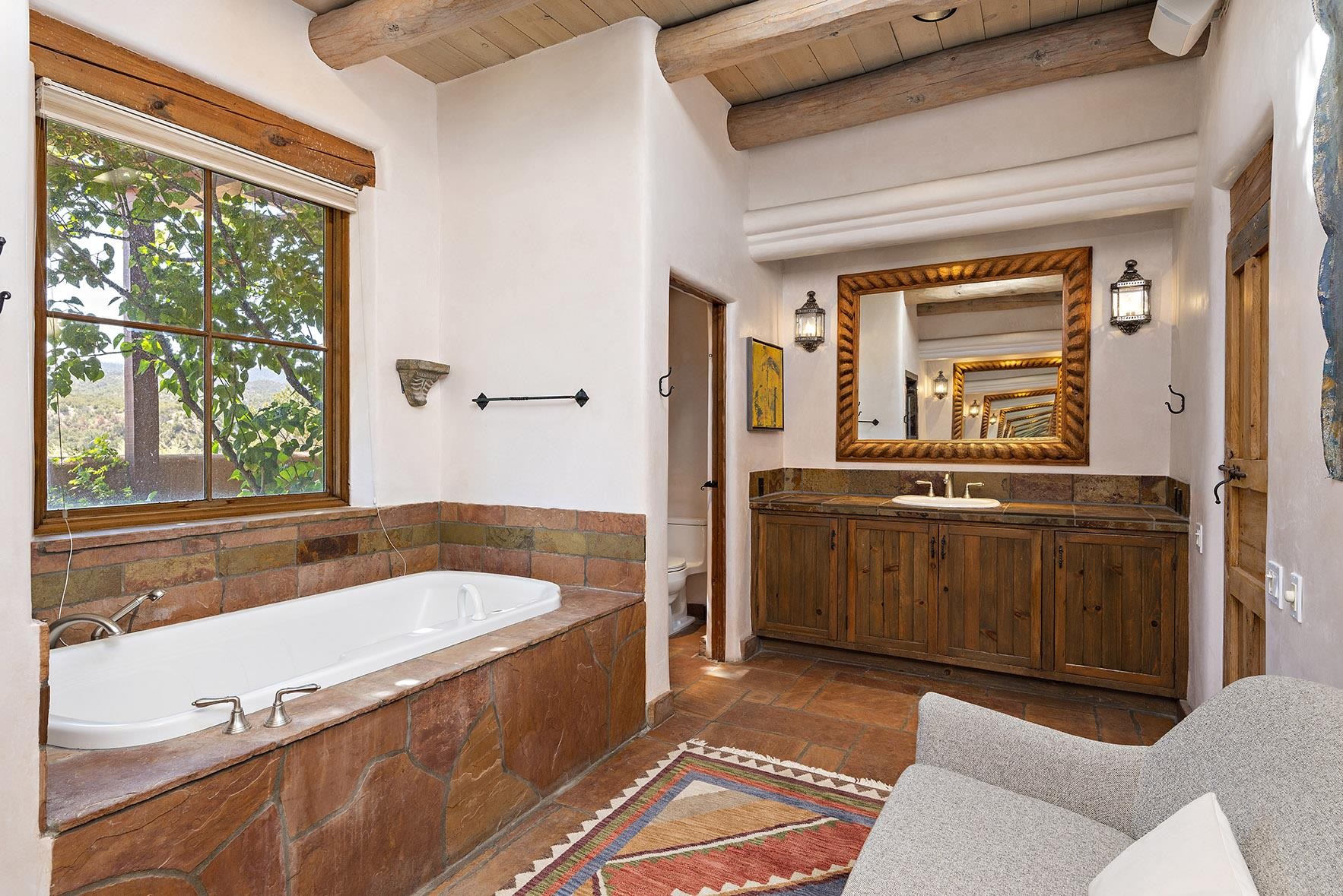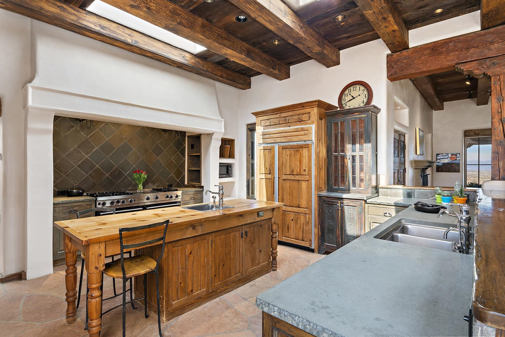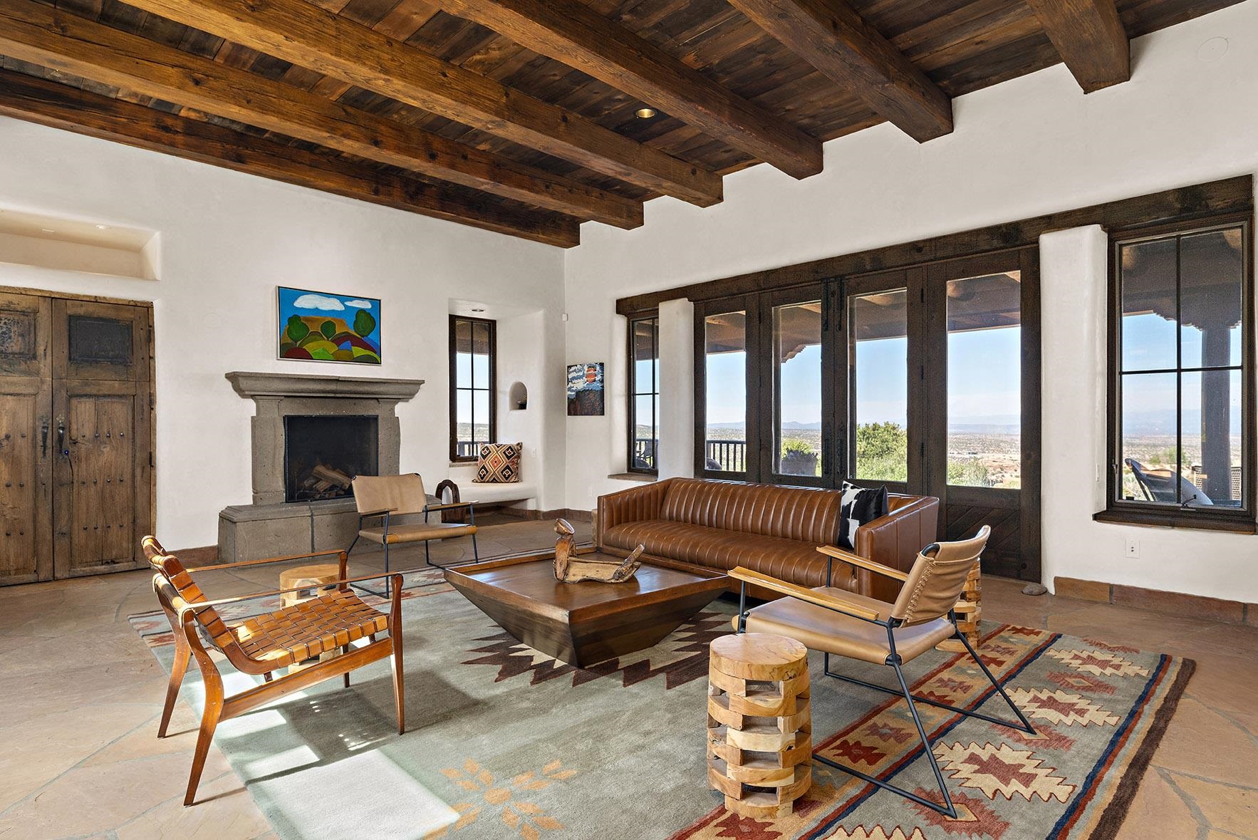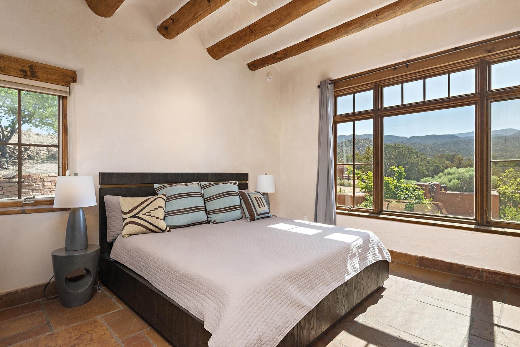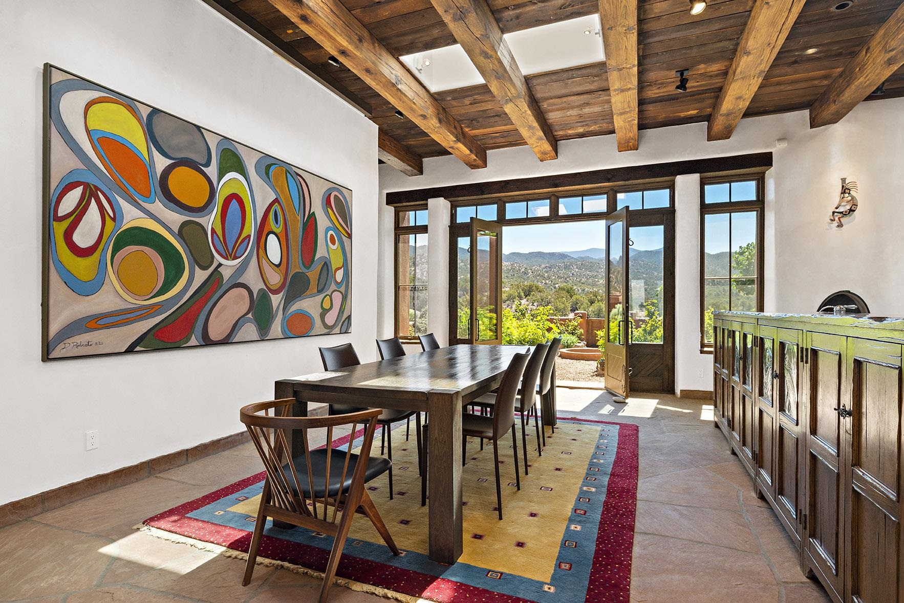 Newly transformed, this updated 25-acre compound in the Tesuque foothills has been reimagined to include a custom-developed equestrian facility, a separate and secure dog park, a bocce court overlooking the Sangre de Cristo Mountains, and much more, making this a unique offering where one can experience private living and ranch amenities just 15 minutes from historic downtown Santa Fe.Gated and at the end of the road, the property is nestled against National Forest, and features unobstructed 360 views and access to an expansive trail system. The beautifully appointed 3,278 square foot main house boasts timeless details and finishes to accent artful living inside and out.The warmth of thick adobe walls, hand-honed custom cabinetry, and hardware resonates with old-world charm. Cascading rock gardens, a romantic rose garden, and portals lead to a wine cellar and an inviting 838-square-foot guest house.The new equestrian features include a custom MD Barnmaster stable with four stalls with heated waterers and geothermal radiant heat, a wash stall, and a 288 square foot tack room lounge with bathroom and wet bar, including mini-split systems. The electricity is powered by solar with a propane generator backup system. Connected to the barn is a beautiful open-air arena with sweeping views surrounded by a private hand-dug trail system adding to the expansiveness of the property. Additionally, the newly extended water and electrical infrastructure allows one to customize the facility further.Other features near the main house include 5-car garages, an office/personal gym, beautiful courtyards and vista views throughout the property, a private gated entry and a security system in the main house, as well as the original three-stall barn with turnouts, a tack room, and access to Santa Fe National Forest. So whether you are interested in a custom luxury equestrian compound or creating a private retreat, the infrastructure is ready for you and your imagination.
