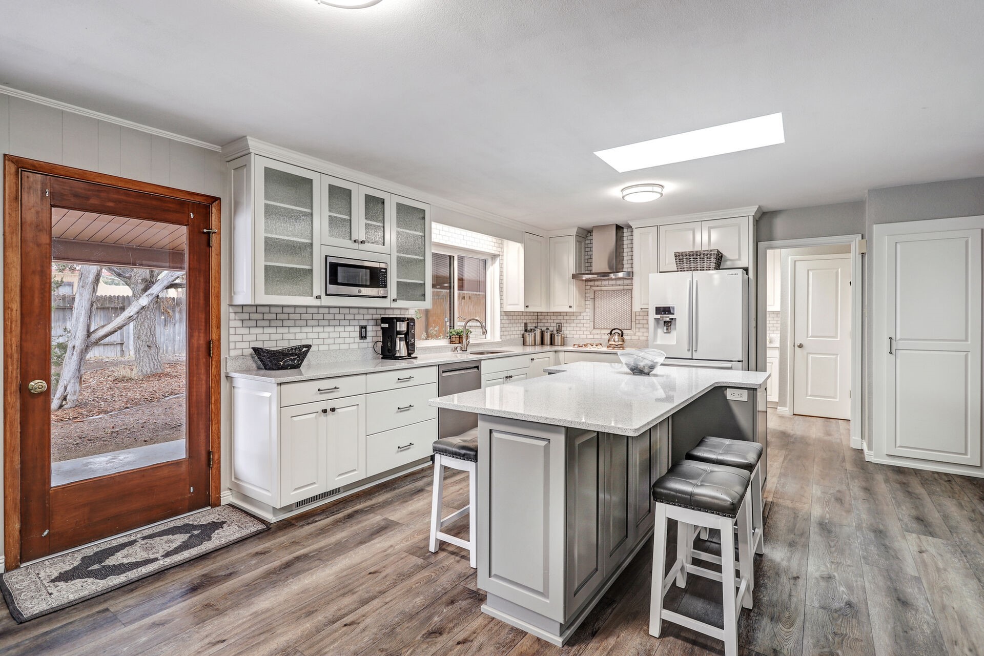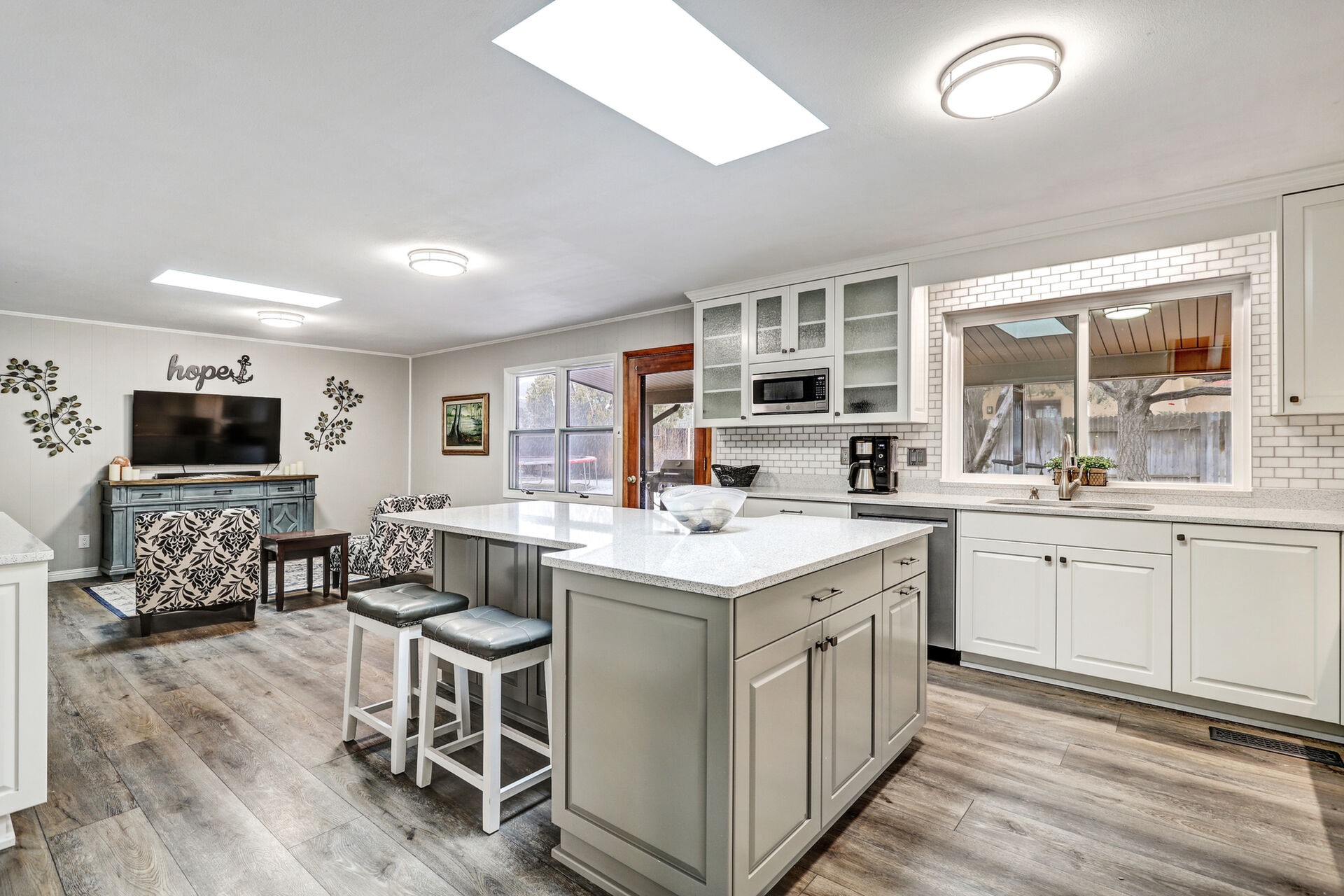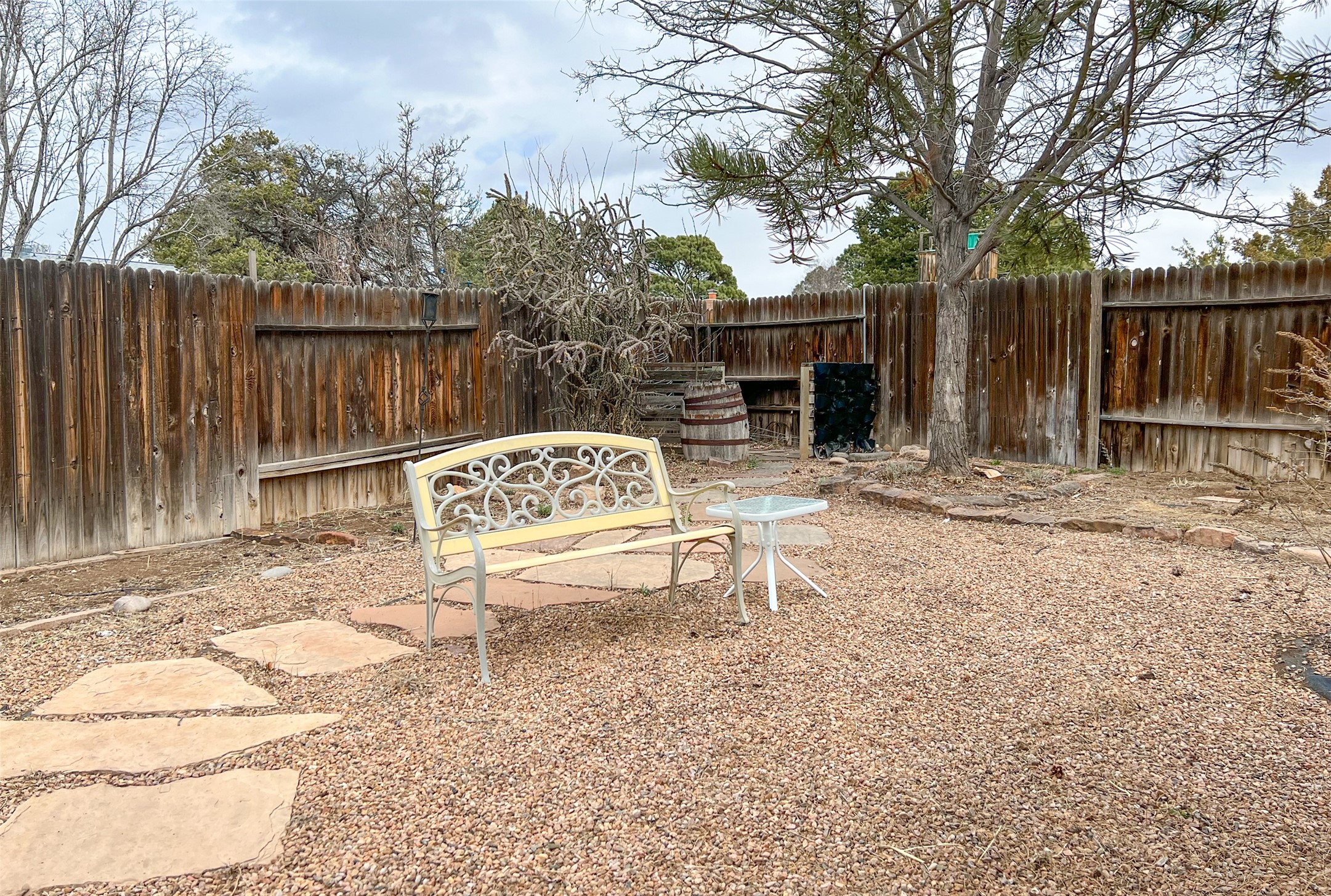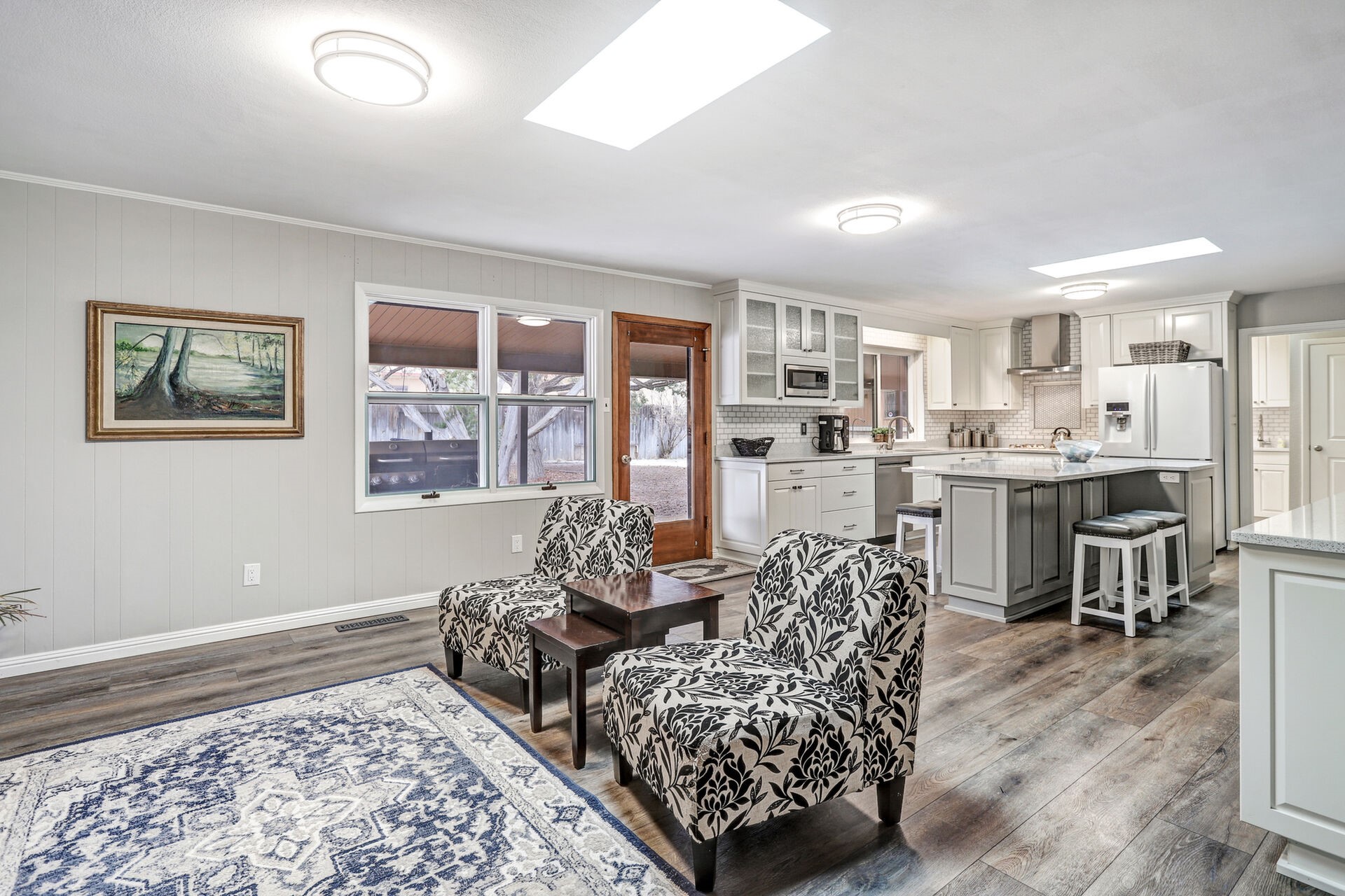 Immaculate property. Enter through a gate to a pleasant courtyard area with paved walkway to the home and garage. Inside be greeted by beautiful tongue and groove ceilings, tiled floors and the first of two living spaces. The living space has a wood-burning fireplace, raised hearth and abundant natural light. The kitchen is the heart of the home and has been fully renovated with custom-built cabinets, tile backsplash, kitchen island, and Cambria quartz counter tops. The kitchen features a double oven, touch faucet, coffee bar and is open to the second living room. Off the kitchen find a large laundry room with amazing storage, extra refrigerator, powder room bath, and nightlight mode lighting. Down the hall find three guest rooms, full hall bath and the primary bedroom with en suite three-quarter bath. Home also provides new waterproof, luxury vinyl flooring, evaporative cooling, smart technology including "Ring" doorbell and smart thermostats. The 2019 furnace is air conditioner ready. Outside is a large covered patio perfect for entertaining, grilling or simply relaxing. Trampoline conveys. The detached two car garage is heated and provides storage and/or shop area. You'll love this move-in ready home. Enjoy the virtual tour and schedule a showing today. Offers are due by March 30th.