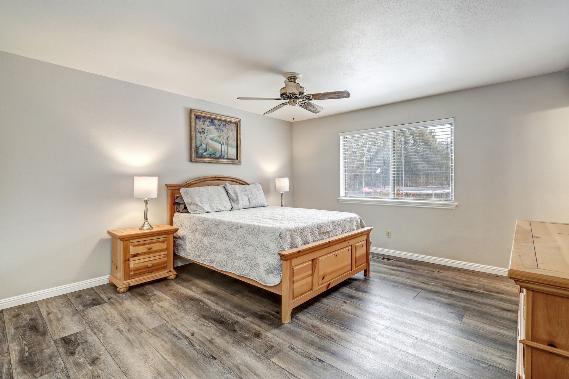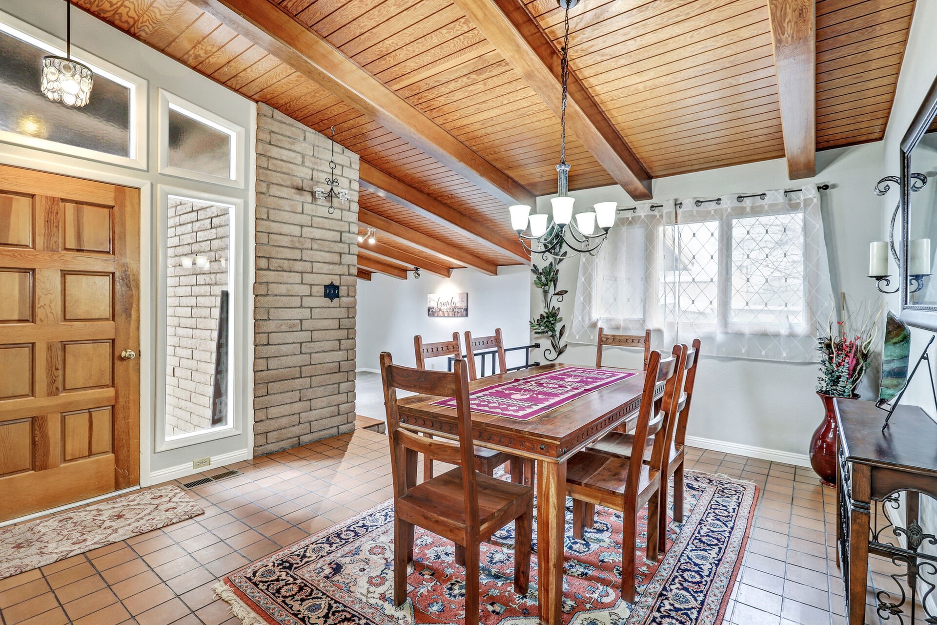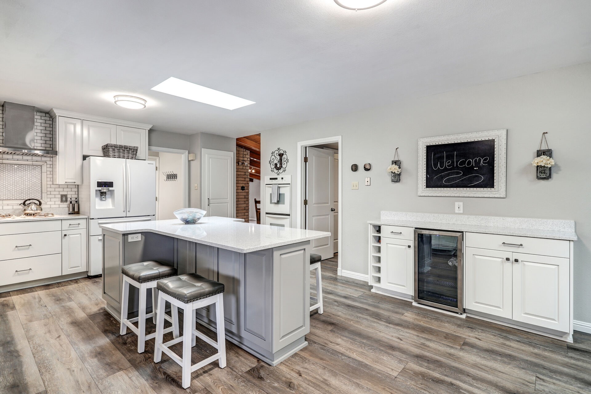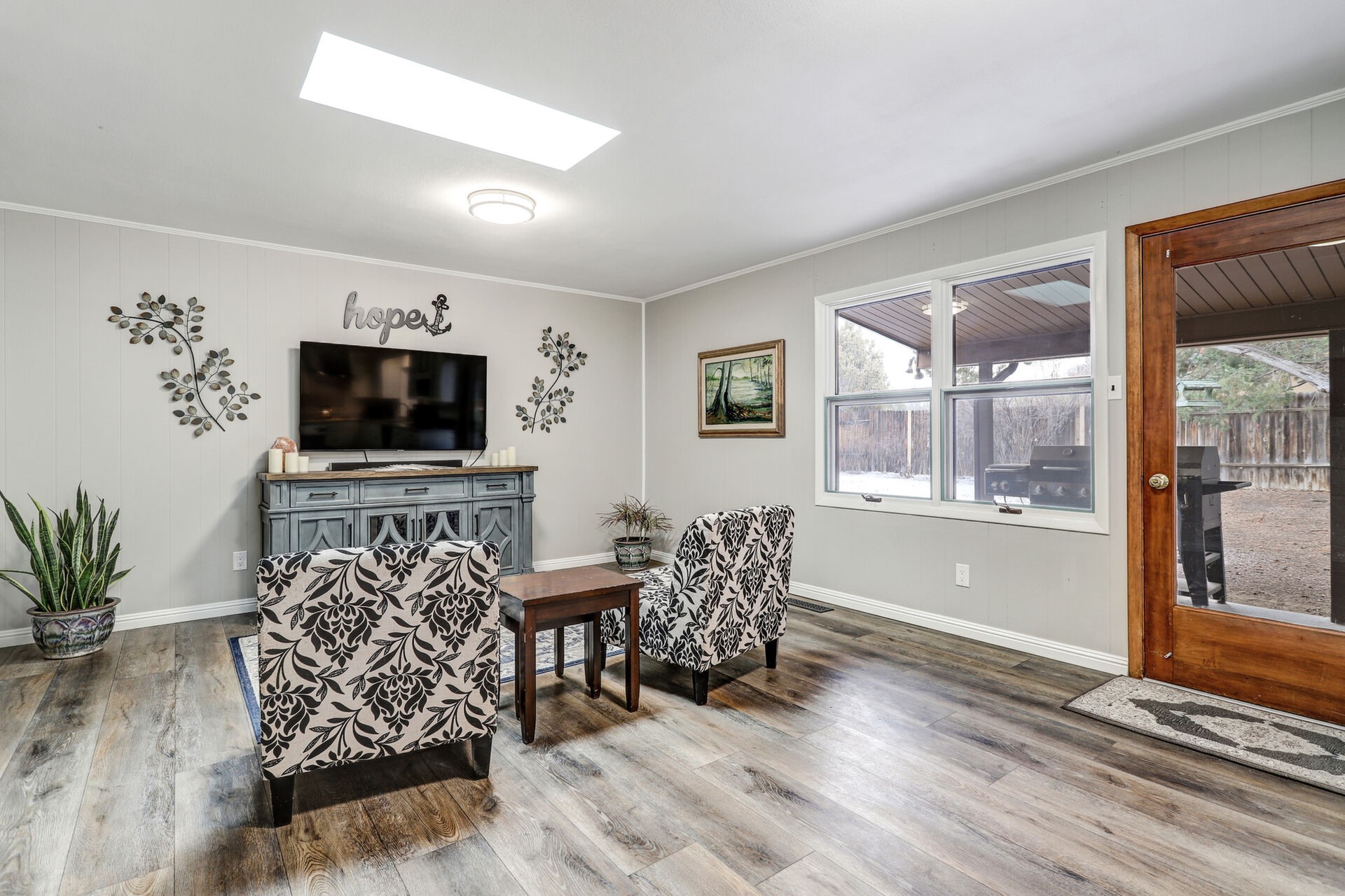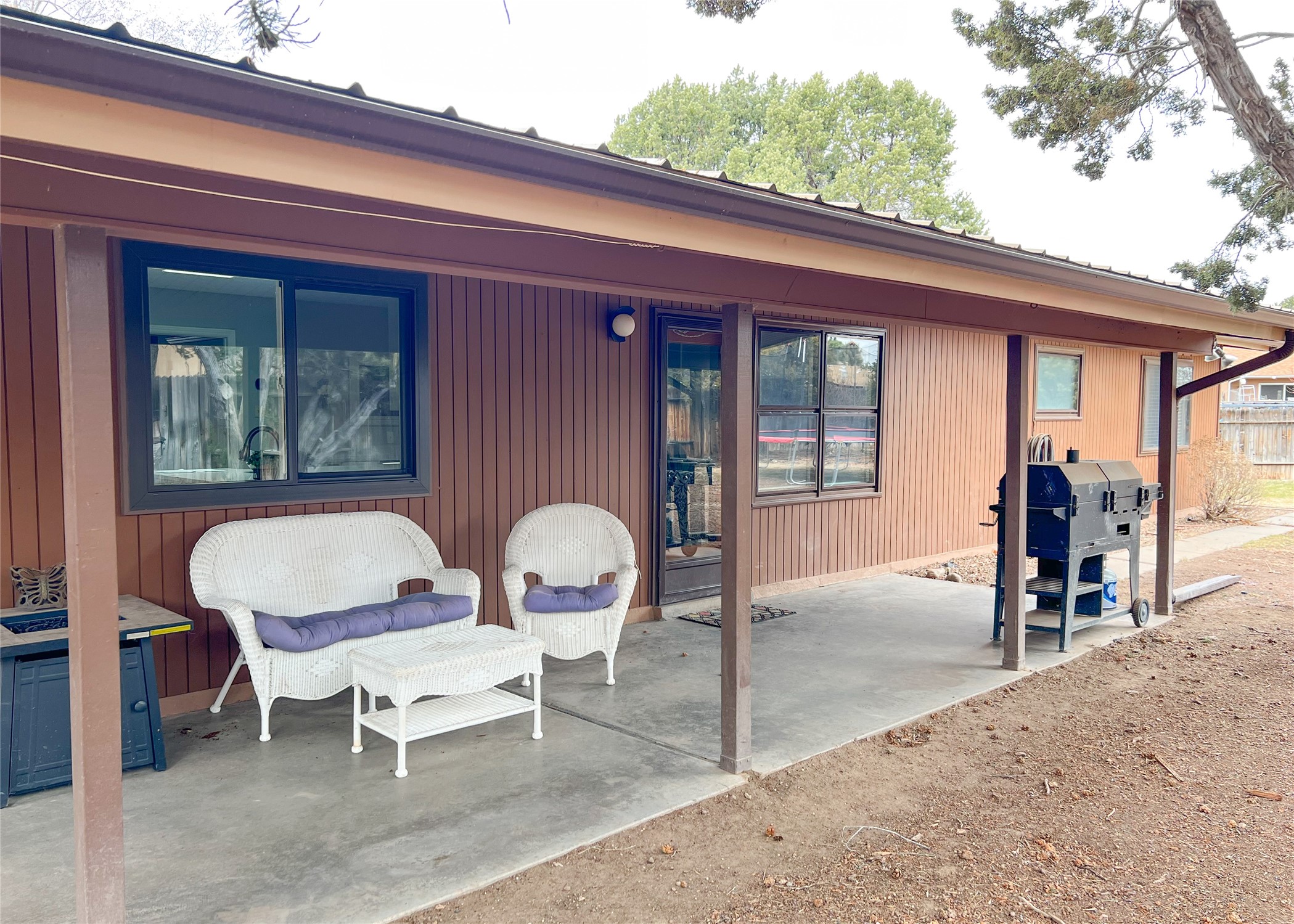 Immaculate property. Enter through a gate to a pleasant courtyard area with paved walkway to the home and garage. Inside be greeted by beautiful tongue and groove ceilings, tiled floors and the first of two living spaces. The living space has a wood-burning fireplace, raised hearth and abundant natural light. The kitchen is the heart of the home and has been fully renovated with custom-built cabinets, tile backsplash, kitchen island, and Cambria quartz counter tops. The kitchen features a double oven, touch faucet, coffee bar and is open to the second living room. Off the kitchen find a large laundry room with amazing storage, extra refrigerator, powder room bath, and nightlight mode lighting. Down the hall find three guest rooms, full hall bath and the primary bedroom with en suite three-quarter bath. Home also provides new waterproof, luxury vinyl flooring, evaporative cooling, smart technology including "Ring" doorbell and smart thermostats. The 2019 furnace is air conditioner ready. Outside is a large covered patio perfect for entertaining, grilling or simply relaxing. Trampoline conveys. The detached two car garage is heated and provides storage and/or shop area. You'll love this move-in ready home. Enjoy the virtual tour and schedule a showing today. Offers are due by March 30th.