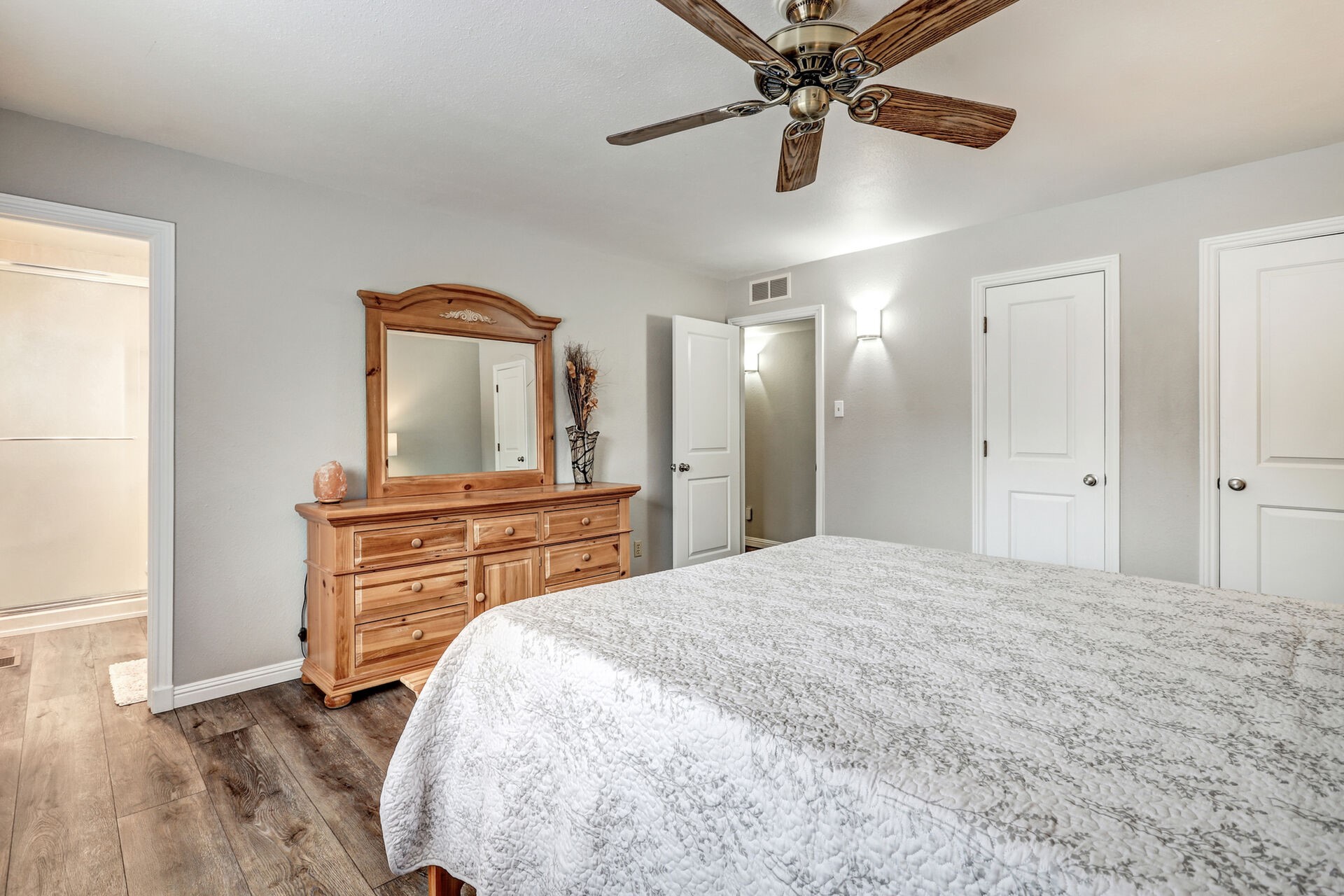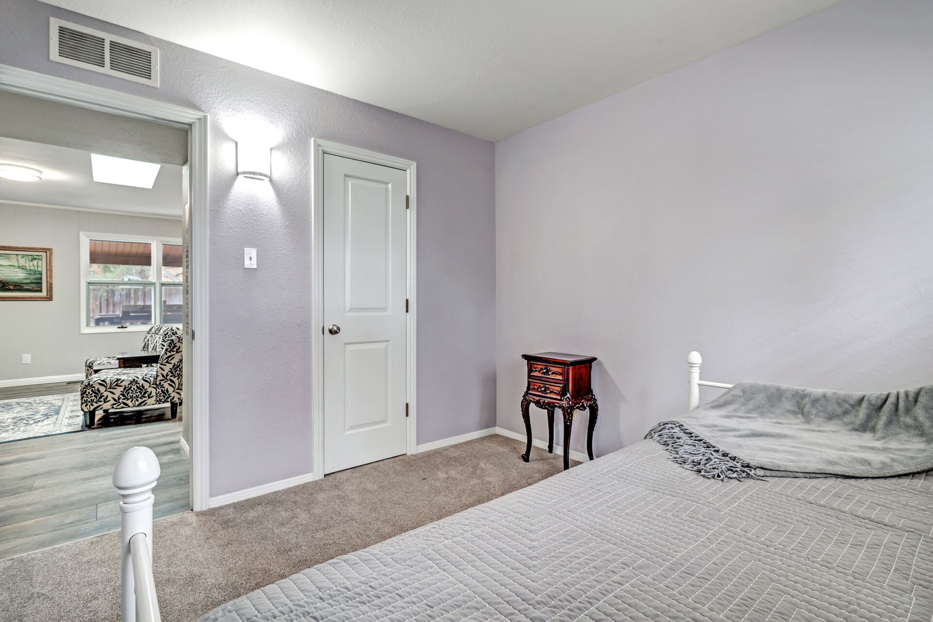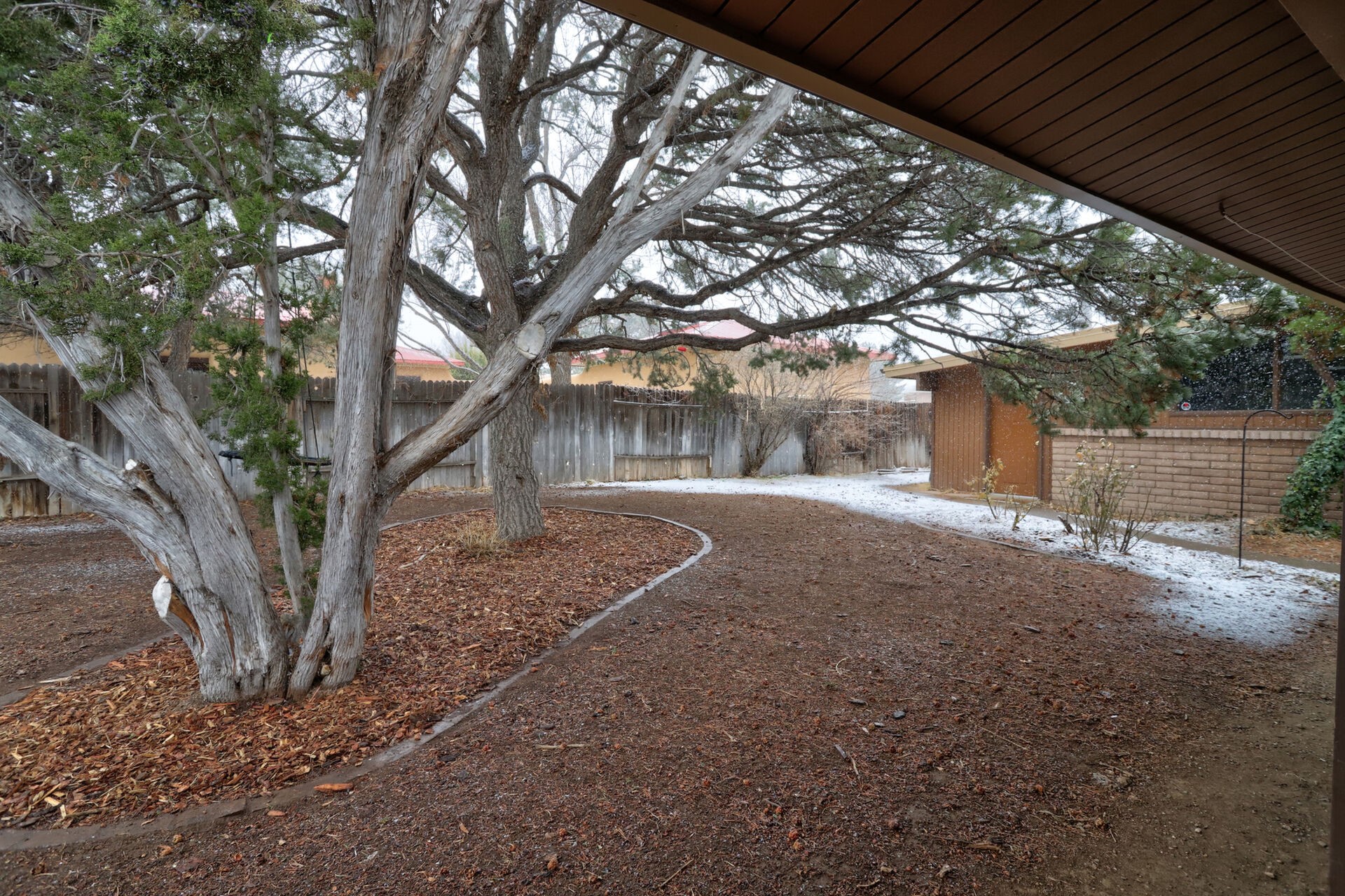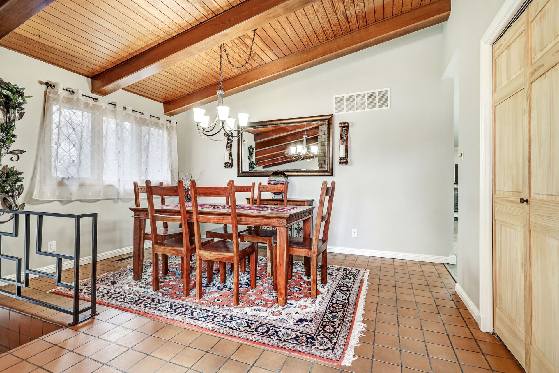 Immaculate property. Enter through a gate to a pleasant courtyard area with paved walkway to the home and garage. Inside be greeted by beautiful tongue and groove ceilings, tiled floors and the first of two living spaces. The living space has a wood-burning fireplace, raised hearth and abundant natural light. The kitchen is the heart of the home and has been fully renovated with custom-built cabinets, tile backsplash, kitchen island, and Cambria quartz counter tops. The kitchen features a double oven, touch faucet, coffee bar and is open to the second living room. Off the kitchen find a large laundry room with amazing storage, extra refrigerator, powder room bath, and nightlight mode lighting. Down the hall find three guest rooms, full hall bath and the primary bedroom with en suite three-quarter bath. Home also provides new waterproof, luxury vinyl flooring, evaporative cooling, smart technology including "Ring" doorbell and smart thermostats. The 2019 furnace is air conditioner ready. Outside is a large covered patio perfect for entertaining, grilling or simply relaxing. Trampoline conveys. The detached two car garage is heated and provides storage and/or shop area. You'll love this move-in ready home. Enjoy the virtual tour and schedule a showing today. Offers are due by March 30th.