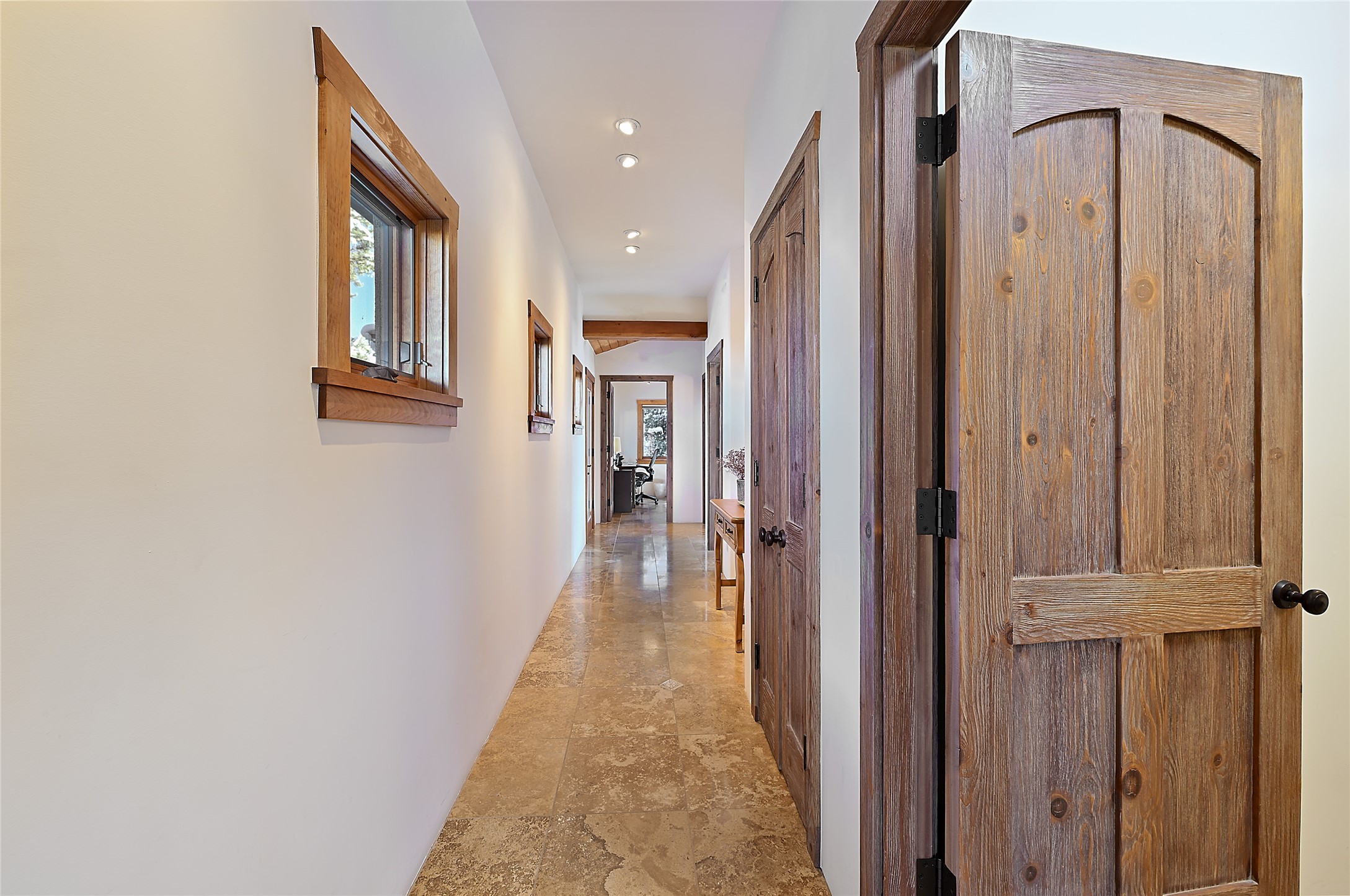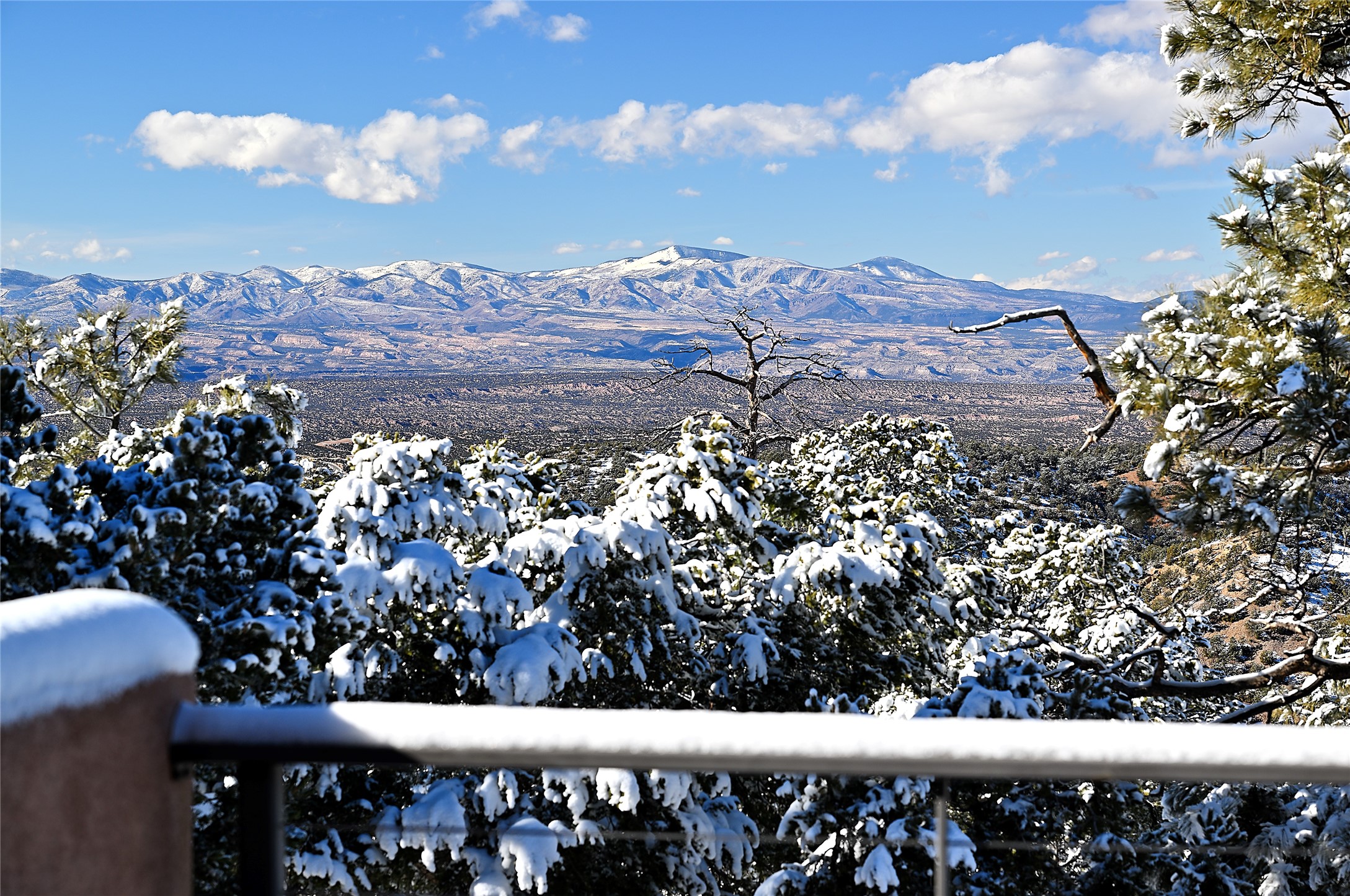 Offering unparalleled sweeping views and a calming peaceful privacy, this remarkable home and guest studio harmonize with the natural beauty of their surroundings in the foothills of the Sangre de Cristo Mountains. Designed with an eco-sensibility, numerous green features are incorporated into the home, such as a net-zero solar energy system, rainwater harvesting and a greywater septic system. There exists a subtle dialogue between the majestic wooded mountainside and the dramatic, yet warm and welcoming, interior spaces in the 3,414 sqft main house. Wood, stone and glass features delight the eye and soothe the senses. The shared spaces have an open layout, with subtle transitions between the foyer, living room, dining area, kitchen and den, while the private spaces are tucked away. The primary suite is elevated to maximize views, featuring a wraparound balcony, anteroom sitting area and luxuriously appointed full bath including a soaking tub and steam shower. The detached 825 sqft guest studio inspires the creative spirit with soaring ceilings and tall windows, versatile lounge area, generous counter-space with sink and refrigerator, bathroom with walk-in shower and more; it's an ideal space for both artistic endeavors and to host guests in chic, picturesque style. Hop onto Hyde Park Road and head north to the slopes and hiking trails, or skip a few minutes south to the Plaza, or jump over to enjoy the spa and fine dining of Ten Thousand Waves and Izanami.