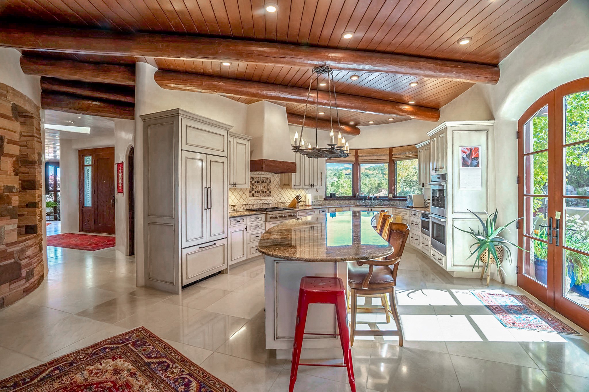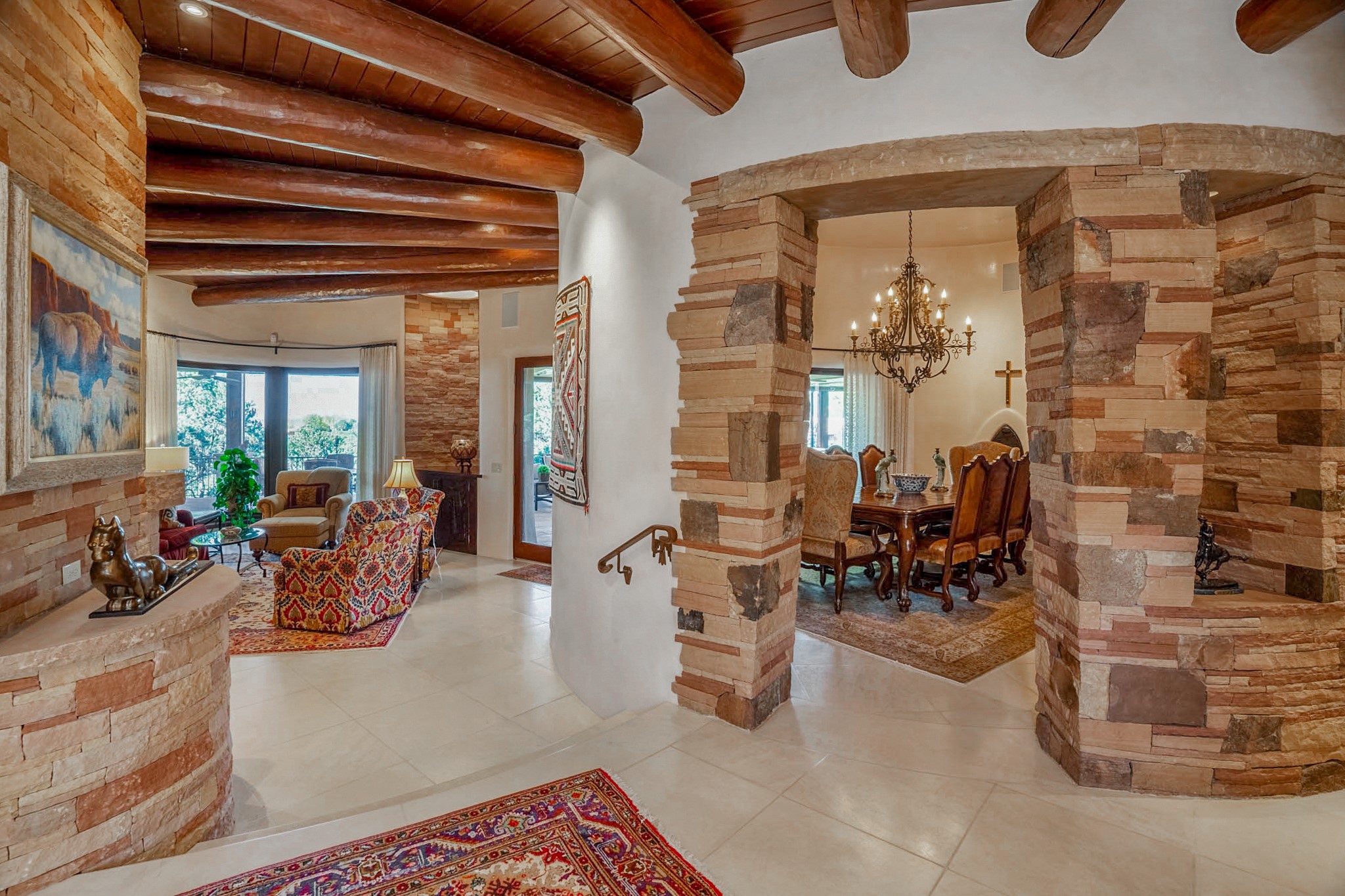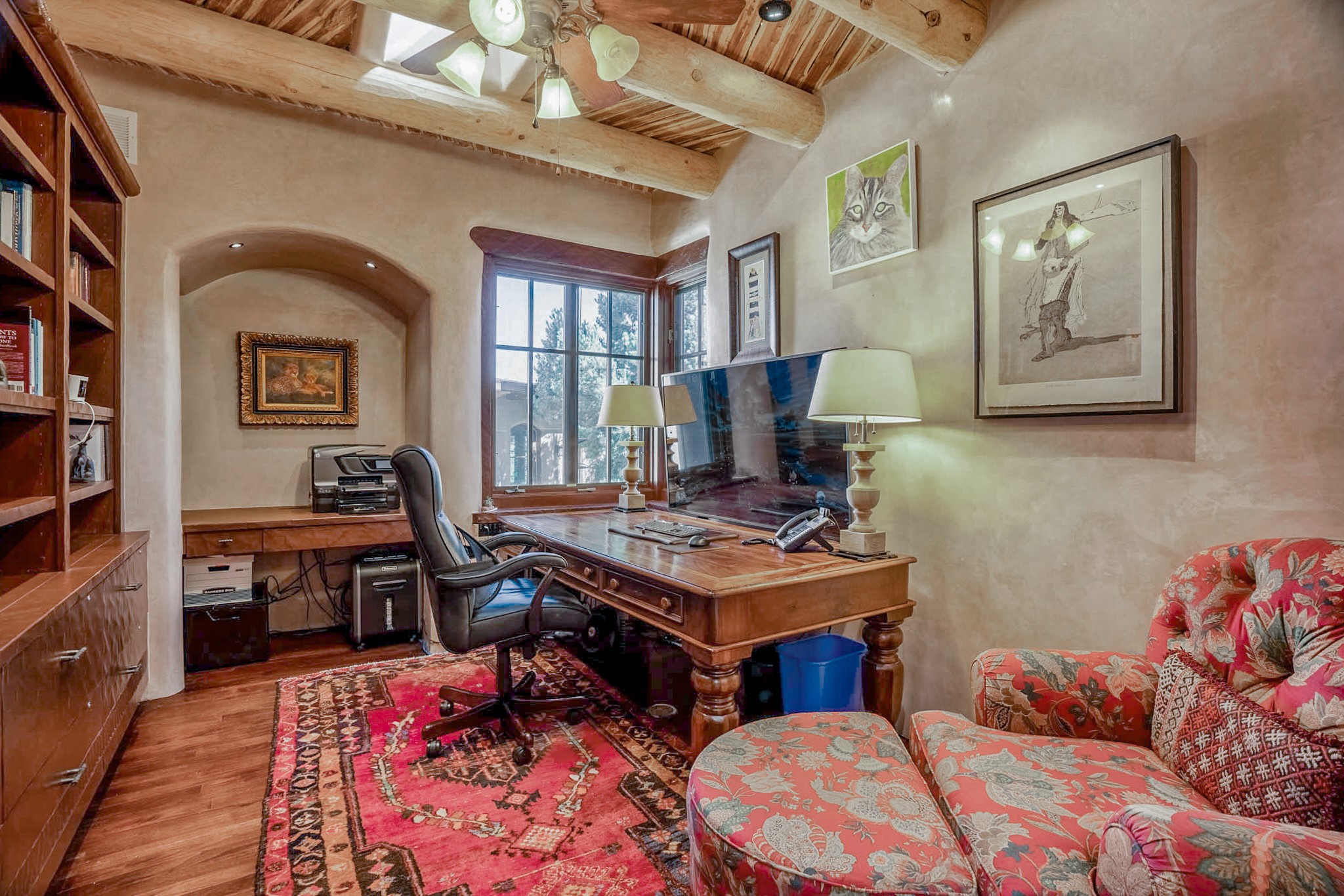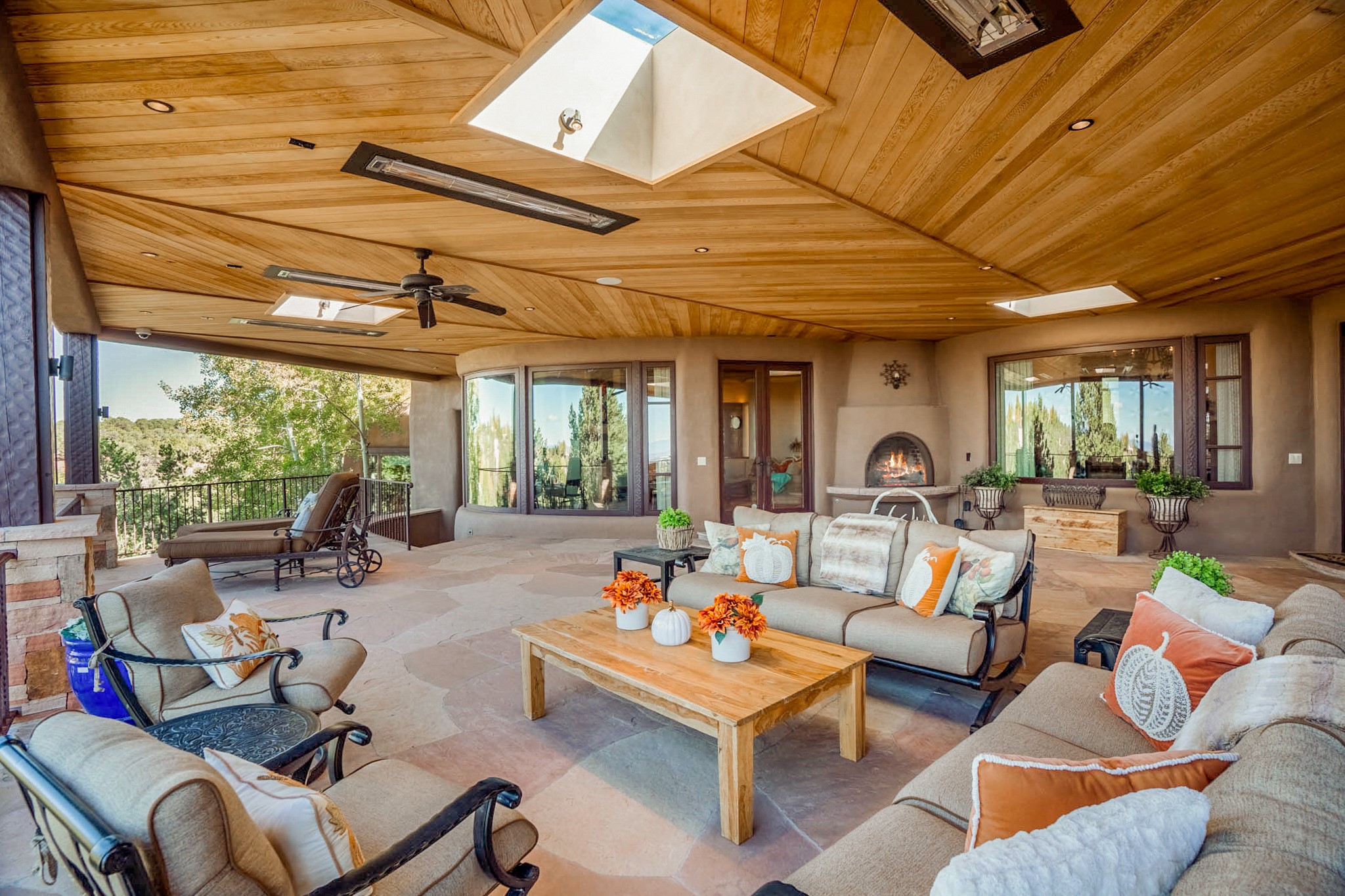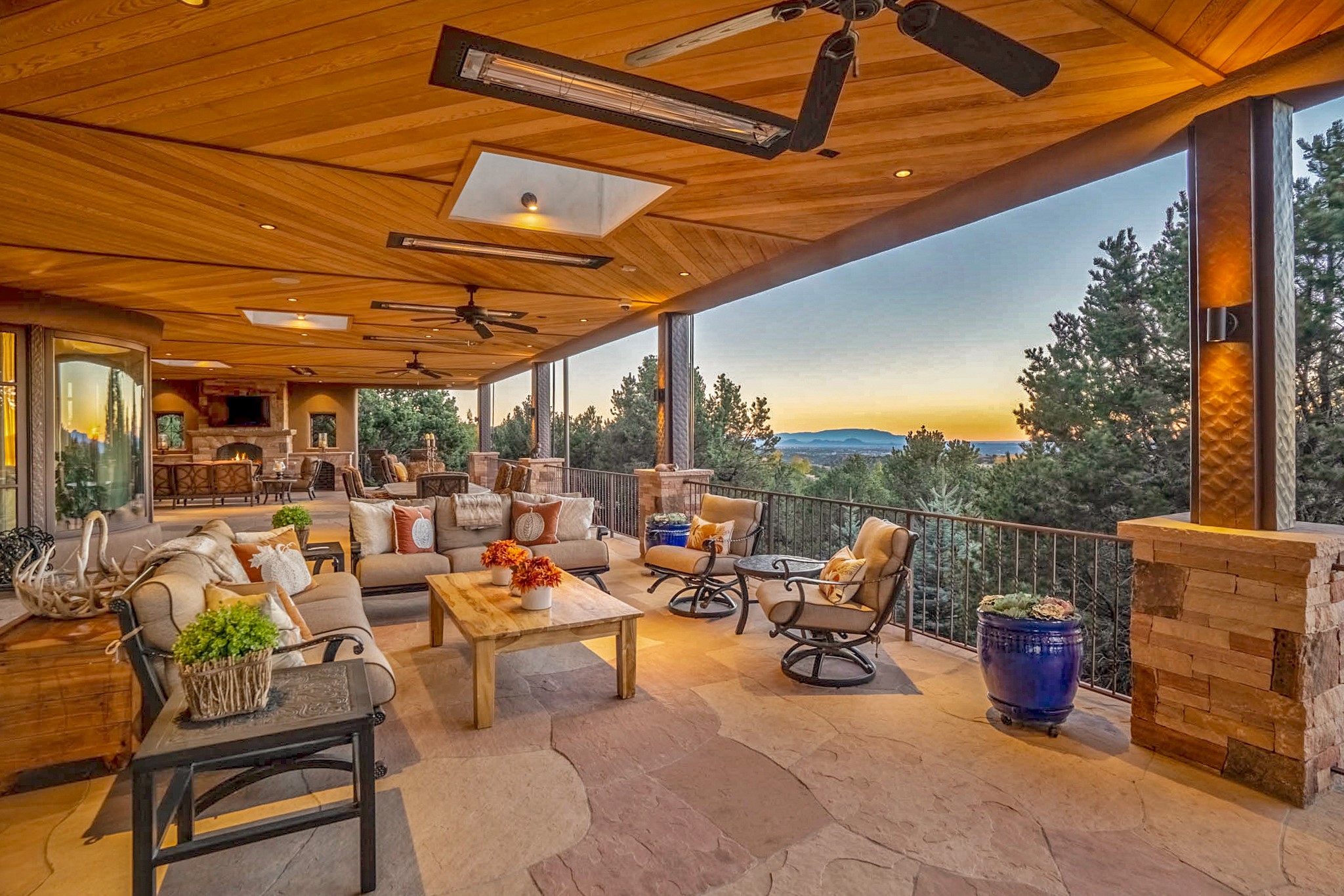 Perched above the city on Sierra Del Norte and minutes to the Dale Ball trail system, this spectacular main house and enchanting guest house are sited on 1.68 acres and provide panoramic views from every angle. Completely renovated in 2014 with 2 offices, an impressive lower-level media room, 2 separate fenced-in areas for pets, and a deep sunset-facing portal measuring over 2400 square feet that would be the envy of any luxury resort, this elegant property has a unique combination of sophistication and warmth. The remodeled kitchen has a large granite island for in-kitchen dining, extensive countertops, and a picture-perfect view of both the Sangre De Cristo mountains and the ski basin. Connected to the kitchen is every caterer's dream, a butler's kitchen which provides an additional area for prep, 2 Subzero refrigerator drawers, storage, and an extra dishwasher... perfect for entertaining. The owner's wing consists of a large office with a private portal, a den, and a closet that would make Imelda Marcos weep! The west side of the home features the luxurious portal complete with a Kalamazoo grill, a grill master's dream, commercial ceiling mounted heaters, ceiling fans, automated screens, and breathtaking city views and stunning sunsets nightly. The 620 square foot guest house is located above the 3-car garage. Surrounding the home are lovely garden areas that provide colorful vignettes from nearly every window. Within 10 minutes of The Plaza, great proximity to trails and the ski basin, this property is an exceptional value and a unique combination of luxury and livability.