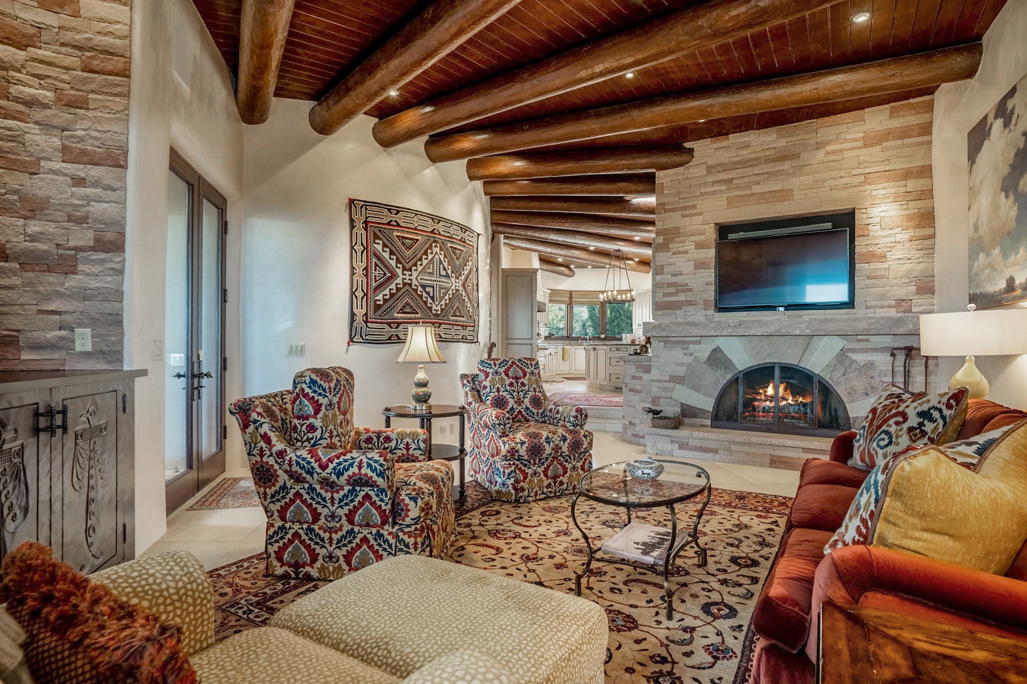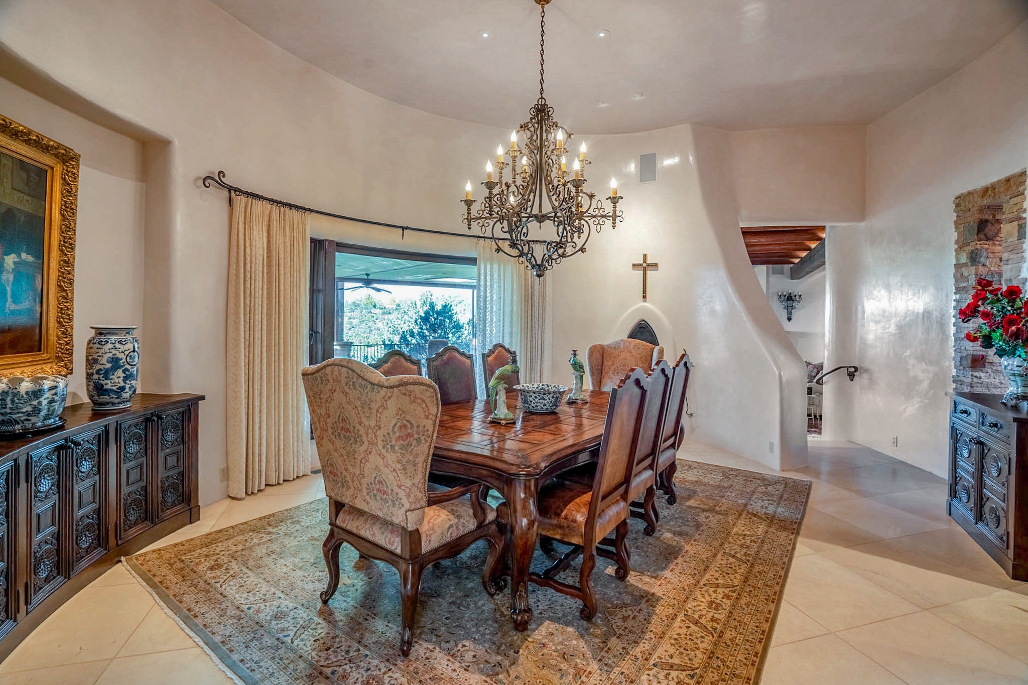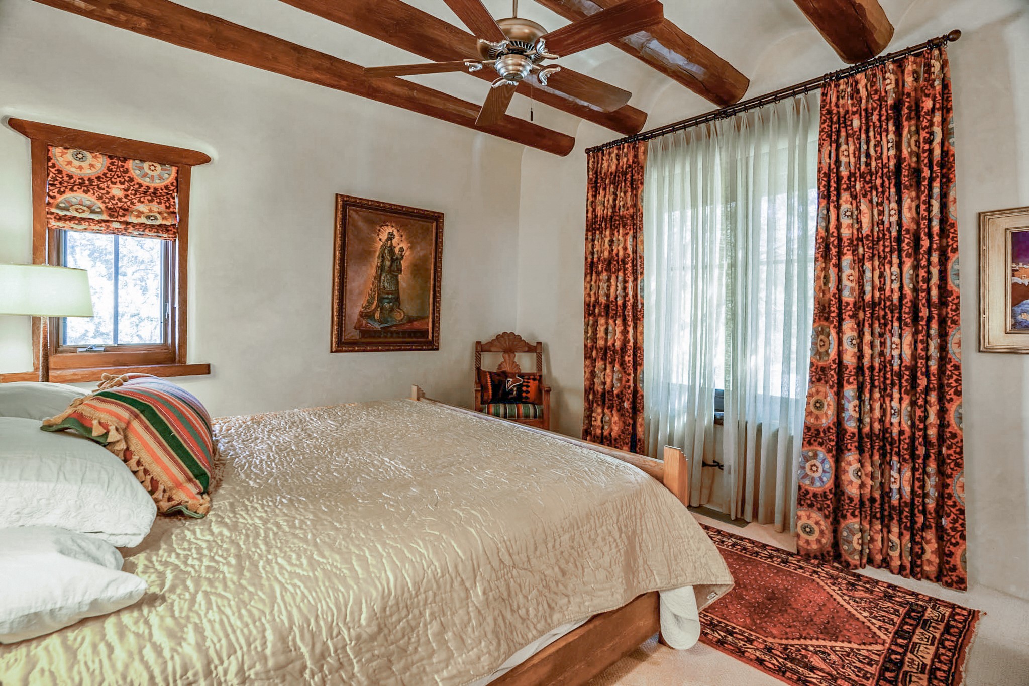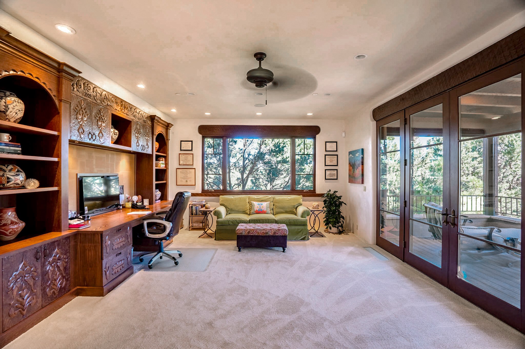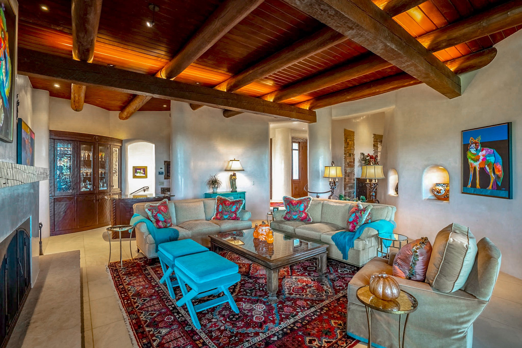 Perched above the city on Sierra Del Norte and minutes to the Dale Ball trail system, this spectacular main house and enchanting guest house are sited on 1.68 acres and provide panoramic views from every angle. Completely renovated in 2014 with 2 offices, an impressive lower-level media room, 2 separate fenced-in areas for pets, and a deep sunset-facing portal measuring over 2400 square feet that would be the envy of any luxury resort, this elegant property has a unique combination of sophistication and warmth. The remodeled kitchen has a large granite island for in-kitchen dining, extensive countertops, and a picture-perfect view of both the Sangre De Cristo mountains and the ski basin. Connected to the kitchen is every caterer's dream, a butler's kitchen which provides an additional area for prep, 2 Subzero refrigerator drawers, storage, and an extra dishwasher... perfect for entertaining. The owner's wing consists of a large office with a private portal, a den, and a closet that would make Imelda Marcos weep! The west side of the home features the luxurious portal complete with a Kalamazoo grill, a grill master's dream, commercial ceiling mounted heaters, ceiling fans, automated screens, and breathtaking city views and stunning sunsets nightly. The 620 square foot guest house is located above the 3-car garage. Surrounding the home are lovely garden areas that provide colorful vignettes from nearly every window. Within 10 minutes of The Plaza, great proximity to trails and the ski basin, this property is an exceptional value and a unique combination of luxury and livability.