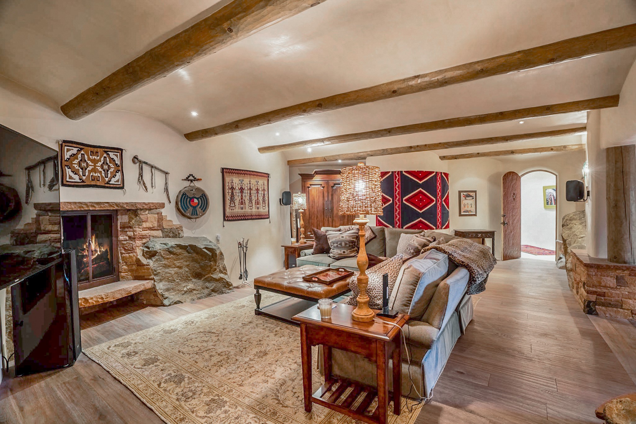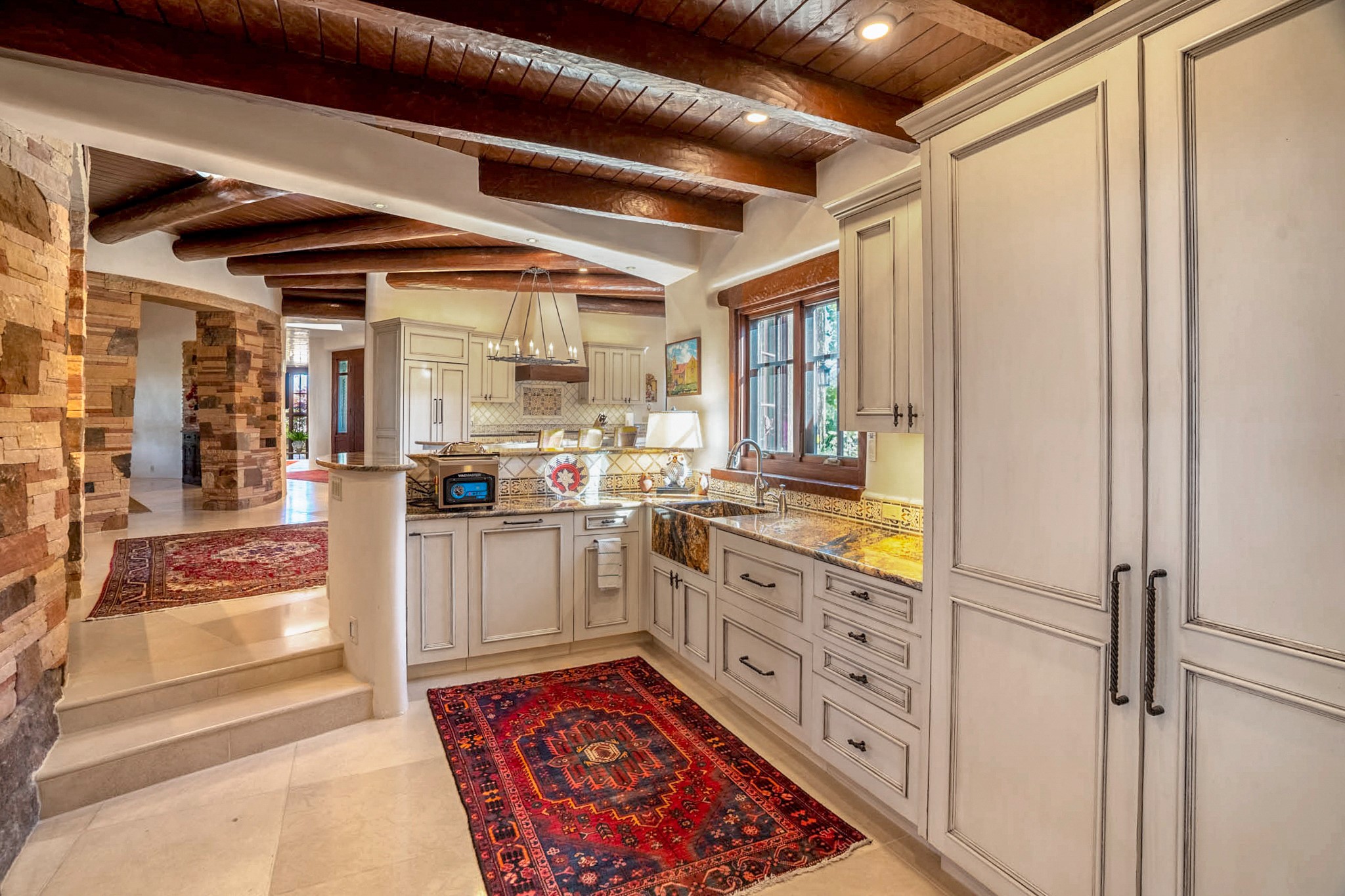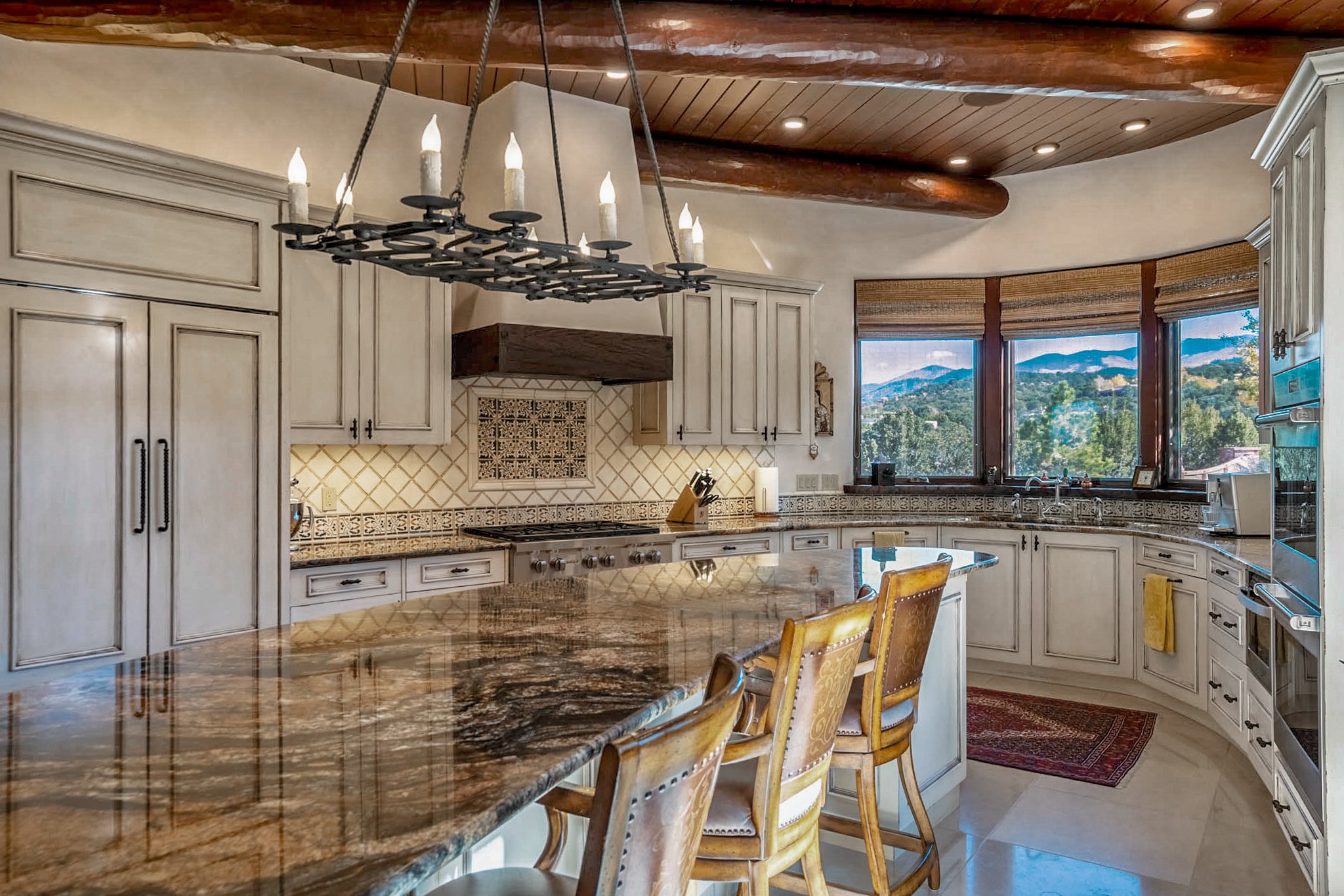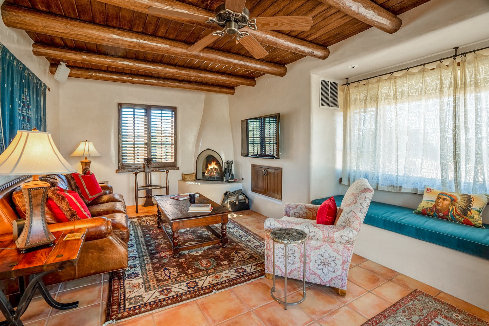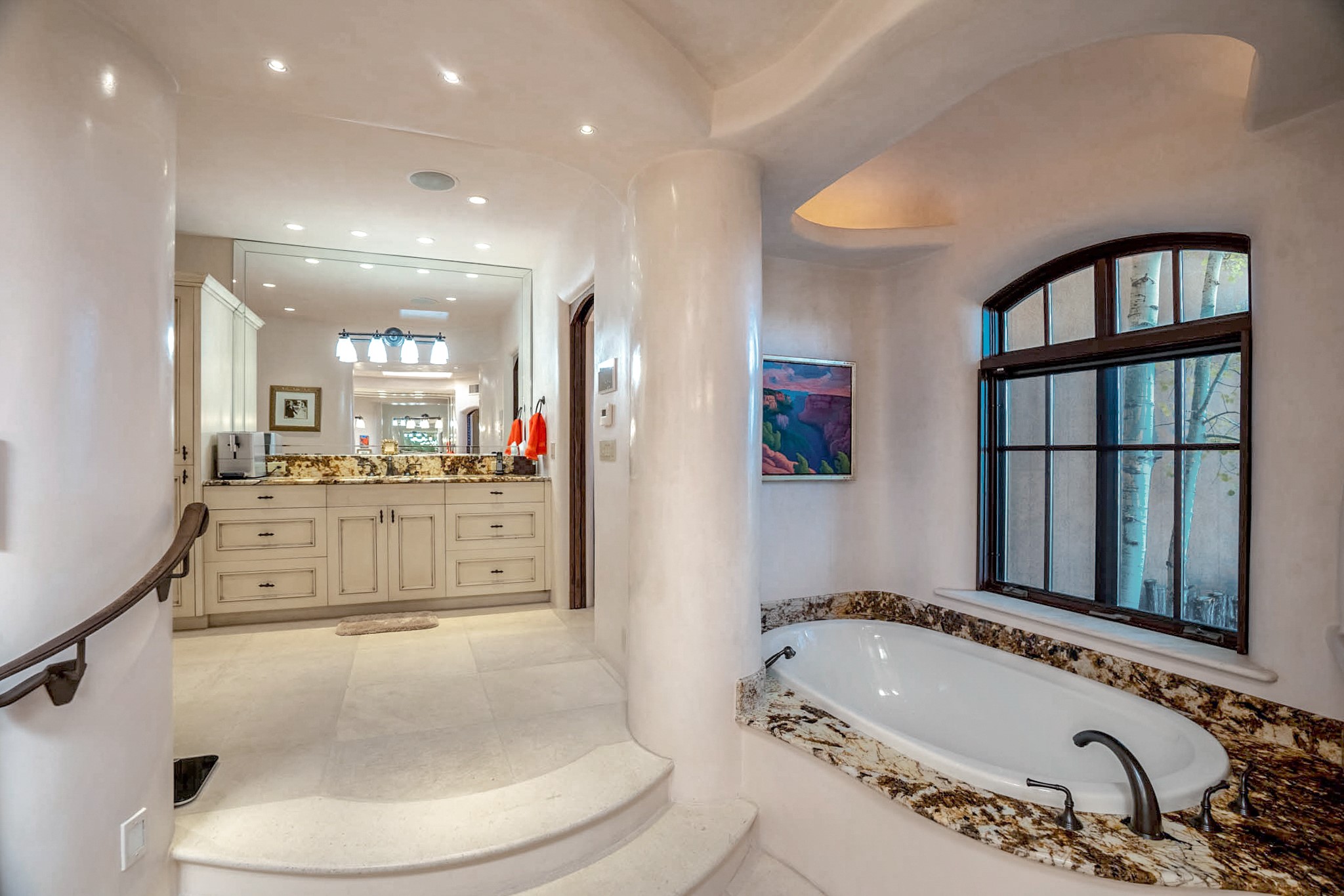 Perched above the city on Sierra Del Norte and minutes to the Dale Ball trail system, this spectacular main house and enchanting guest house are sited on 1.68 acres and provide panoramic views from every angle. Completely renovated in 2014 with 2 offices, an impressive lower-level media room, 2 separate fenced-in areas for pets, and a deep sunset-facing portal measuring over 2400 square feet that would be the envy of any luxury resort, this elegant property has a unique combination of sophistication and warmth. The remodeled kitchen has a large granite island for in-kitchen dining, extensive countertops, and a picture-perfect view of both the Sangre De Cristo mountains and the ski basin. Connected to the kitchen is every caterer's dream, a butler's kitchen which provides an additional area for prep, 2 Subzero refrigerator drawers, storage, and an extra dishwasher... perfect for entertaining. The owner's wing consists of a large office with a private portal, a den, and a closet that would make Imelda Marcos weep! The west side of the home features the luxurious portal complete with a Kalamazoo grill, a grill master's dream, commercial ceiling mounted heaters, ceiling fans, automated screens, and breathtaking city views and stunning sunsets nightly. The 620 square foot guest house is located above the 3-car garage. Surrounding the home are lovely garden areas that provide colorful vignettes from nearly every window. Within 10 minutes of The Plaza, great proximity to trails and the ski basin, this property is an exceptional value and a unique combination of luxury and livability.