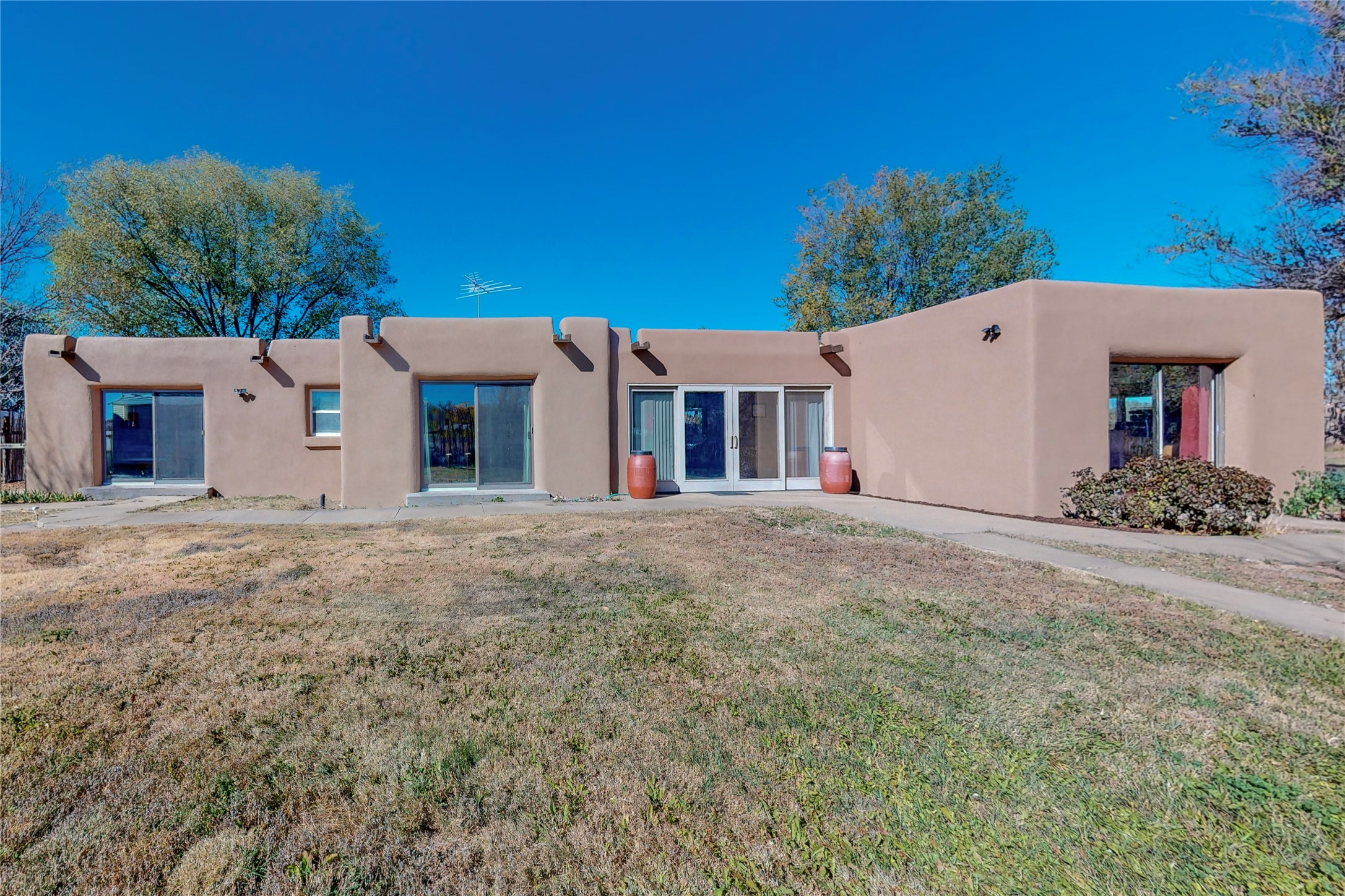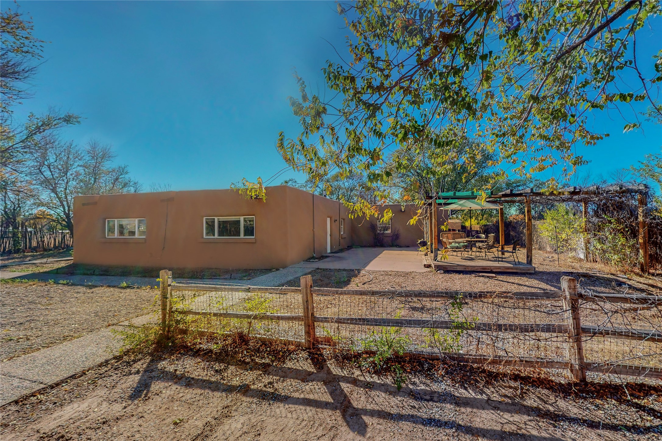 La Mesita Ranch borders this quaint country lane in the beautiful agricultural valley of desirable Nambe. Fully fenced with a gated entry, this charming adobe home borders the Pojoaque Pueblo creating more privacy than the .78 acre lot. An abundance of light welcomes you into the warm and cozy slate floored sunroom. Open concept living, dining and kitchen has views of the striated Mesita Mesa. A bonus second living/family room is off the kitchen. En-suite Master boasts a new bathroom with a Jacuzzi tub, granite counter tops and barn door. Plenty of outdoor living spaces to BBQ and enjoy the Truchas Mountain views while dining al fresco underneath the platformed Pergola. Vigas and beams galore, brick floors, gas stove, skylights, 2-car adobe garage, horses allowed and even the Morgan shed conveys! Room for an RV and boat. Water (2.65 acre ft. per annum) and ditch rights. Stucco just completed with a 7-year warranty. All this and just a 20 minute drive to either Los Alamos or Santa Fe; so what are you waiting for?