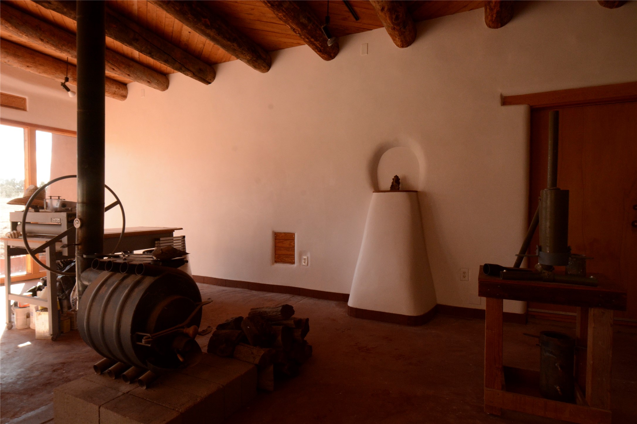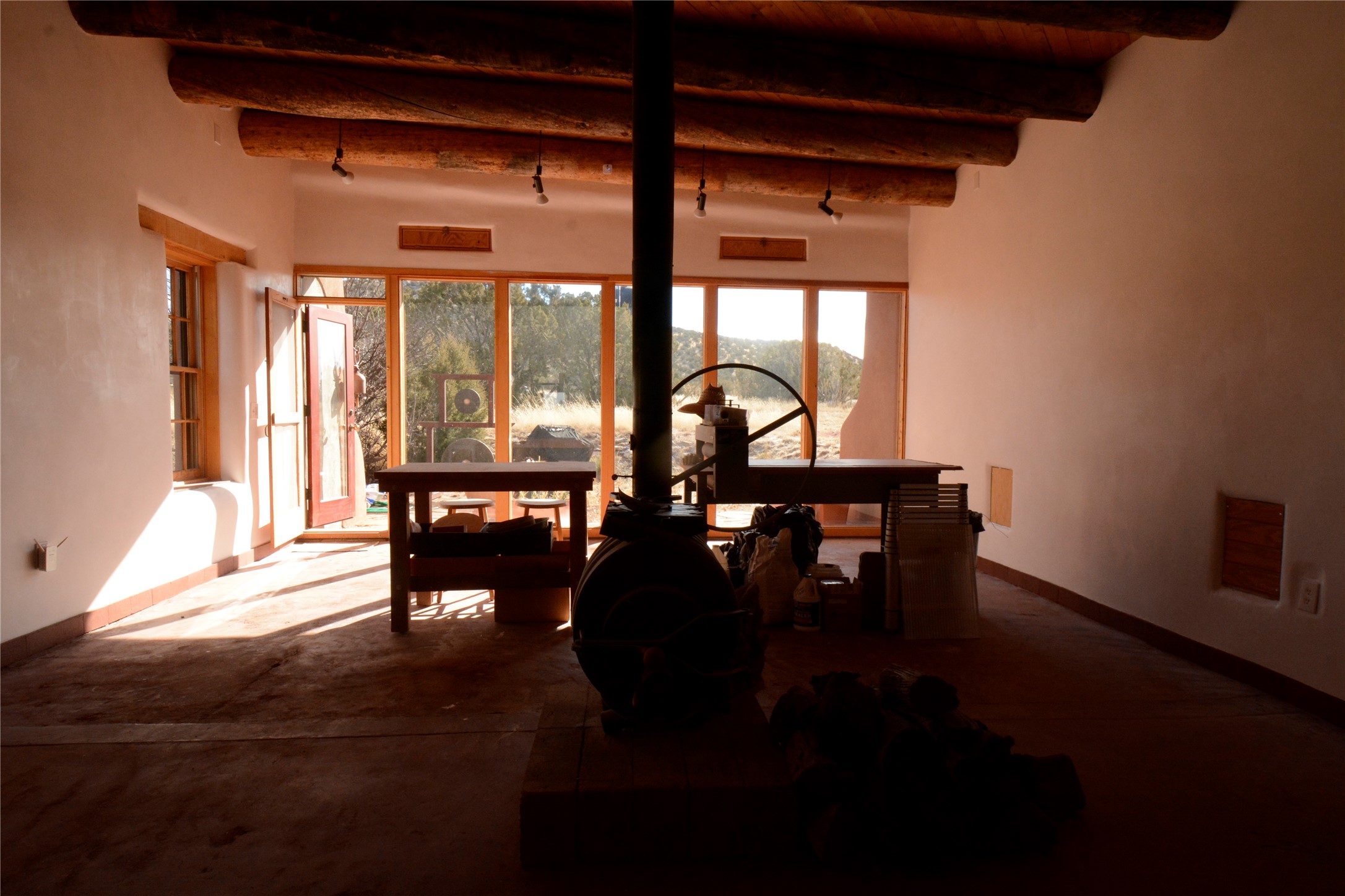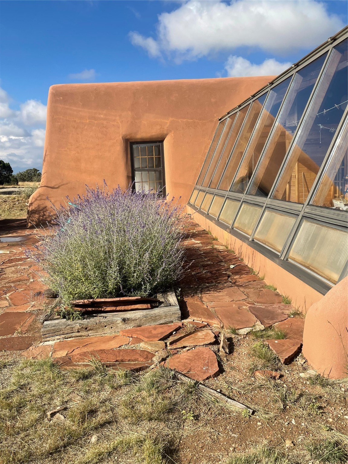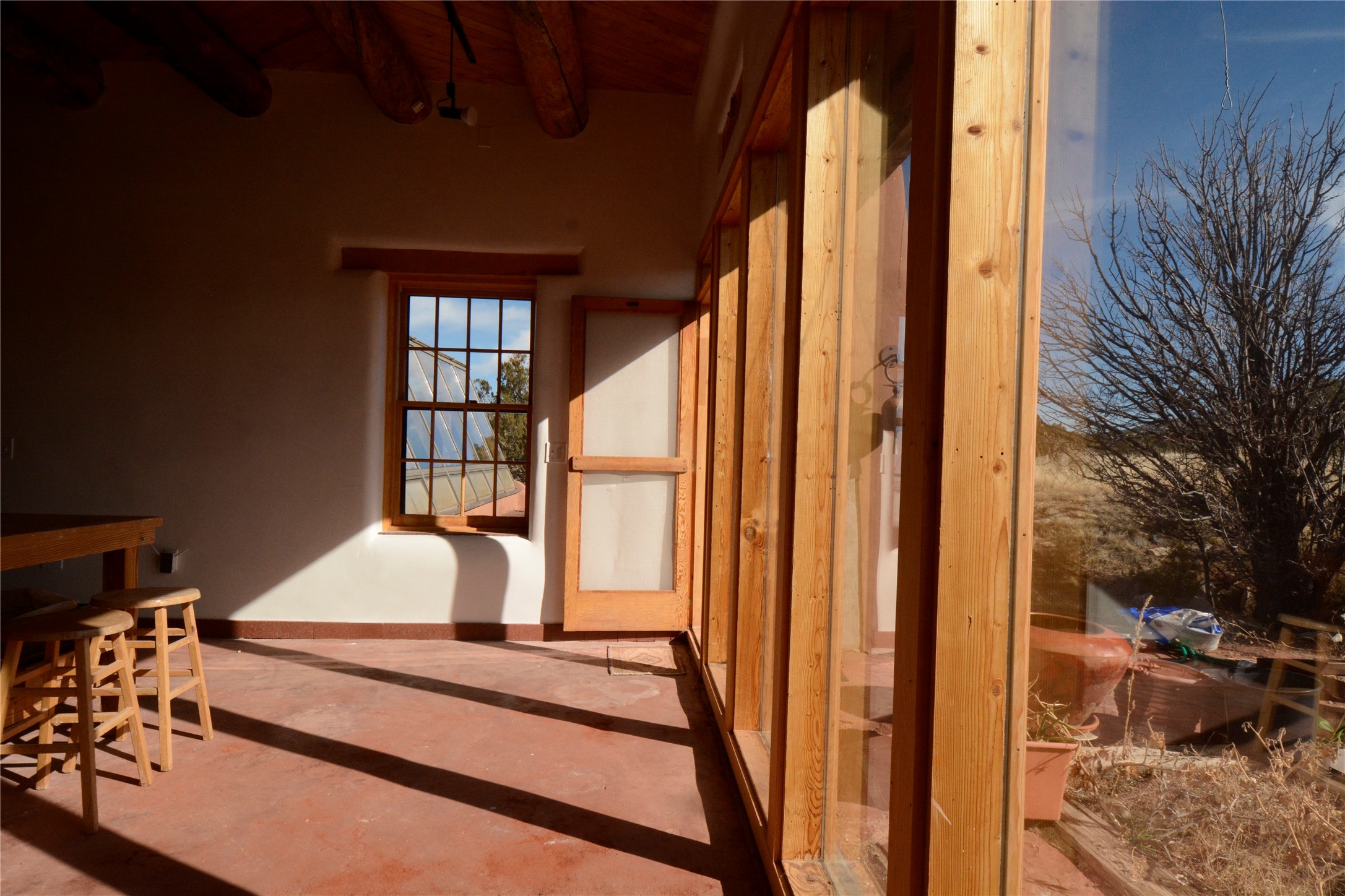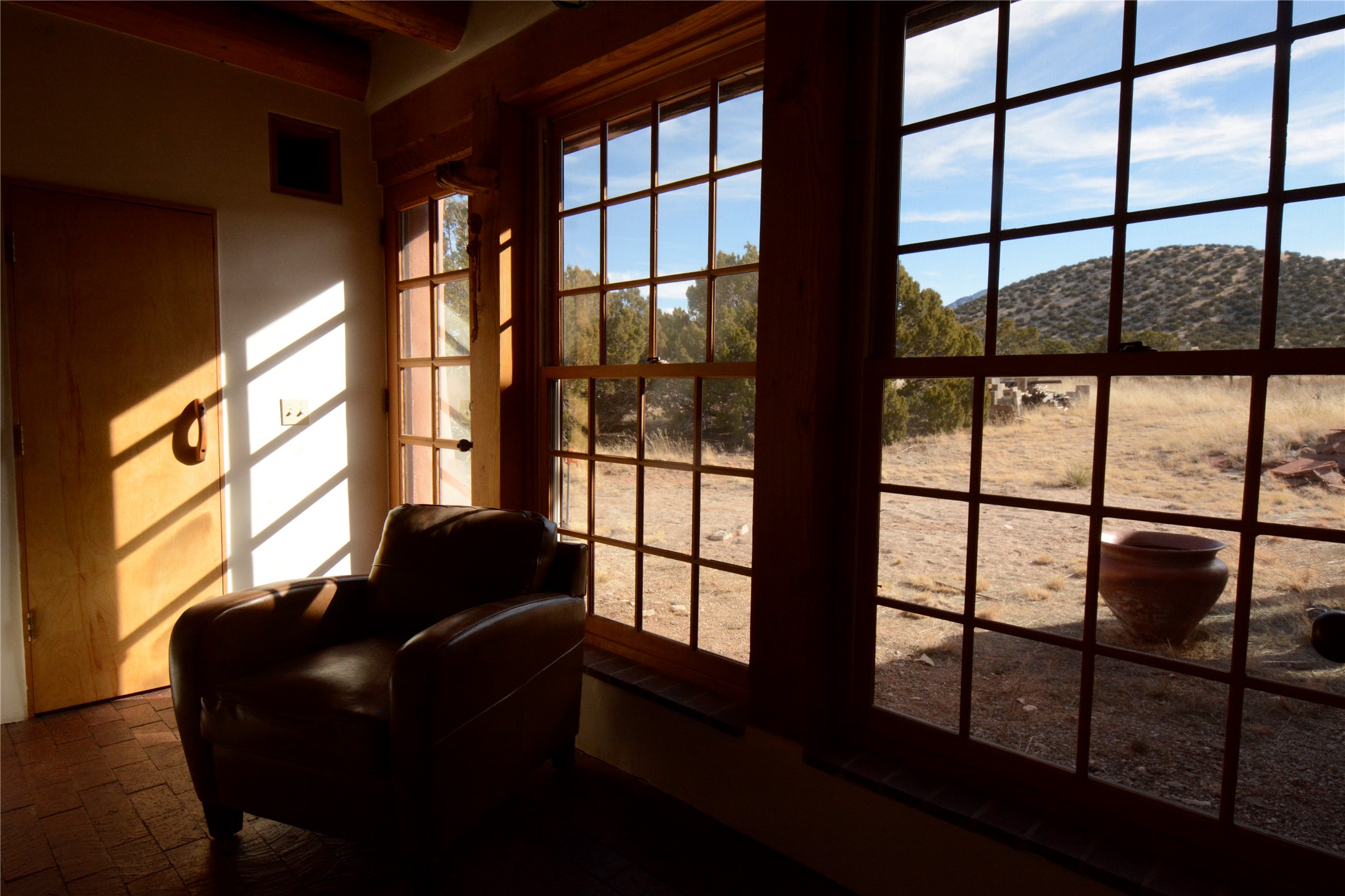 Nestled among the mountains along the Turquoise Trail south of Santa Fe is a private country living dream. Twenty acres of fenced land supports a sustainable complex that provides views, views, views and off grid existence. Horses? One can ride tremendous distances through endless beauty, directly from the property. The main house includes two bedrooms, an attached greenhouse for growing all year long, a SAUNA, and lovely adobe construction and detail. A _______ square foot Studio is also attached and heated with a large wood burning stove. An office is an extension of that space.An oversized garage is perfect for utilization of additional studio space, car storage, or eventual development for another living area or apartment (mother-in law, renters, caretakers?) This property offers so many choices for expansion. Imagination runs wild!