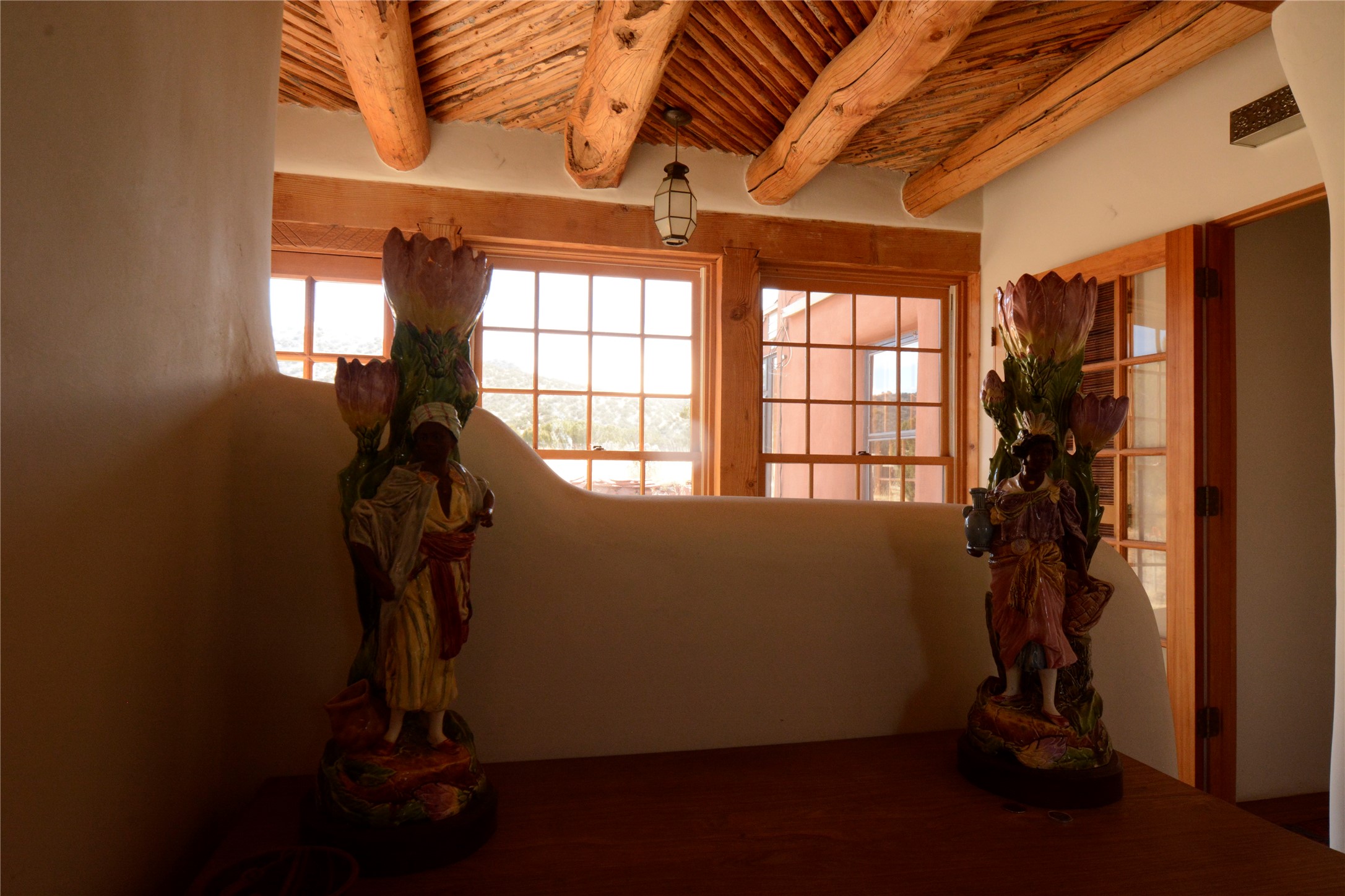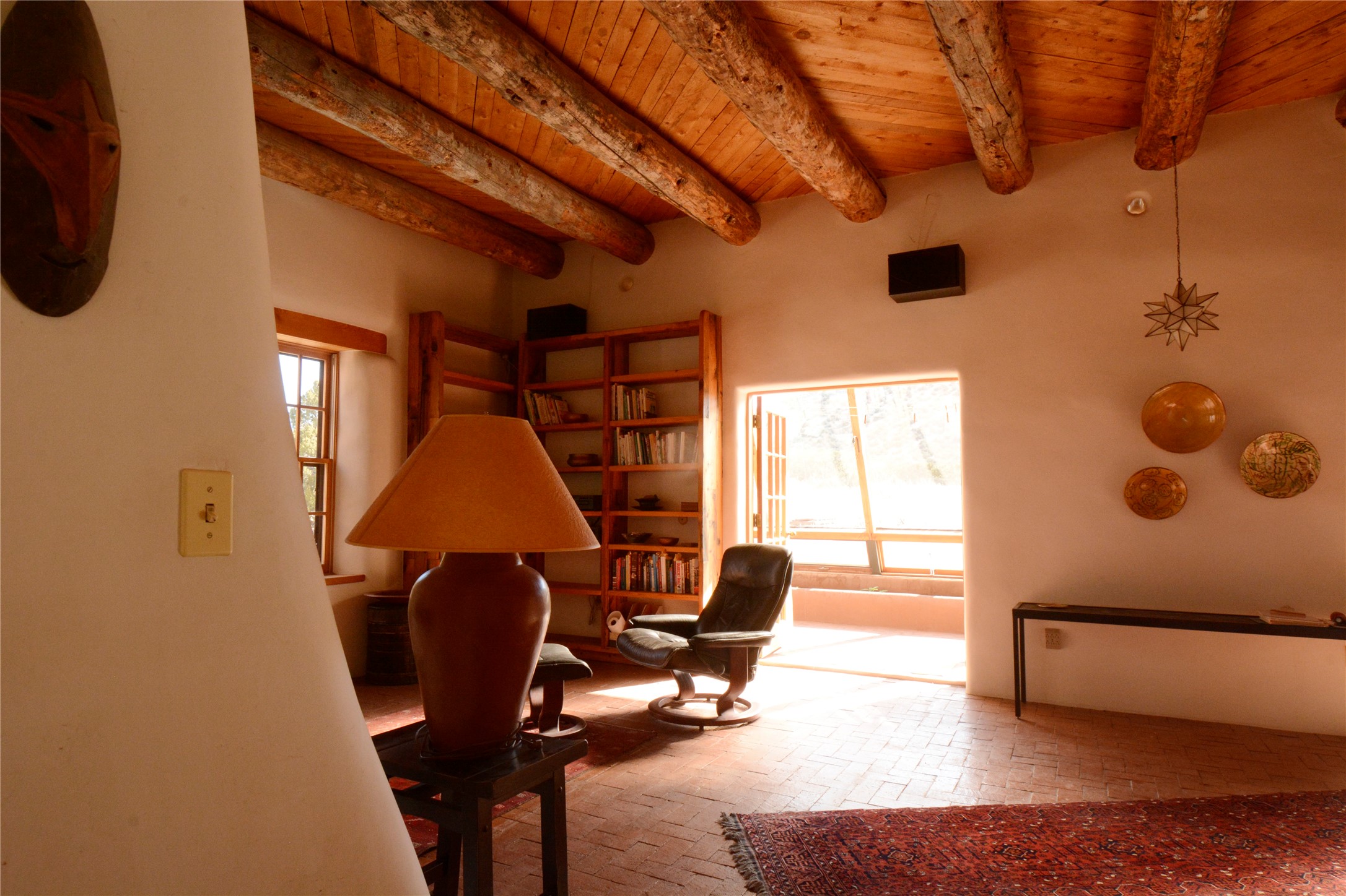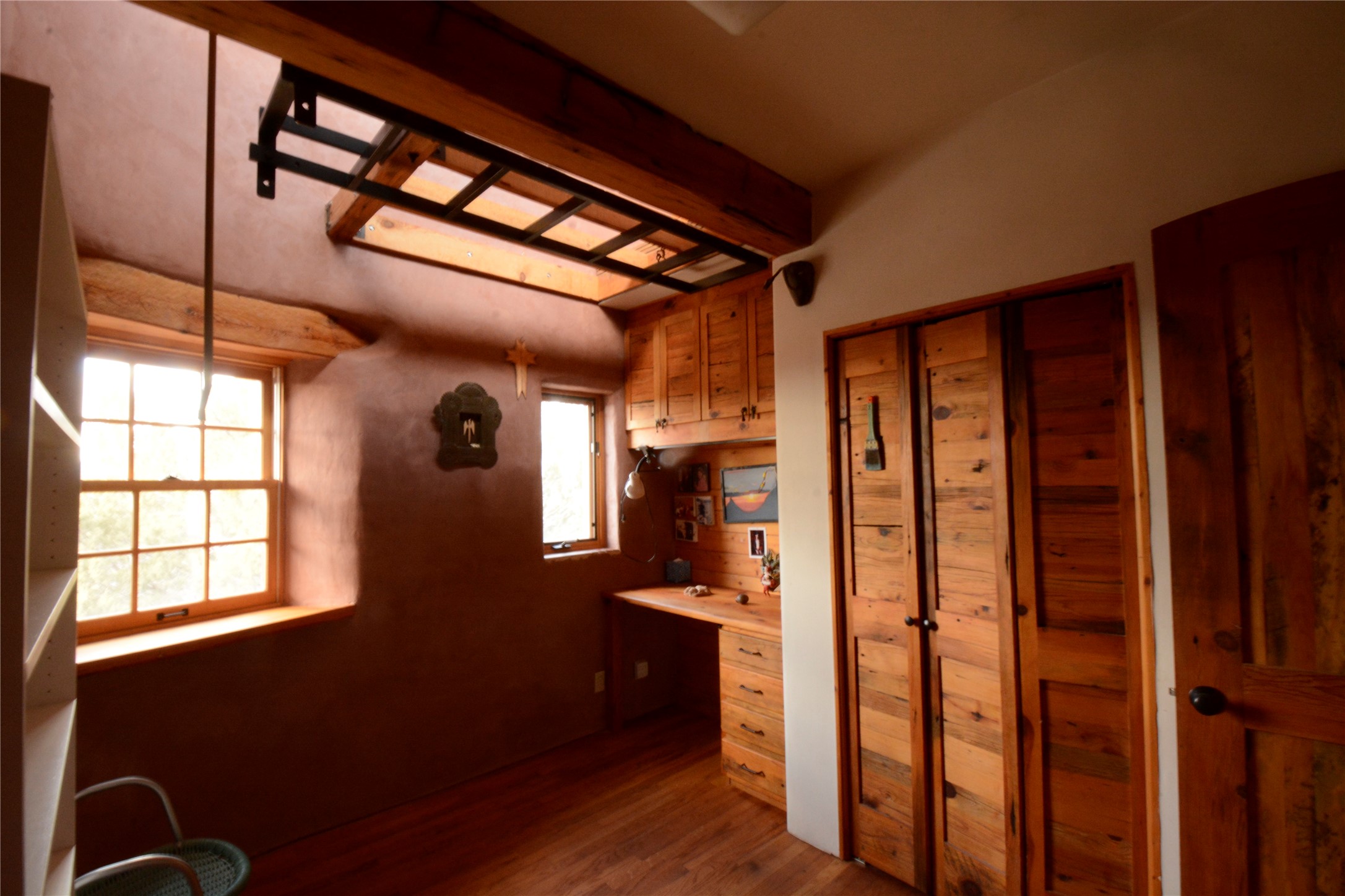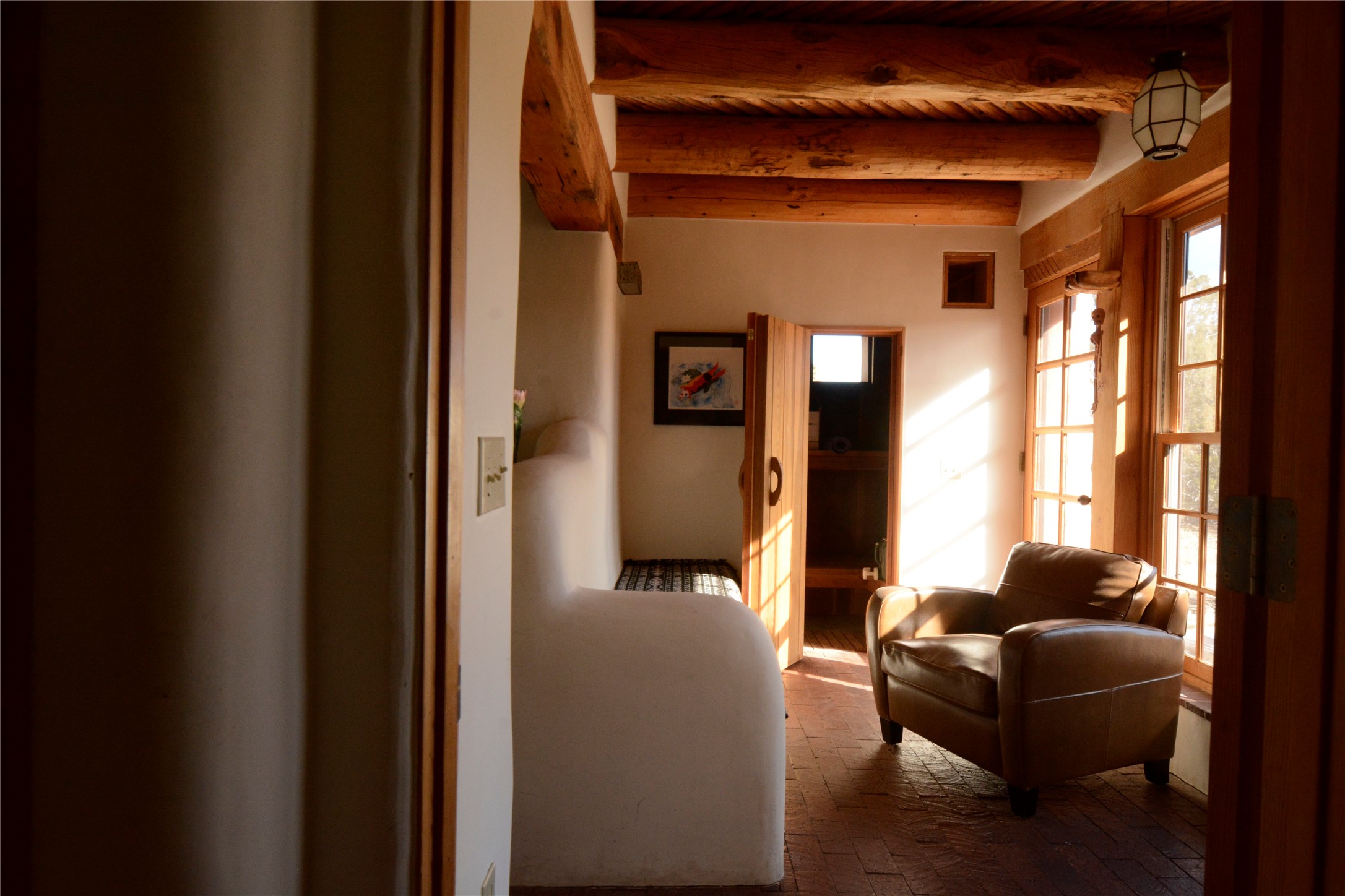 Nestled among the mountains along the Turquoise Trail south of Santa Fe is a private country living dream. Twenty acres of fenced land supports a sustainable complex that provides views, views, views and off grid existence. Horses? One can ride tremendous distances through endless beauty, directly from the property. The main house includes two bedrooms, an attached greenhouse for growing all year long, a SAUNA, and lovely adobe construction and detail. A _______ square foot Studio is also attached and heated with a large wood burning stove. An office is an extension of that space.An oversized garage is perfect for utilization of additional studio space, car storage, or eventual development for another living area or apartment (mother-in law, renters, caretakers?) This property offers so many choices for expansion. Imagination runs wild!