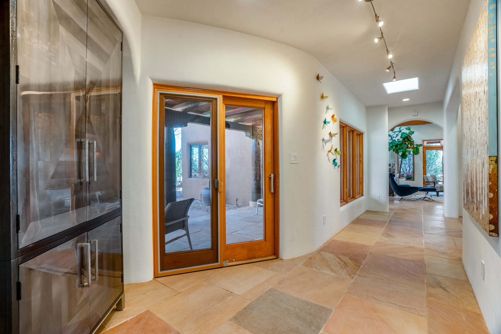 Experience the amazing Santa Fe sunsets while enjoying the privacy mature evergreen trees provide while snuggled up in front of one of the 4 kiva fireplaces in this 2860 sqft soft contemporary home with over 1200 sqft ofoutdoor portals. Superbly re-imagined in 2022.It perfectly blends traditional Santa Fe with elegant sleek lines of contemporary excellence. This 3 bedroom, 2.5 bathroom home boasts Venetian Plaster walls, vigas, beams, high ceilings, nichos, Chef's dream kitchen with Quartzite countertops, modern custom cabinets, Miele oven, microwave/convection, warming drawer, gas range top & dishwasher, Sub-Zero fridge & wine fridge with dual-zone control. Huge kitchen island & handy coffee bar surrounded by Ann Sachs backsplash tiles top off the quality and beauty of this magnificent remodel. The same level of quality detail extends to the Zen of the primary bathroom with the Bain Ultra-Essencia Bathtub, oversized shower & steam shower with full-length Quartz bench, Toto Smart toilet, custom His & Hers vanities with Robern mirrored medicine cabinets and highest quality Dornbracht & Waterworks hardware. Radiant in-floor heat throughout the home & 2 car garage, multiple mini-splits with heat & AC. Laundry room with Miele washer & dryer. Invisible Fence for the dogs. Situated on 1.171 acres in the exclusive La Mirada neighborhood offering natural gas, county water, and Las Campanas sewer system. Only 15 minutes to downtown Santa Fe. This home with so many upgrades& the many items that stay with the property make this Santa Fe sanctuary a wonderful place to relax under the stars.