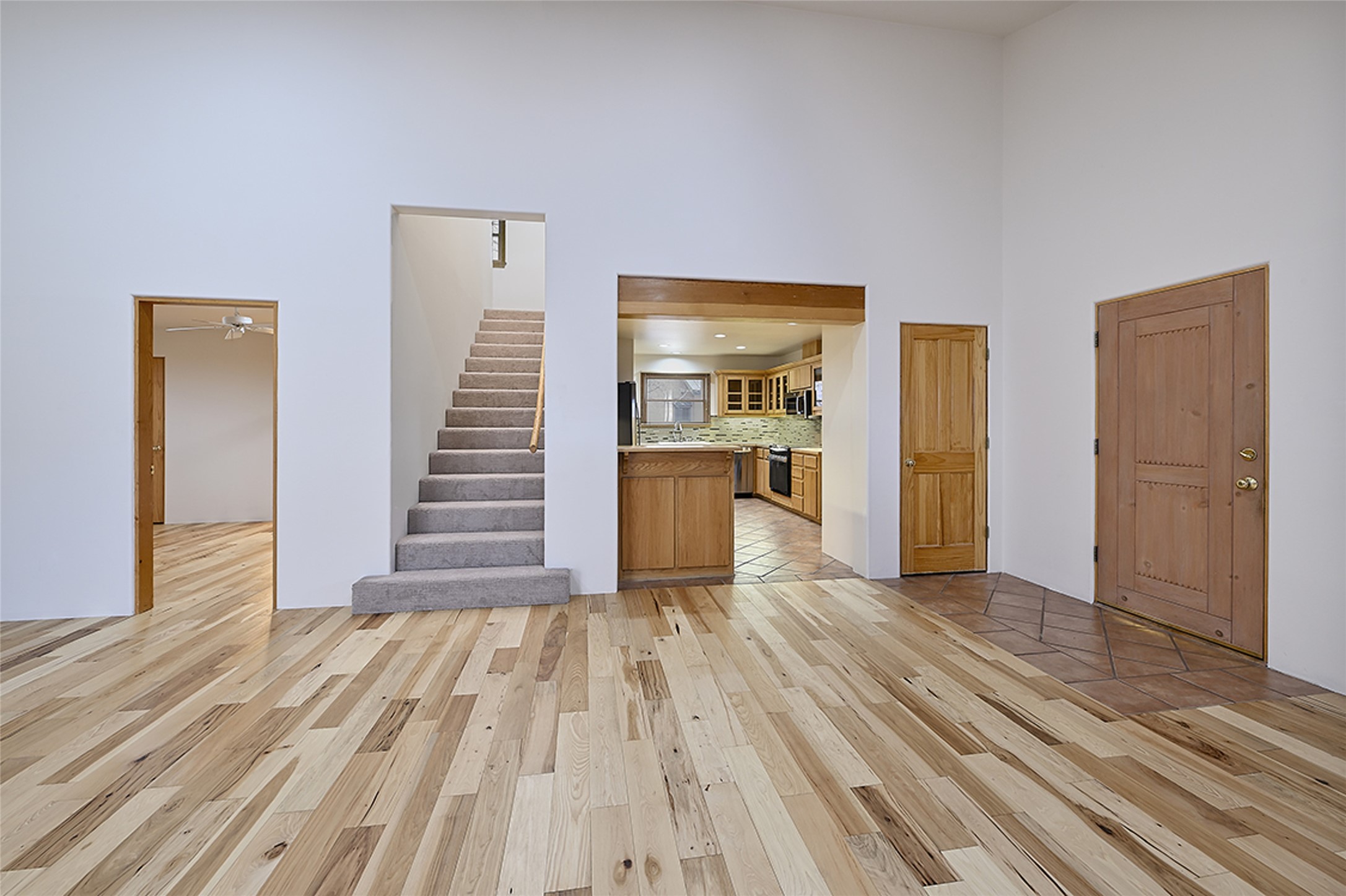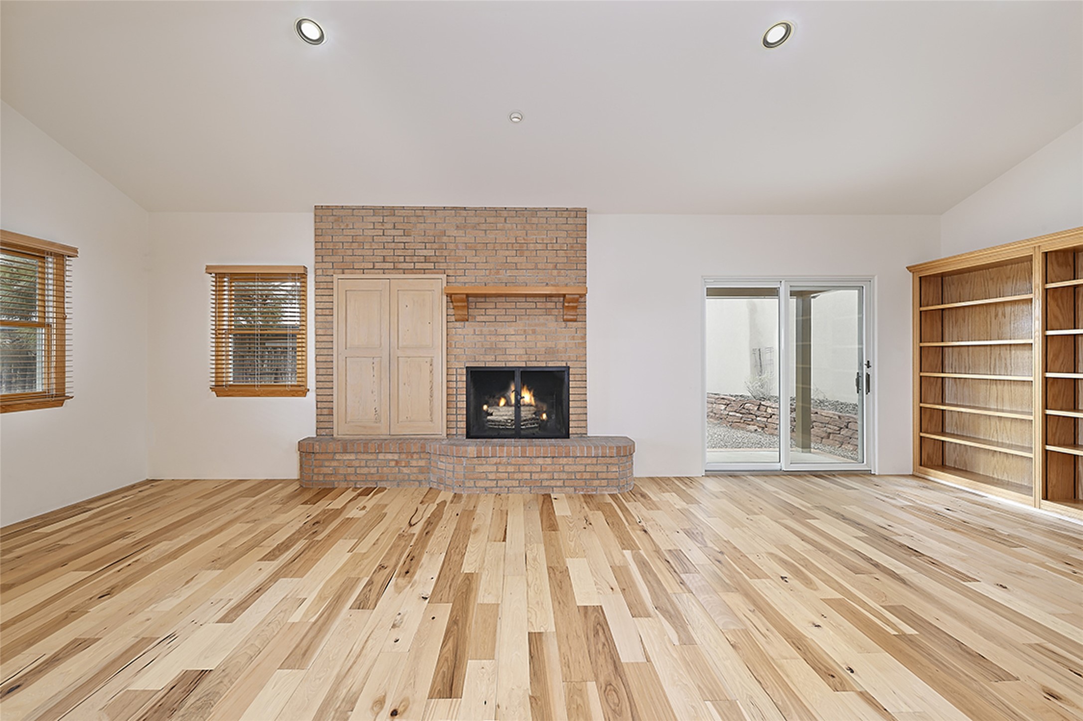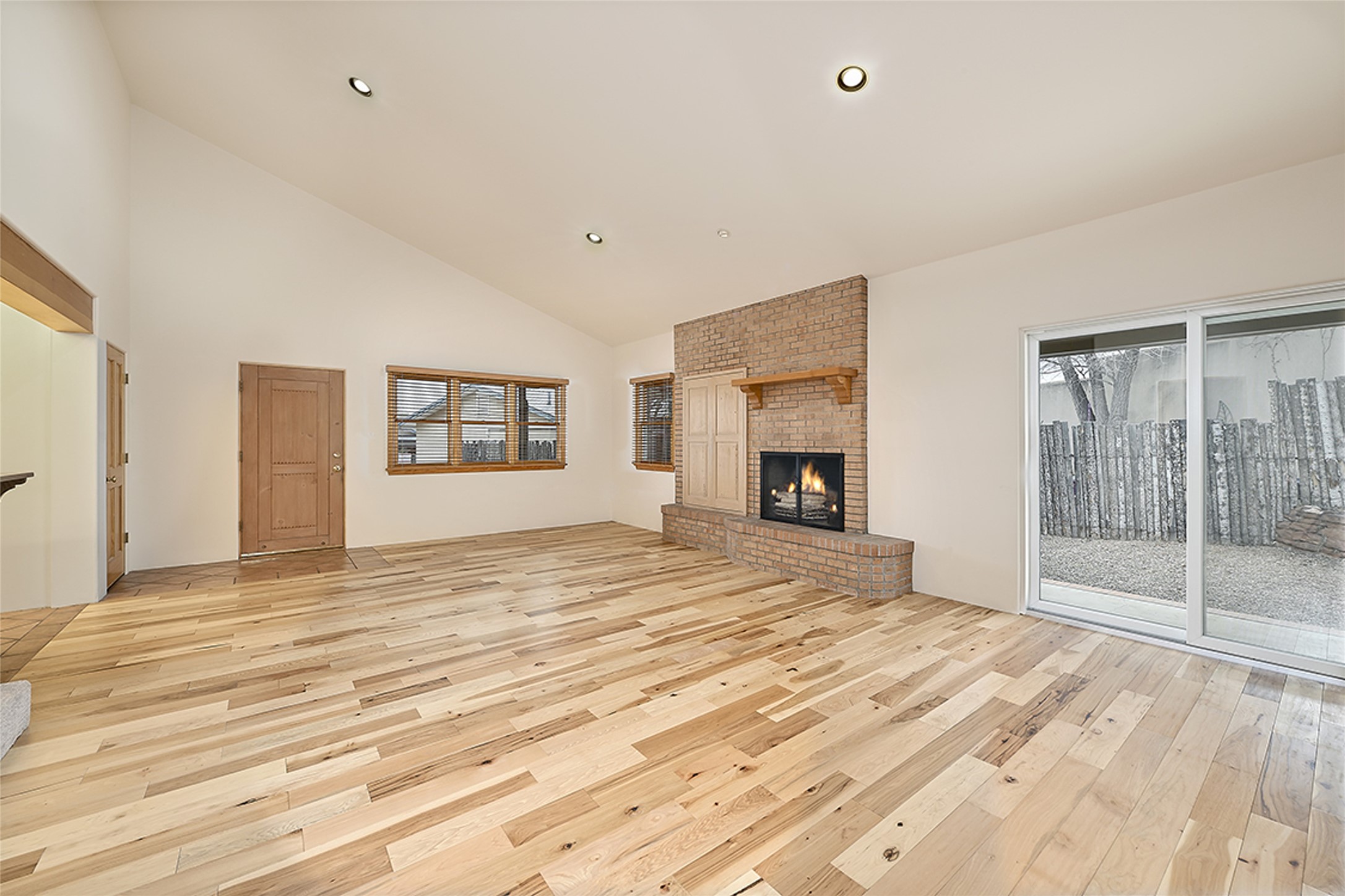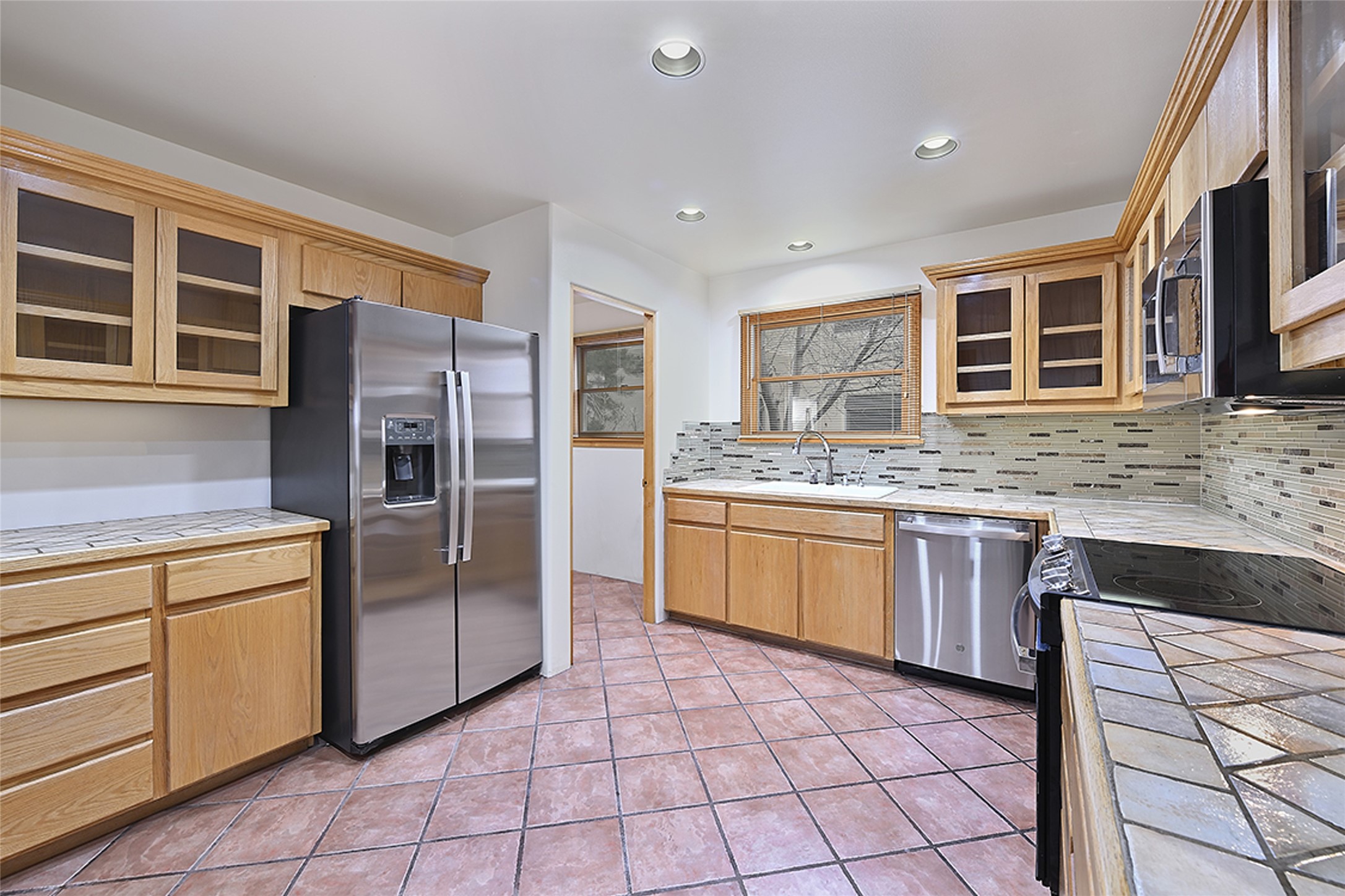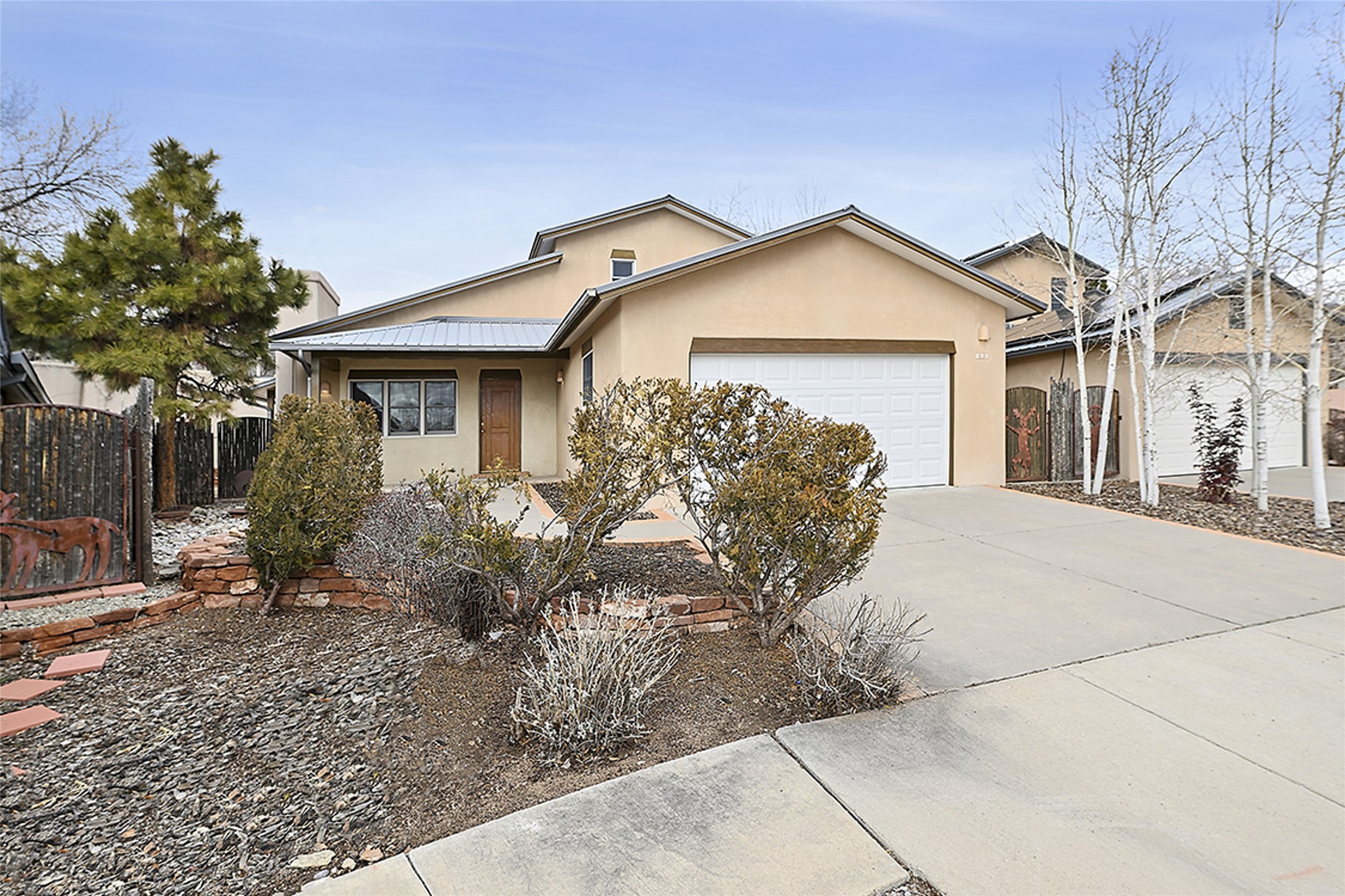 Remodeled 3 bedroom 2 bath two-story home in a close-in location. Recent improvements include new carpet and appliances, hickory hard wood floors, fresh paint and interior finishes. Spacious living room with a wall of built-in bookshelves and brick fireplace. Kitchen is appointed with sleek stainless-steel appliances, light wood cabinets and recessed lighting. There is a separate laundry/utility room with sink and extra cabinets. Modern baths. Third bedroom offers flex space as a studio or office. Backyard with covered patio. 2 car attached garage with built-in storage. Pitched metal roof. Conveniently located close to Frenchy's Field/Santa Fe River Trail, Santa Fe Plaza, Canyon Road, shopping, restaurants and medical center.