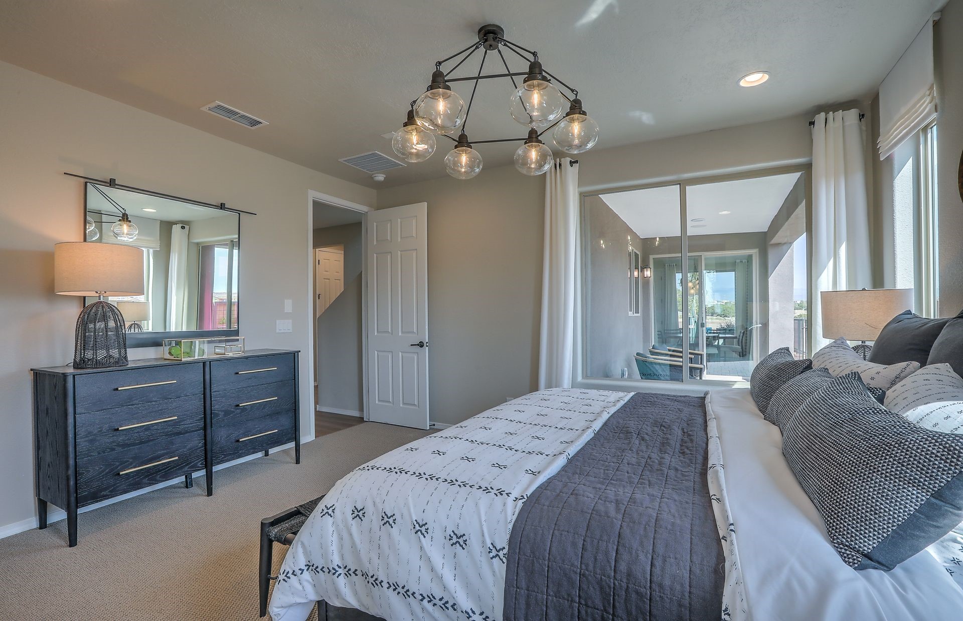 This beautiful Ocotillo plan offers the owner's suite on the main floor. The owner's bath includes a shower and a built-in deep soaking tub as well. There are two spacious bedrooms upstairs as well as a huge 300 square foot game room. An upstairs balcony allows you to soak up some sunshine. The kitchen offers beautiful white cabinets, quartz countertops and built-in stainless-steel appliances. Located within walking distance to a large park, walking trails, I-25 & shopping.