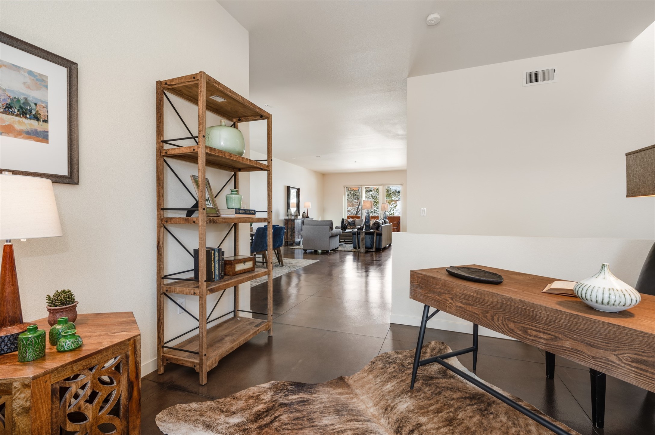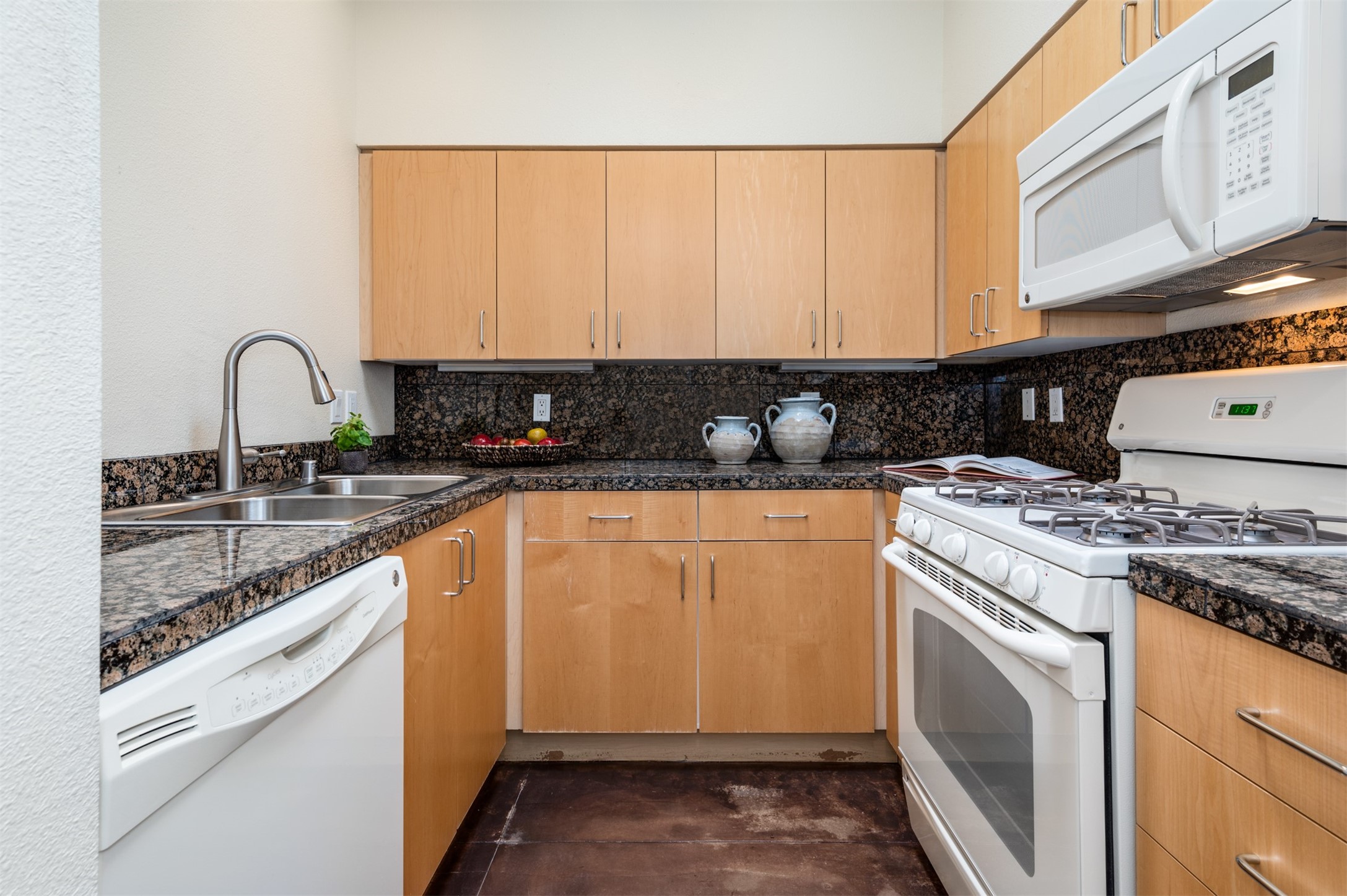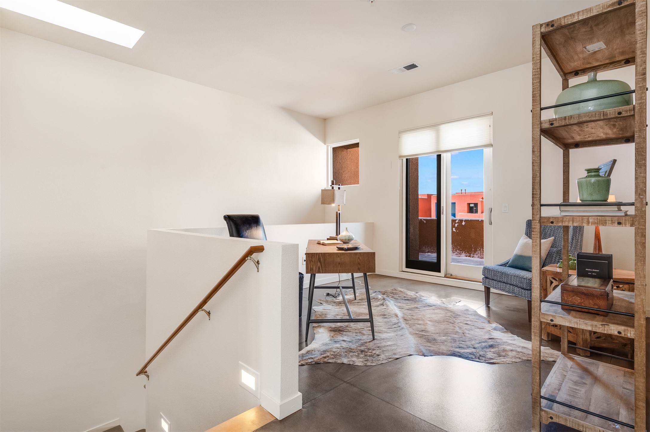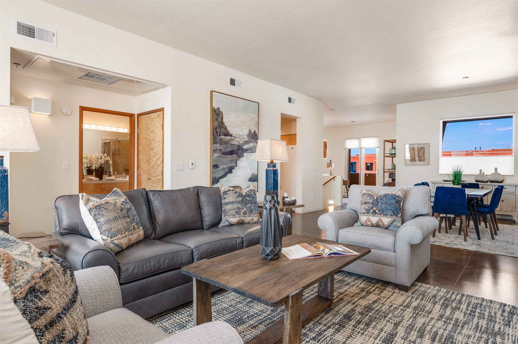 Wonderful loft style two level home with one bedroom, one full bath, and a study. The study may be converted into a second bedroom with minimal remodel. Open floor plan with a lot of light pouring in thru the windows and skylights. Enter thru the front door or the attached garage into an entrance foyer with a closet and up the stairs to the main level. Some features include easy to care stained concrete floors throughout, granite tile in the kitchen counter, travertine stone tile in the bathroom and A/C. The bathroom has a double vanity, a tub/shower combination and a pocket door into a separate water closet with a built-in cabinet. Two outdoor spaces with a balcony off the study and a private deck off the living room, overlooking an open space. One owner condominium. Located in the beautiful Zocalo complex and with close proximity to the clubhouse, pool, spa and fitness center.