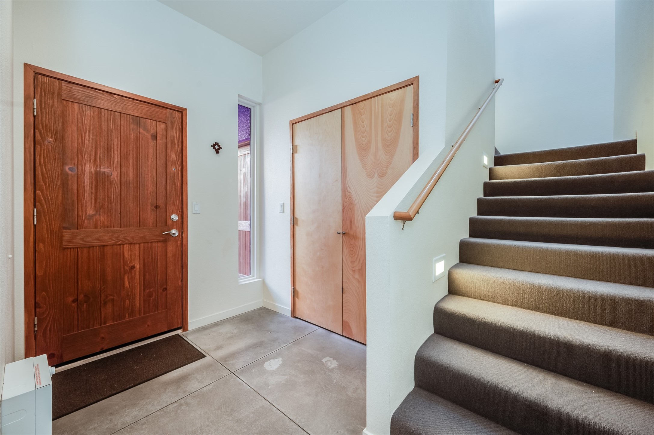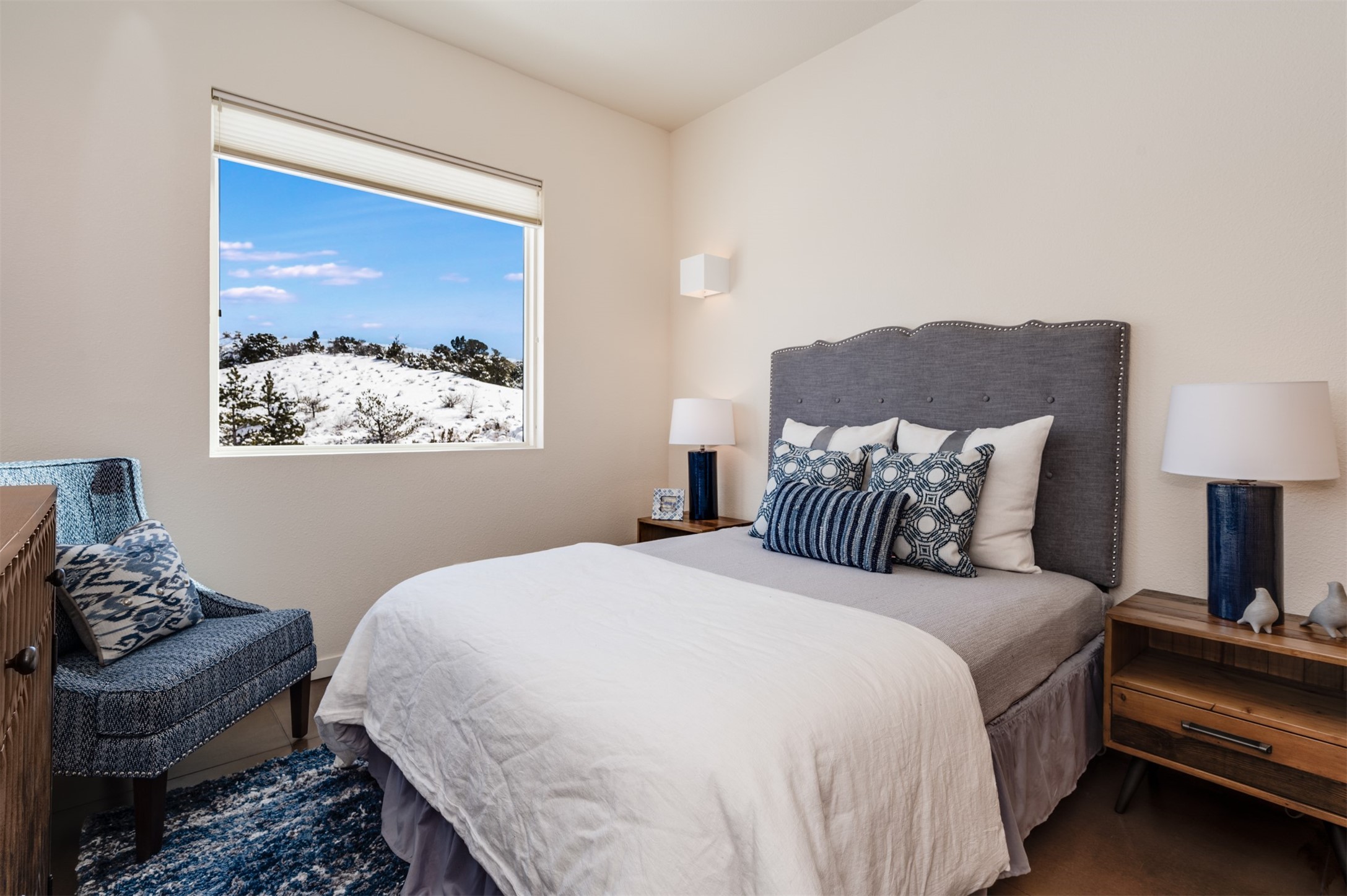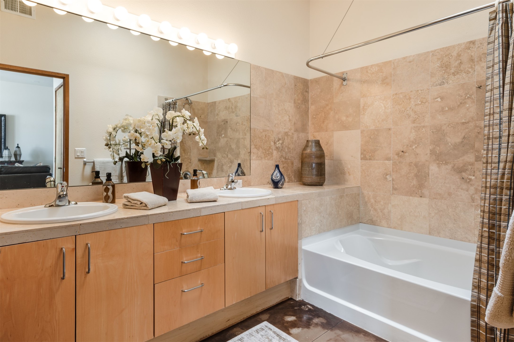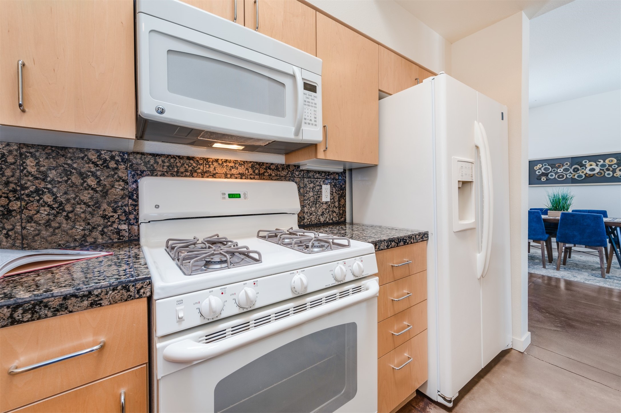 Wonderful loft style two level home with one bedroom, one full bath, and a study. The study may be converted into a second bedroom with minimal remodel. Open floor plan with a lot of light pouring in thru the windows and skylights. Enter thru the front door or the attached garage into an entrance foyer with a closet and up the stairs to the main level. Some features include easy to care stained concrete floors throughout, granite tile in the kitchen counter, travertine stone tile in the bathroom and A/C. The bathroom has a double vanity, a tub/shower combination and a pocket door into a separate water closet with a built-in cabinet. Two outdoor spaces with a balcony off the study and a private deck off the living room, overlooking an open space. One owner condominium. Located in the beautiful Zocalo complex and with close proximity to the clubhouse, pool, spa and fitness center.