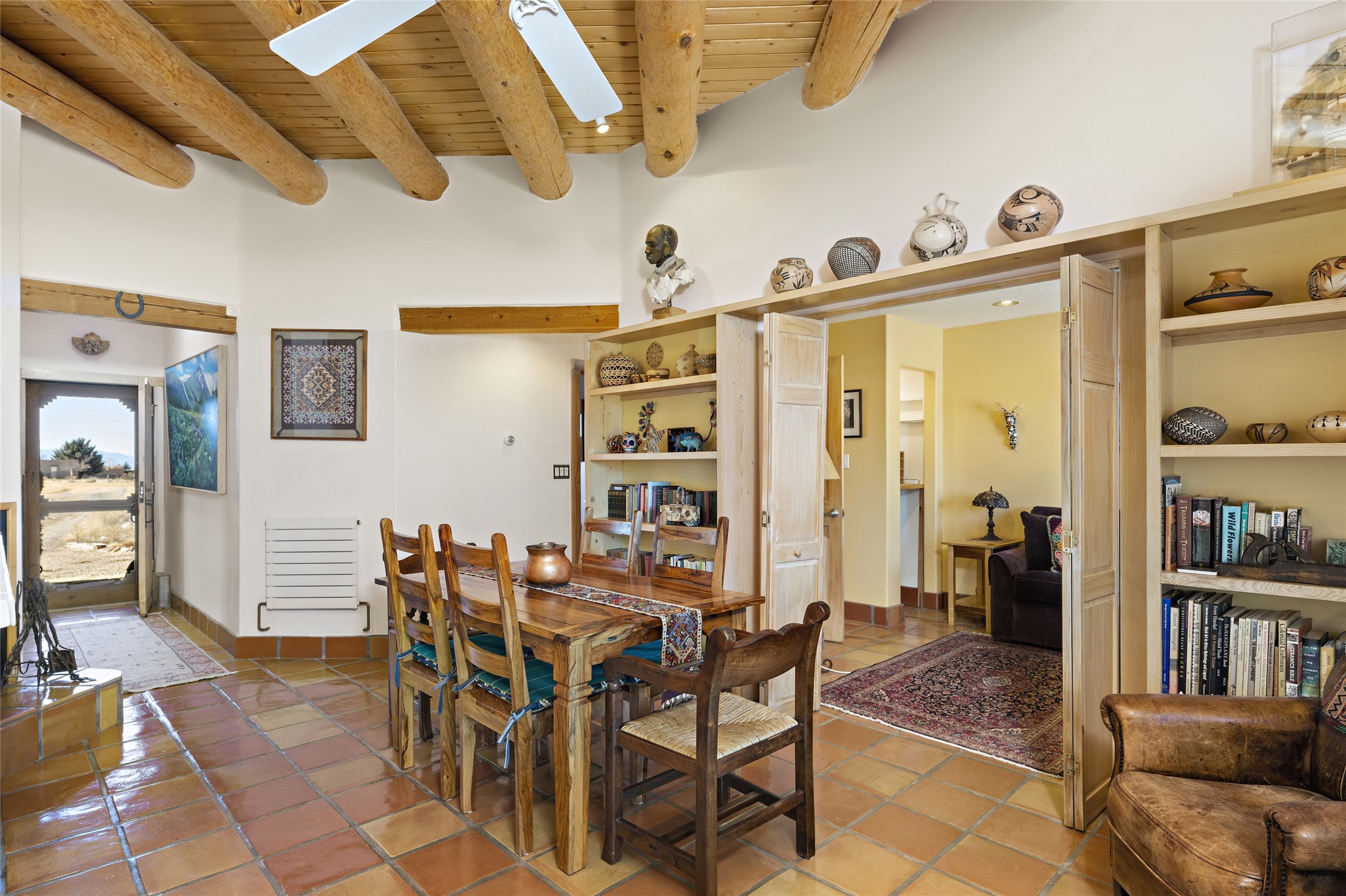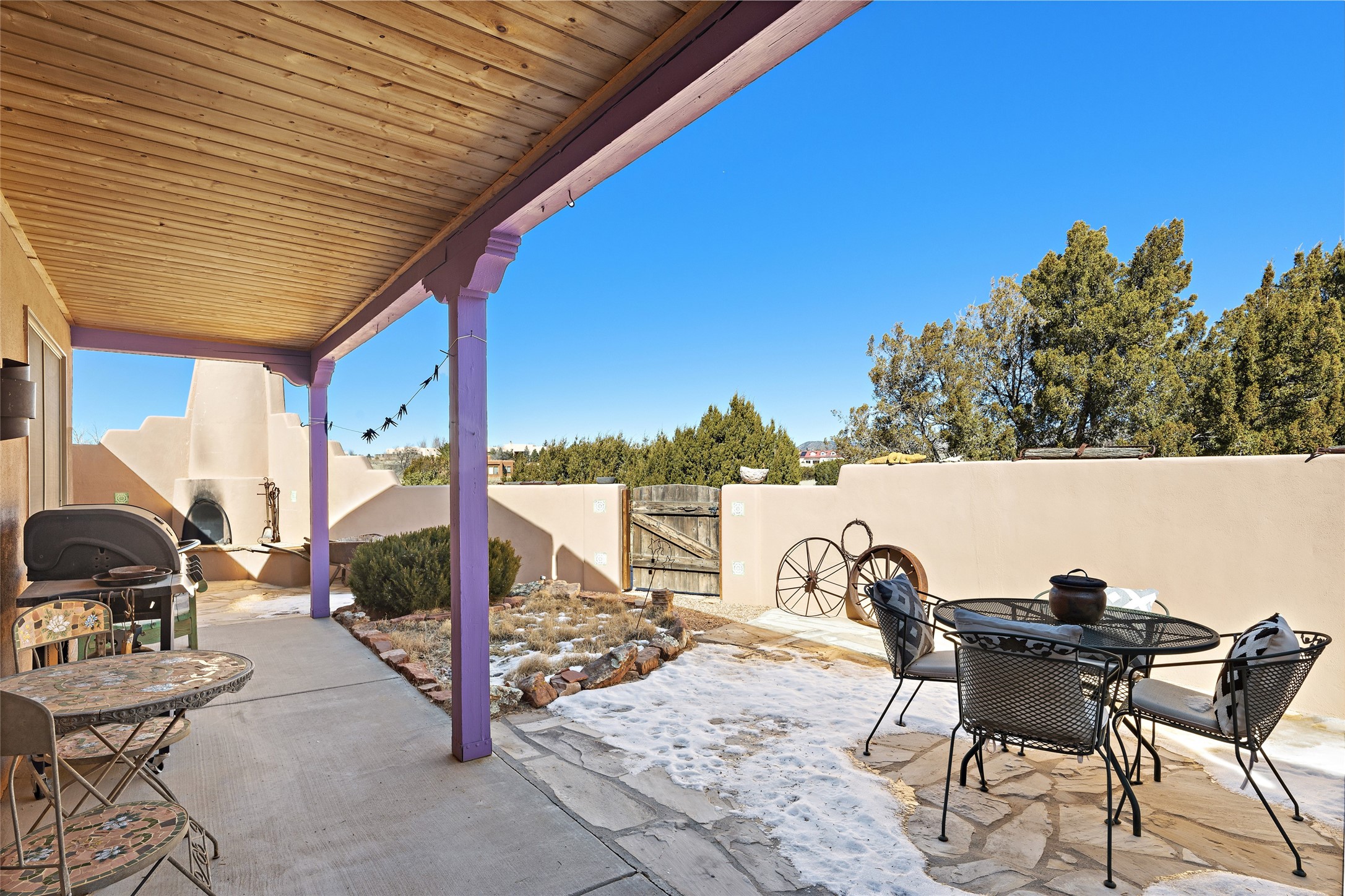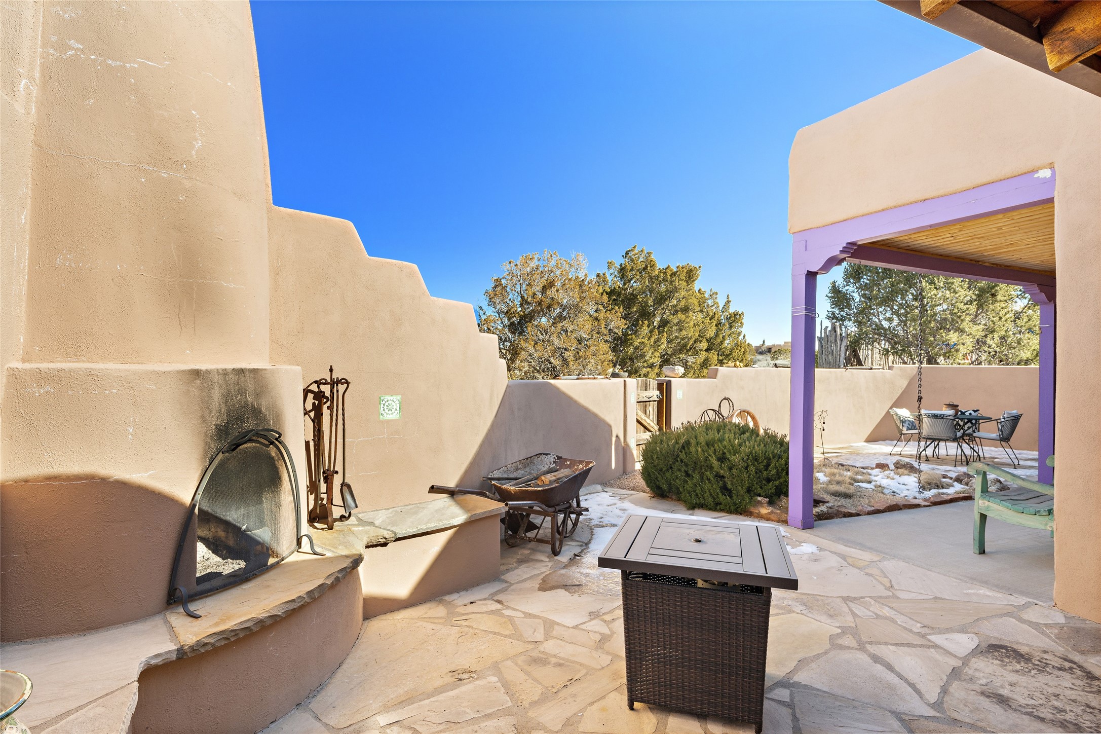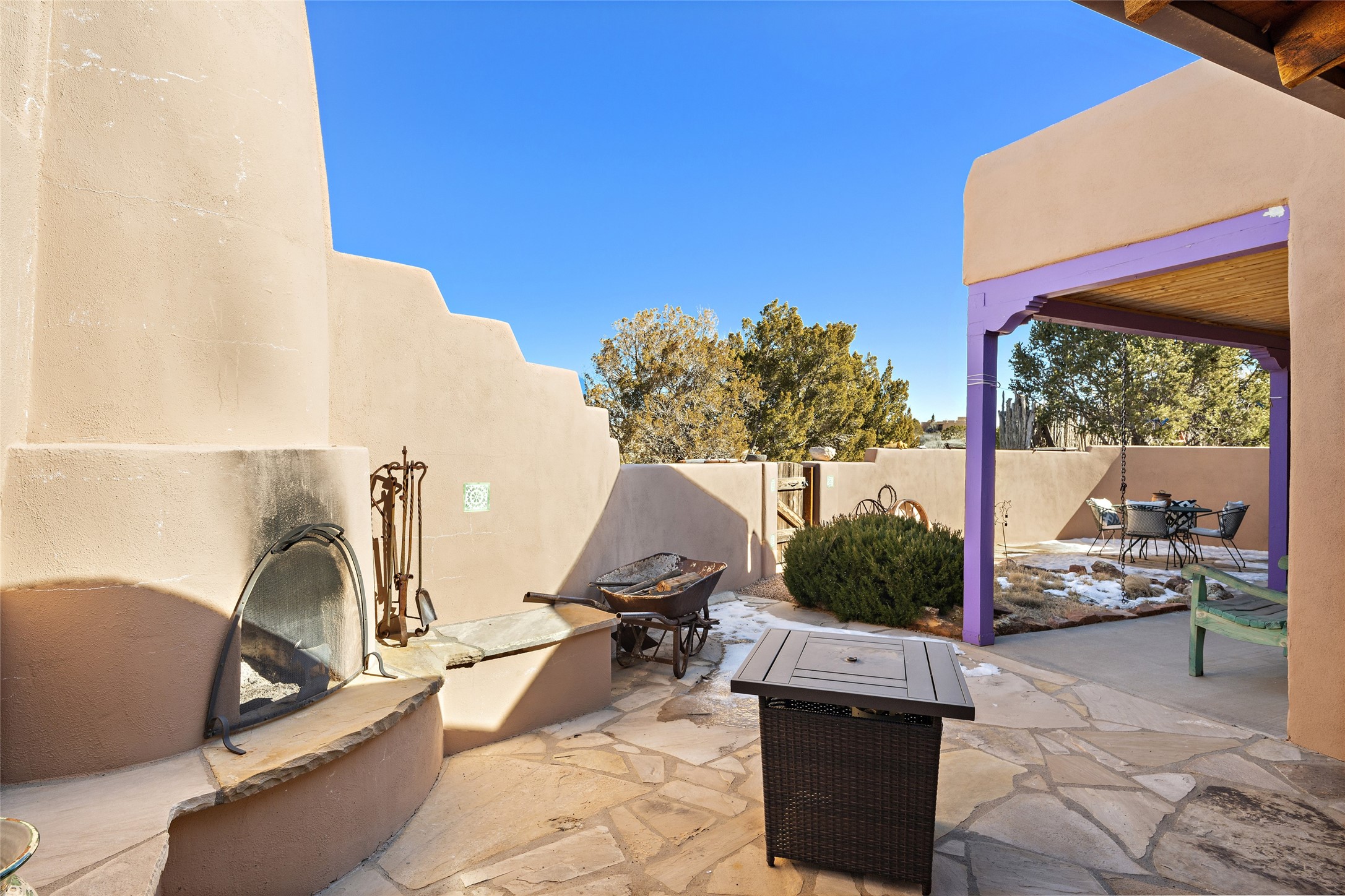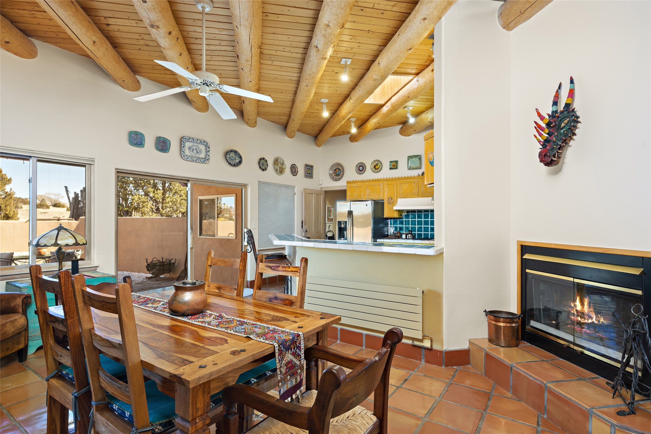 An El Dorado Beauty nestled along an arroyo with all the Santa Fe charm you're looking for. Get cozy in front of the dual fireplace in the living room or dining area or step outside to an outdoor kiva fire on the lovely flagstone patio. Situated at the end of a cul de sac, quiet and serene with abundant natural light, mostly newer windows, newer saltillo tile and wool carpeting accompany handsome built in book shelves and solar powered to keep your electric bill practically nonexistent. Third bedroom makes an optimal den space, opening up the common area superbly. If you're looking for that extra space for art or study, this attached, heated and bright studio, with it's own exterior access is just the space you're looking for. Mountain views, nearby walking trails, newer on demand boiler/water heater, entire exterior elastomeric coated last year, recently redone parapets and canales with a maintained roof, this home is ready for you!