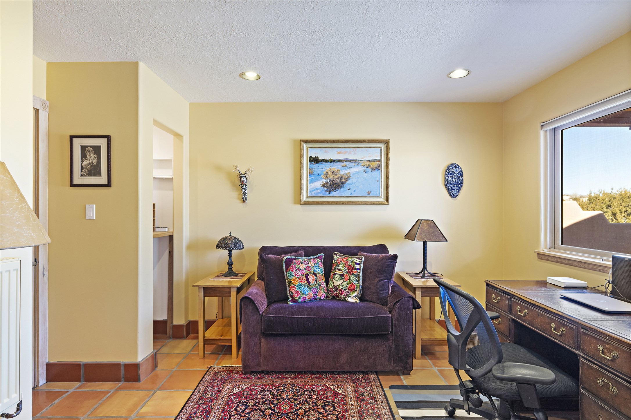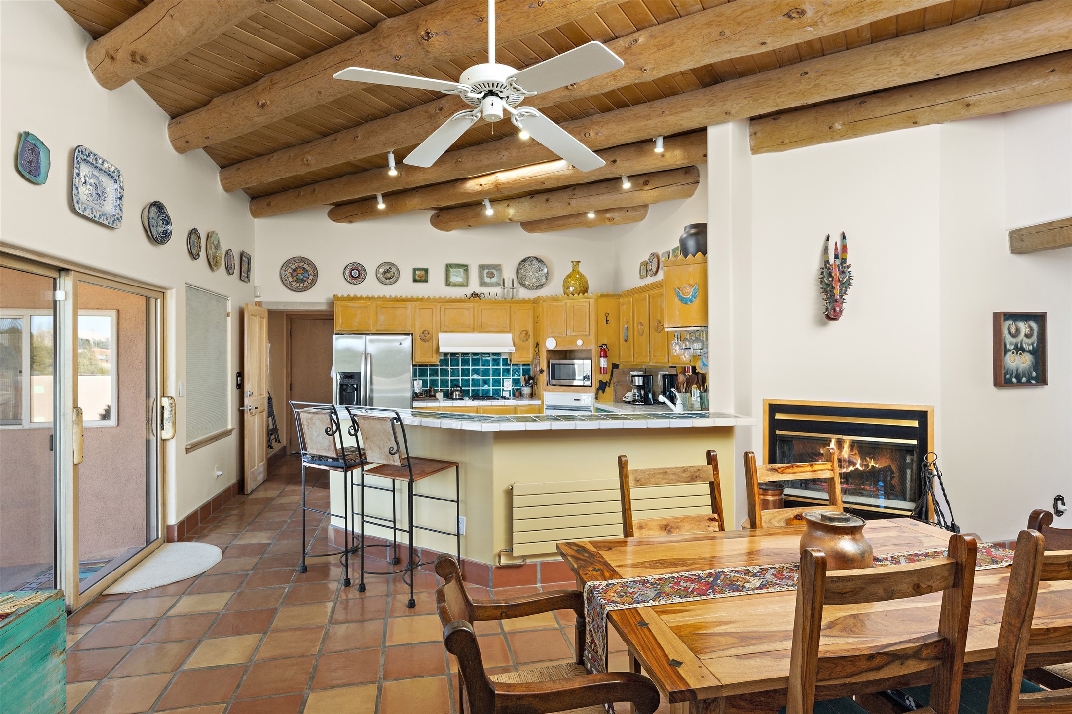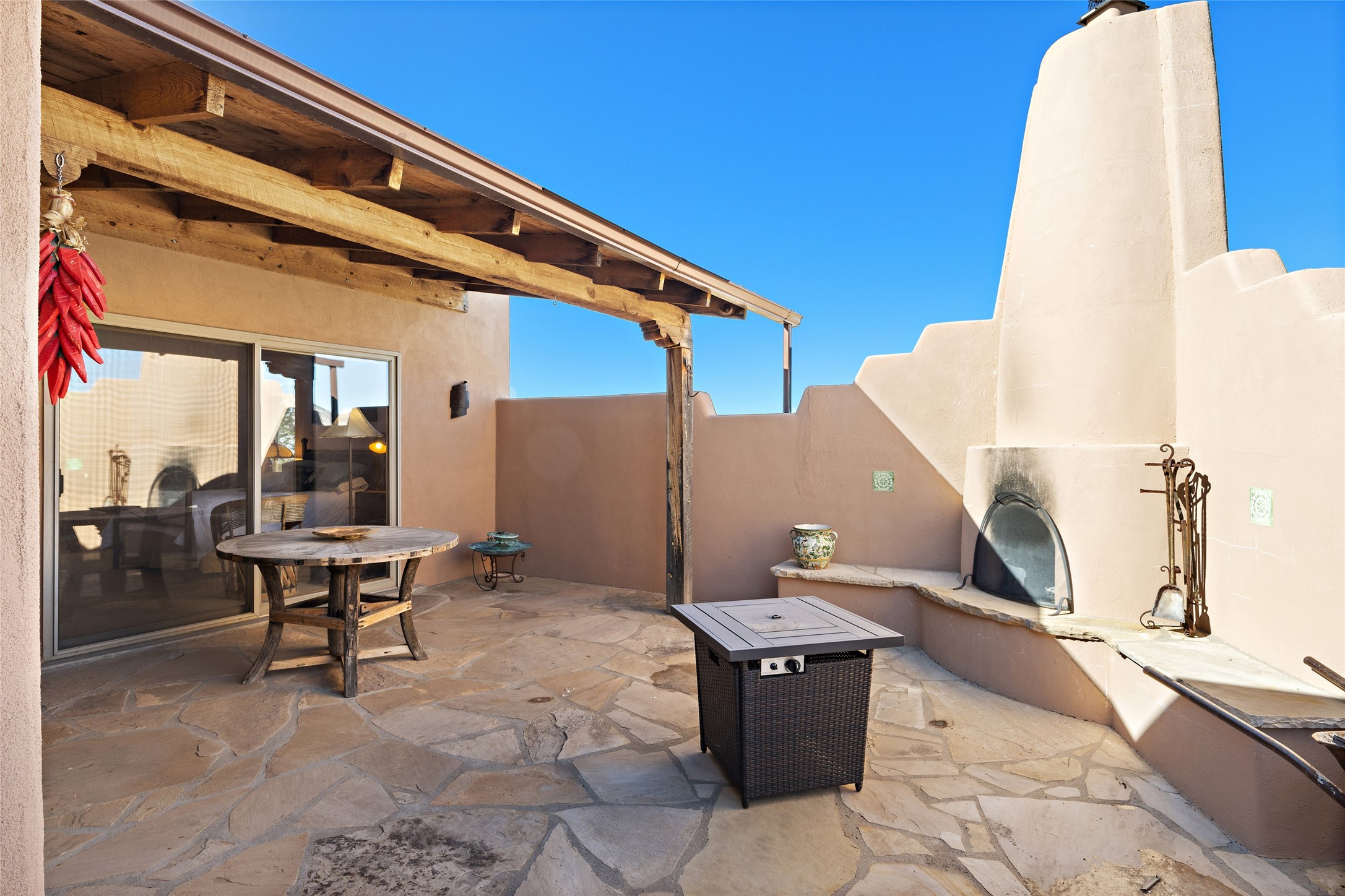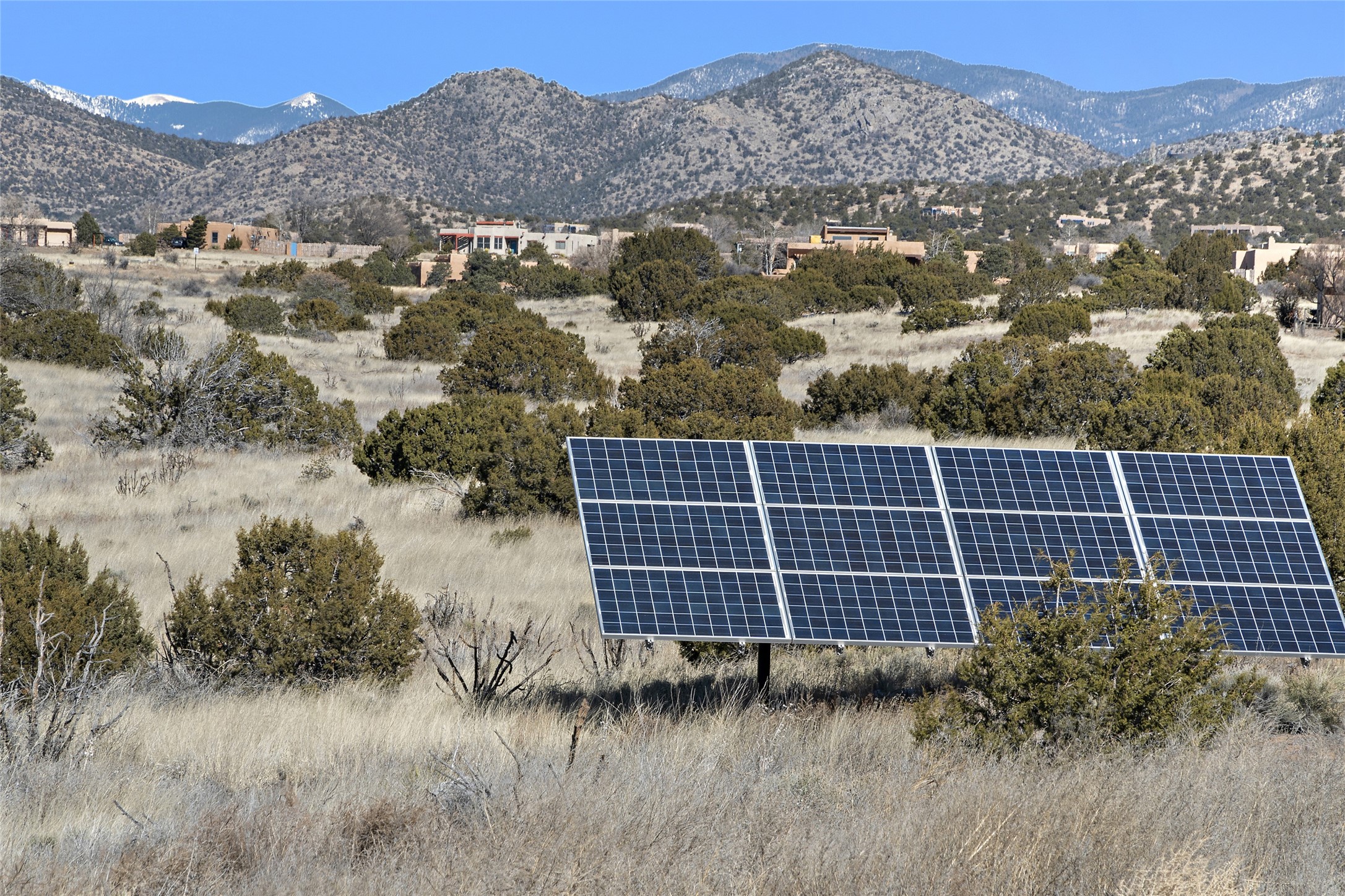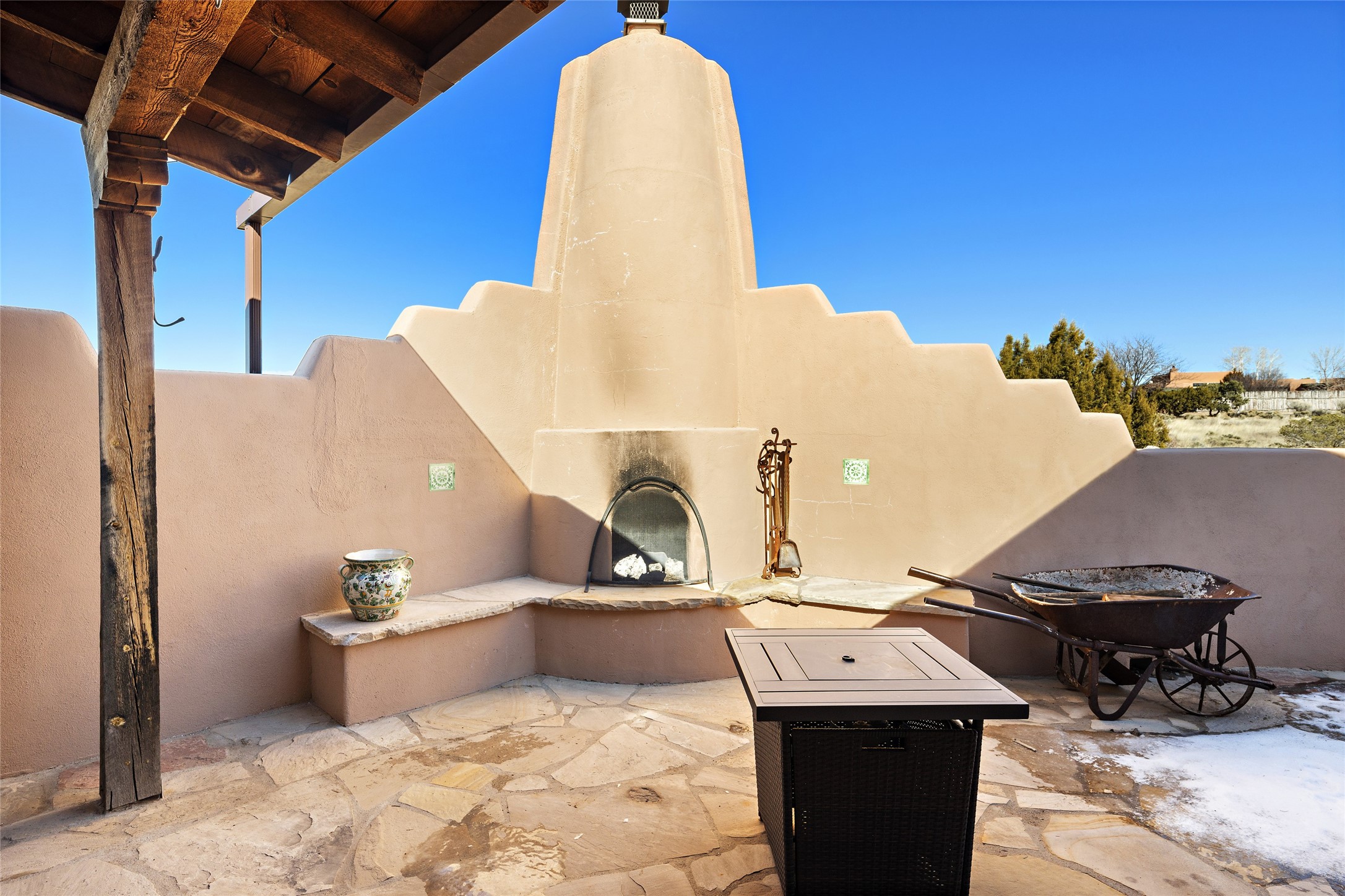 An El Dorado Beauty nestled along an arroyo with all the Santa Fe charm you're looking for. Get cozy in front of the dual fireplace in the living room or dining area or step outside to an outdoor kiva fire on the lovely flagstone patio. Situated at the end of a cul de sac, quiet and serene with abundant natural light, mostly newer windows, newer saltillo tile and wool carpeting accompany handsome built in book shelves and solar powered to keep your electric bill practically nonexistent. Third bedroom makes an optimal den space, opening up the common area superbly. If you're looking for that extra space for art or study, this attached, heated and bright studio, with it's own exterior access is just the space you're looking for. Mountain views, nearby walking trails, newer on demand boiler/water heater, entire exterior elastomeric coated last year, recently redone parapets and canales with a maintained roof, this home is ready for you!
