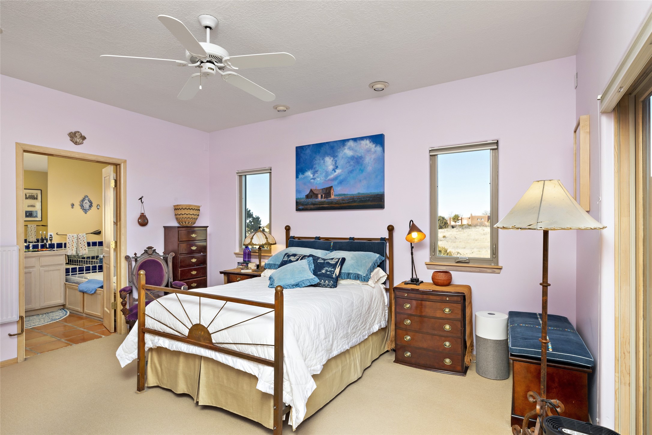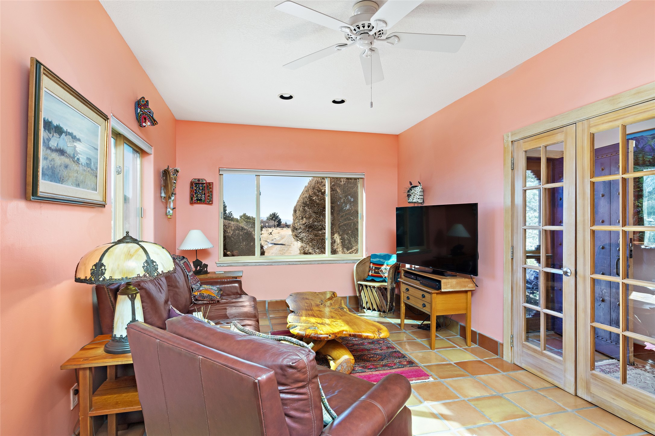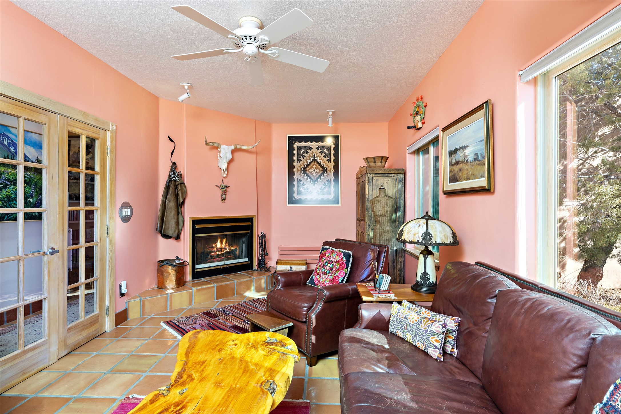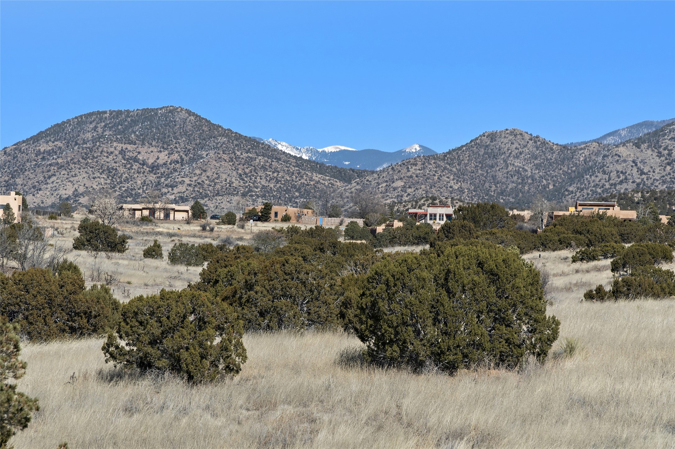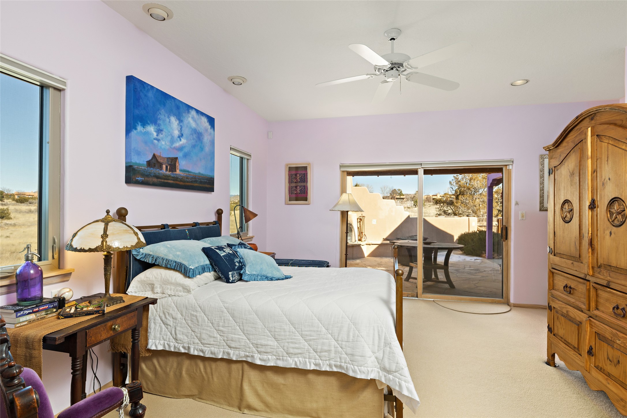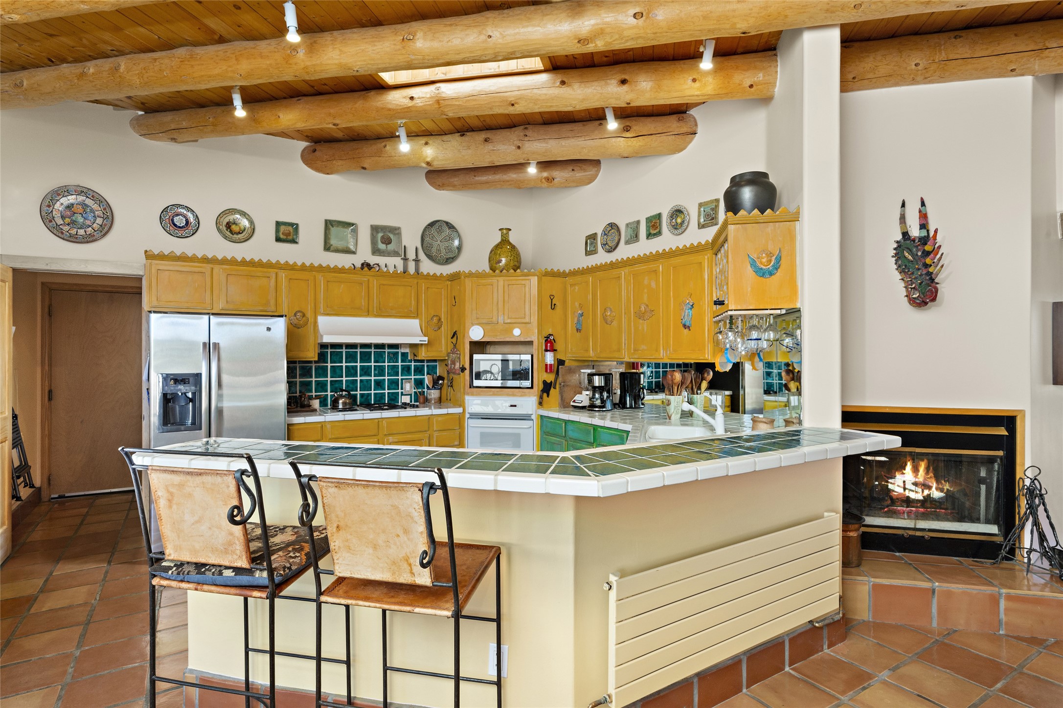 An El Dorado Beauty nestled along an arroyo with all the Santa Fe charm you're looking for. Get cozy in front of the dual fireplace in the living room or dining area or step outside to an outdoor kiva fire on the lovely flagstone patio. Situated at the end of a cul de sac, quiet and serene with abundant natural light, mostly newer windows, newer saltillo tile and wool carpeting accompany handsome built in book shelves and solar powered to keep your electric bill practically nonexistent. Third bedroom makes an optimal den space, opening up the common area superbly. If you're looking for that extra space for art or study, this attached, heated and bright studio, with it's own exterior access is just the space you're looking for. Mountain views, nearby walking trails, newer on demand boiler/water heater, entire exterior elastomeric coated last year, recently redone parapets and canales with a maintained roof, this home is ready for you!