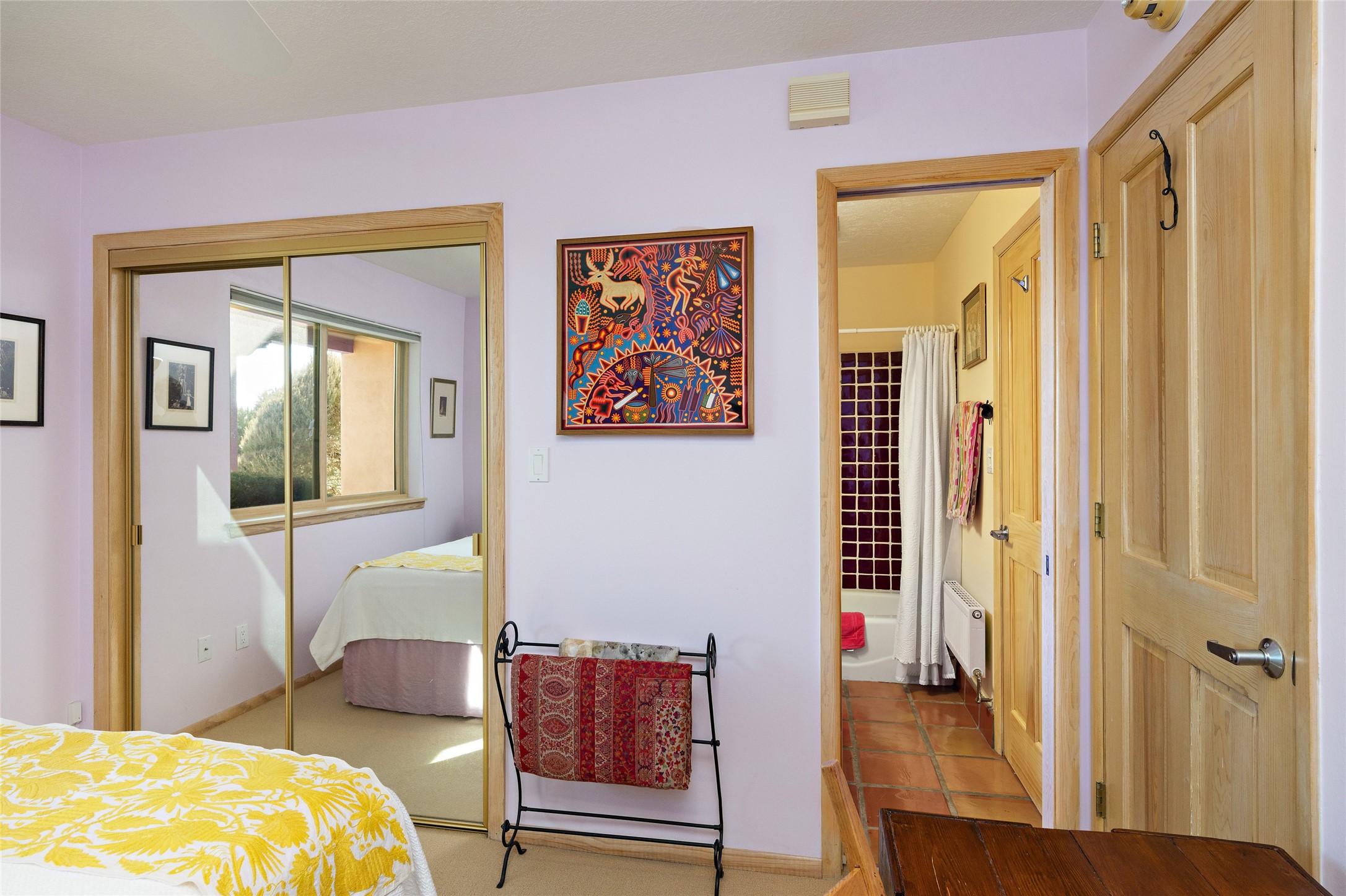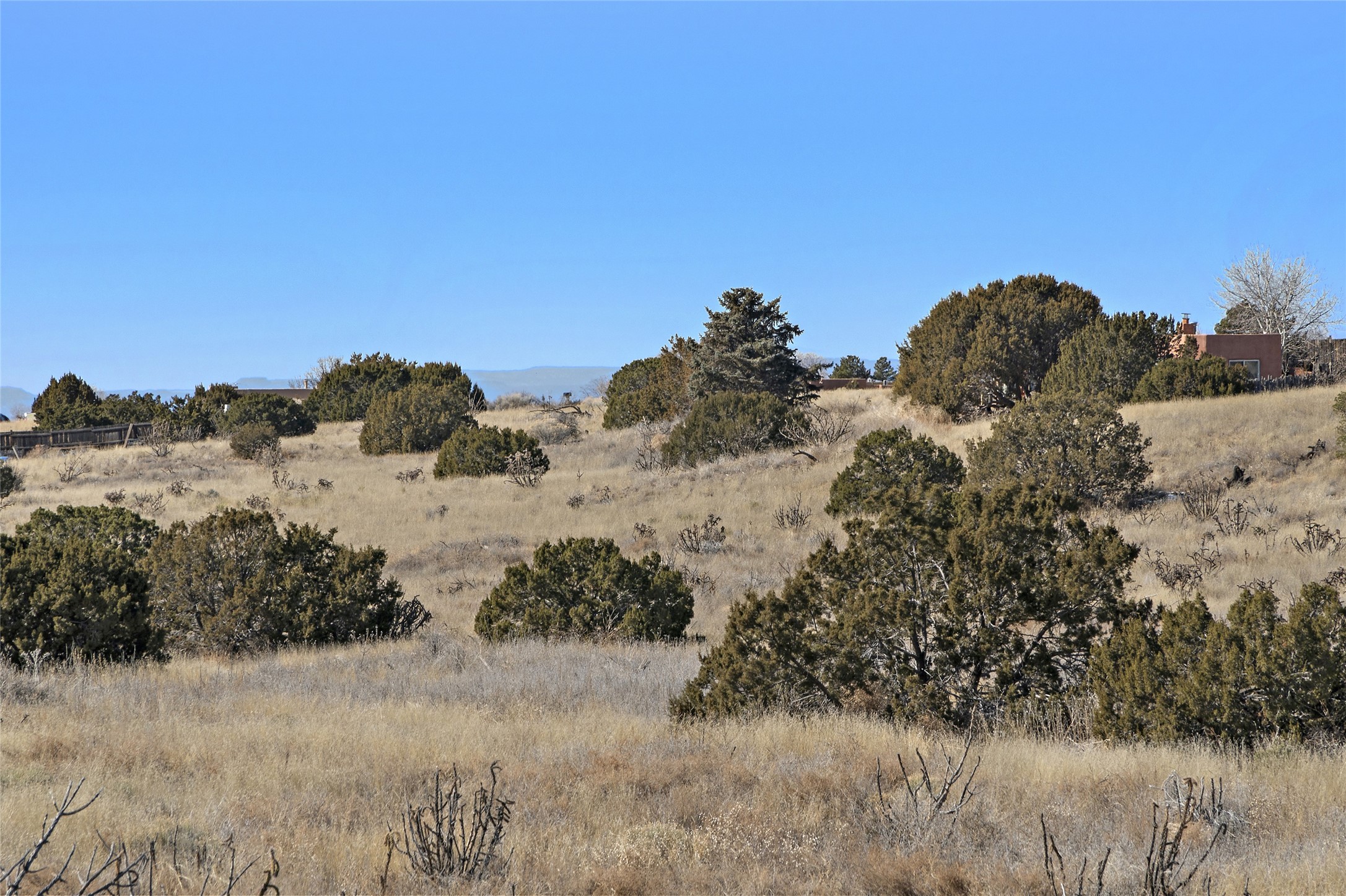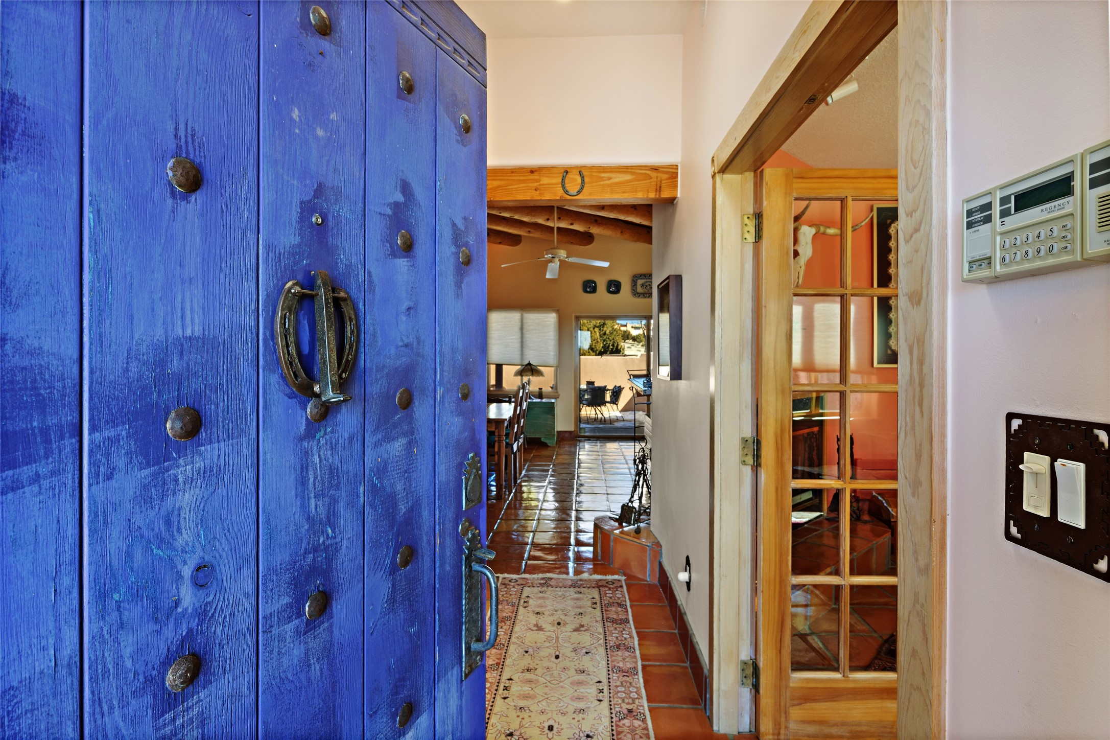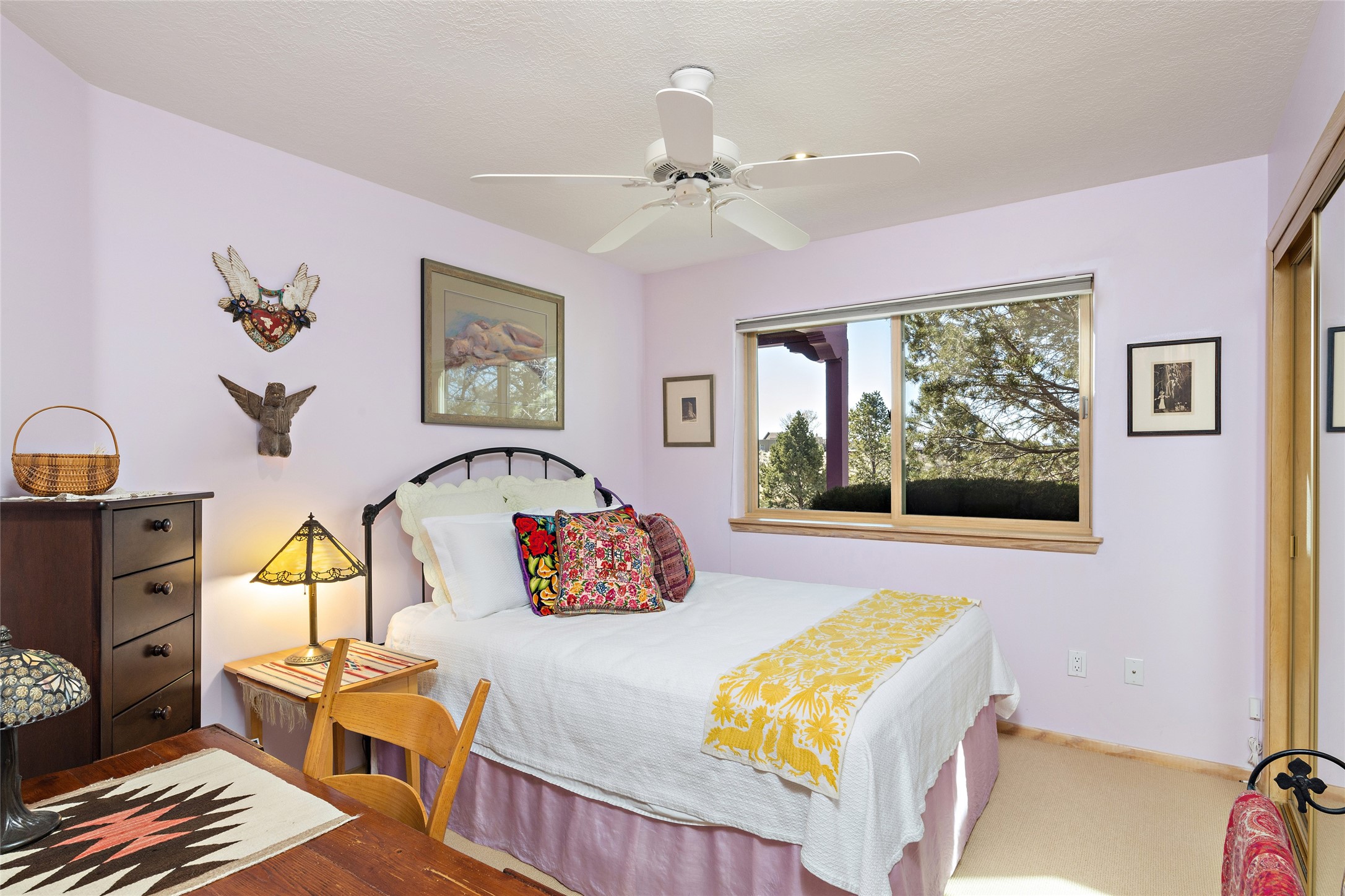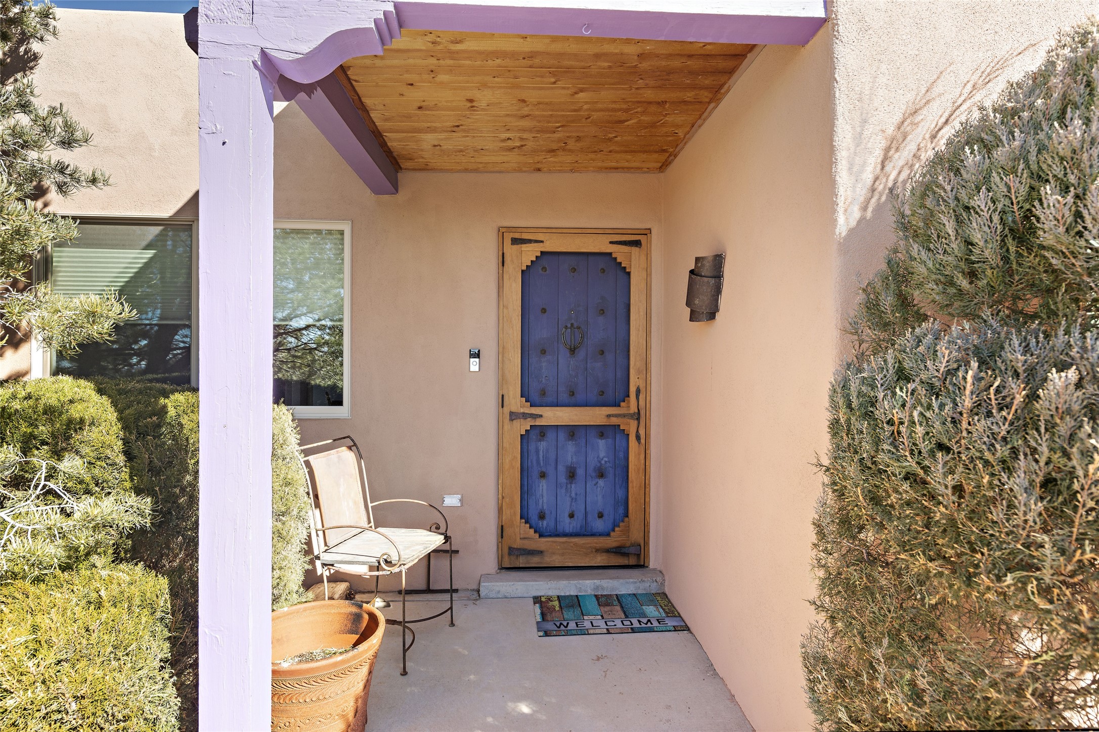 An El Dorado Beauty nestled along an arroyo with all the Santa Fe charm you're looking for. Get cozy in front of the dual fireplace in the living room or dining area or step outside to an outdoor kiva fire on the lovely flagstone patio. Situated at the end of a cul de sac, quiet and serene with abundant natural light, mostly newer windows, newer saltillo tile and wool carpeting accompany handsome built in book shelves and solar powered to keep your electric bill practically nonexistent. Third bedroom makes an optimal den space, opening up the common area superbly. If you're looking for that extra space for art or study, this attached, heated and bright studio, with it's own exterior access is just the space you're looking for. Mountain views, nearby walking trails, newer on demand boiler/water heater, entire exterior elastomeric coated last year, recently redone parapets and canales with a maintained roof, this home is ready for you!