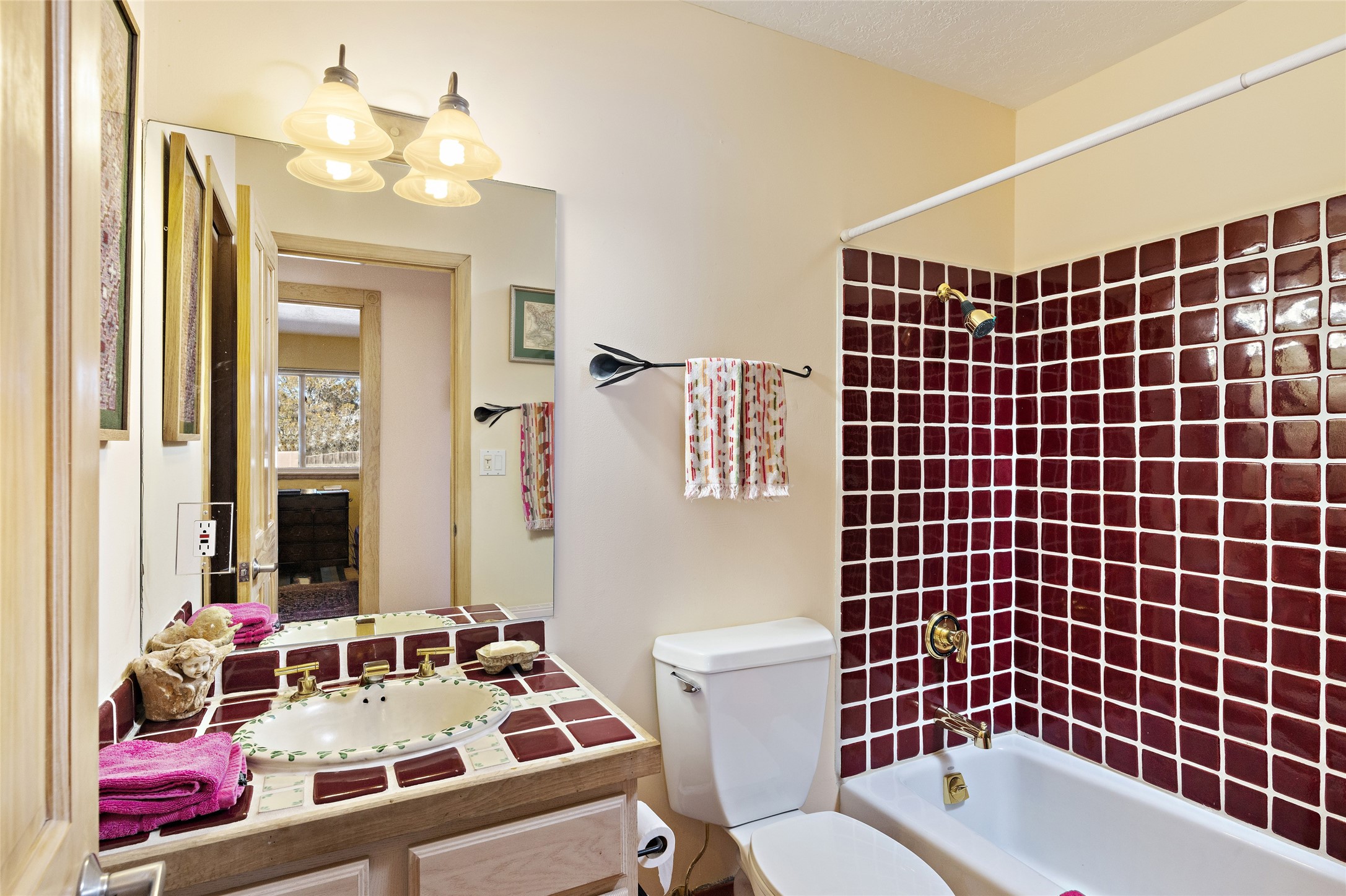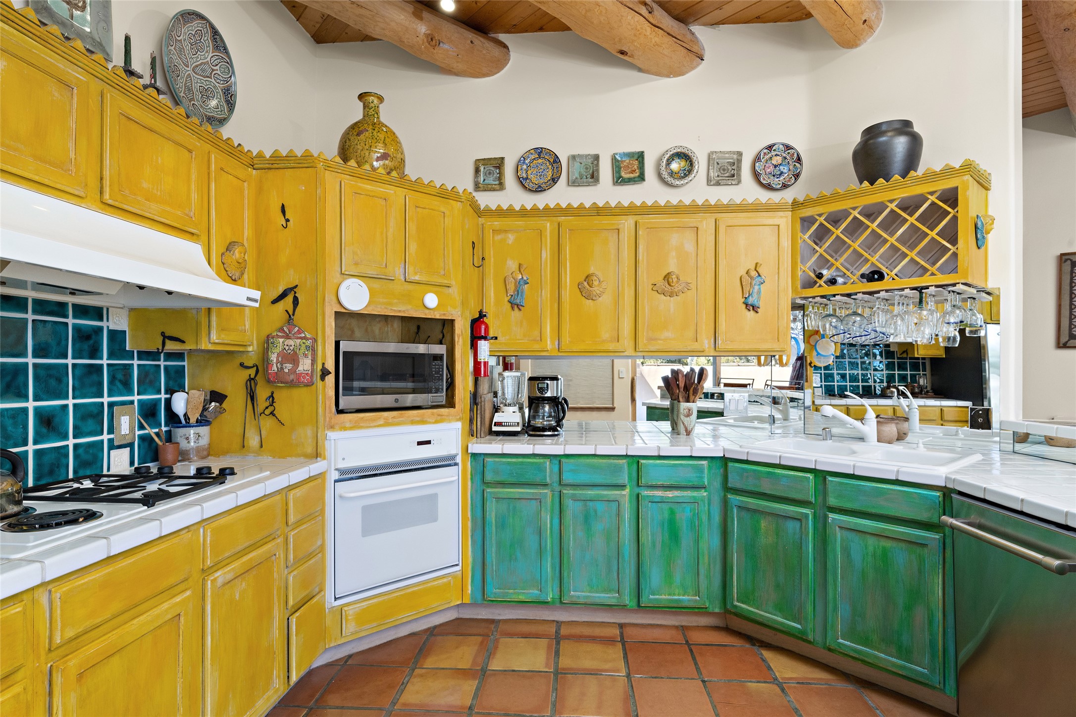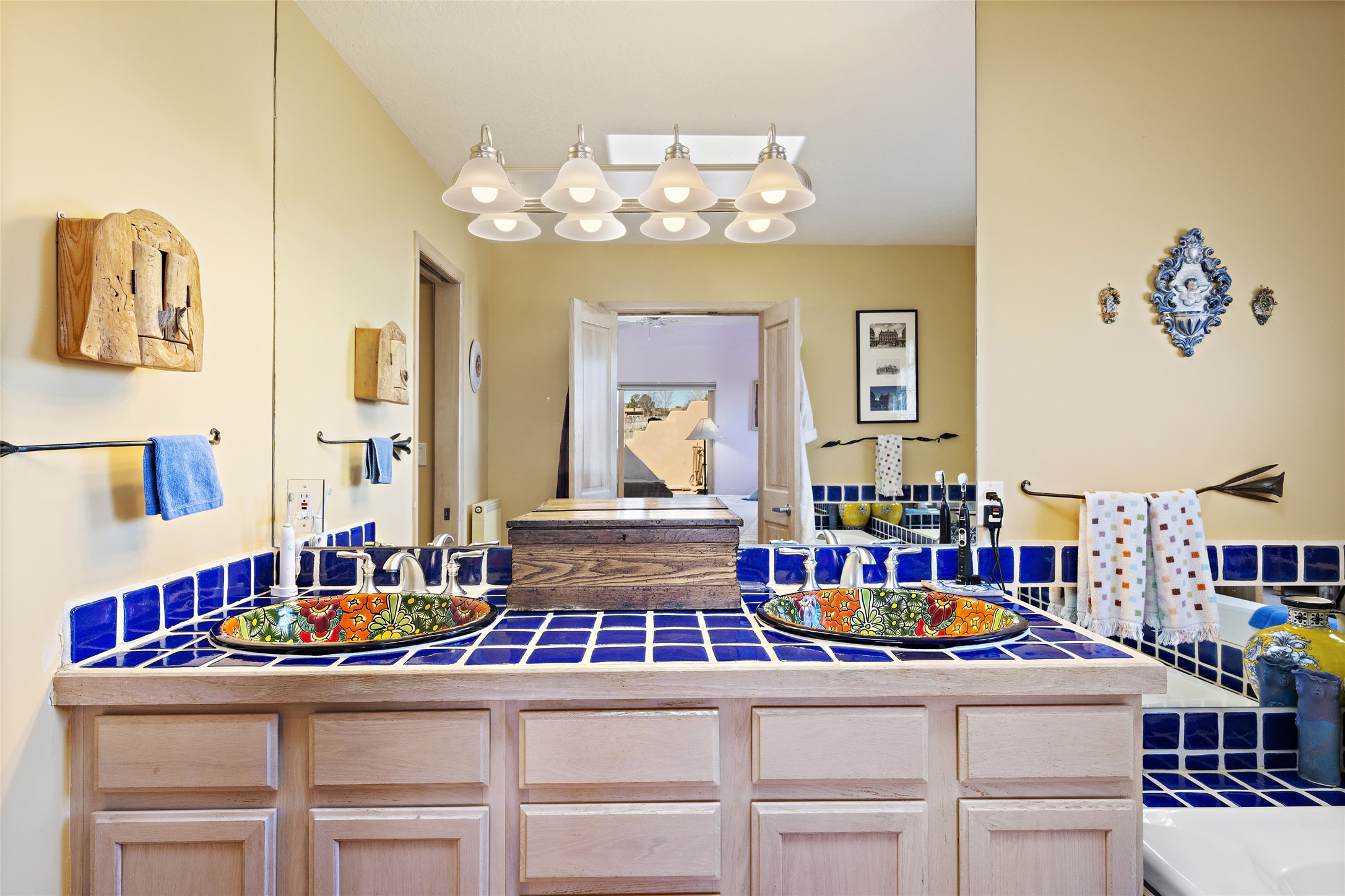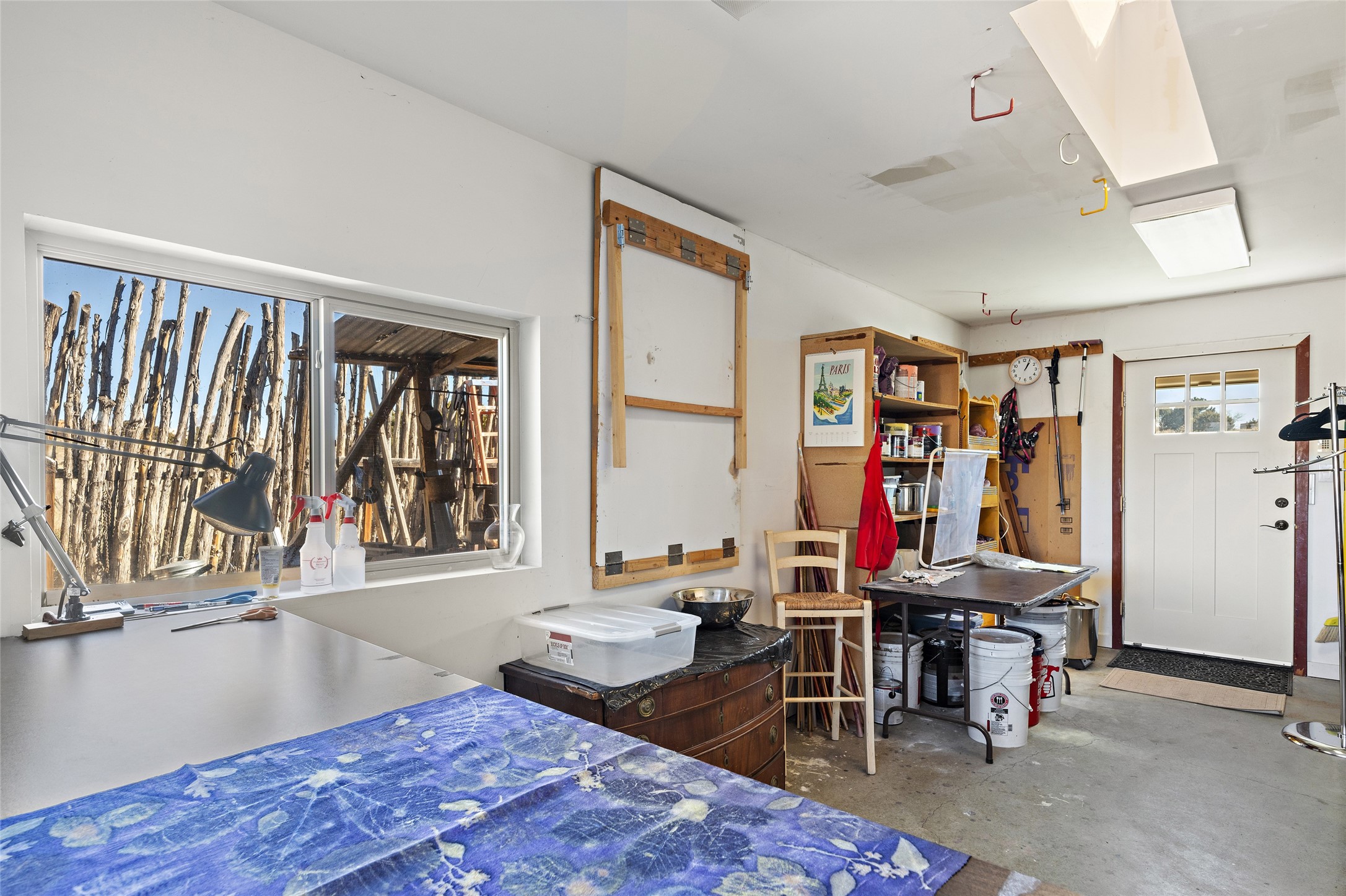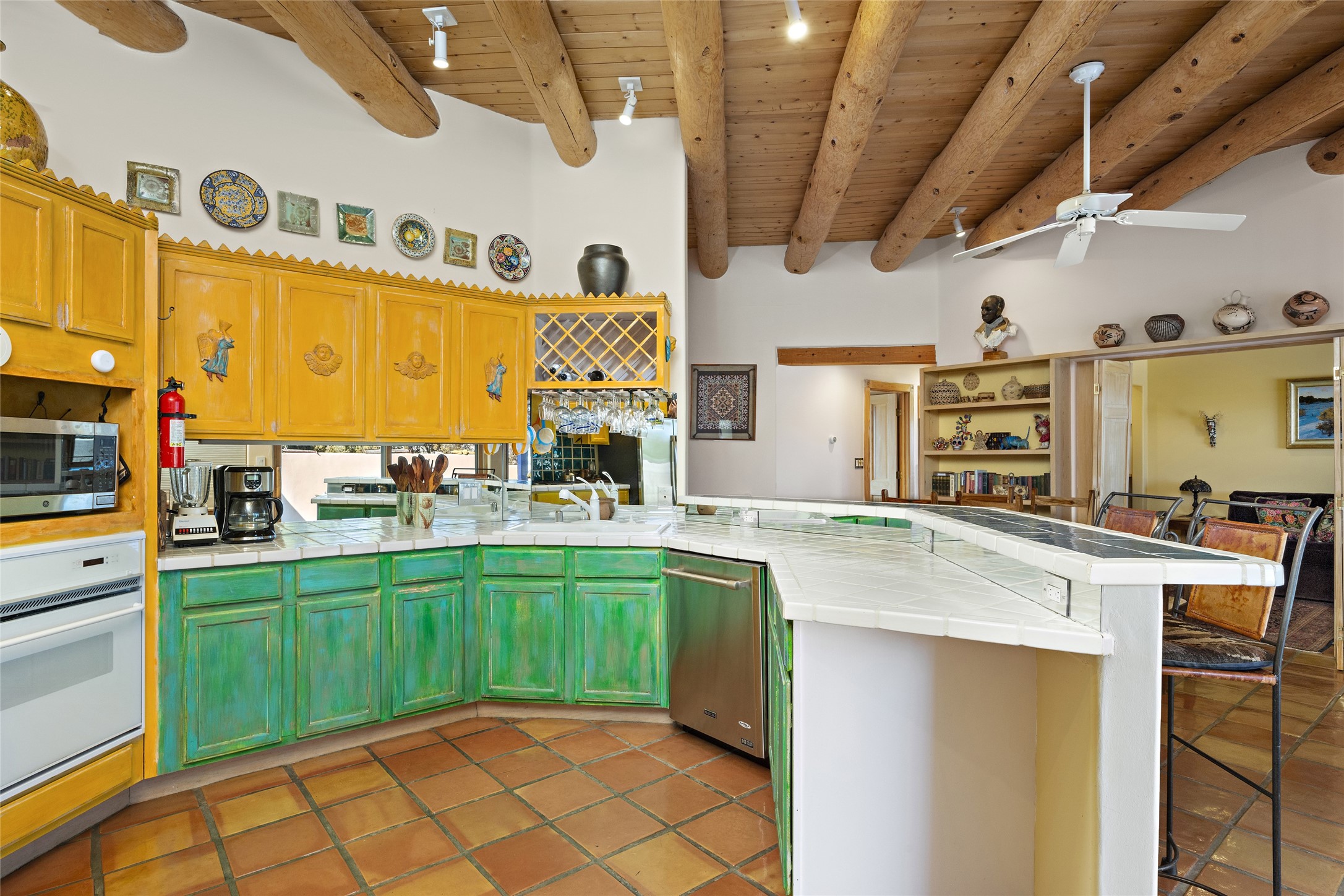 An El Dorado Beauty nestled along an arroyo with all the Santa Fe charm you're looking for. Get cozy in front of the dual fireplace in the living room or dining area or step outside to an outdoor kiva fire on the lovely flagstone patio. Situated at the end of a cul de sac, quiet and serene with abundant natural light, mostly newer windows, newer saltillo tile and wool carpeting accompany handsome built in book shelves and solar powered to keep your electric bill practically nonexistent. Third bedroom makes an optimal den space, opening up the common area superbly. If you're looking for that extra space for art or study, this attached, heated and bright studio, with it's own exterior access is just the space you're looking for. Mountain views, nearby walking trails, newer on demand boiler/water heater, entire exterior elastomeric coated last year, recently redone parapets and canales with a maintained roof, this home is ready for you!
