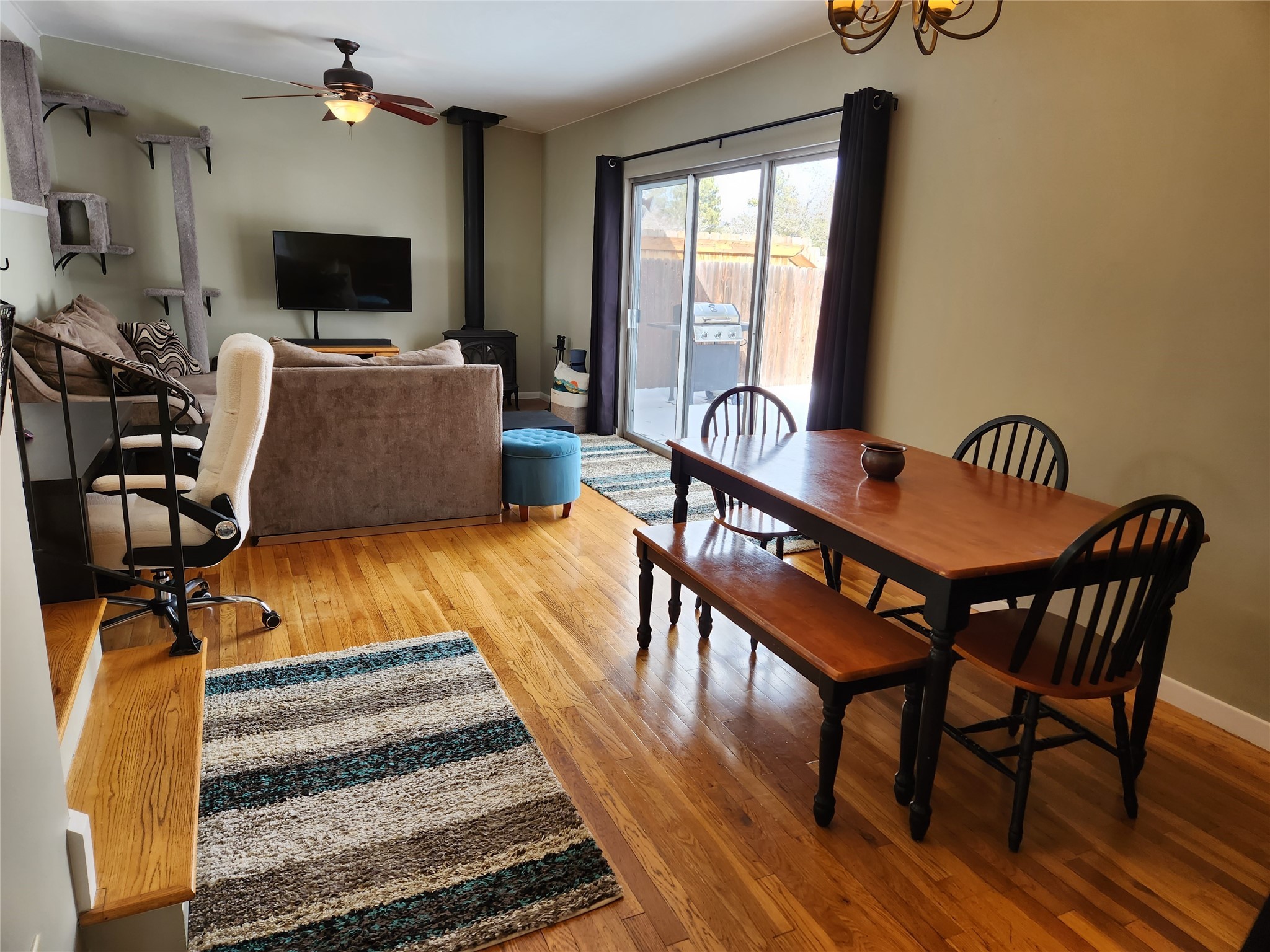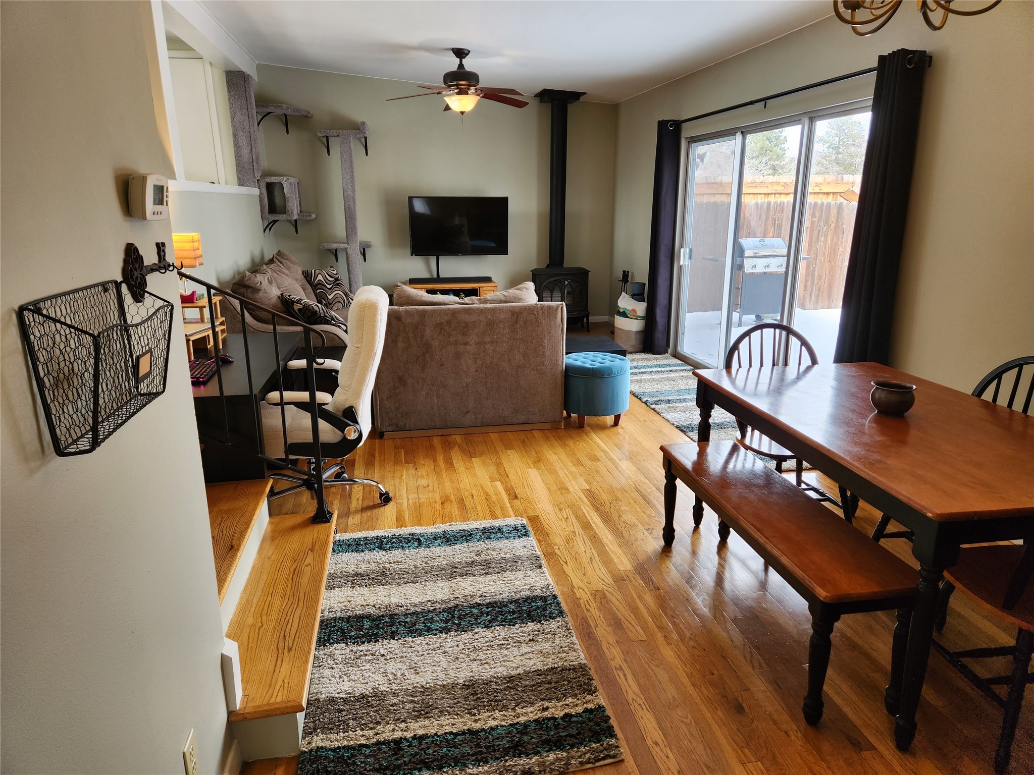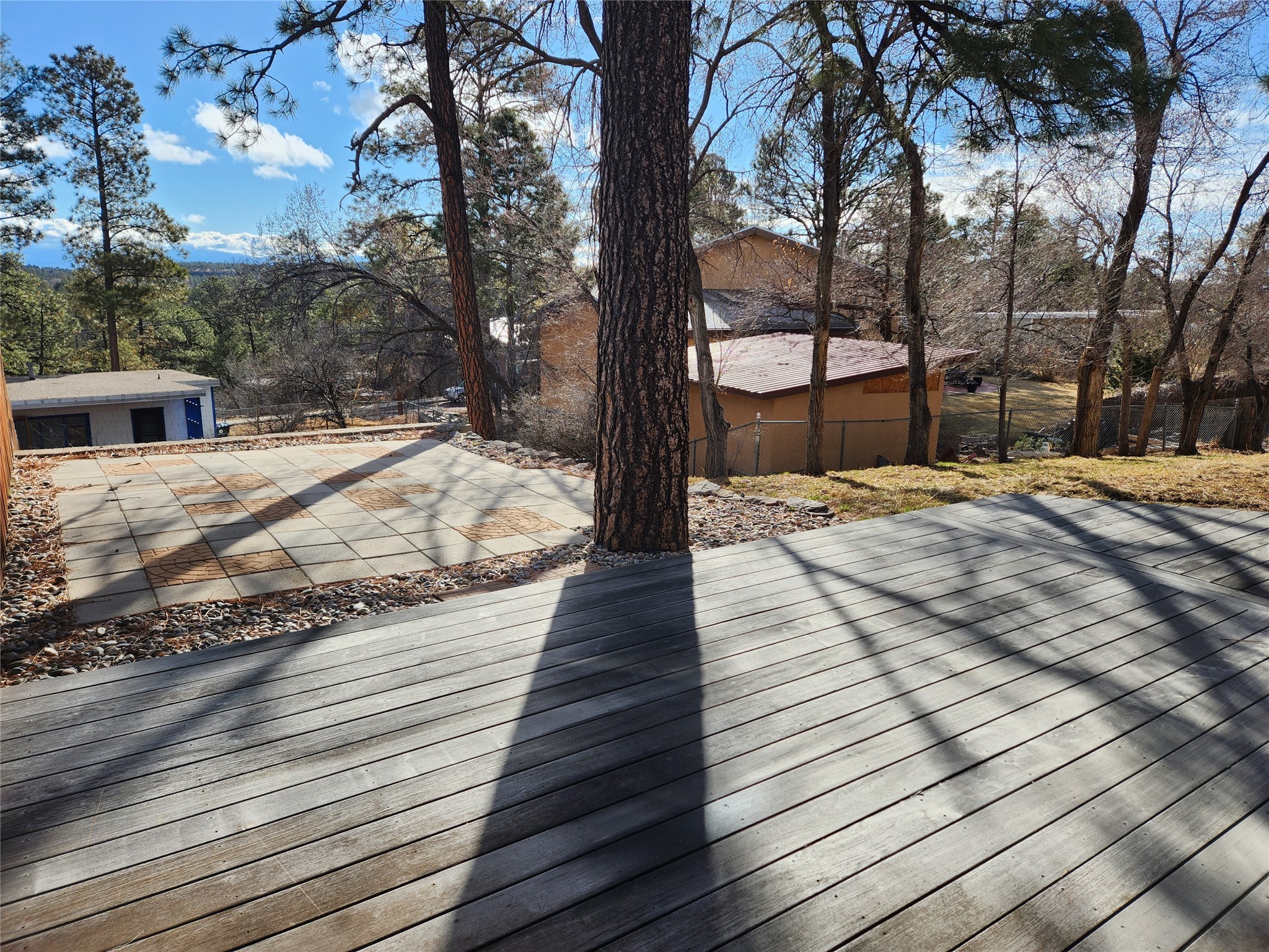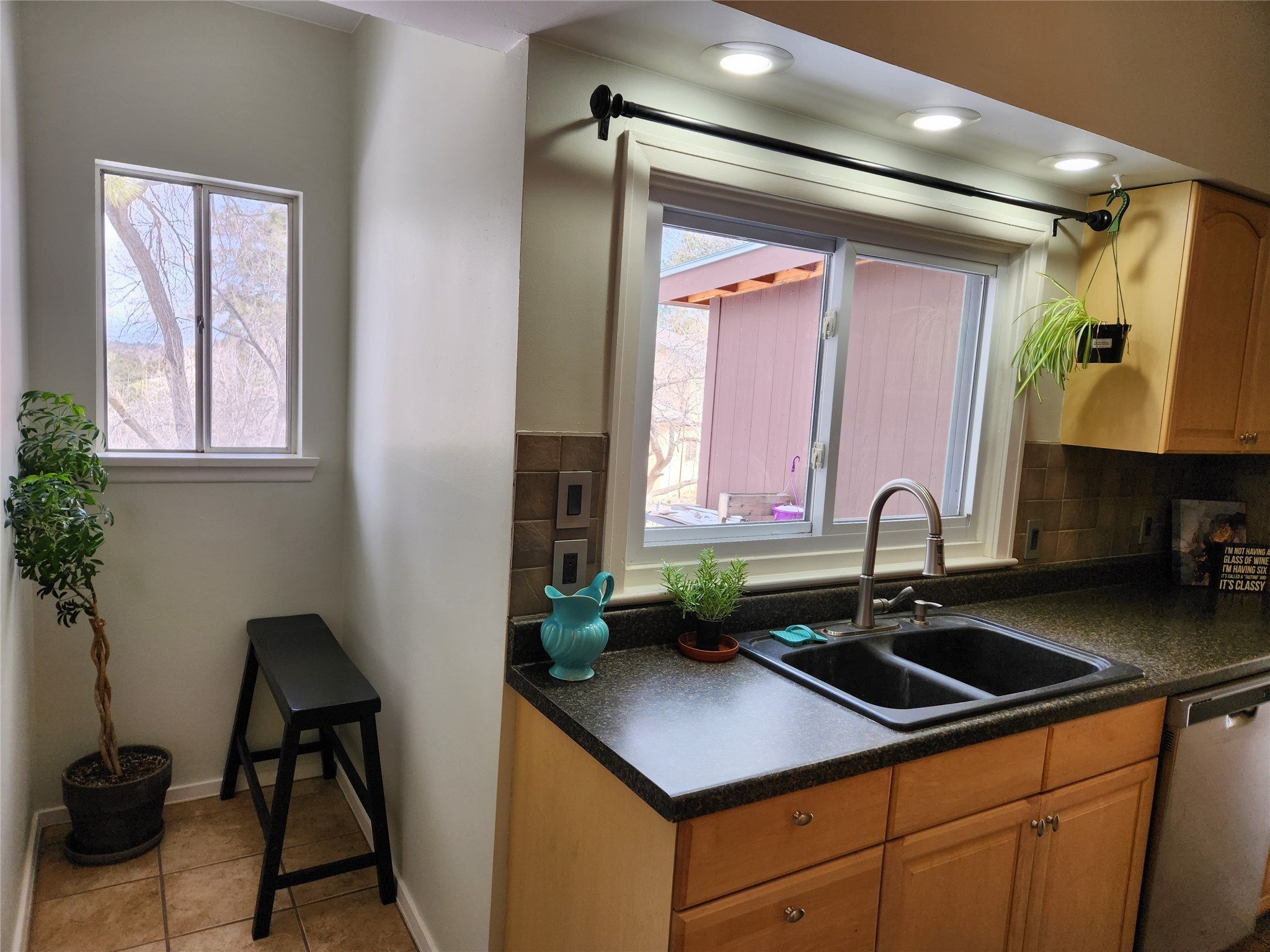 You will love this charming home in a great location, with a fantastic yard and great living spaces! With two bedrooms and two bathrooms, plus bonus laundry and storage spaces, this home is a gem! Enter the home under a cozy covered entryway. Upon entering, you will walk into the landing with coat closet, room for shoes and space for welcoming your guests. Continuing down the hallway you'll find two spacious bedrooms with large windows offering abundant natural light. The updated bathroom is situated between the bedrooms for convenience. Down a few stairs you'll walk into the sunken living room area. The comfortable living space is open and bright with high ceilings and a large sliding glass door opening to the beautiful nature outside. A woodstove keeps the home warm and cozy in the winter months and adds charming ambiance to the space. Through the doorway you will find the updated kitchen with gas range and great windows looking outside toward the Sangres. You will love preparing your meals in this lovely kitchen. Bonus space off the kitchen includes pantry, storage, as well as a laundry room with prep sink and a 2nd bathroom with shower. The large gently sloped back yard offers opportunities for gardening, playing and relaxing on the deck or firepit patio area. A large workshop/shed with power offers additional storage or hobby space. Don't miss this great opportunity to live in this beautiful home in Los Alamos!
