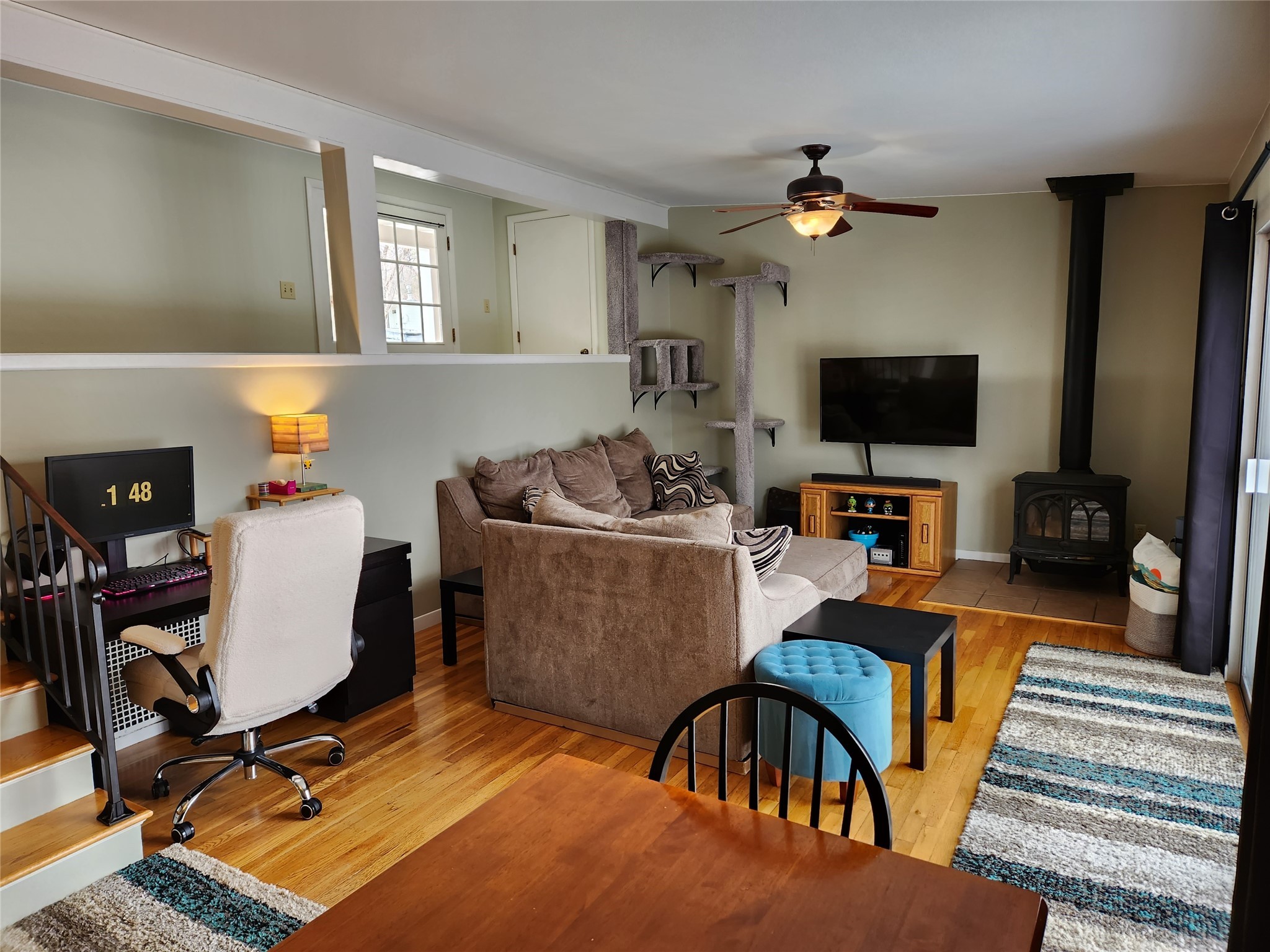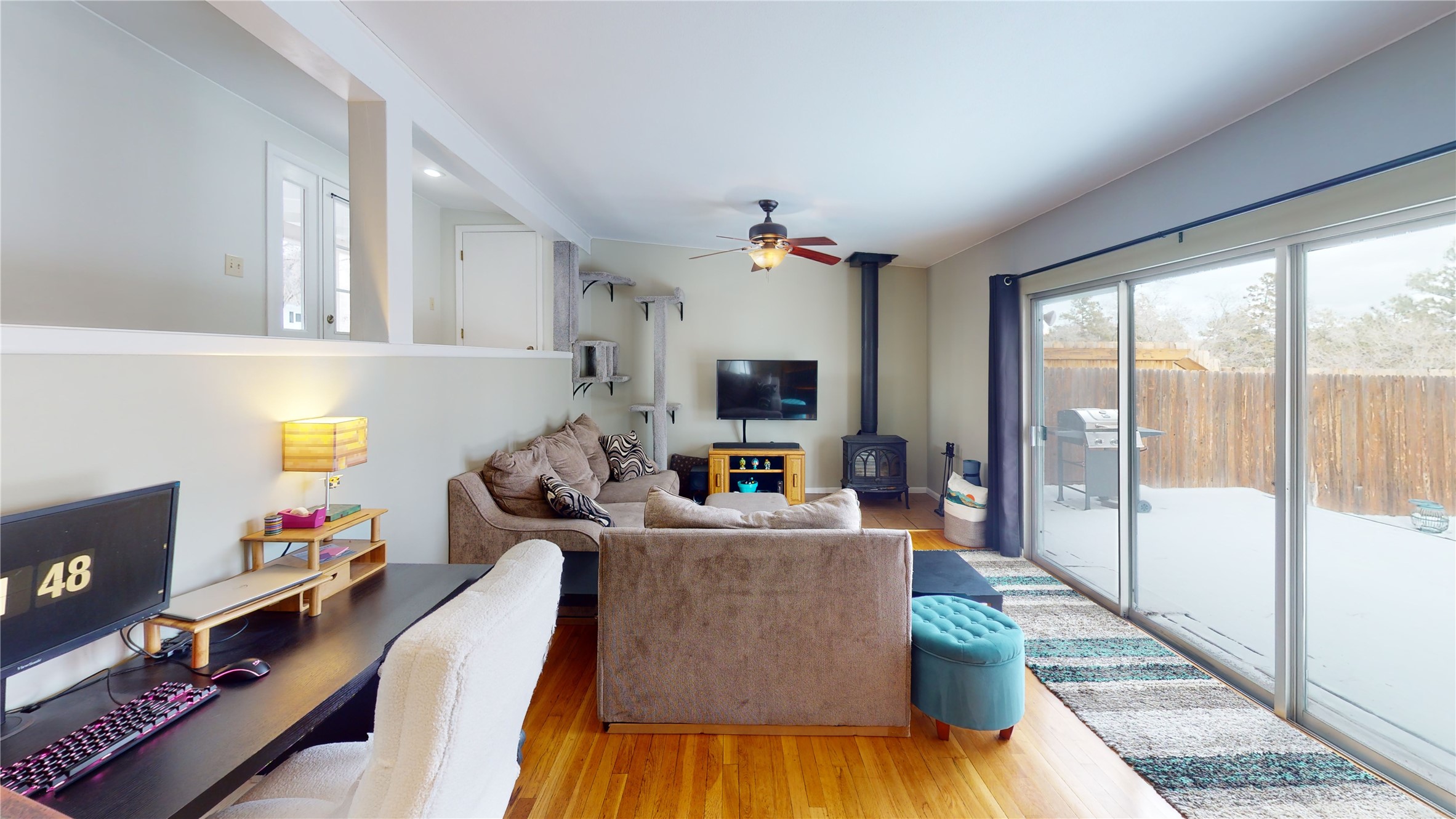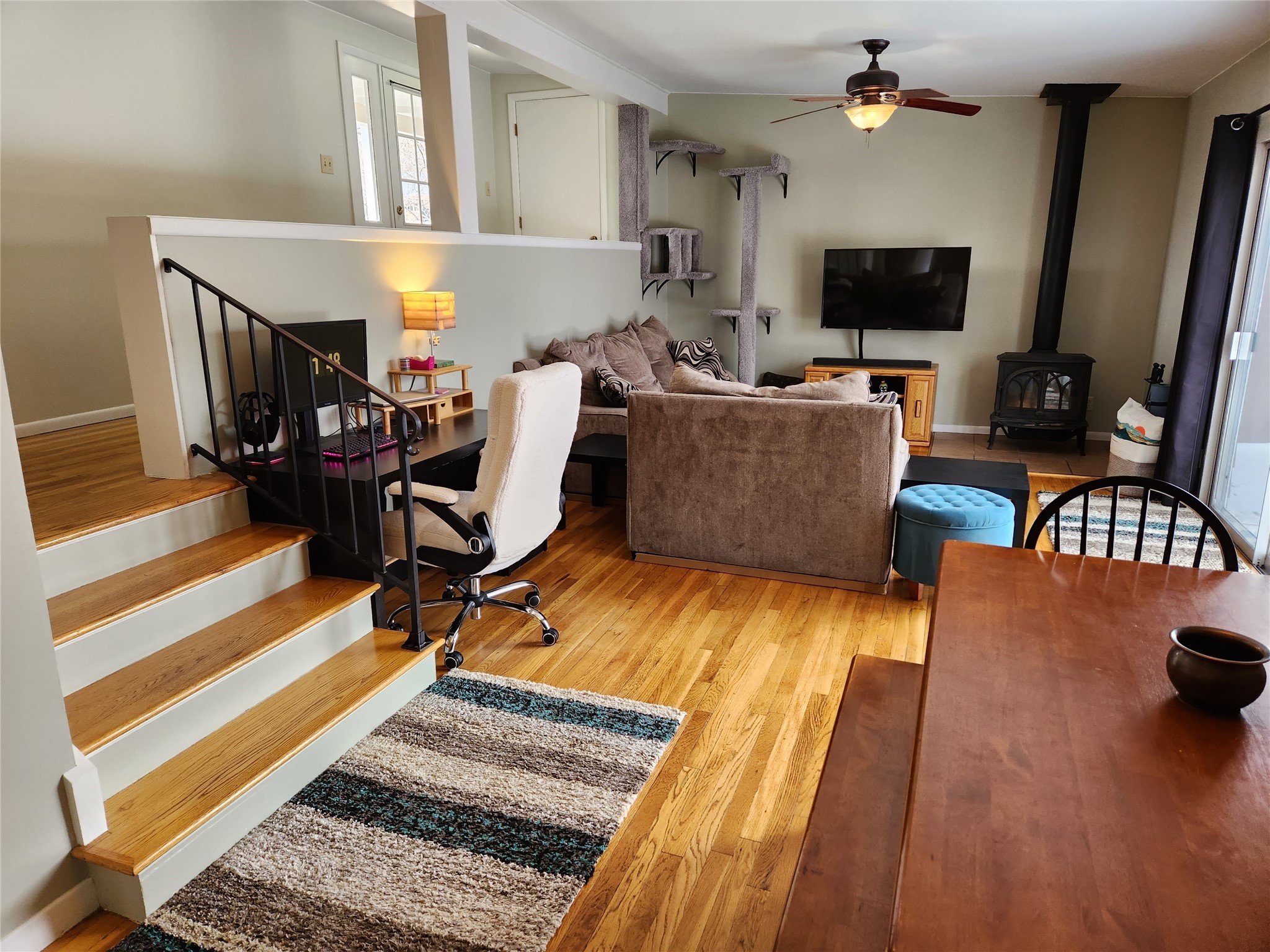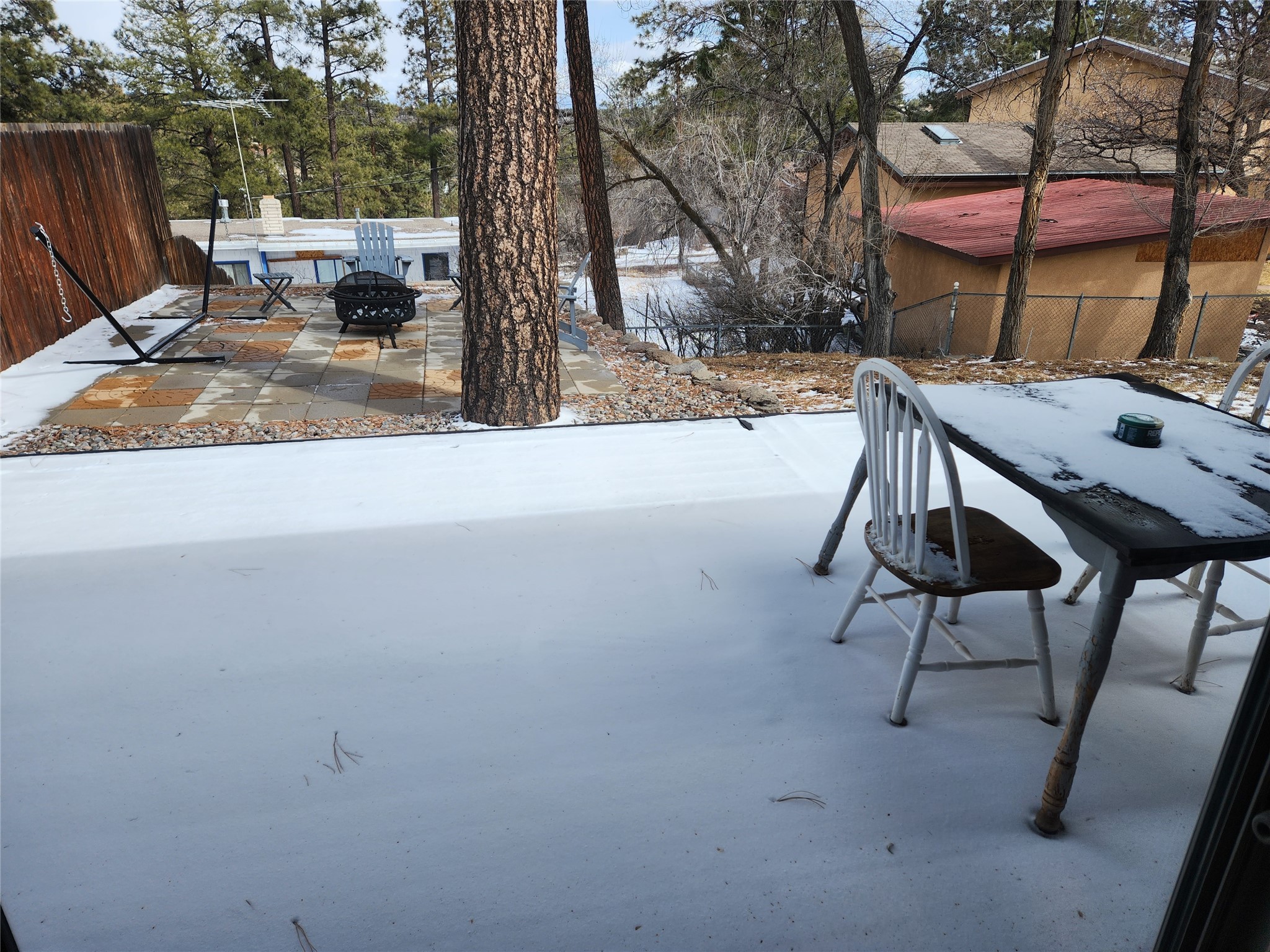 You will love this charming home in a great location, with a fantastic yard and great living spaces! With two bedrooms and two bathrooms, plus bonus laundry and storage spaces, this home is a gem! Enter the home under a cozy covered entryway. Upon entering, you will walk into the landing with coat closet, room for shoes and space for welcoming your guests. Continuing down the hallway you'll find two spacious bedrooms with large windows offering abundant natural light. The updated bathroom is situated between the bedrooms for convenience. Down a few stairs you'll walk into the sunken living room area. The comfortable living space is open and bright with high ceilings and a large sliding glass door opening to the beautiful nature outside. A woodstove keeps the home warm and cozy in the winter months and adds charming ambiance to the space. Through the doorway you will find the updated kitchen with gas range and great windows looking outside toward the Sangres. You will love preparing your meals in this lovely kitchen. Bonus space off the kitchen includes pantry, storage, as well as a laundry room with prep sink and a 2nd bathroom with shower. The large gently sloped back yard offers opportunities for gardening, playing and relaxing on the deck or firepit patio area. A large workshop/shed with power offers additional storage or hobby space. Don't miss this great opportunity to live in this beautiful home in Los Alamos!