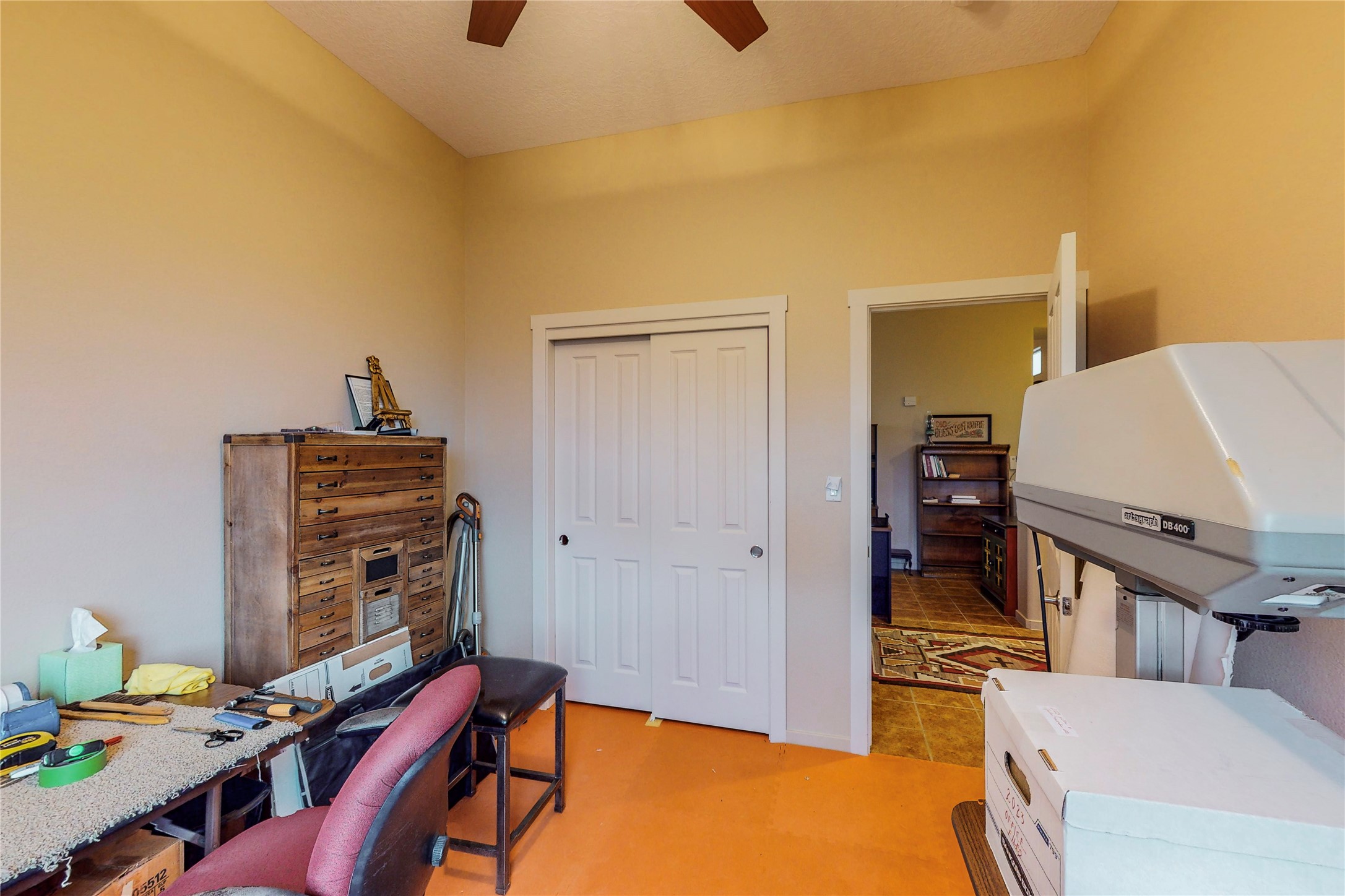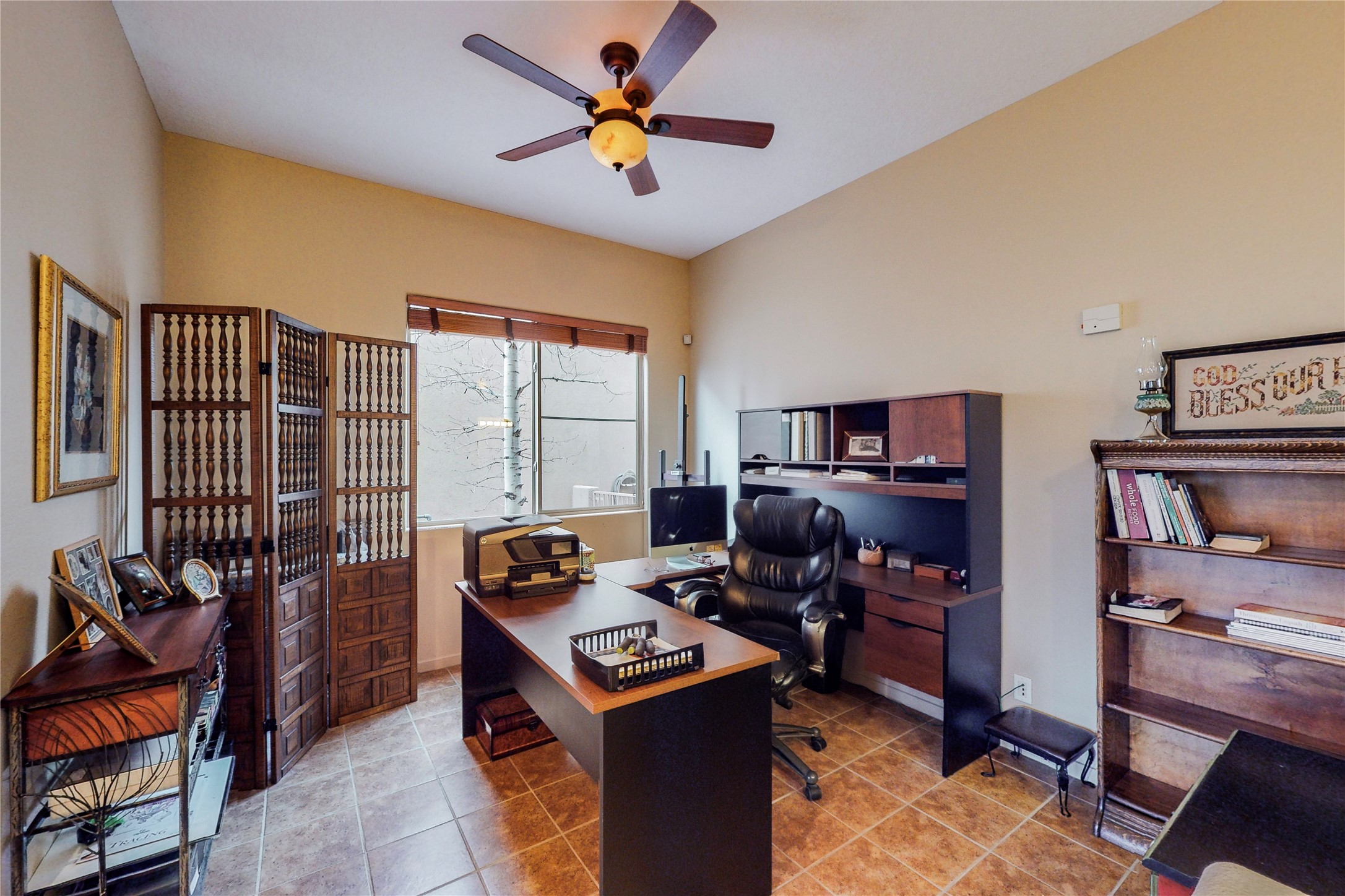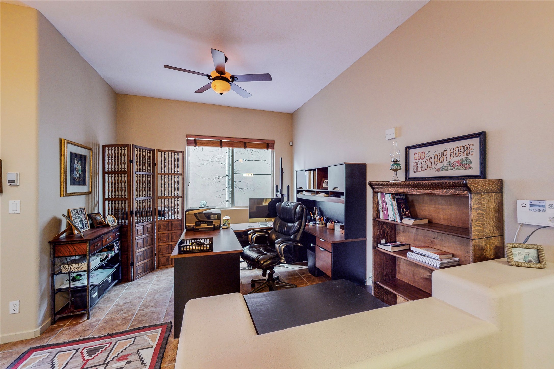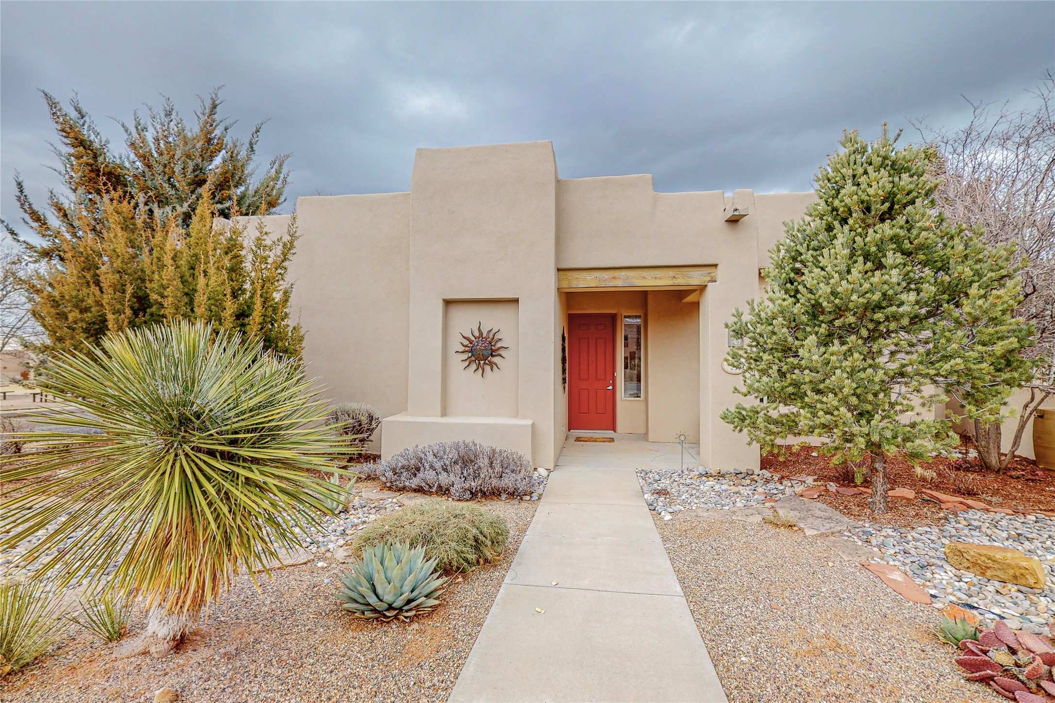 Not too large, not too small, just right! This house will cause you to smile, because it has all the right rooms in the right places. Sun-filled great room allows for TV viewing while someone makes the snacks in the kitchen. As you enter the front door you will walk into the living room and dining room, both generous and welcoming rooms. Tucked aside in this front area is the large primary bedroom, completely separated from the rest of the house. Two more bedrooms are at the other end of the house, with a large bathroom in the hallway. There is a generous home office space, which could also be a kids' game room, or even a yoga retreat? You will be really surprised at the big closets and extra storage throughout the house. The attached two car garage is direct entry. For outdoor spaces, there is a large sun-filled patio with room for eating, lounging, and grilling. The patio overlooks a large park, which is part of the neighborhood and tended by the HOA. This expansive area is a great park to walk a dog or use as a playground for kids. There is a private gated garden area just at the rear of the house, a sweet area with many perennials. Mature greenery surrounds the property. The location is ideal - property almost feels like a corner lot with the park next door. In the photo section there is a floor plan, which will help explain the flow of the house. And, you'll notice the artwork in the house, all created by the seller, which will enhance your viewing!