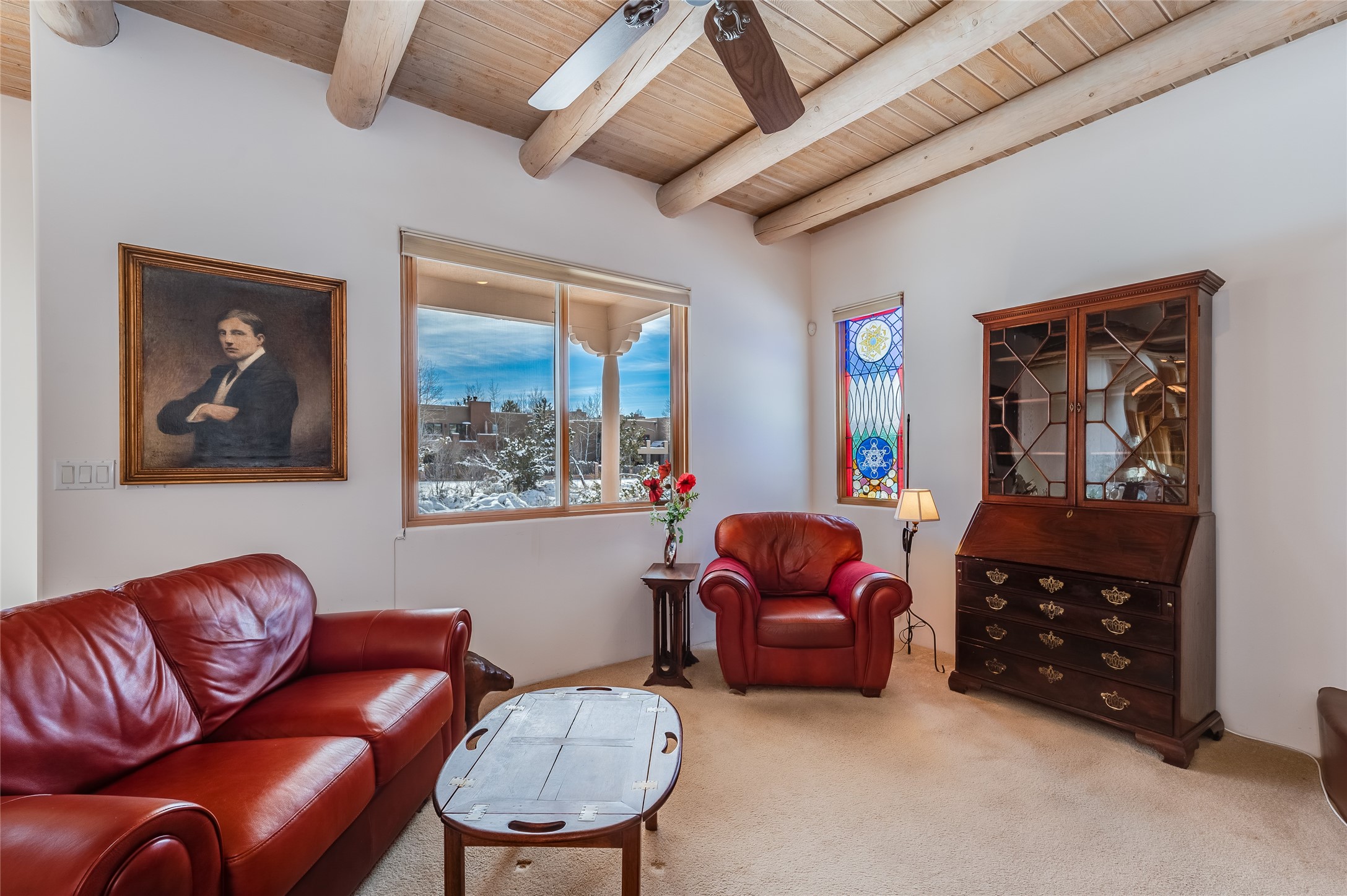 Welcome to the Las Estrellas Neighborhood, which has panoramic views of the mountains by day and a canopy of brilliant stars at night. open spaces and walking trails. Outstanding location minutes from Santa Fe Plaza, an easy commute to Las Alamos or Albuquerque. Home has been preinspected. This home is beautifully designed and filled with quality craftsmanship. As you arrive, notice the beautifully carved woodwork of the front columns, a detail that continues inside and on the back patio. The tiled foyer leads into the living room, which flows into the dining room and then to the kitchen. A gorgeous open-beam ceiling runs the length of the living space. Additional design touches are found throughout, including custom stained glass by Designer Spin Dunbar, kiva fireplace and lovely tilework throughout. Upstairs the primary suite has its own private balcony and a luxurious ensuite bathroom. Two additional bedrooms (2nd bedroom is used as owner's office) bathroom, an upstairs laundry room and 2 car garage with storage. The covered back patio is perfect for your morning cuppa or afternoon grilling and dining. The area has stunning natural surroundings, property backs up to an arroyo and plenty of open spaces and walking trails. Schedule your showing today and see this one-owner well-maintained home.