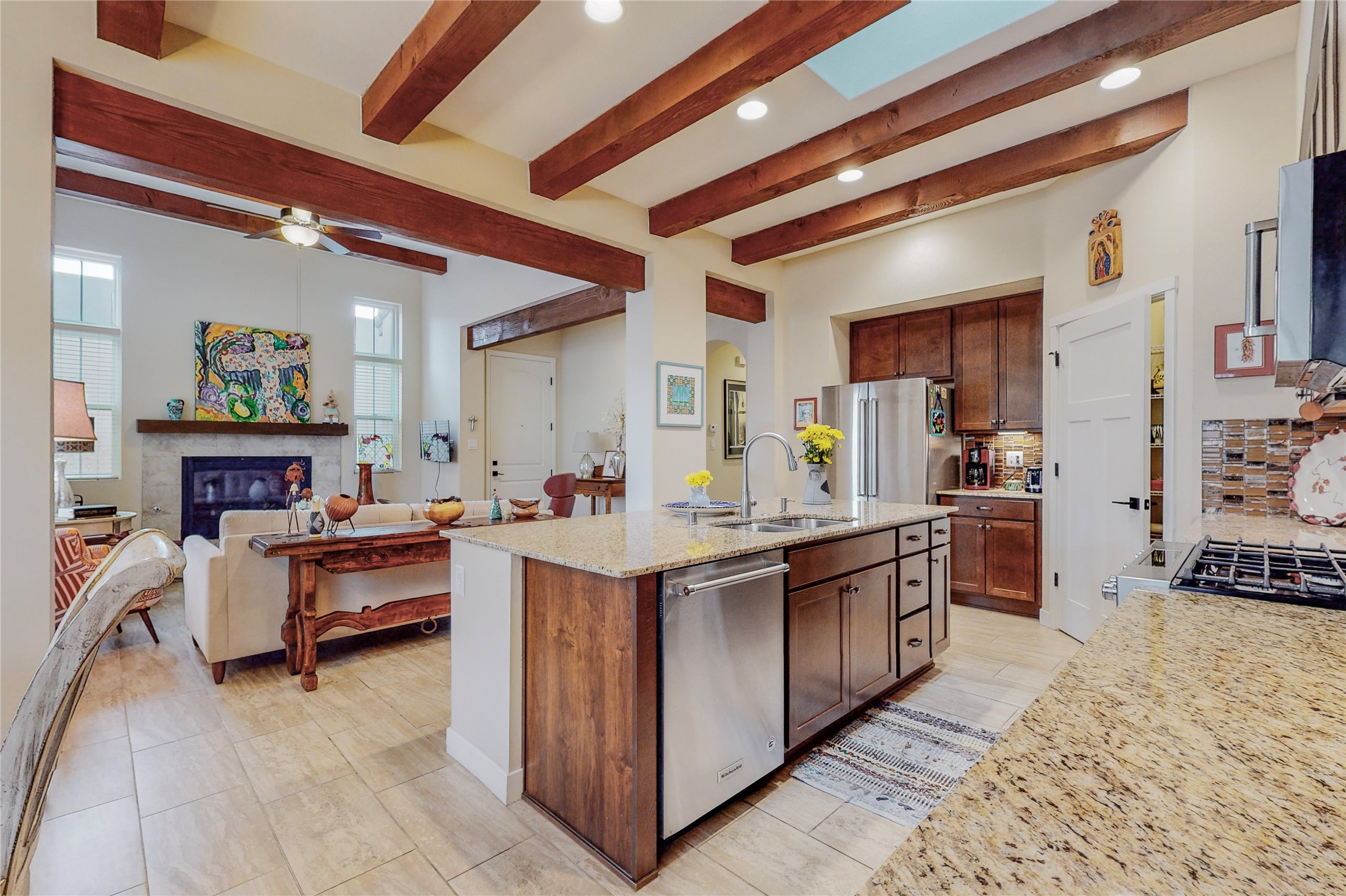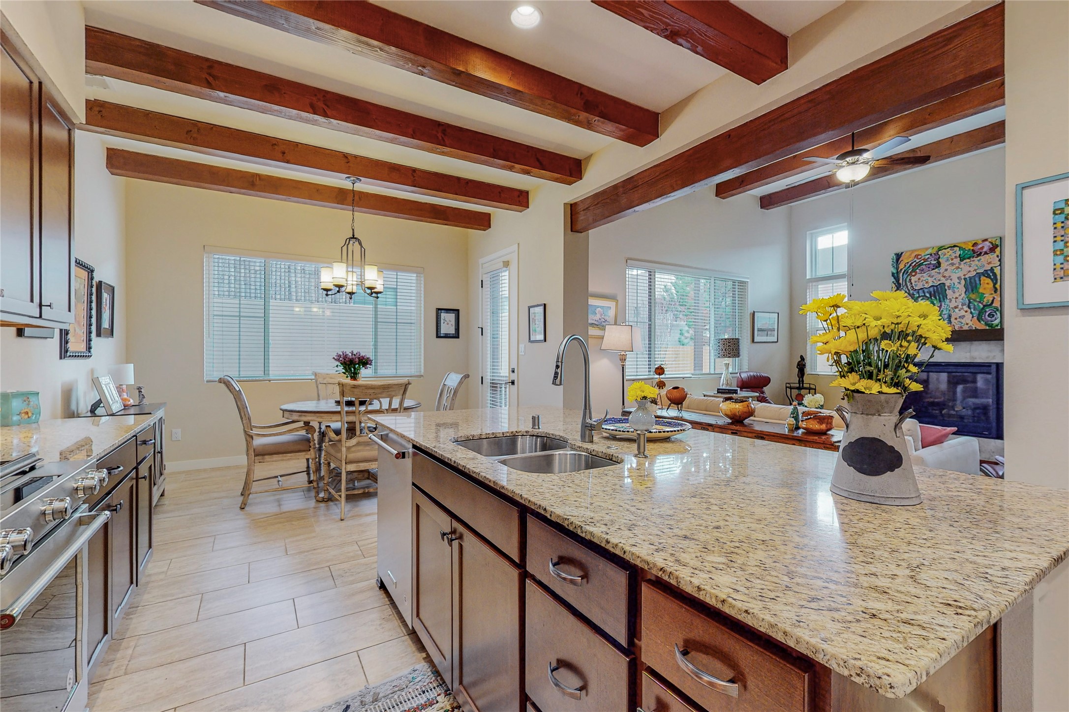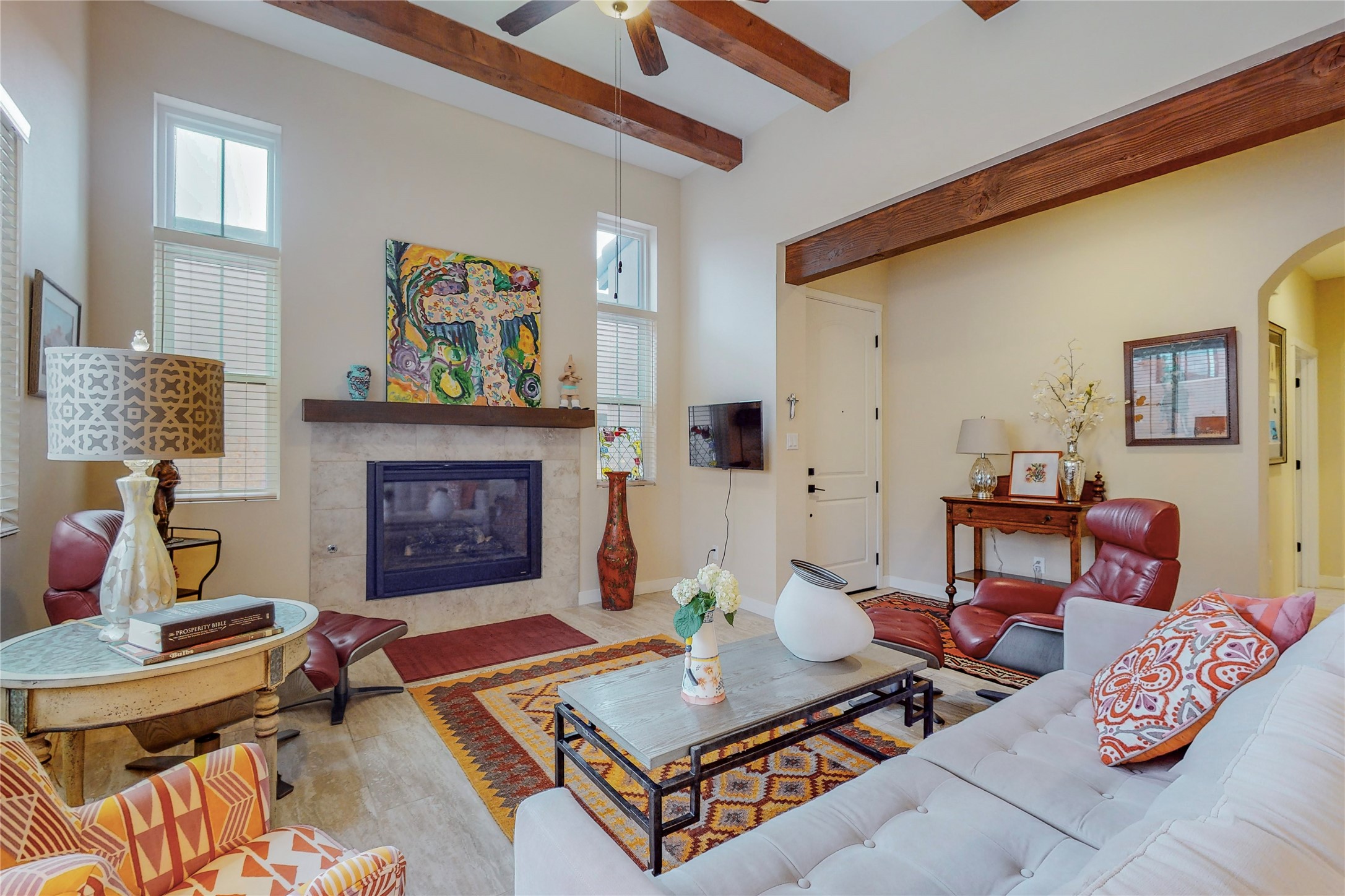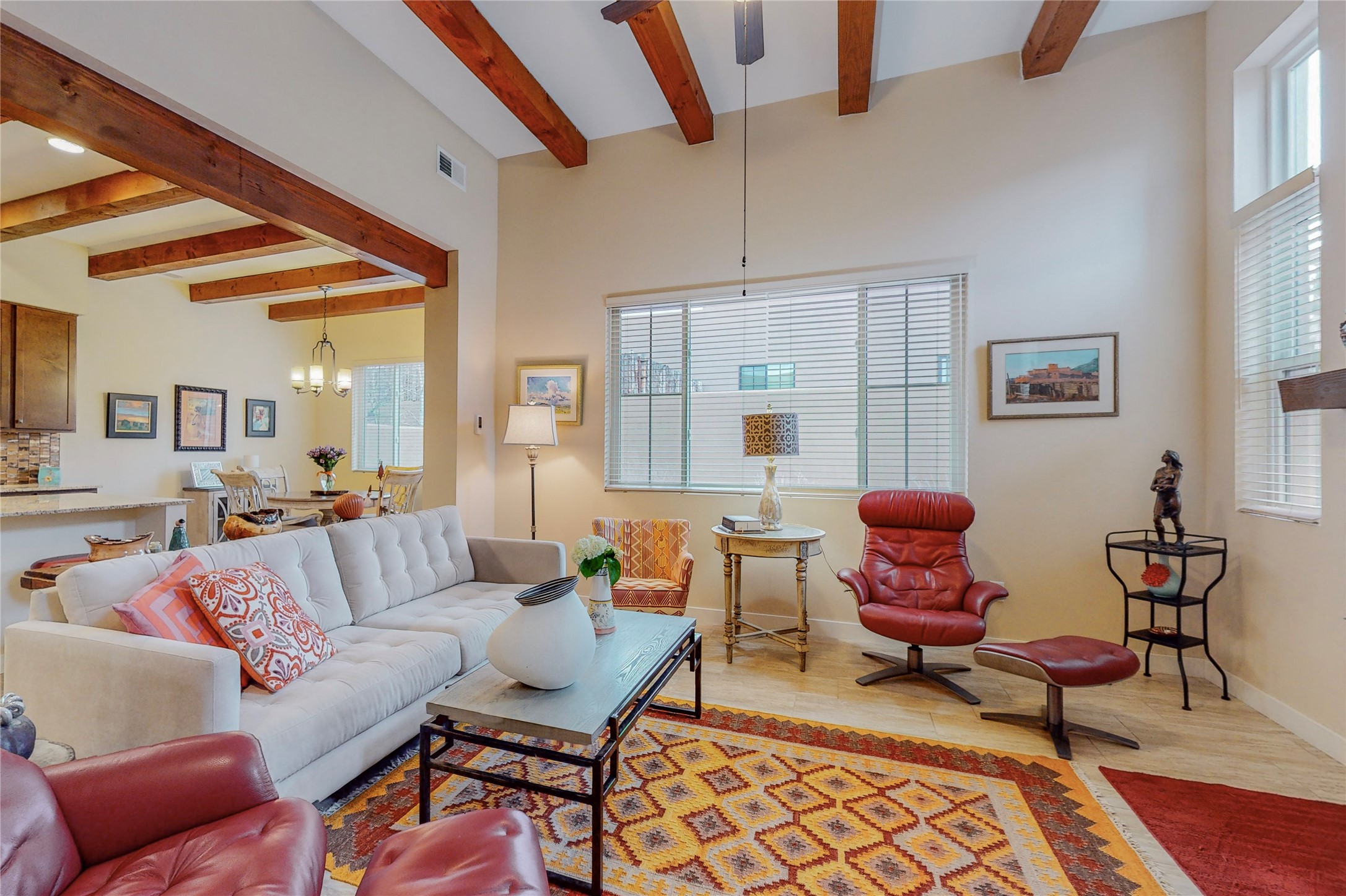 Open concept living, this floor plan allows abundant natural light & easy living. Offers a spacious primary suite and two additional guest rooms, ideal for your den/office/studio with two outdoor covered portals. High ceilings with beams, granite countertops, hardwood cabinets, walk-in closets & pantry, a spacious kitchen island, all Kitchen Aid Stainless Steel appliances and refrigerated A/C are a few of the fine living features. This home is designed without any steps and provides ease of accessibility. Villas di Toscana is a gated community ideal for full or part-time residency with walking paths, small parks, and open space. Centrally located, the neighborhood is just minutes from the historic downtown plaza, museums & galleries, skiing, hiking, shopping and entertainment venues. Welcome home to Villas di Toscana!