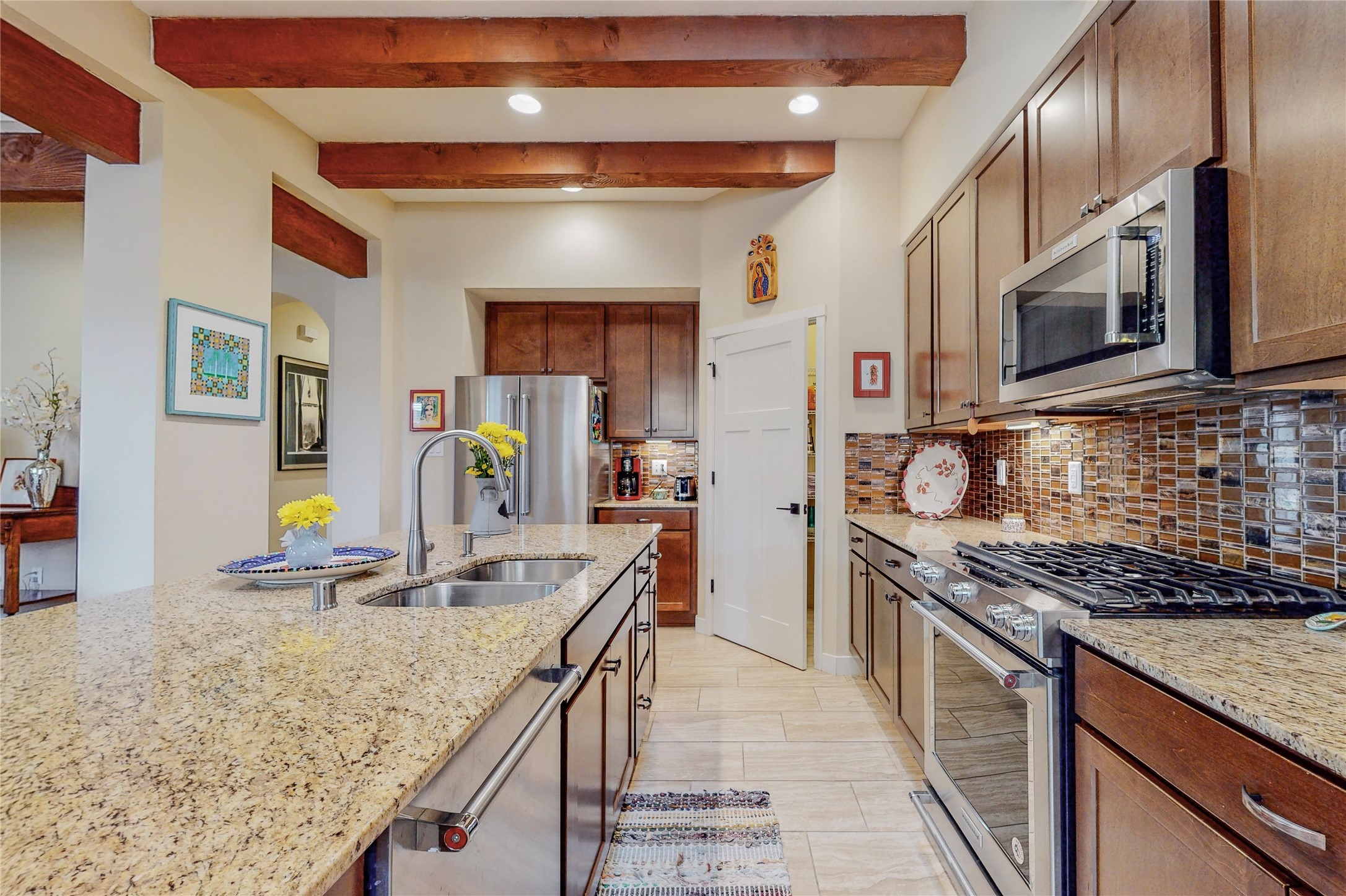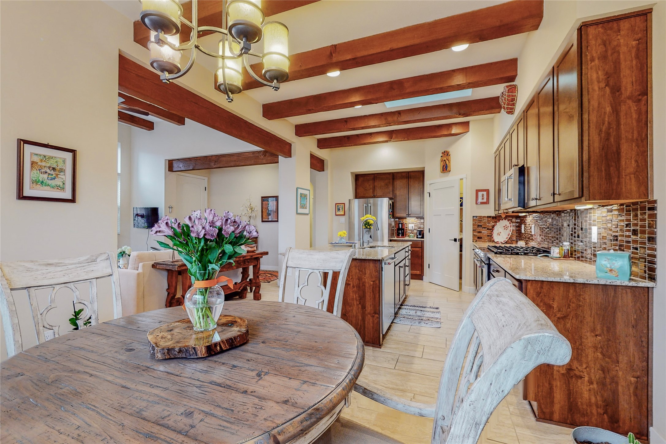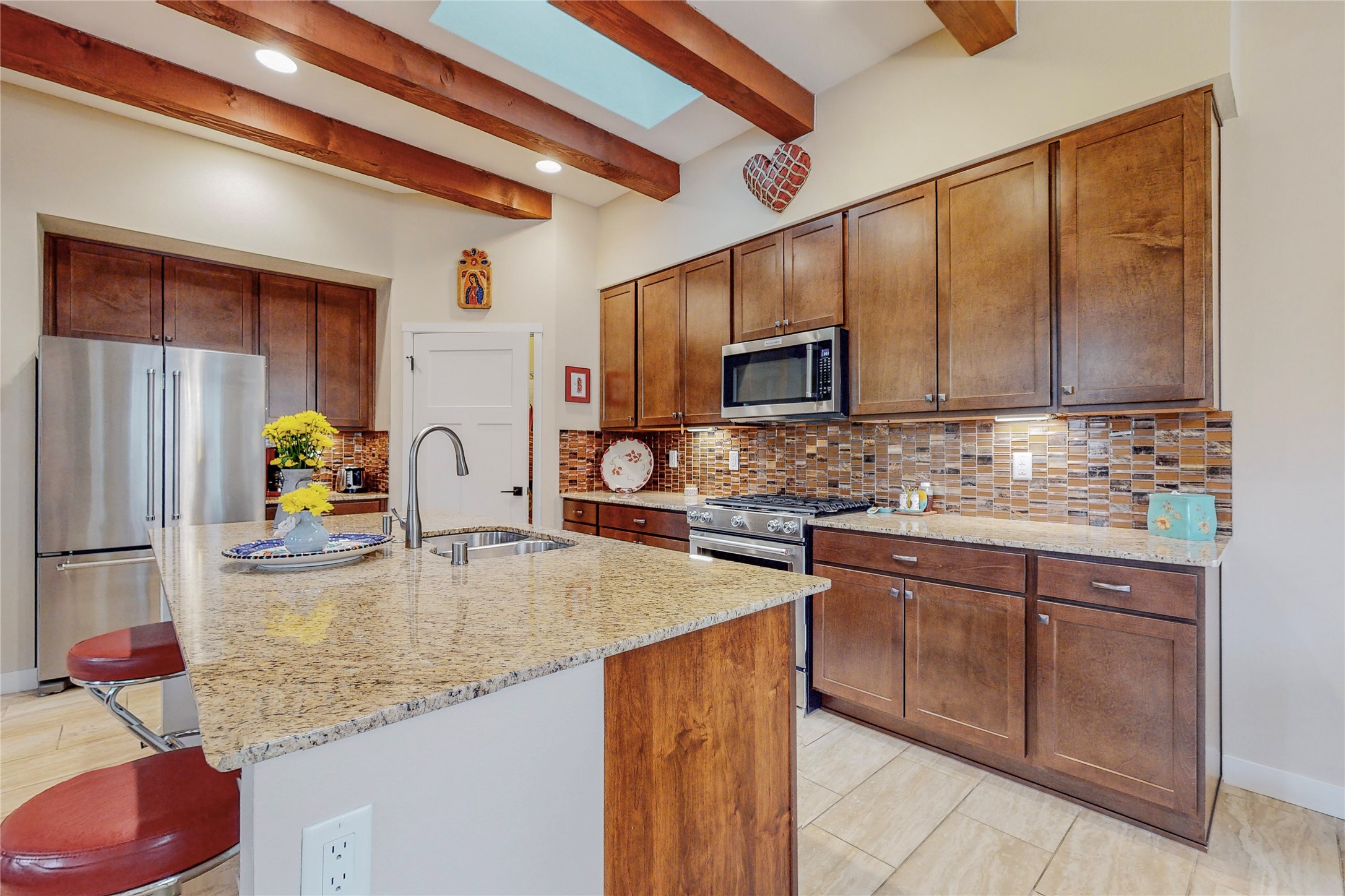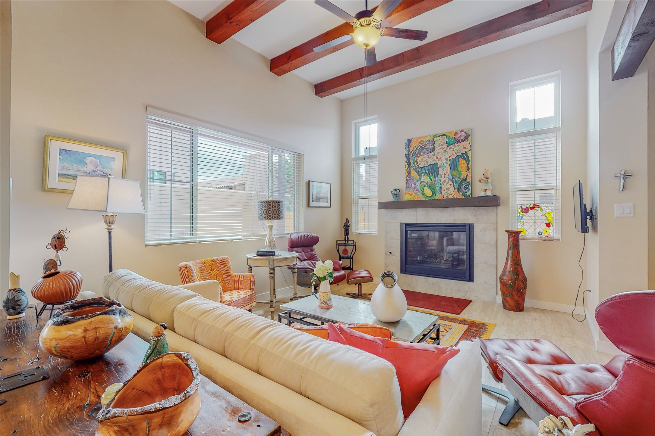 Open concept living, this floor plan allows abundant natural light & easy living. Offers a spacious primary suite and two additional guest rooms, ideal for your den/office/studio with two outdoor covered portals. High ceilings with beams, granite countertops, hardwood cabinets, walk-in closets & pantry, a spacious kitchen island, all Kitchen Aid Stainless Steel appliances and refrigerated A/C are a few of the fine living features. This home is designed without any steps and provides ease of accessibility. Villas di Toscana is a gated community ideal for full or part-time residency with walking paths, small parks, and open space. Centrally located, the neighborhood is just minutes from the historic downtown plaza, museums & galleries, skiing, hiking, shopping and entertainment venues. Welcome home to Villas di Toscana!