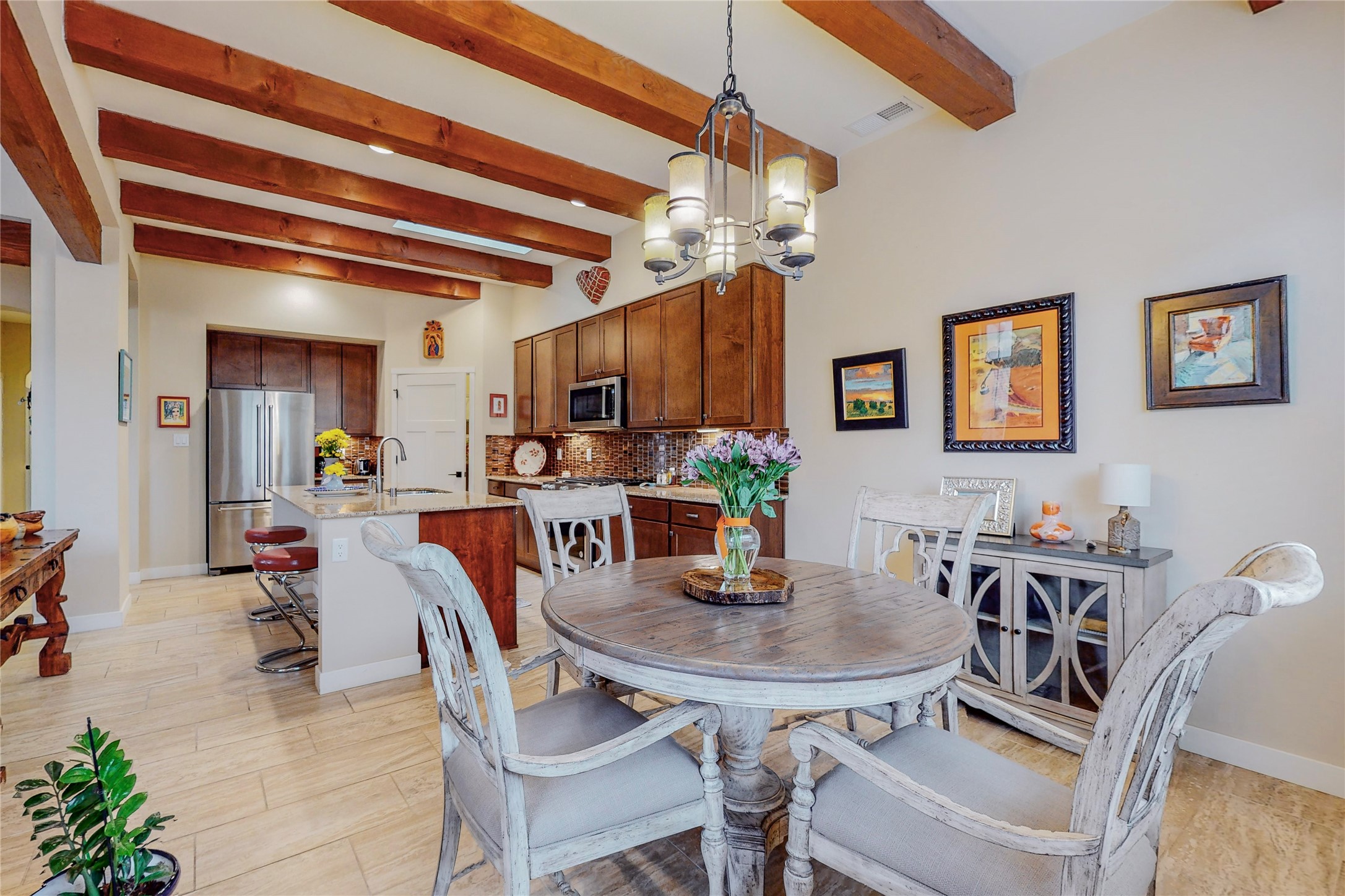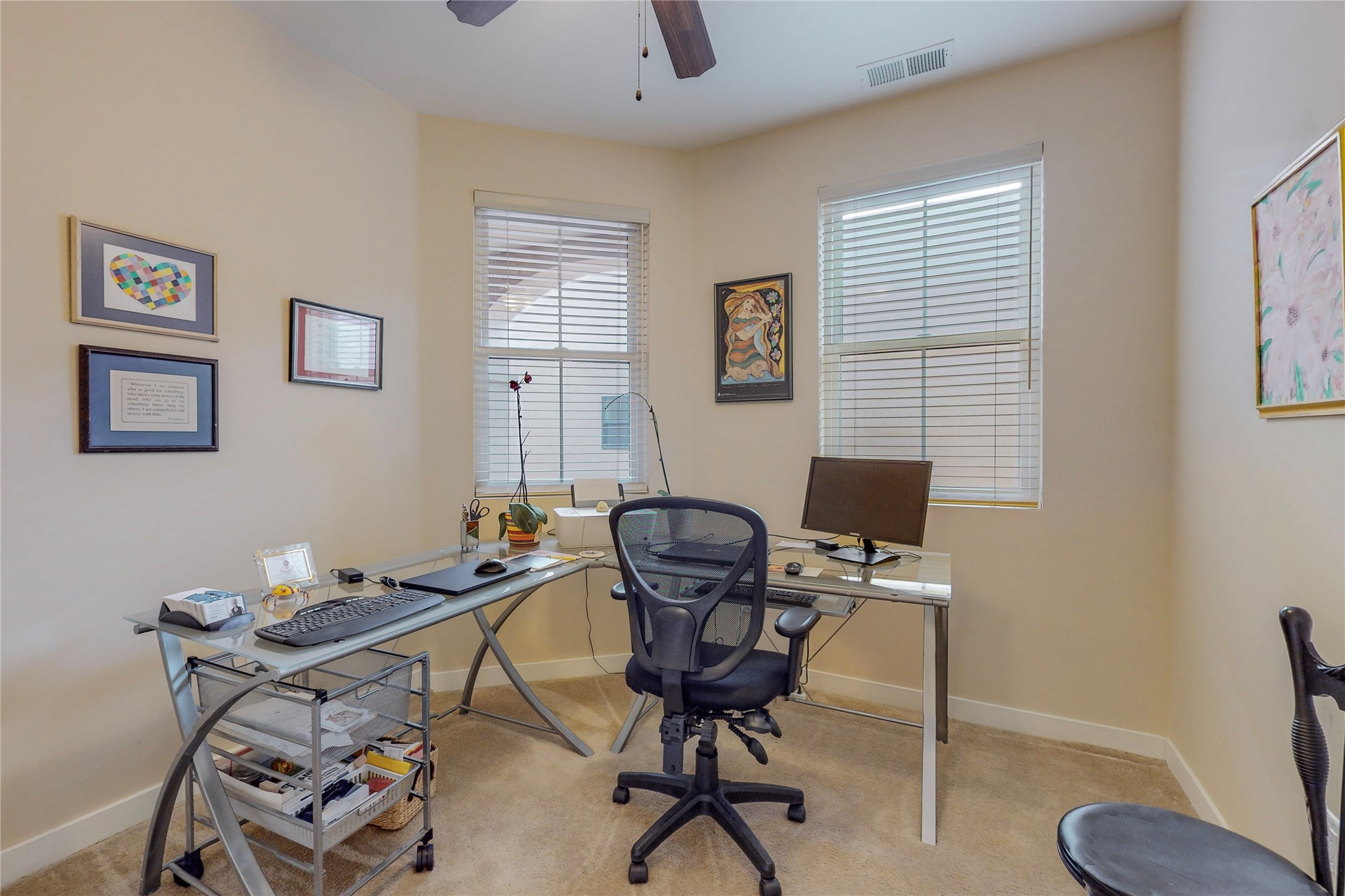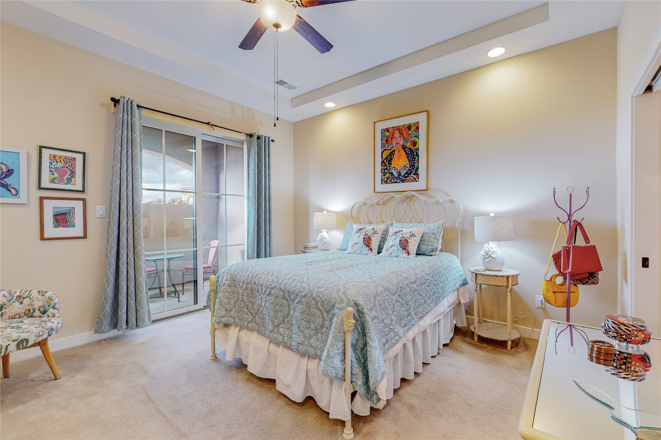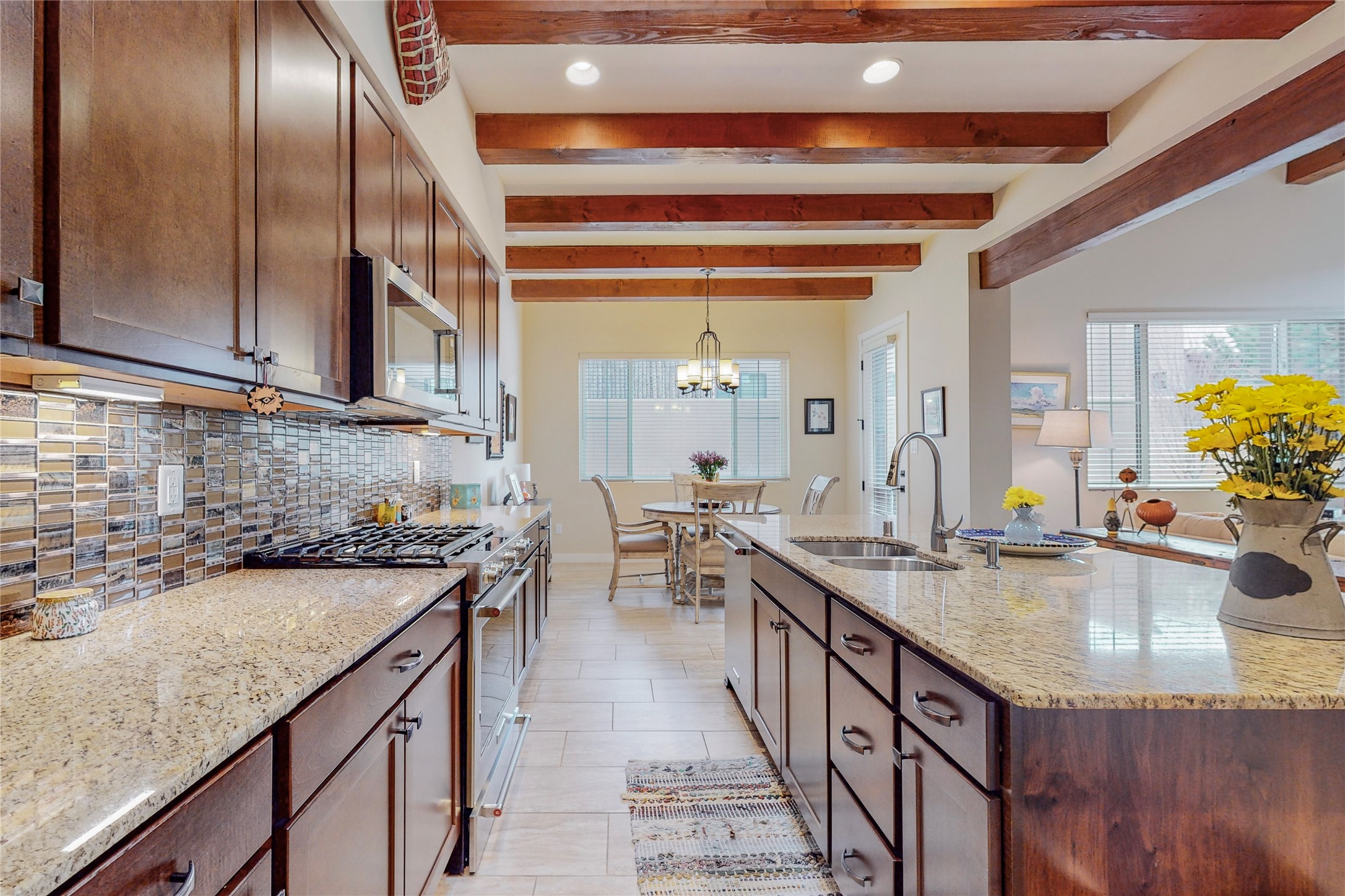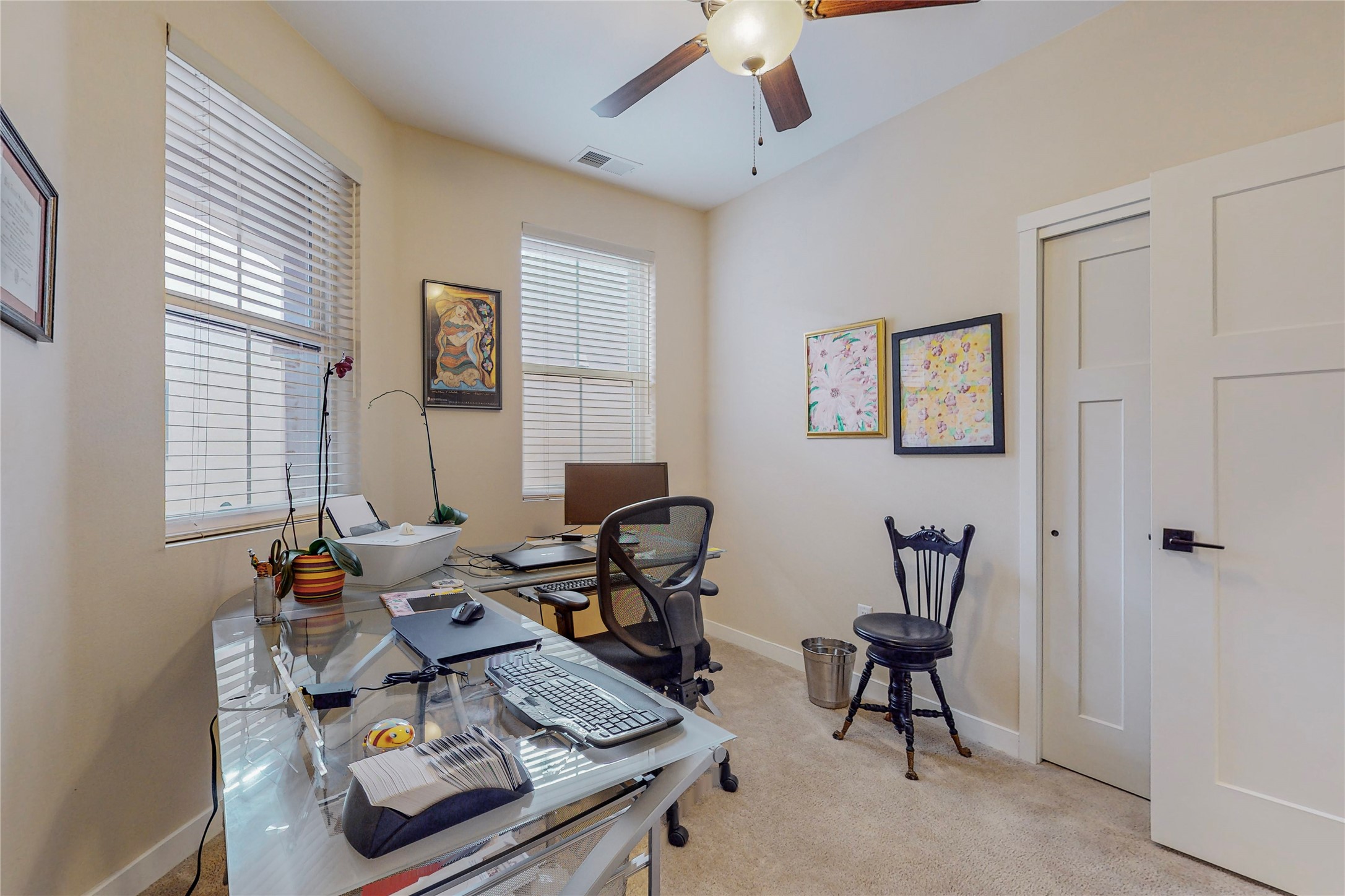 Open concept living, this floor plan allows abundant natural light & easy living. Offers a spacious primary suite and two additional guest rooms, ideal for your den/office/studio with two outdoor covered portals. High ceilings with beams, granite countertops, hardwood cabinets, walk-in closets & pantry, a spacious kitchen island, all Kitchen Aid Stainless Steel appliances and refrigerated A/C are a few of the fine living features. This home is designed without any steps and provides ease of accessibility. Villas di Toscana is a gated community ideal for full or part-time residency with walking paths, small parks, and open space. Centrally located, the neighborhood is just minutes from the historic downtown plaza, museums & galleries, skiing, hiking, shopping and entertainment venues. Welcome home to Villas di Toscana!