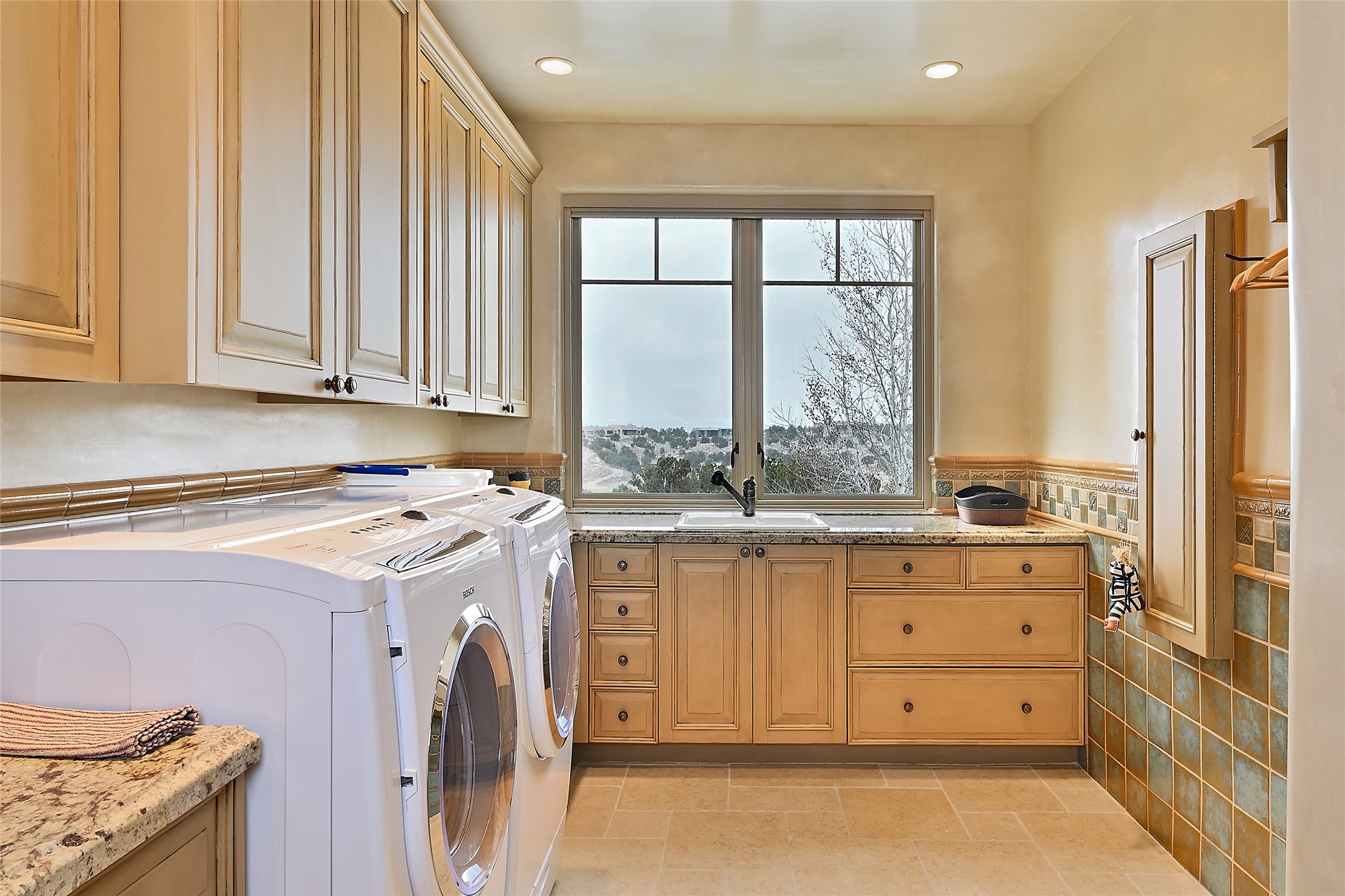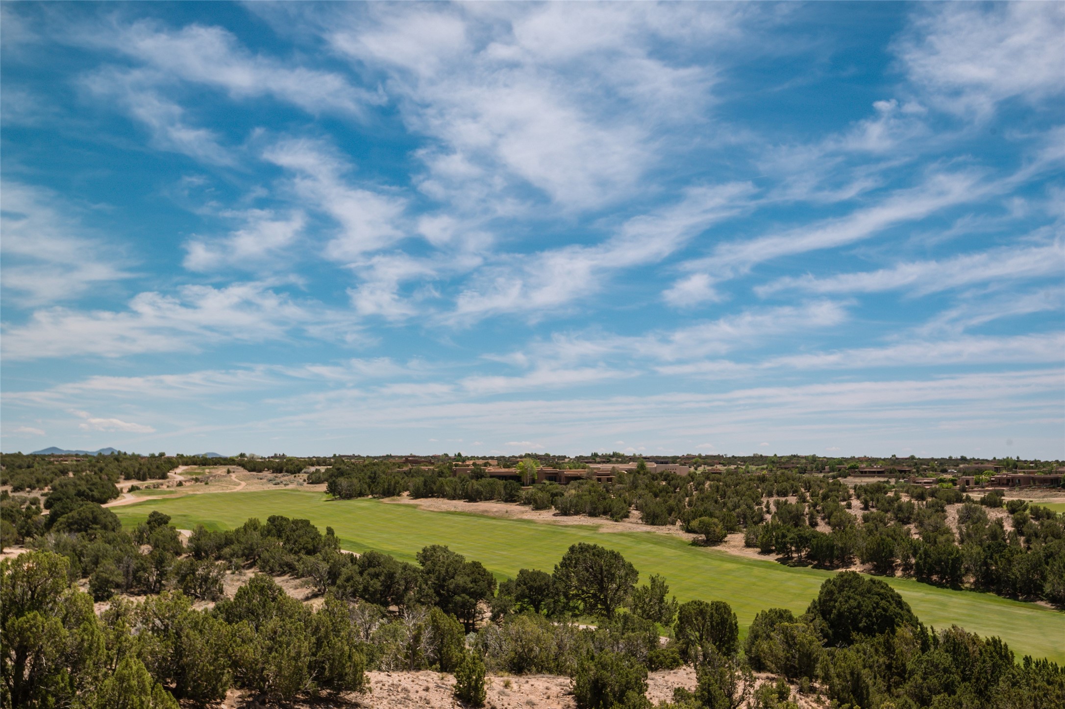 This sophisticated oasis in Las Campanas is both meticulous and inviting. Beginning with a manicured courtyard, the 6,735-square-foot residence features lovely hickory floors, hand-troweled plaster walls, sturdy beams and vigas with corbels, regal archways, limestone and ceramic tilework, and custom millwork and cabinetry. A refined but relaxed ambience fills nearly every room, from a handsome library with numerous built-ins and a chic living room with a stone fireplace and a magnificent vista to a welcoming casita with generous space for living, dining, sleeping, relaxing by the fire, or basking in enviable views. The kitchen is simultaneously impressive and charming, with a temperature-controlled wine room, two islands, superior appliances, a walk-in pantry, and a breakfast nook with built-in seating and a kiva fireplace. Just outside are a built-in grill, an alfresco fireplace, and portal space for lounging, dining, or appreciating a mesmerizing vista over the rolling hills, fairways, and rooftops of Las Campanas to the Sangre de Cristos and Jemez Mountains. The serene owner's suite has a fireplace, private portal access, and a luxurious bath with a room-sized walk-in closet, a spa-like shower, and a soaking tub beside a warming kiva fireplace. The two guest suites have walk-in closets, private baths, and access to a portal. Other highlights include an oversized three-car garage, a mudroom and office space, and a large laundry room with thoughtful built-ins.