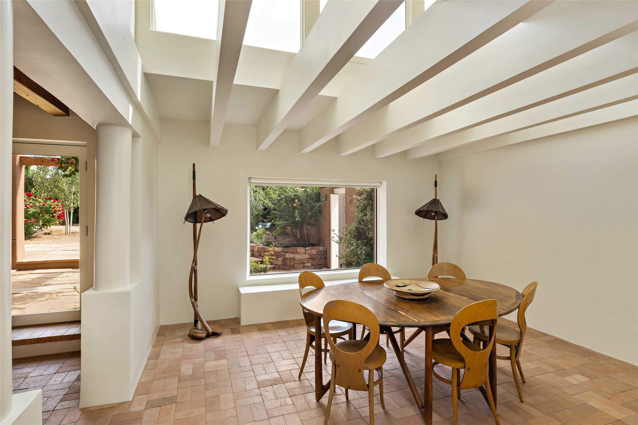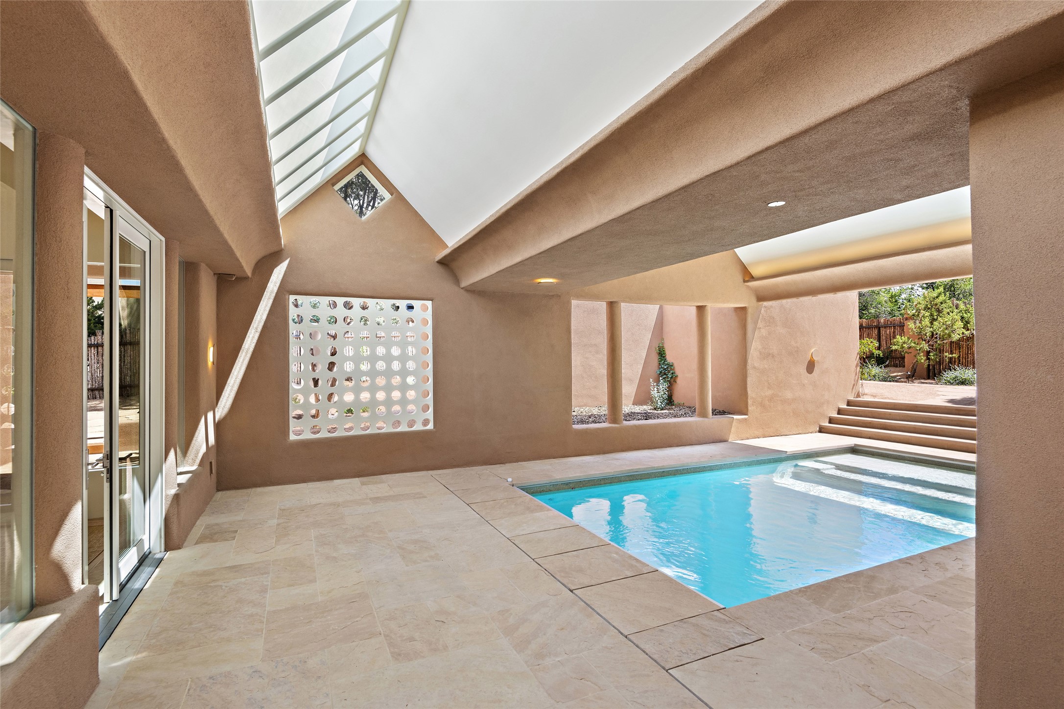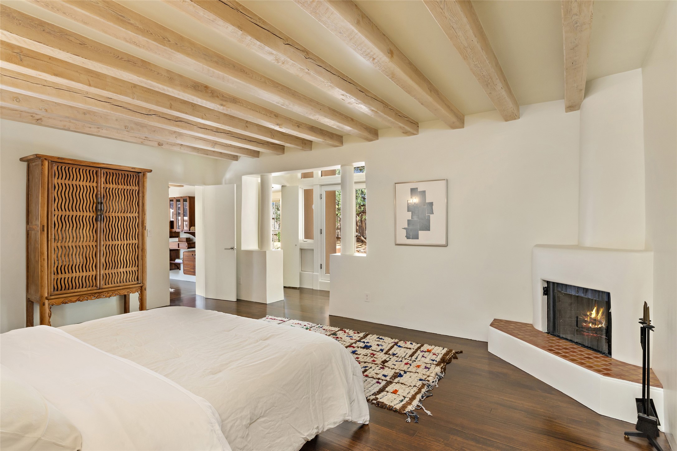 This fabulous postmodern adobe & frame Historic Eastside residence with four bedroom suites plus a one-bedroom guesthouse and pool, must be experienced to appreciate the sophisticated design elements and abundant exquisite detail throughout. Subtle southwest touches seamlessly accent the clean architectural aesthetic. Stunning Sangre de Cristo Mountain views are enjoyed from the upper-level owner's sitting room, bedroom & two decks. A second owner's suite with study is on the main level, and the poolside suite is a pure delight. A sleek, custom-designed chef's kitchen opens to the spacious family/media room. This property was brilliantly and painstakingly updated, completely transformed from the inside out, over three years. Featuring soaring ceilings and awash with light, offering both formal and casual dining spaces, it includes a gym, and private landscaped gardens with stone water features for delightful al fresco dining and entertaining. Multi-zone radiant and F/A heating & air conditioning, solar panels, garage and a 6+ vehicle off-street gated motor court. Chic contemporary luxury, so very rare in this highly sought-after eastside location.