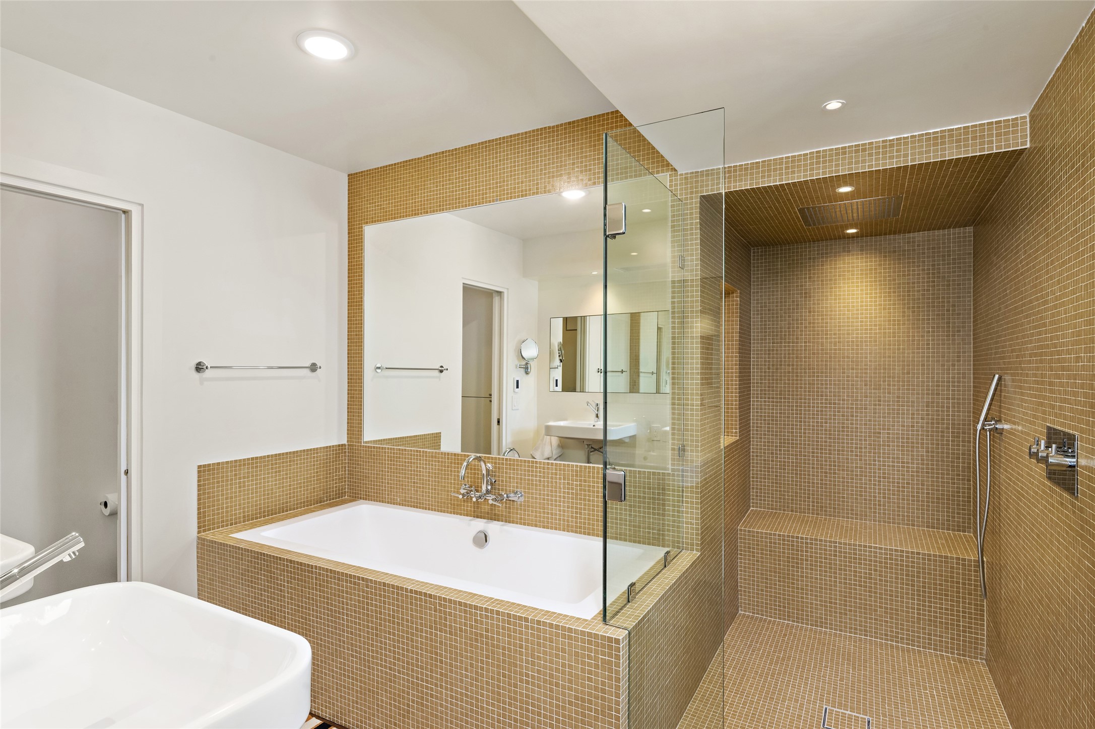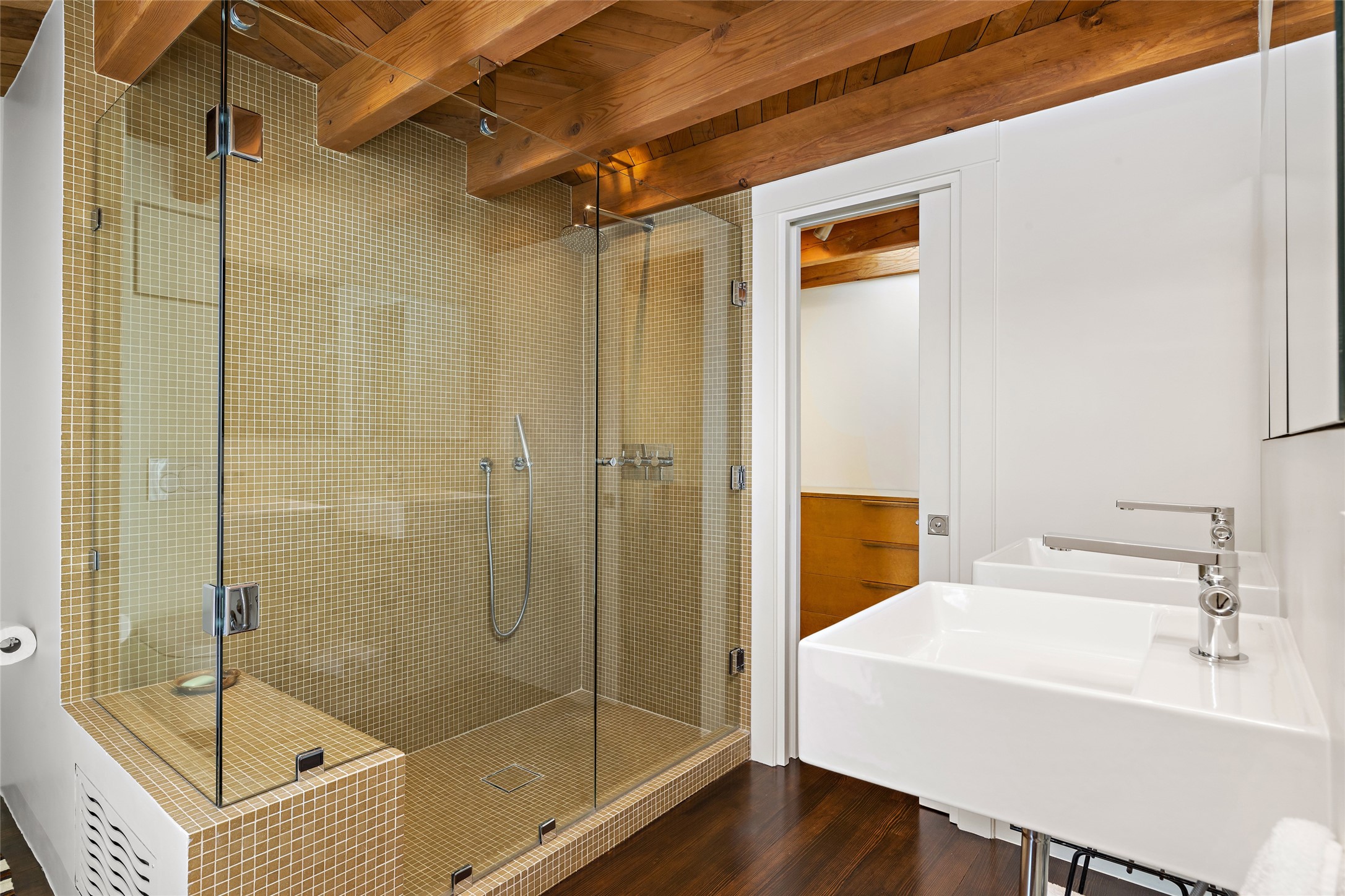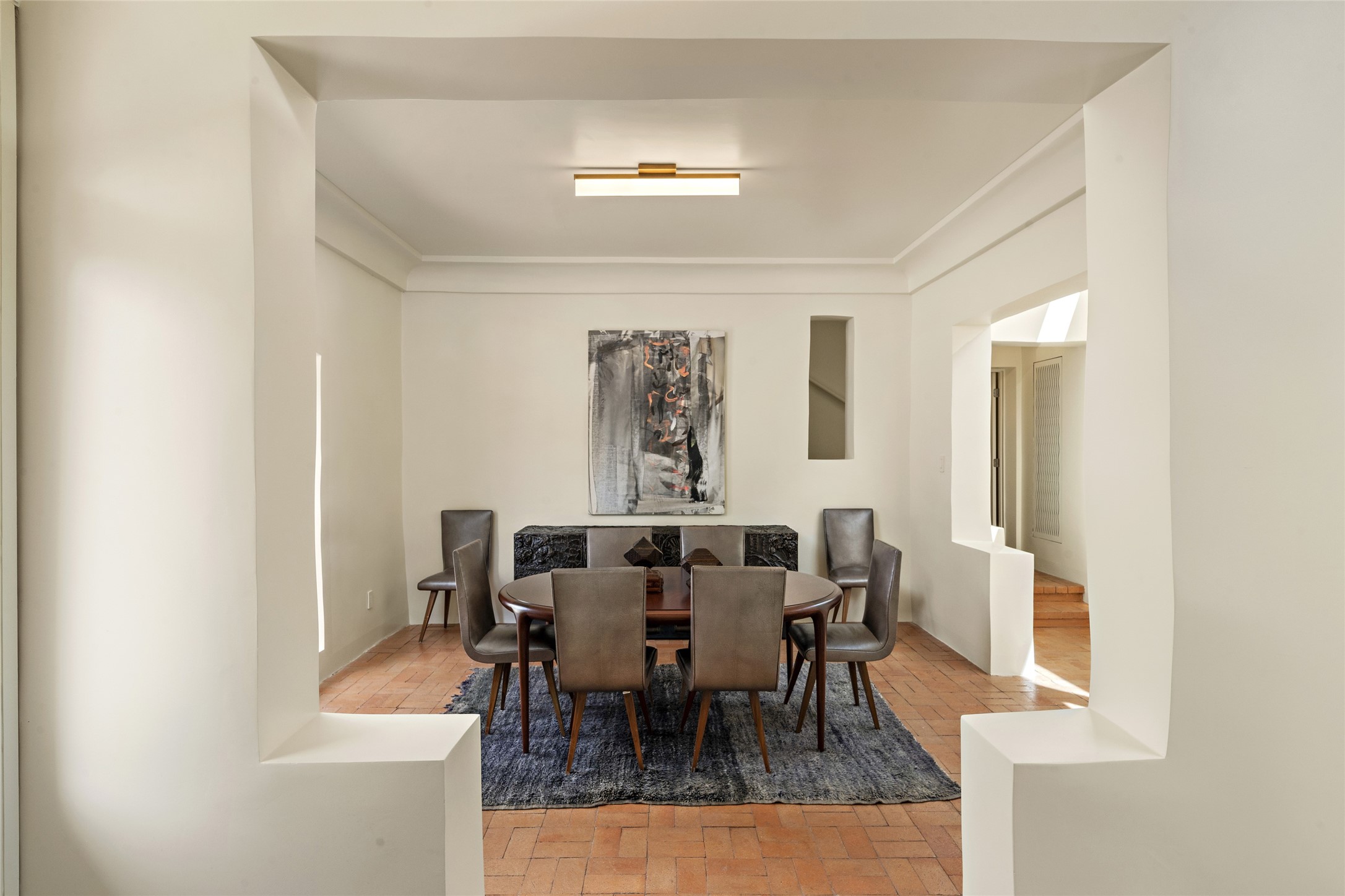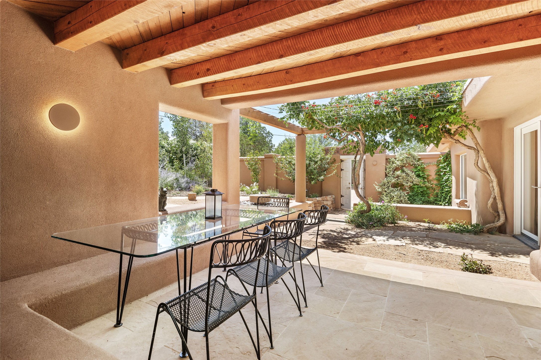This fabulous postmodern adobe & frame Historic Eastside residence with four bedroom suites plus a one-bedroom guesthouse and pool, must be experienced to appreciate the sophisticated design elements and abundant exquisite detail throughout. Subtle southwest touches seamlessly accent the clean architectural aesthetic. Stunning Sangre de Cristo Mountain views are enjoyed from the upper-level owner's sitting room, bedroom & two decks. A second owner's suite with study is on the main level, and the poolside suite is a pure delight. A sleek, custom-designed chef's kitchen opens to the spacious family/media room. This property was brilliantly and painstakingly updated, completely transformed from the inside out, over three years. Featuring soaring ceilings and awash with light, offering both formal and casual dining spaces, it includes a gym, and private landscaped gardens with stone water features for delightful al fresco dining and entertaining. Multi-zone radiant and F/A heating & air conditioning, solar panels, garage and a 6+ vehicle off-street gated motor court. Chic contemporary luxury, so very rare in this highly sought-after eastside location.