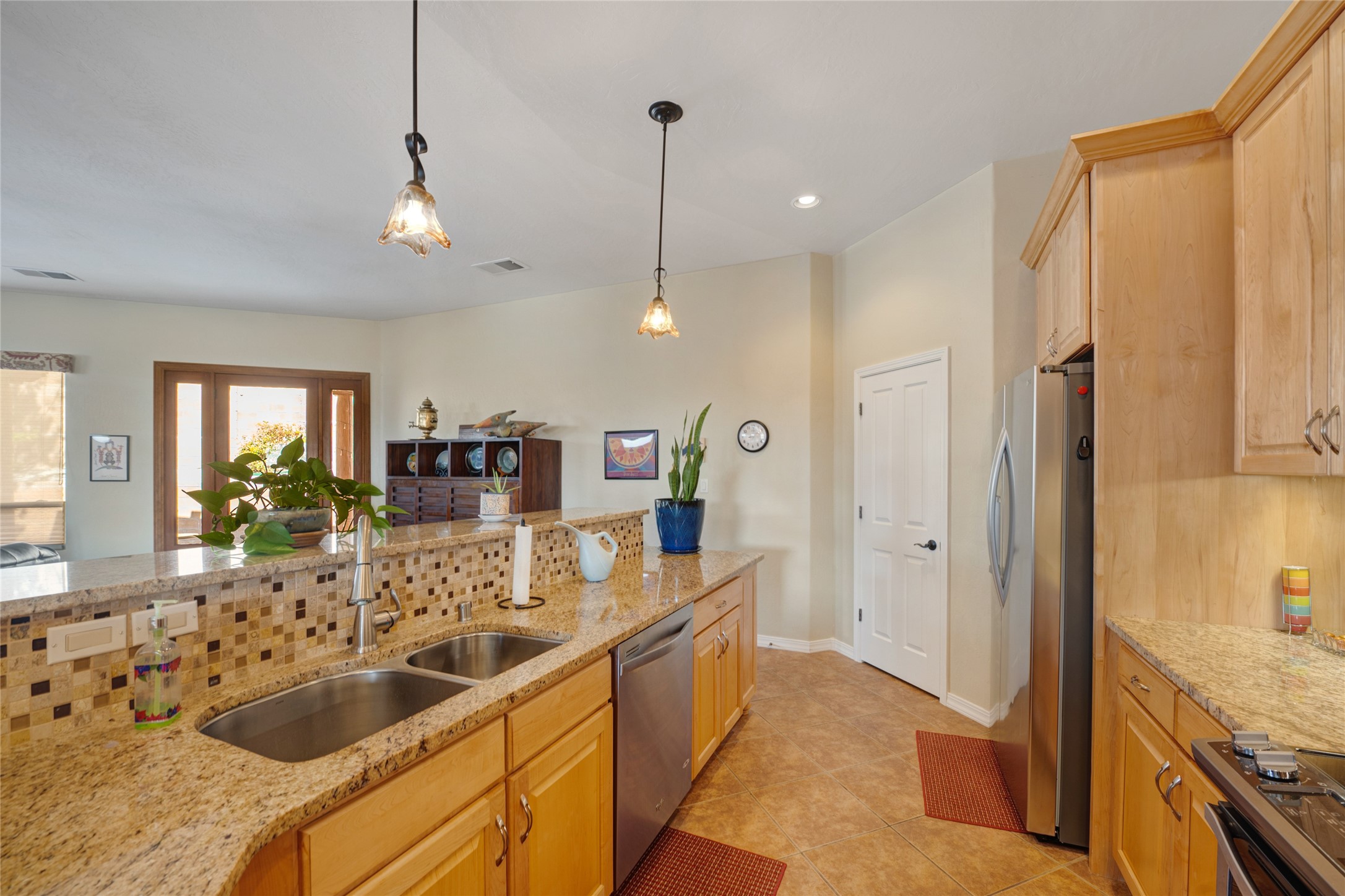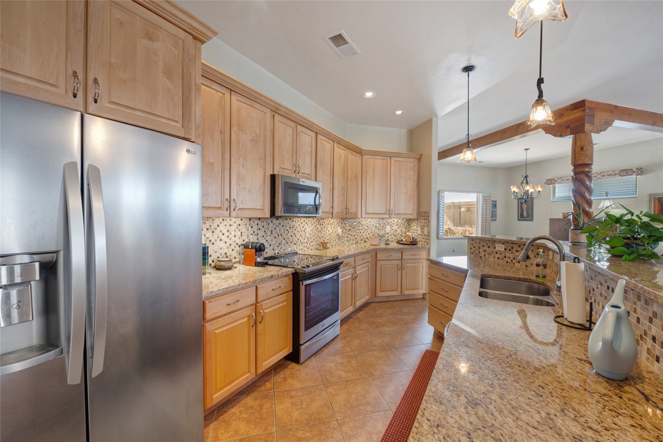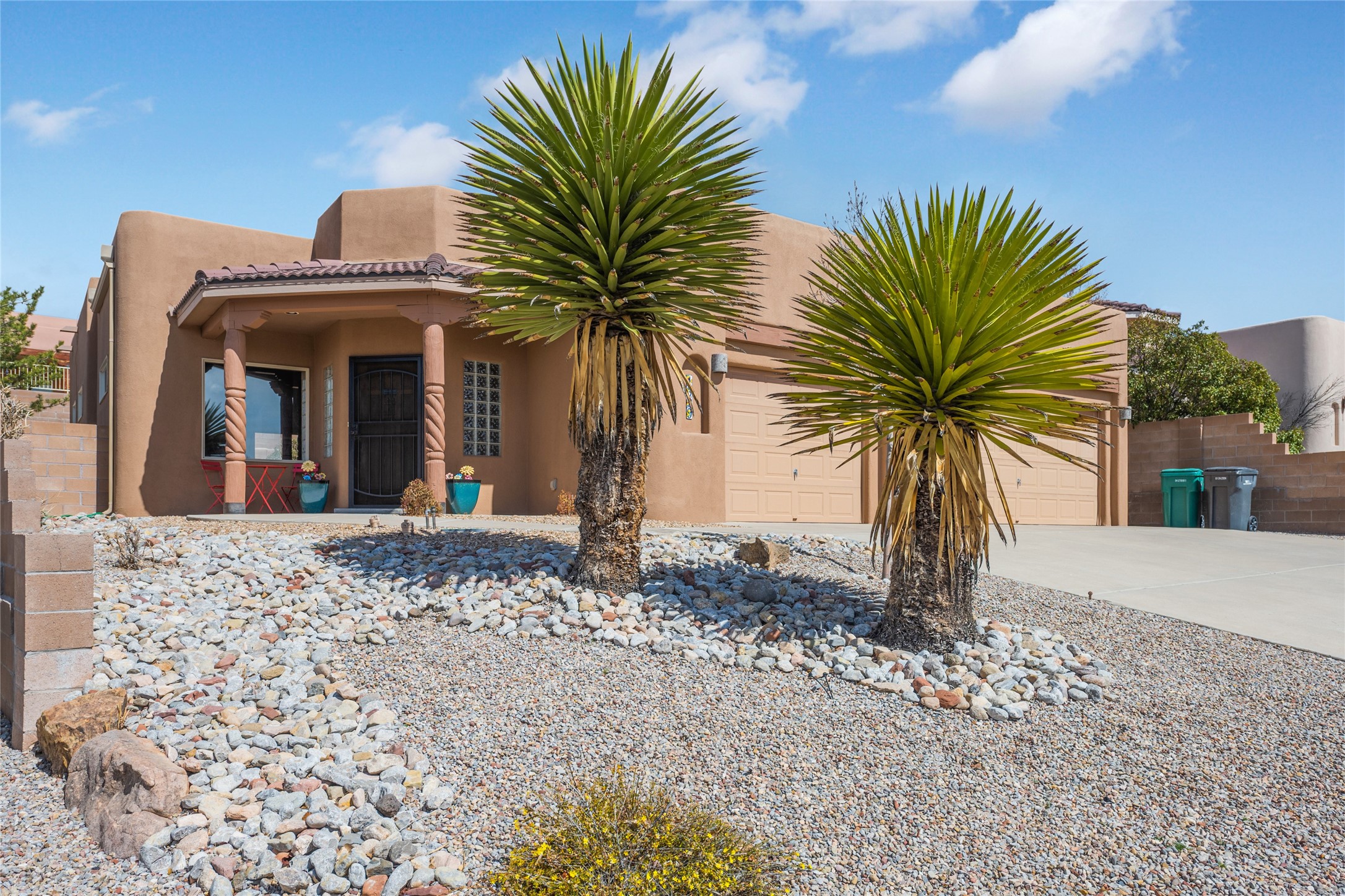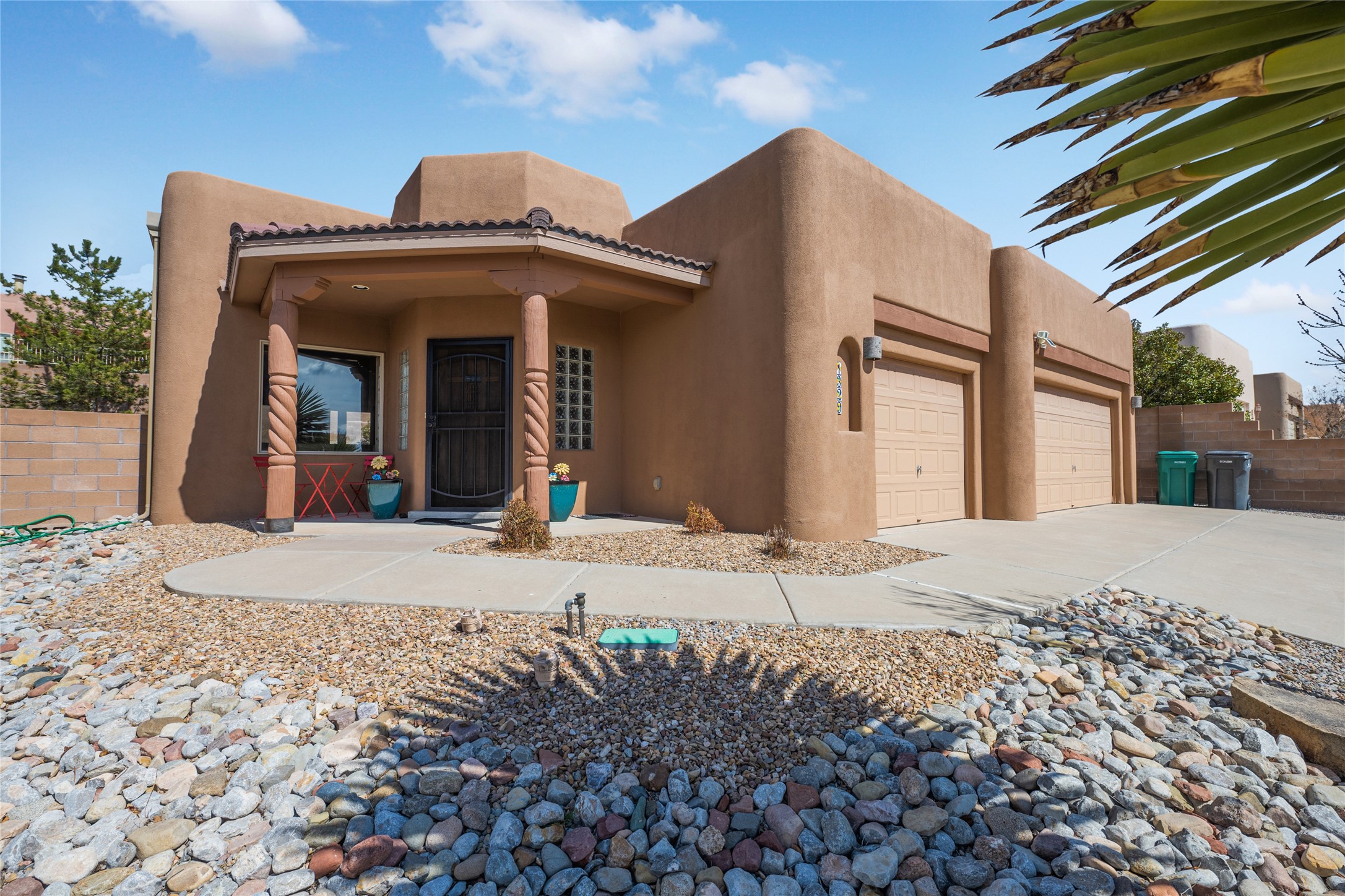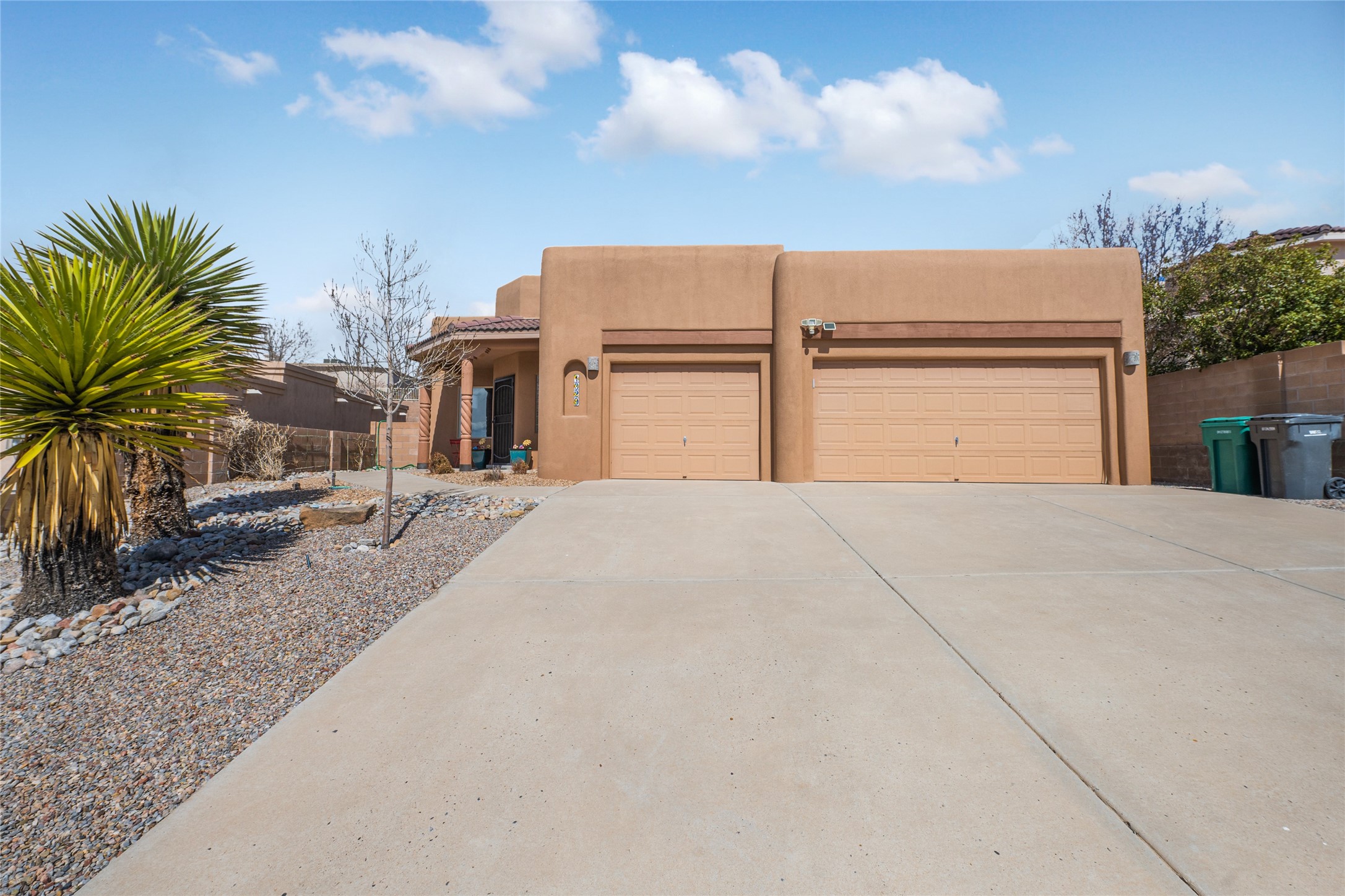 Beautiful home in Trinity Estates that offers room for all to enjoy. This open floor plan makes entertaining or enjoying family/friends a breeze. The kitchen boast stainless steel appliances, granite counter tops, custom lighting and eating bar. Living room opens up to the dining room and kitchen. Warm yourself by the kiva fire place and put your art work in the nichos for all to enjoy. Primary bedroom is spacious enough for a sitting area to enjoy and relax. Soak the day away in your garden tub. No carpet. Relax in your backyard under the covered outdoor patio. Appliances are newer and the refrigerator, washer/dryer are all 2 years old - conveying with the home. Nice three car garage gives added space for storage or the extra vehicle. Commute with ease. Come by and stay awhile, you won't be disappoint