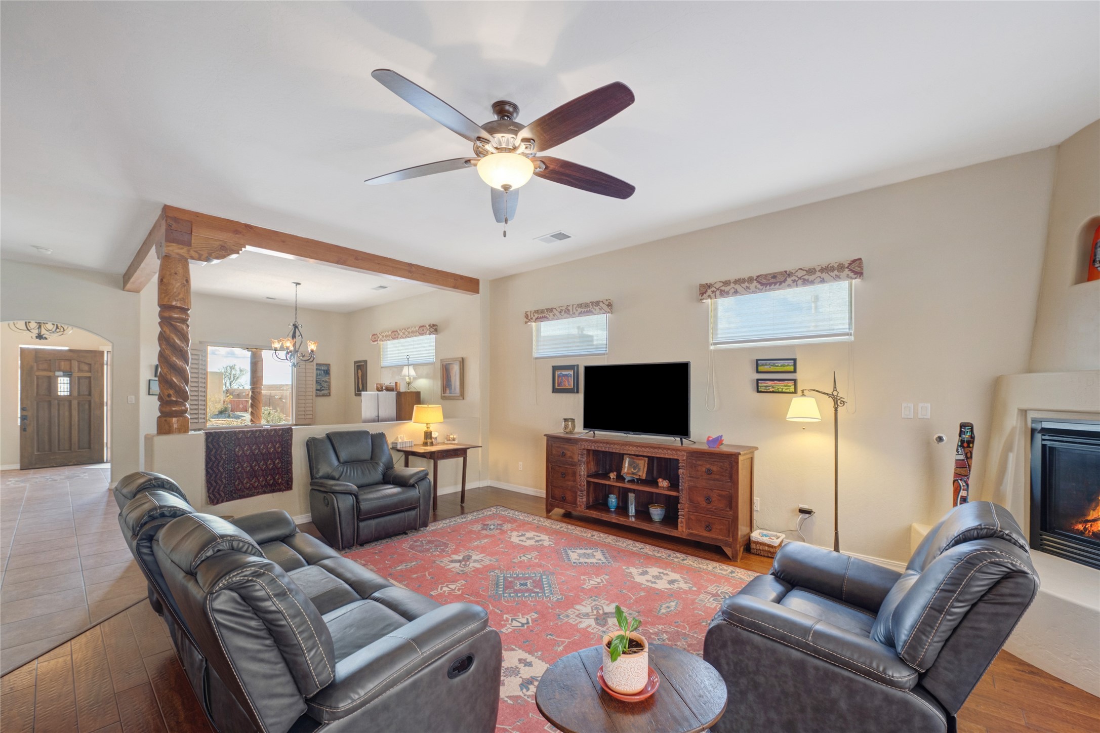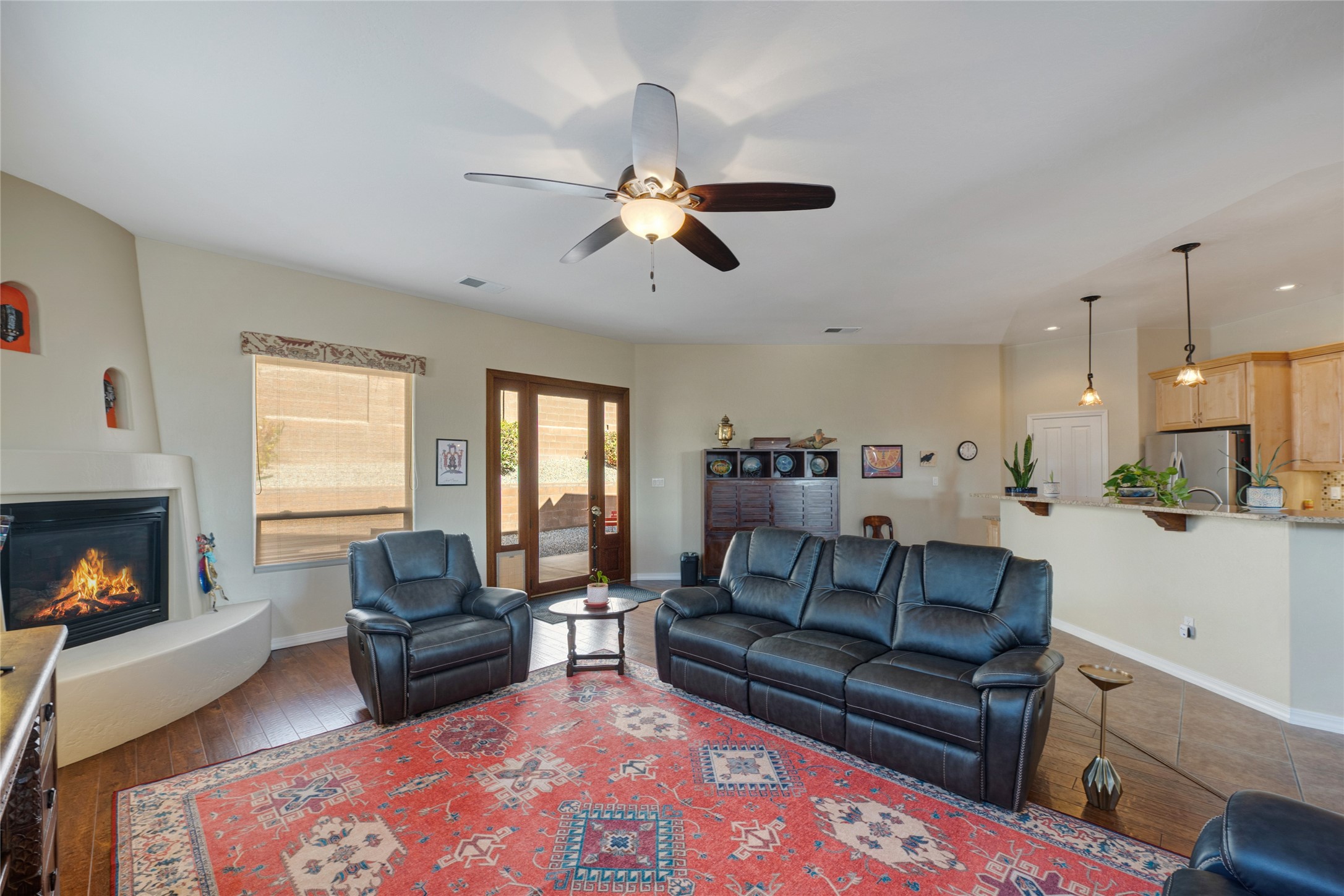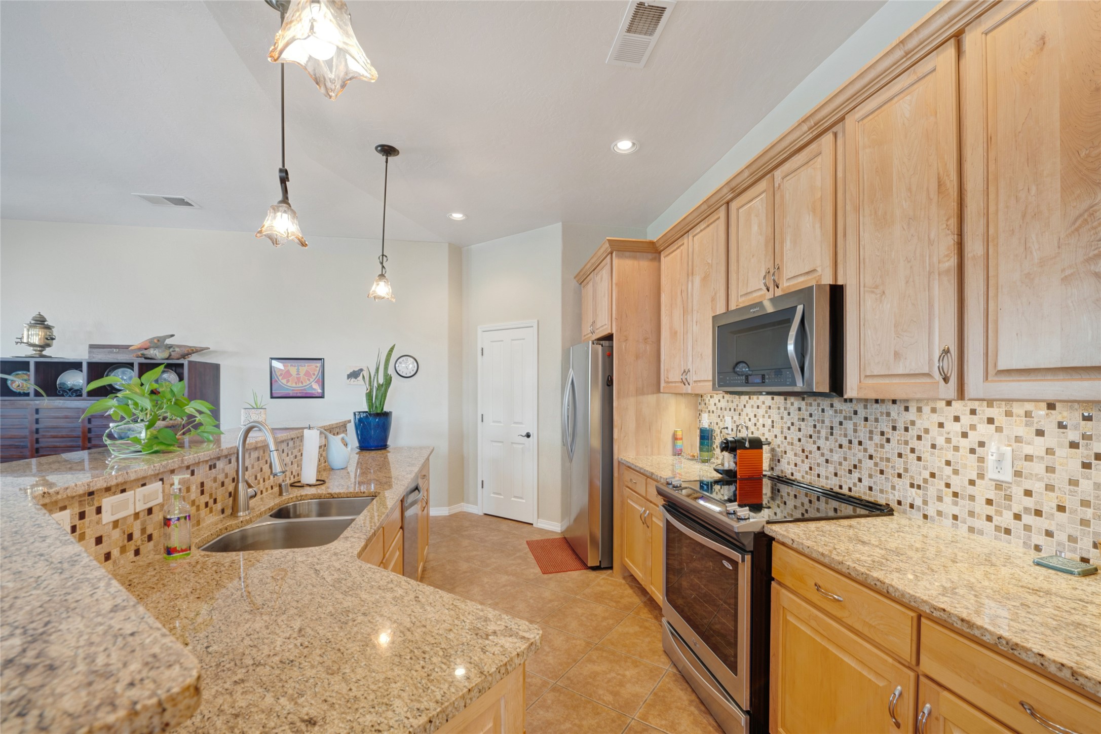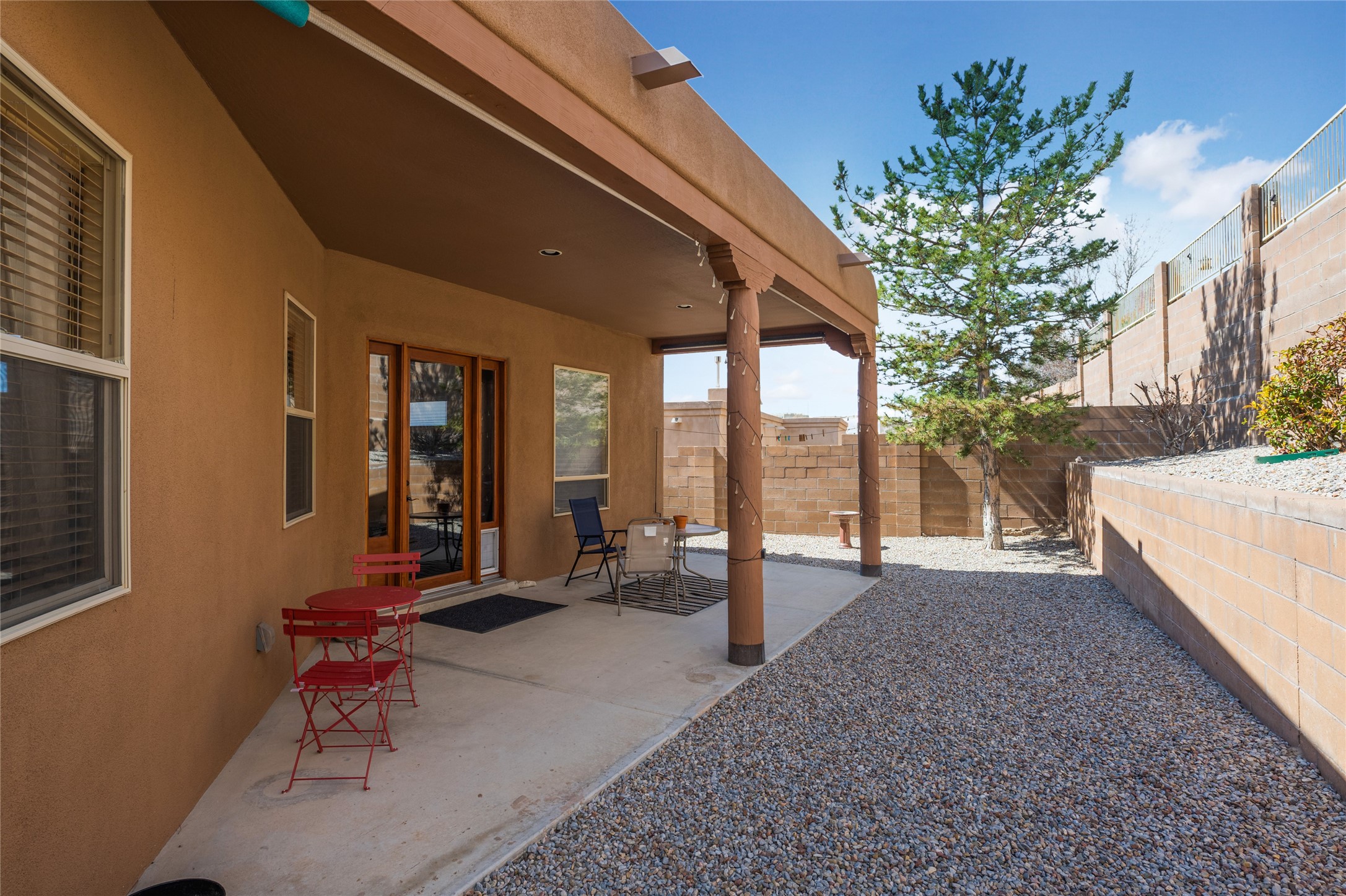 Beautiful home in Trinity Estates that offers room for all to enjoy. This open floor plan makes entertaining or enjoying family/friends a breeze. The kitchen boast stainless steel appliances, granite counter tops, custom lighting and eating bar. Living room opens up to the dining room and kitchen. Warm yourself by the kiva fire place and put your art work in the nichos for all to enjoy. Primary bedroom is spacious enough for a sitting area to enjoy and relax. Soak the day away in your garden tub. No carpet. Relax in your backyard under the covered outdoor patio. Appliances are newer and the refrigerator, washer/dryer are all 2 years old - conveying with the home. Nice three car garage gives added space for storage or the extra vehicle. Commute with ease. Come by and stay awhile, you won't be disappoint