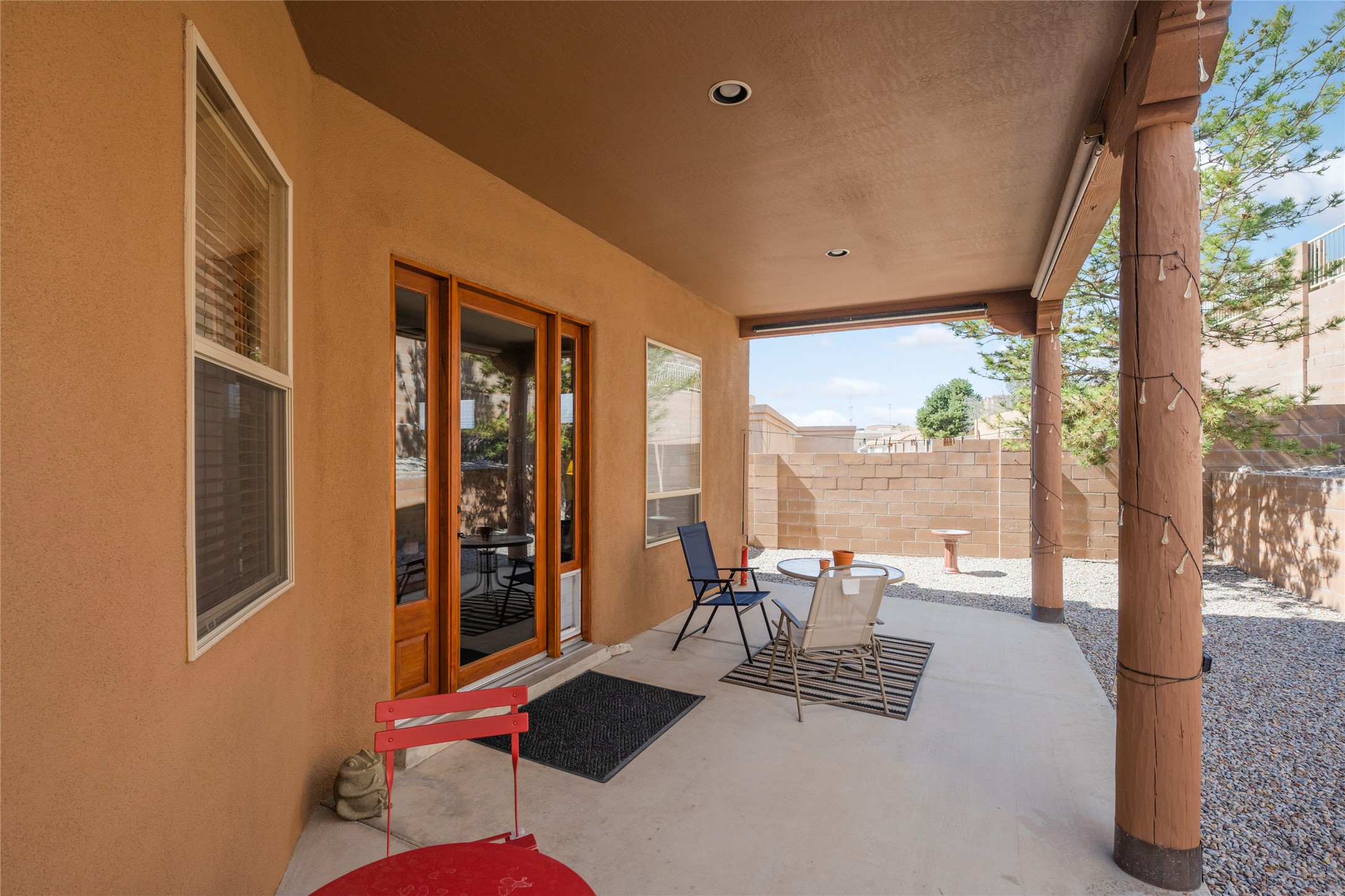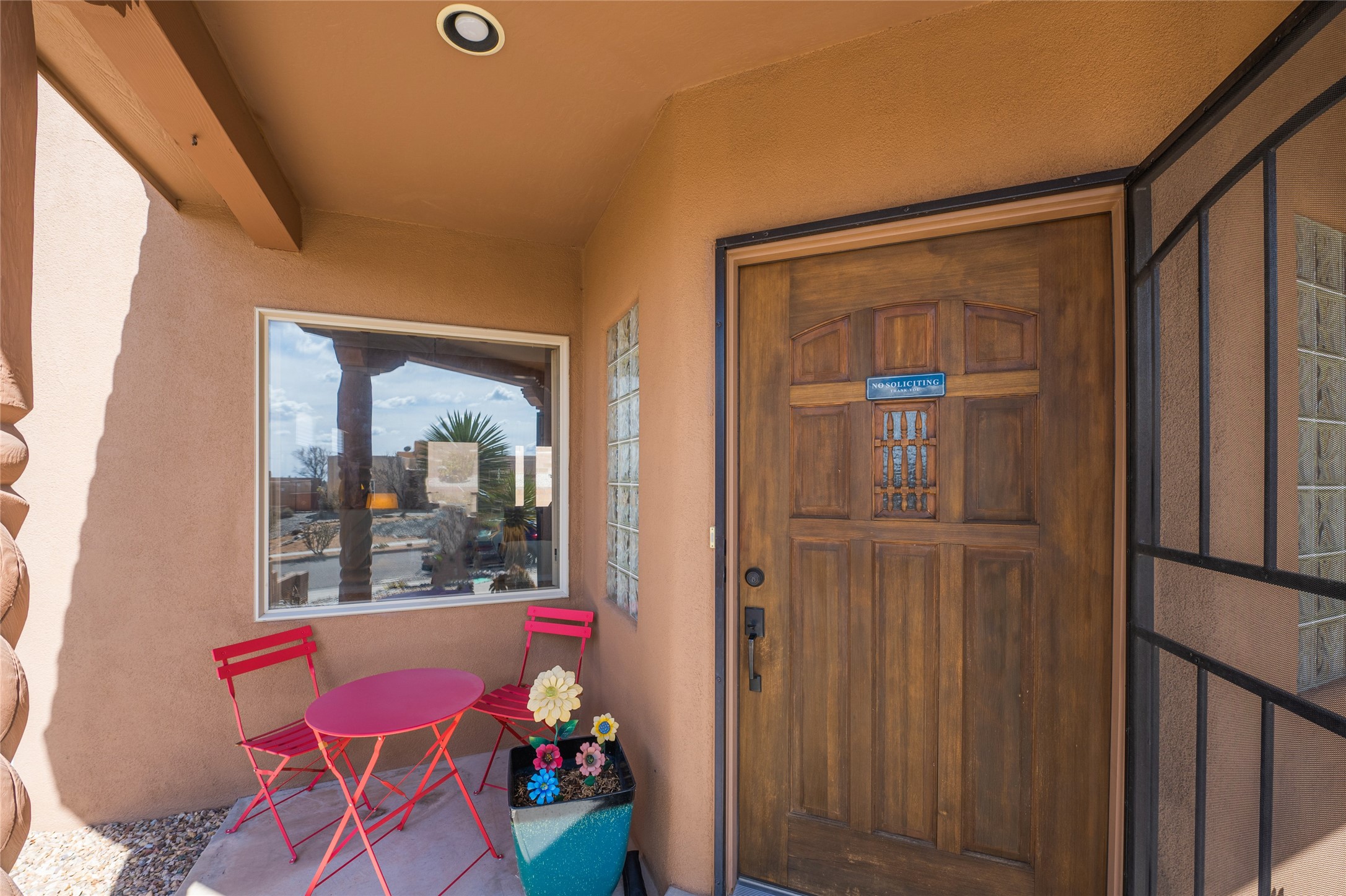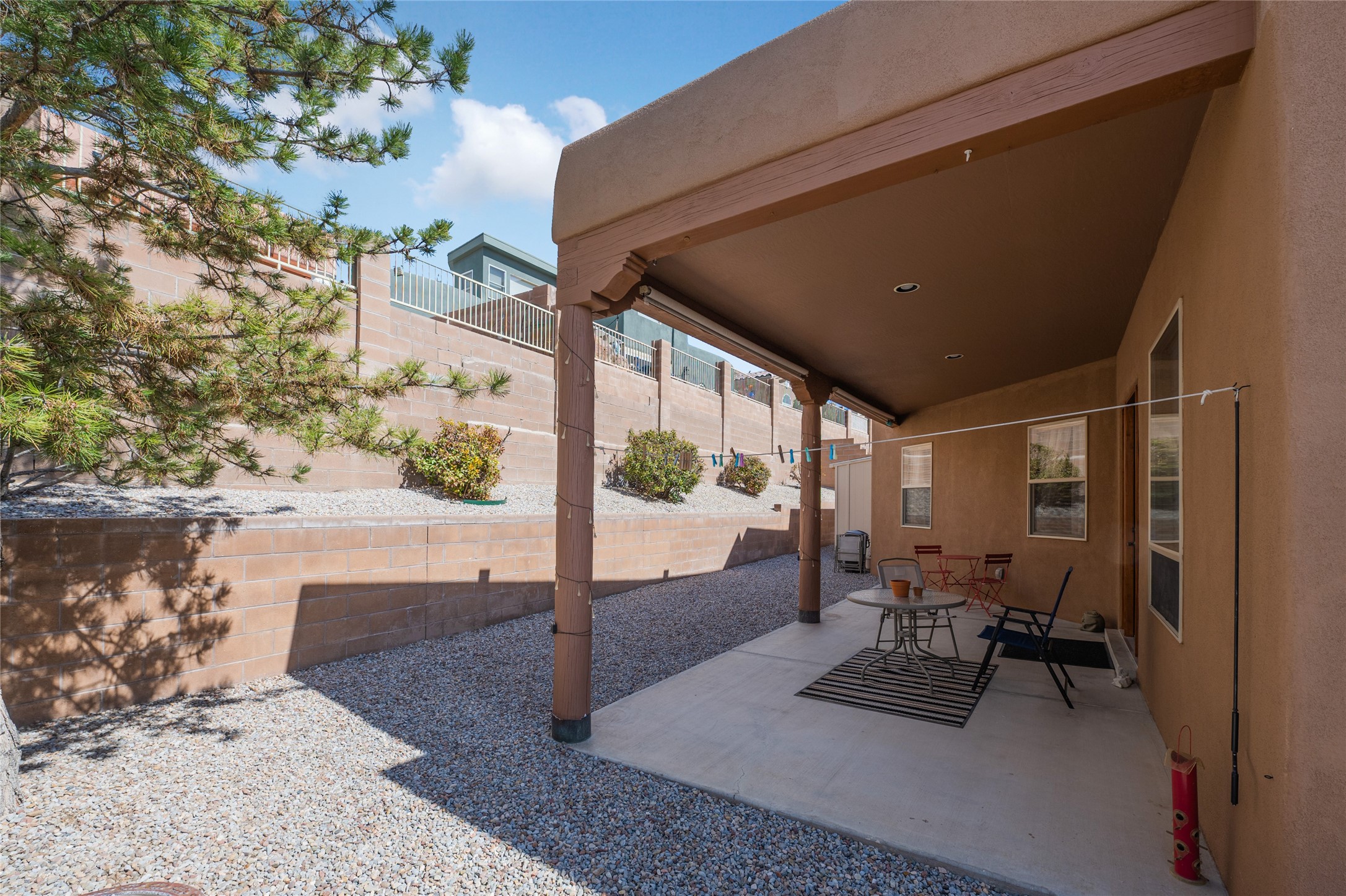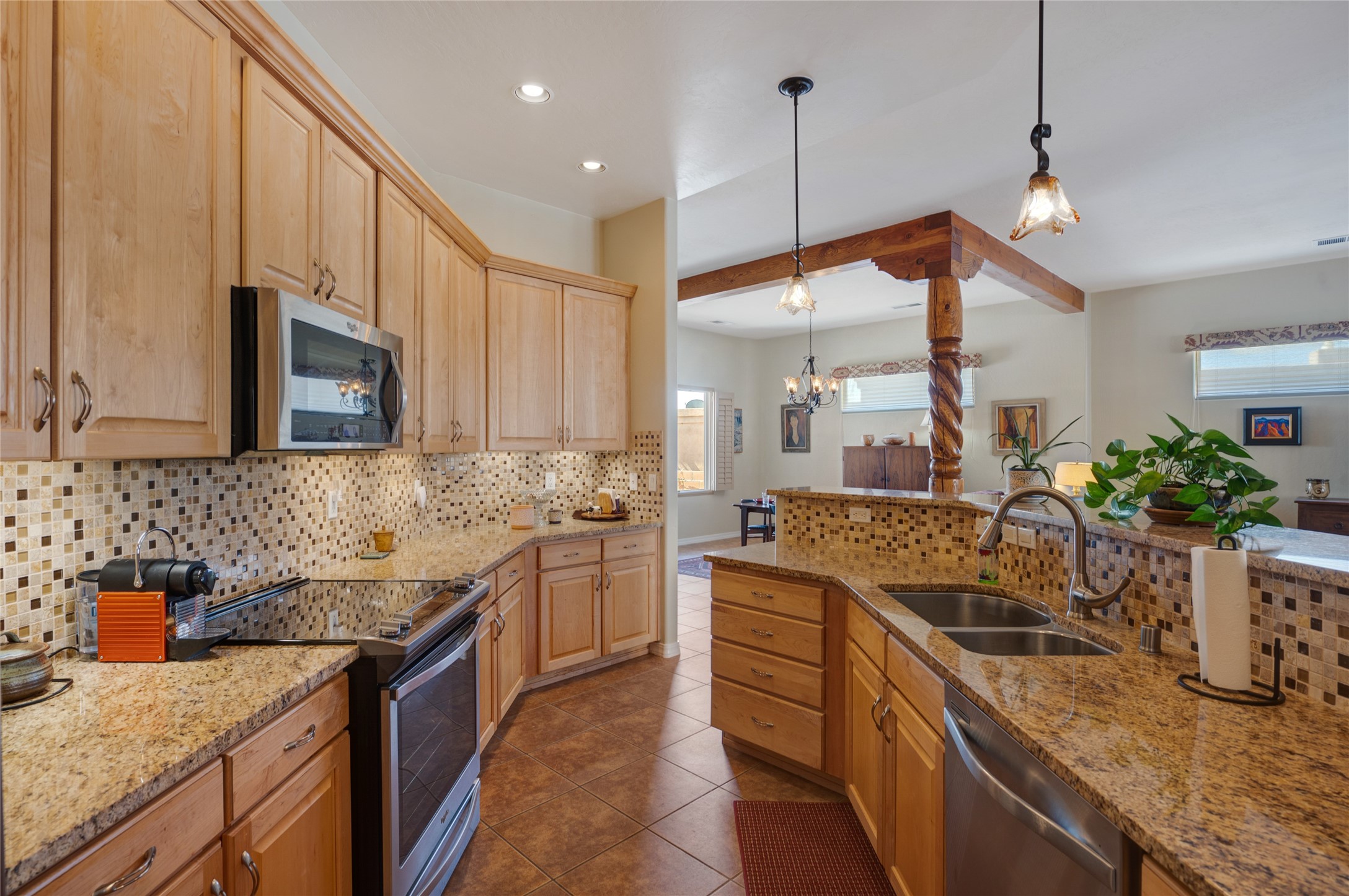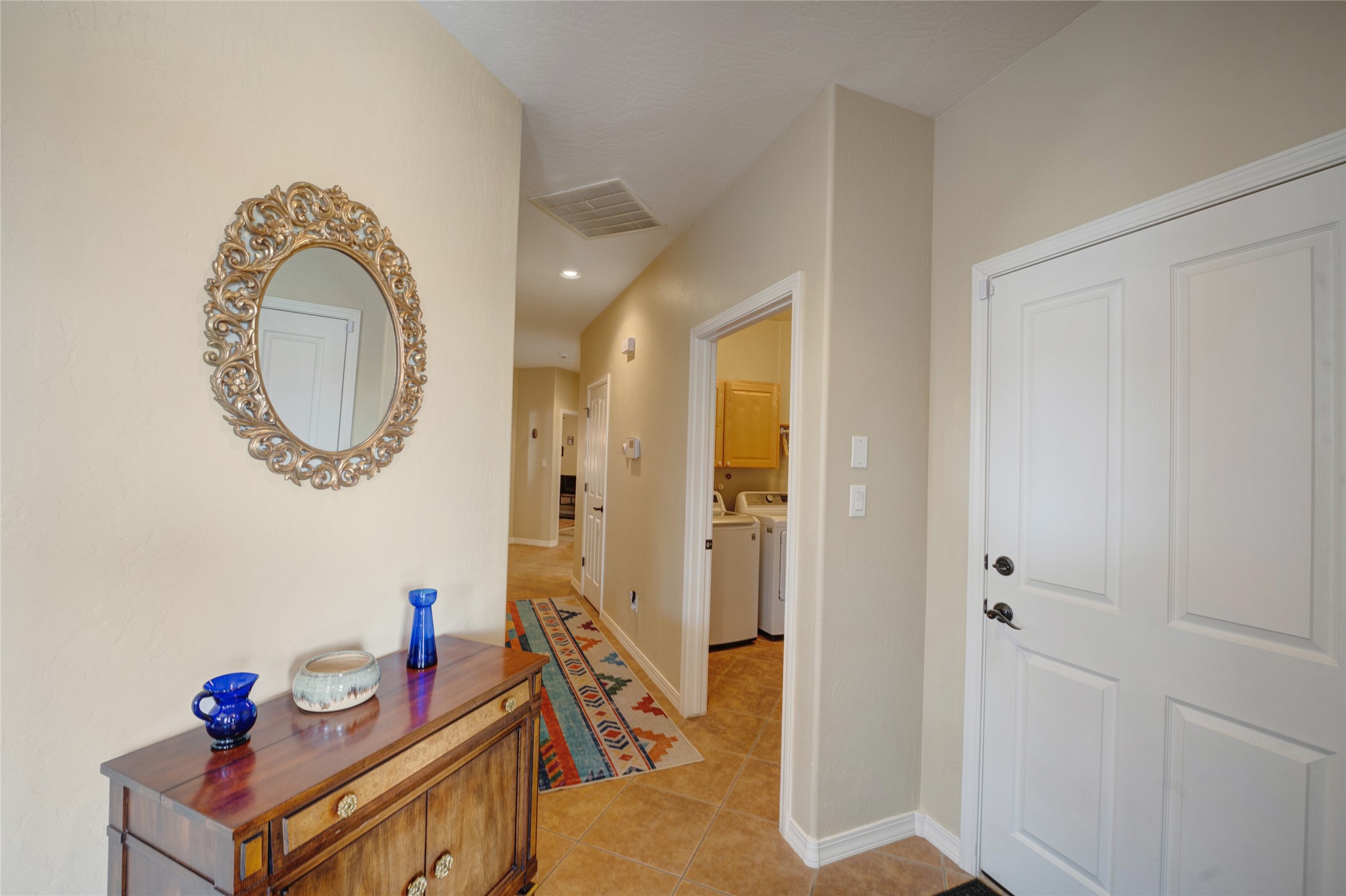 Beautiful home in Trinity Estates that offers room for all to enjoy. This open floor plan makes entertaining or enjoying family/friends a breeze. The kitchen boast stainless steel appliances, granite counter tops, custom lighting and eating bar. Living room opens up to the dining room and kitchen. Warm yourself by the kiva fire place and put your art work in the nichos for all to enjoy. Primary bedroom is spacious enough for a sitting area to enjoy and relax. Soak the day away in your garden tub. No carpet. Relax in your backyard under the covered outdoor patio. Appliances are newer and the refrigerator, washer/dryer are all 2 years old - conveying with the home. Nice three car garage gives added space for storage or the extra vehicle. Commute with ease. Come by and stay awhile, you won't be disappoint