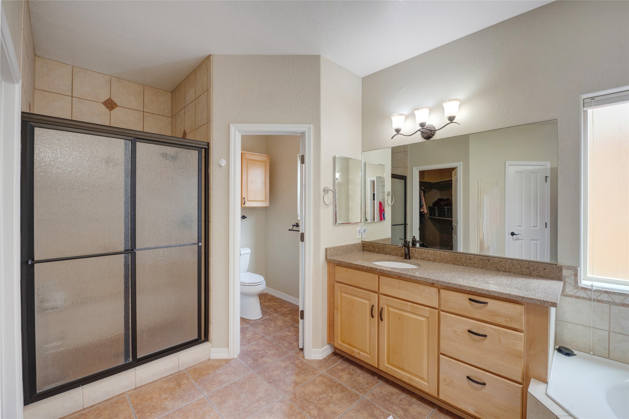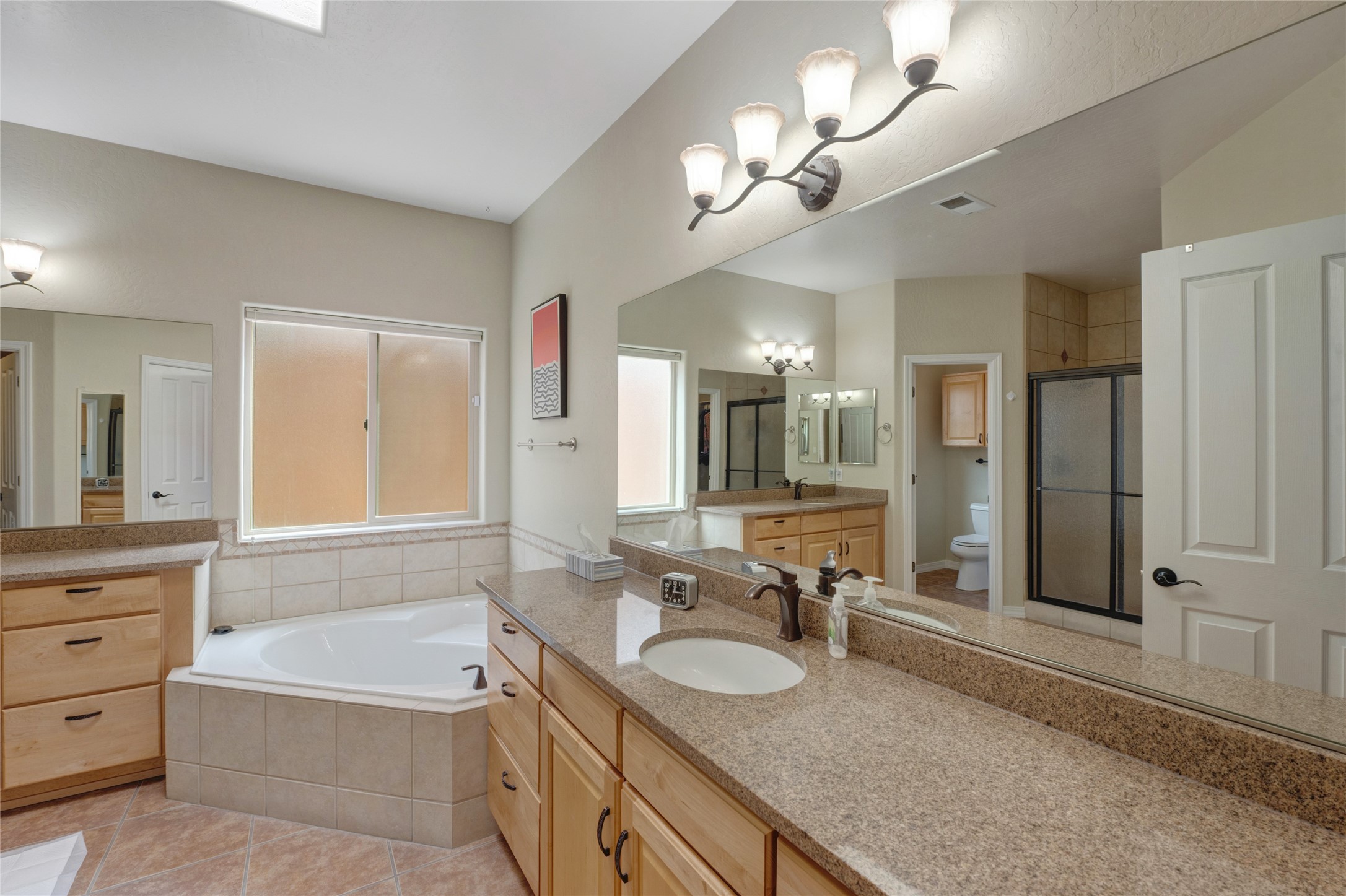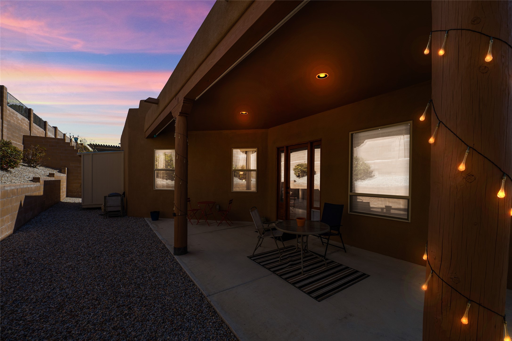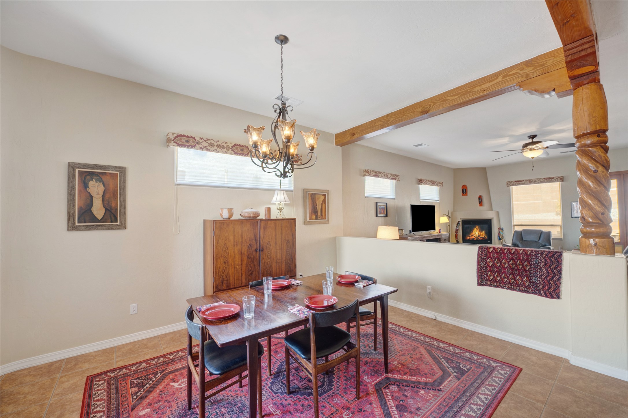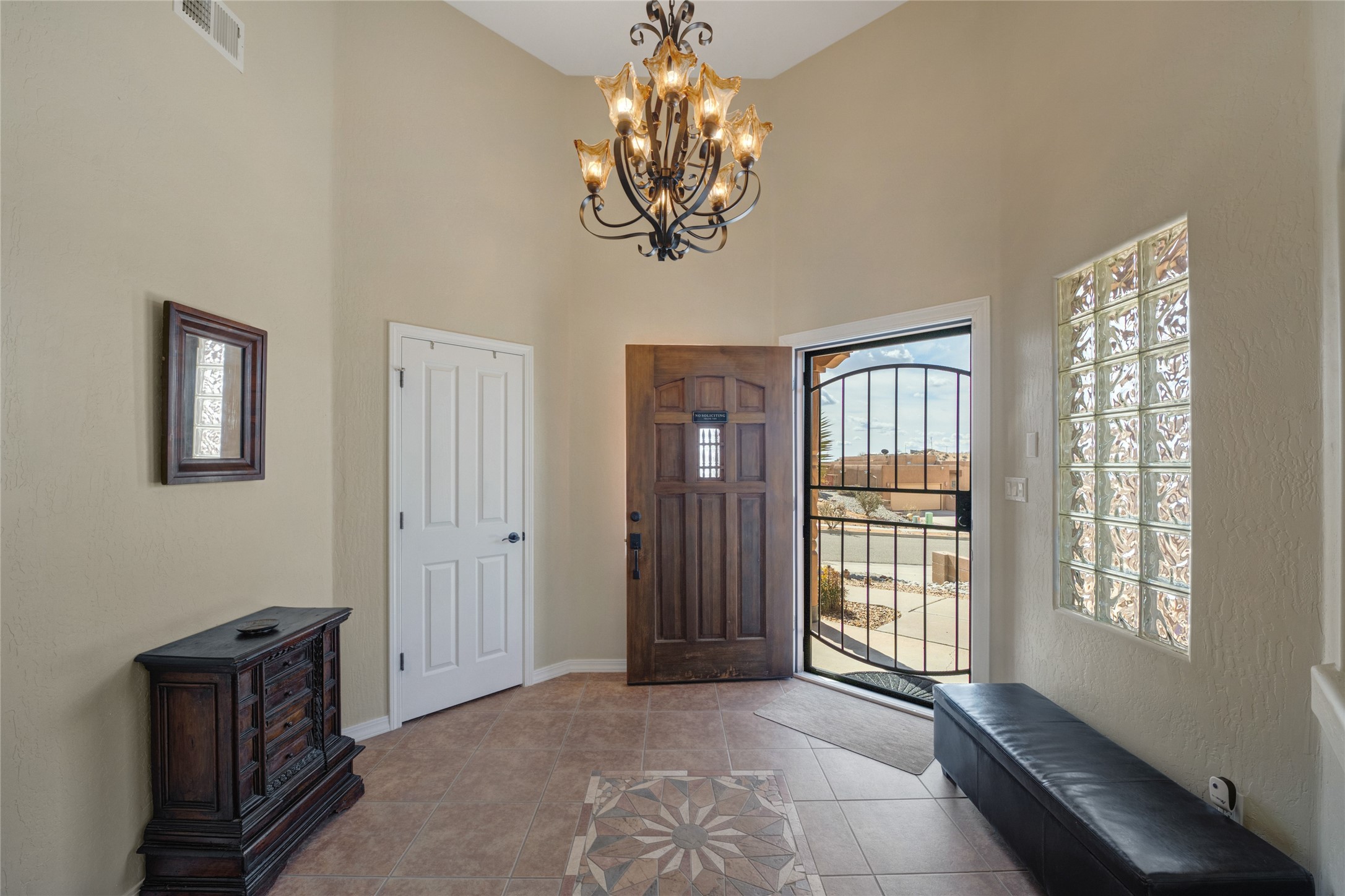 Beautiful home in Trinity Estates that offers room for all to enjoy. This open floor plan makes entertaining or enjoying family/friends a breeze. The kitchen boast stainless steel appliances, granite counter tops, custom lighting and eating bar. Living room opens up to the dining room and kitchen. Warm yourself by the kiva fire place and put your art work in the nichos for all to enjoy. Primary bedroom is spacious enough for a sitting area to enjoy and relax. Soak the day away in your garden tub. No carpet. Relax in your backyard under the covered outdoor patio. Appliances are newer and the refrigerator, washer/dryer are all 2 years old - conveying with the home. Nice three car garage gives added space for storage or the extra vehicle. Commute with ease. Come by and stay awhile, you won't be disappoint