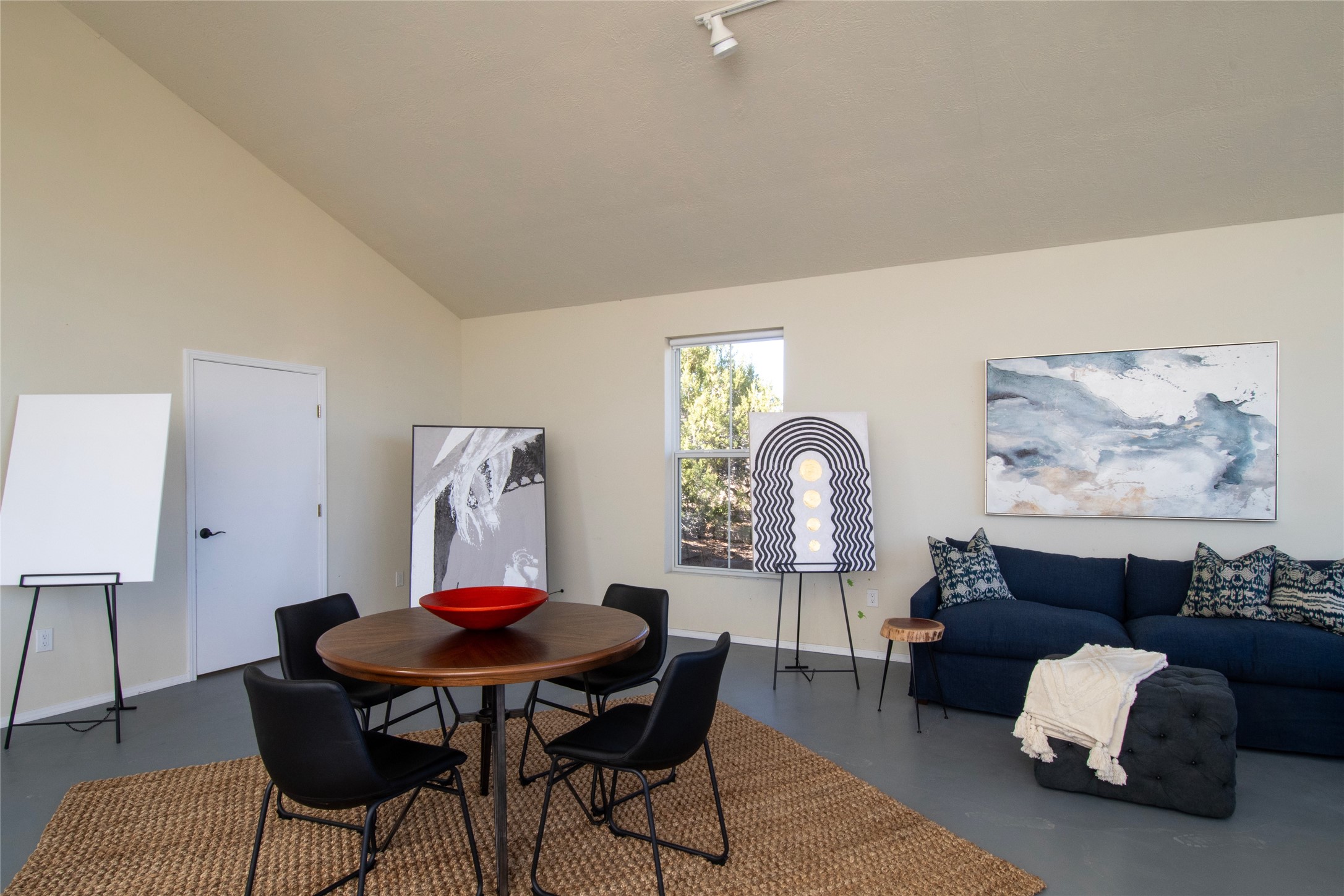 This Northern New Mexico home with detached studio & guest house sits on 13.879 acres in much-desired La Tierra Nueva. Architect, Ed Boniface and builder Tony Ivey's outstanding attention-to-detail is lovely inside and out. Single-level with some interior steps, the 3,288 sq. ft. main home features 2 bedrooms, 4 baths, and a portal running the full length of the front of the house, with expansive mountain views.Brick floors with radiant heating run throughout the home, and wooden vigas reach high into the pitched ceiling creating an inviting openness. A entry hall is open to the living room with its built-in cabinets and shelves, french doors, and a modern fireplace. Visually pleasing, this home has a subtle blending of traditional with a hint of contemporary, making it feel comfortable and original. State-of-the-art appliances and plenty of cabinet and counter space the kitchen features a built-in island with sink and can easily accommodate informal dining. The dining room and kitchen are adjacent to the living room and all have access to the dining portal. A mud room/laundry room and are to the right of the kitchen and lead to the attached 2-car garage. The other wing, to the left of the living room, houses a office, an ensuite bedroom, a powder room and the master suite with fireplace, walk-in closet and an over-sized double shower.The 1,874 sq. ft. detached guest house is as beautiful as the main house. The pitched roof is highlighted inside by wooden beams, making everything feel open and spacious. The guest house has a living room, 2 bedrooms, a full bath, and a portal for enjoying the view.A standalone 1,244 sq. ft. studio with 260 sq. ft. storage loft has huge windows, skylights and tall ceilings, and a big open space for various creative pursuits! This space could also be used for a wood shop, office, meditation room... or even a gym or weight room.This is truly a unique property offering privacy and quiet... and lots of versatility! This is a don't miss.