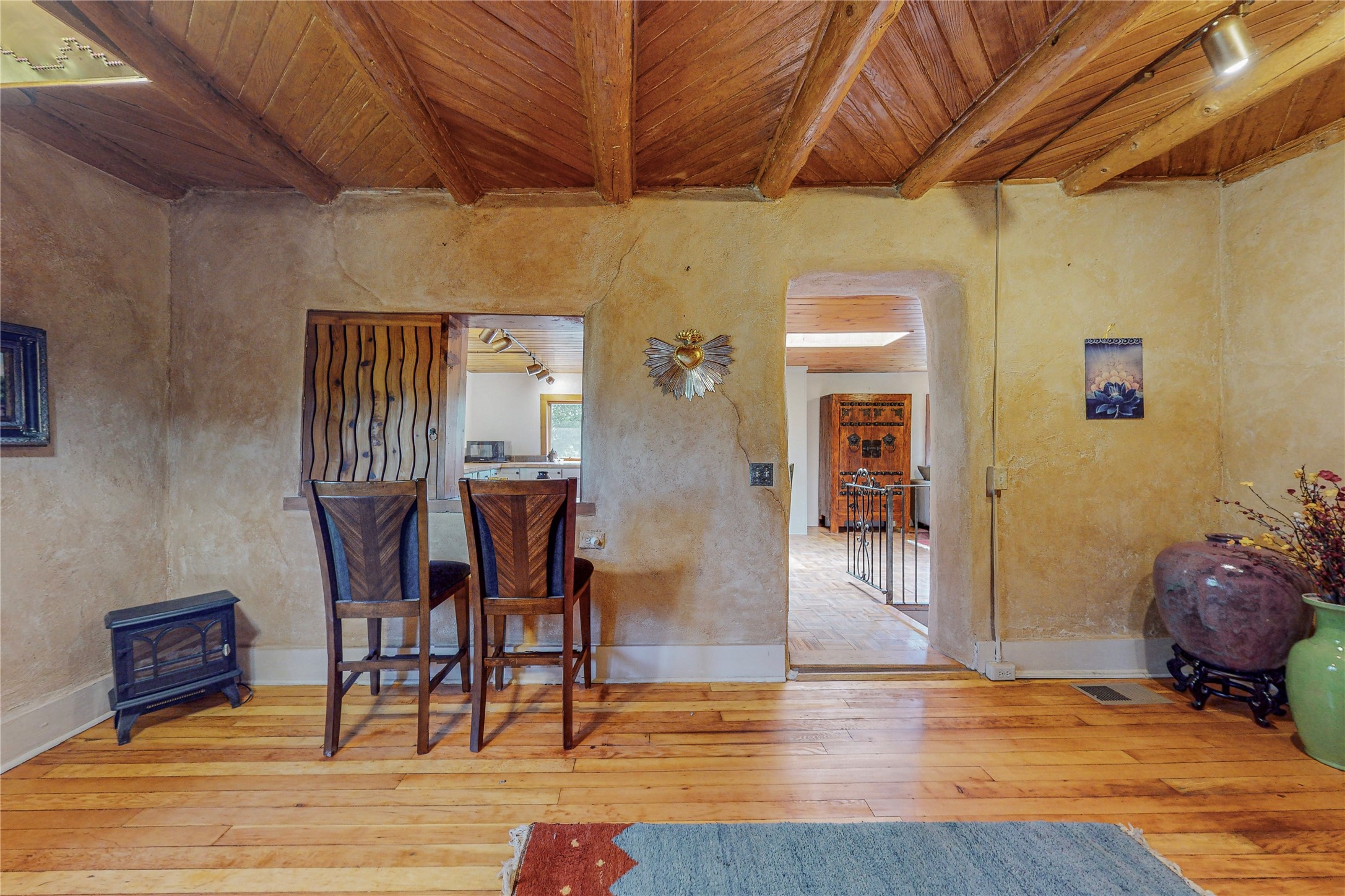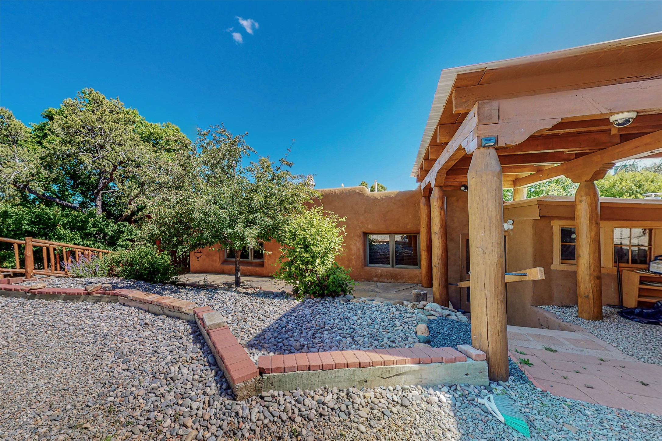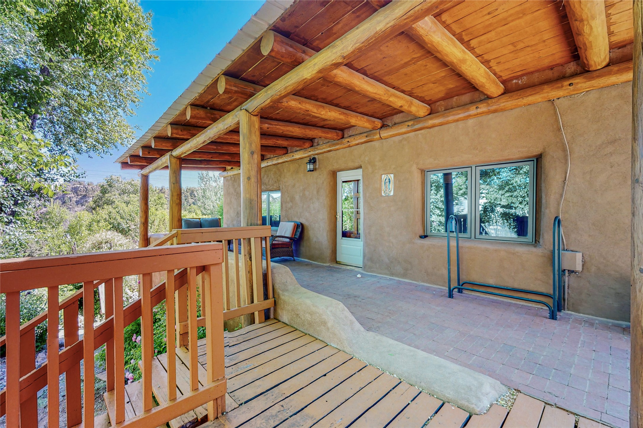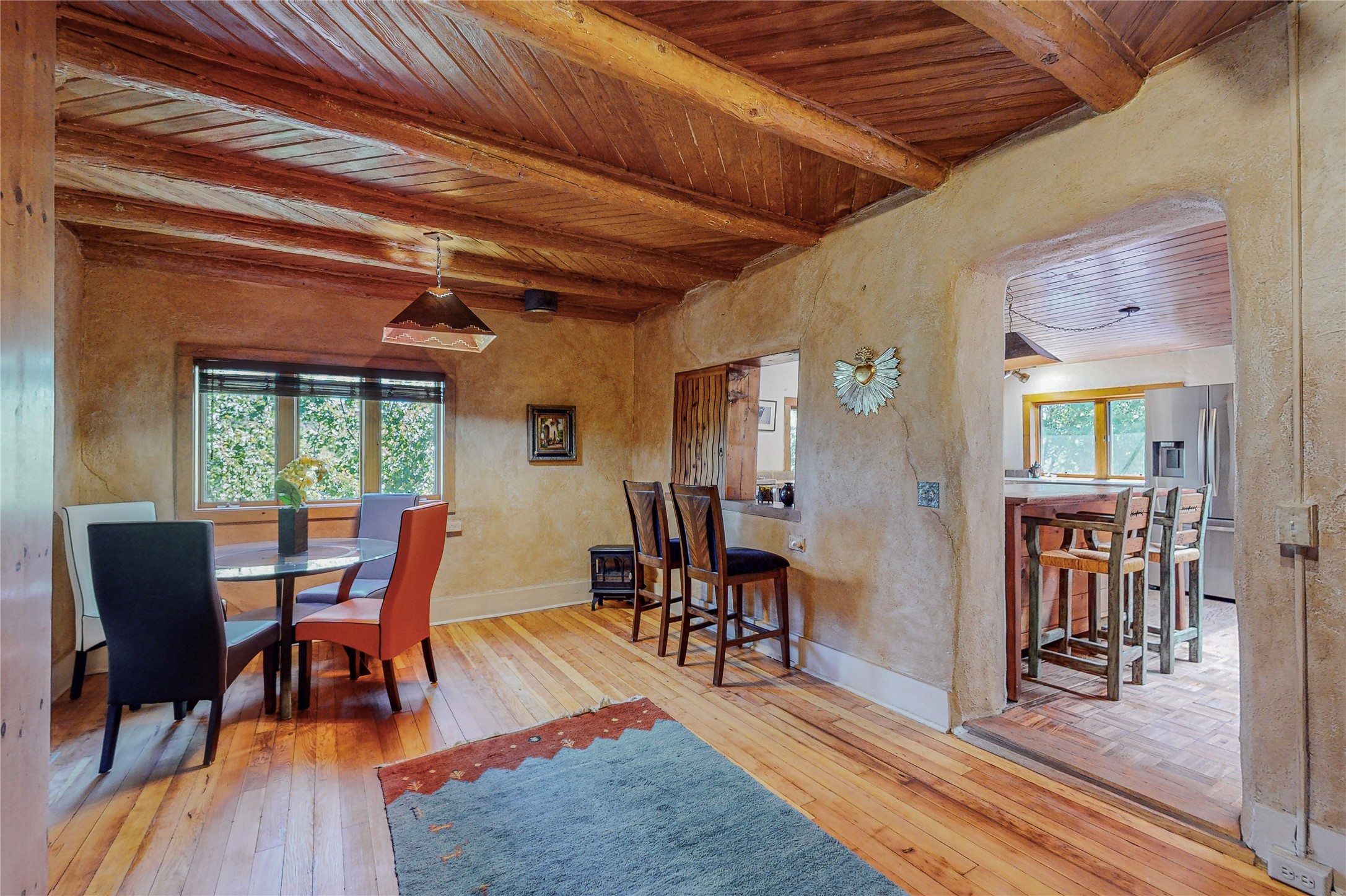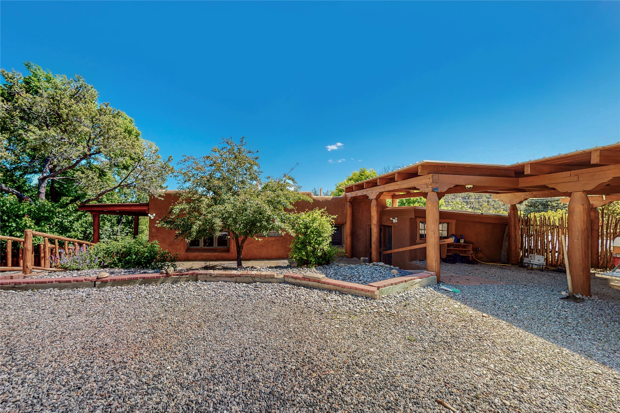 Classic Northern New Mexico style adobe gem listed for sale. The property features many upgrades including a fully fenced/walled lot with two access gates from paved NM Hwy 63, vigas and beams, tongue and groove ceilings, extensive landscaping, a fountain, an horno, a bricked terrace with great views, and a carport. Entering from the graveled driveway to covered porch overlooking one of the gardens and fountain one enters the home through a custom wooden door. The living room has recently sanded and sealed floors, corner kiva fireplace, views to the ridge above the Pecos River, bookshelf and openings to the office/2nd bedroom and dining room. The bathroom has be renovated and adjoins both bedrooms. The large recently remodeled country kitchen has stainless steel appliances - refrigerator/dishwasher/stove, copper sink, expansive seating area, new cabinets and adjoins the laundry room. There is a lower level with a den, bath, a small room that with a closet could be a bedroom or an office, separate entrance as well as a large unfinished "basement" for ample storage or renovation possibilities. There is radon mitigation in place. There is a stand alone shed/work shop that is a bonus. Come see this beautiful property today!