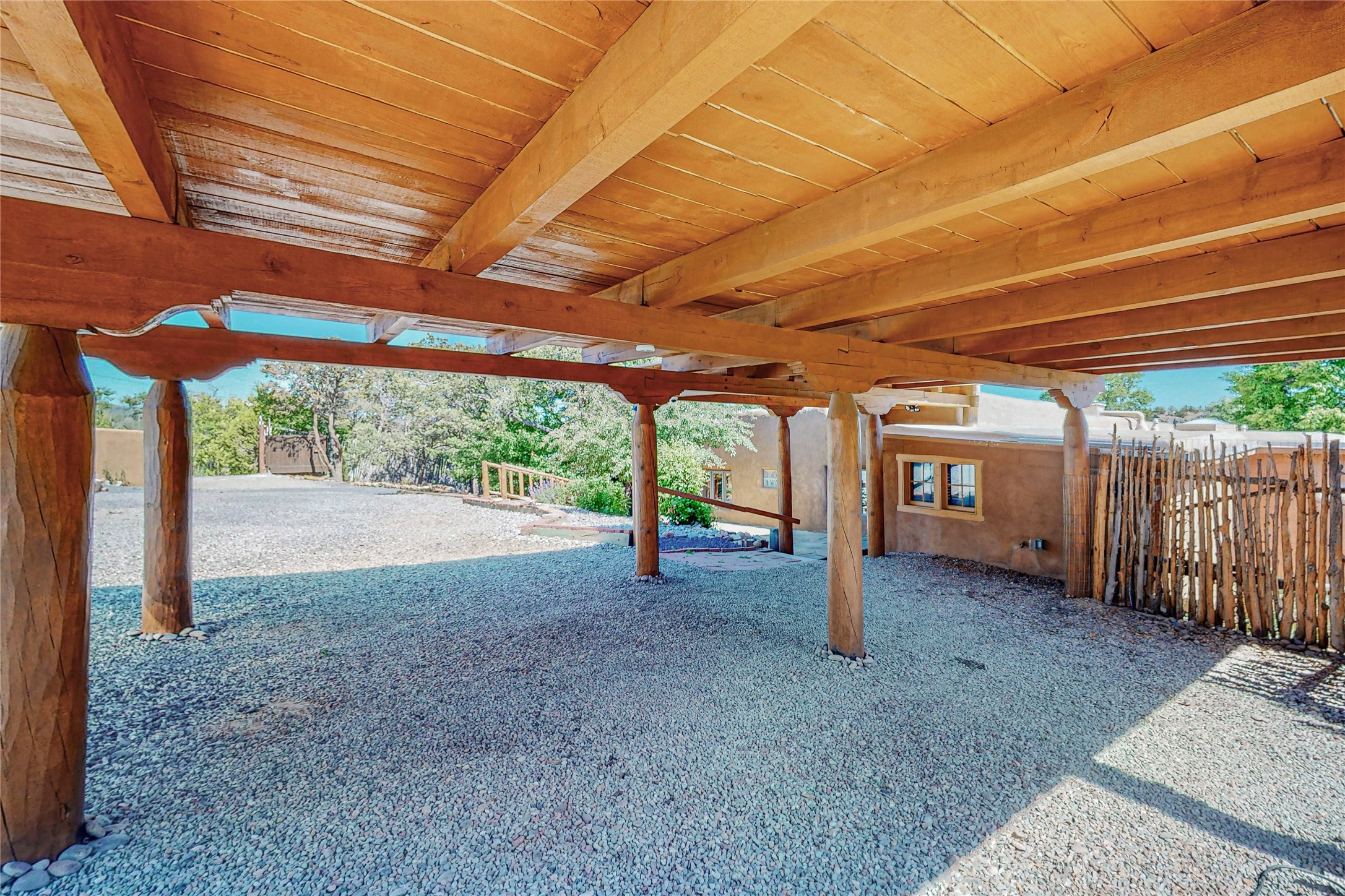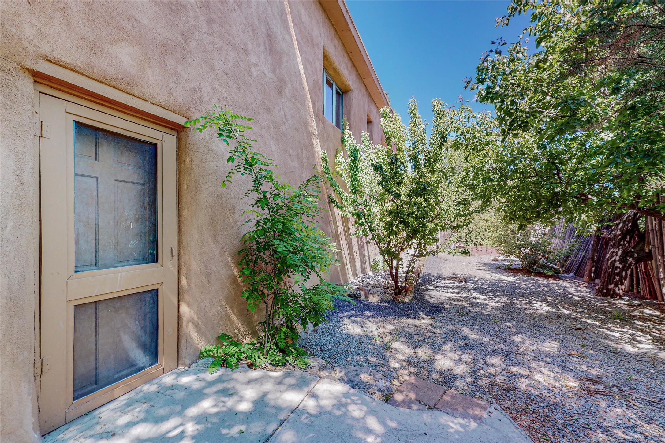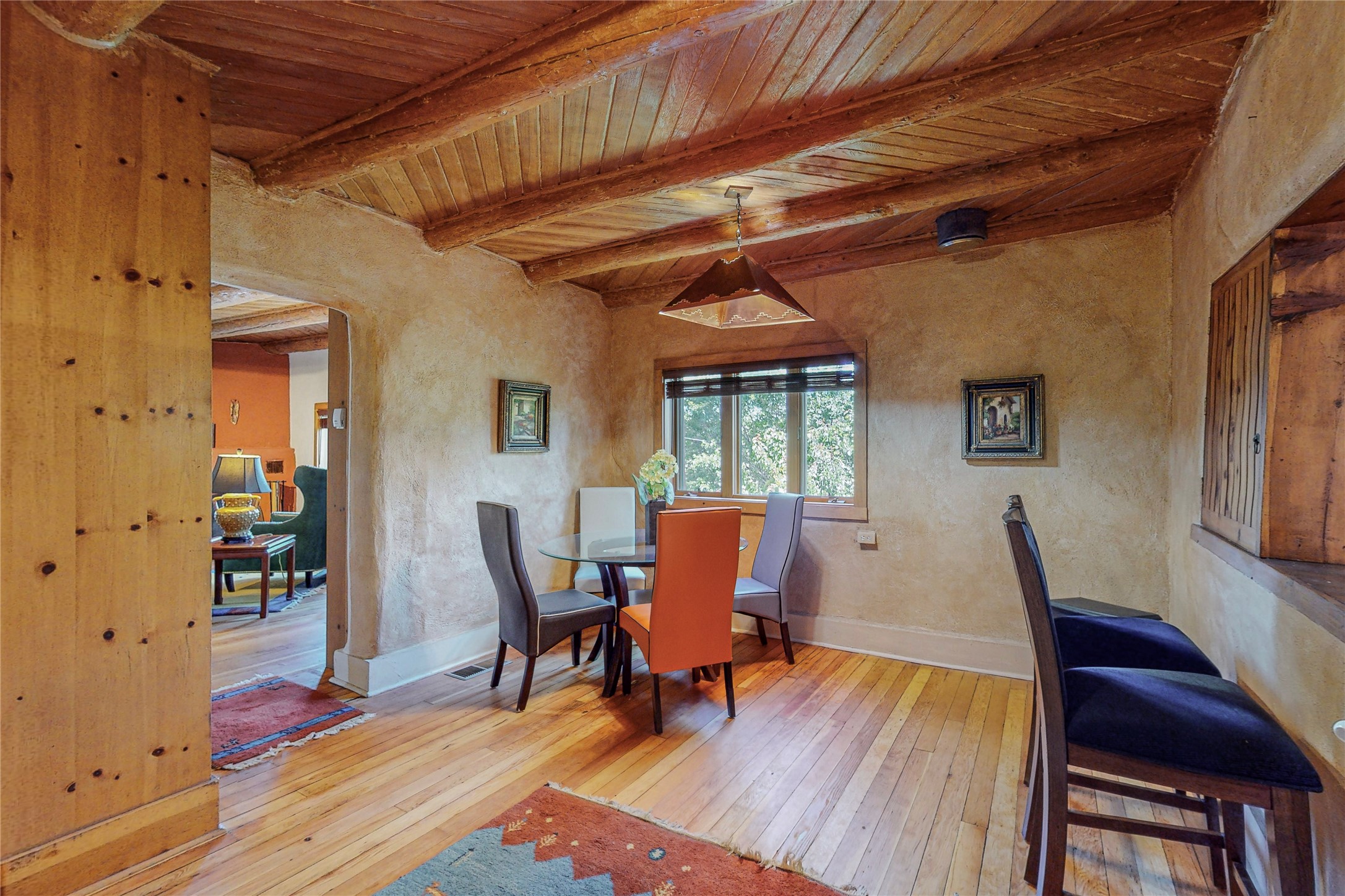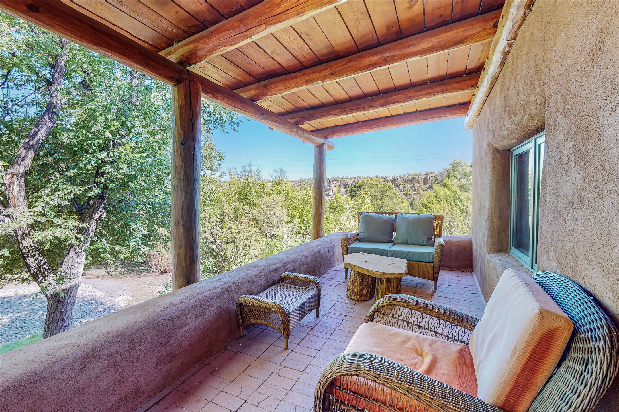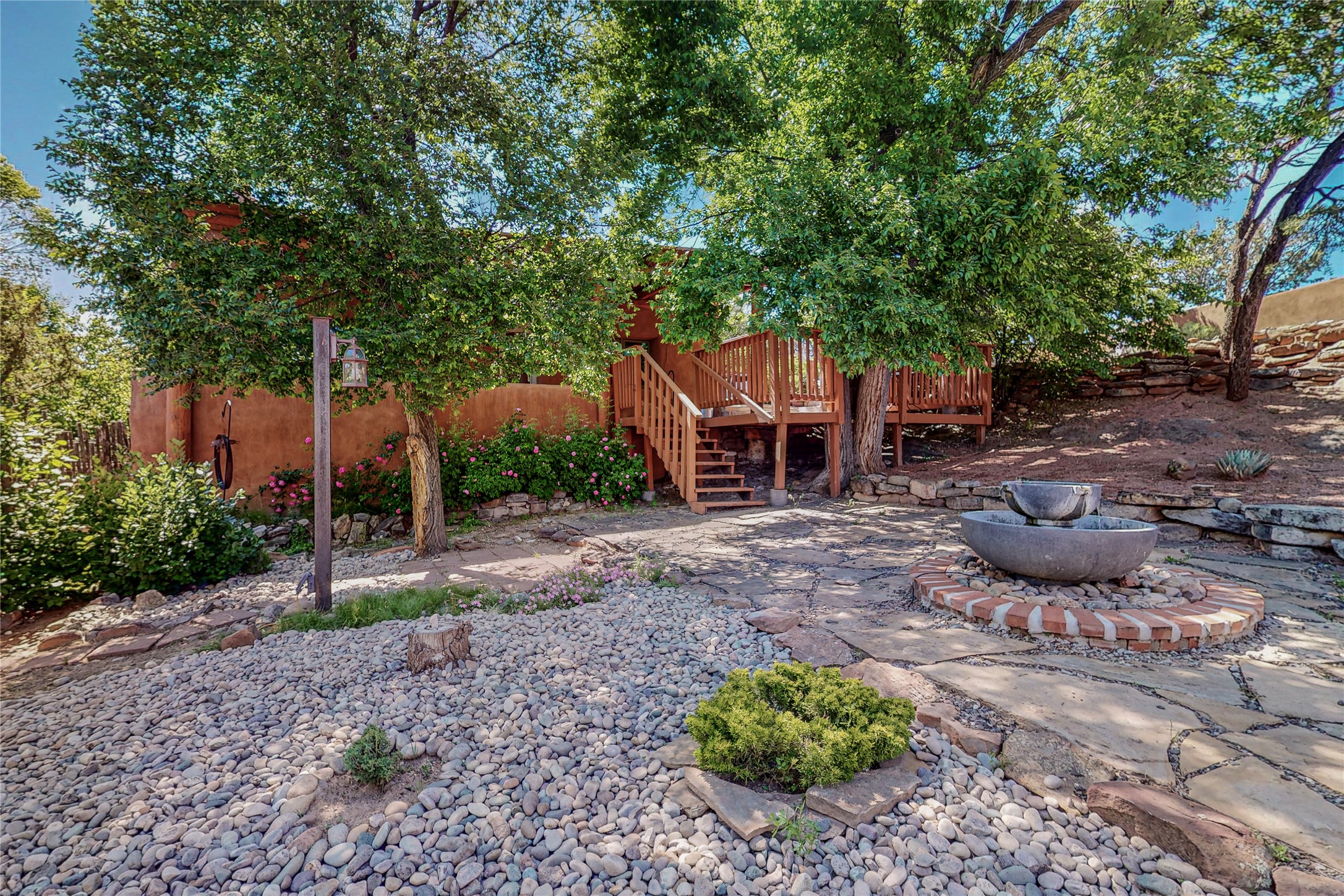 Classic Northern New Mexico style adobe gem listed for sale. The property features many upgrades including a fully fenced/walled lot with two access gates from paved NM Hwy 63, vigas and beams, tongue and groove ceilings, extensive landscaping, a fountain, an horno, a bricked terrace with great views, and a carport. Entering from the graveled driveway to covered porch overlooking one of the gardens and fountain one enters the home through a custom wooden door. The living room has recently sanded and sealed floors, corner kiva fireplace, views to the ridge above the Pecos River, bookshelf and openings to the office/2nd bedroom and dining room. The bathroom has be renovated and adjoins both bedrooms. The large recently remodeled country kitchen has stainless steel appliances - refrigerator/dishwasher/stove, copper sink, expansive seating area, new cabinets and adjoins the laundry room. There is a lower level with a den, bath, a small room that with a closet could be a bedroom or an office, separate entrance as well as a large unfinished "basement" for ample storage or renovation possibilities. There is radon mitigation in place. There is a stand alone shed/work shop that is a bonus. Come see this beautiful property today!