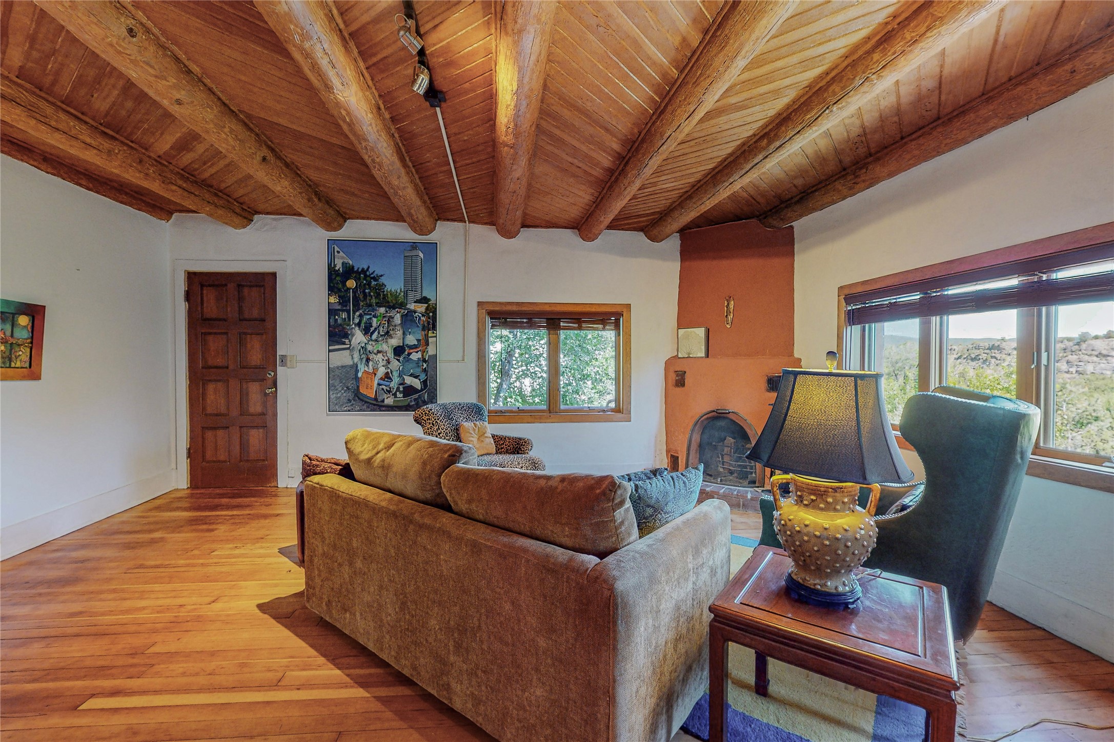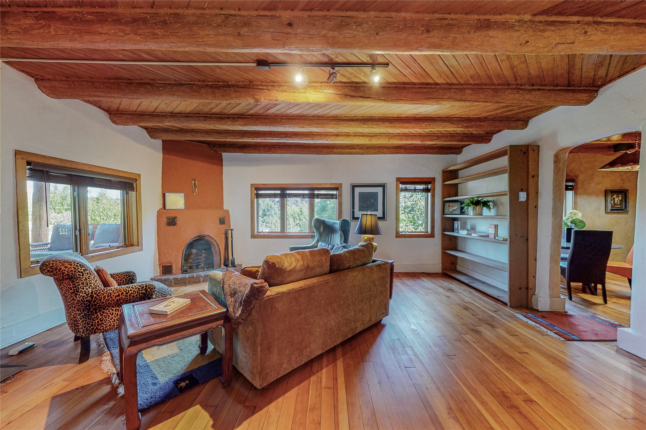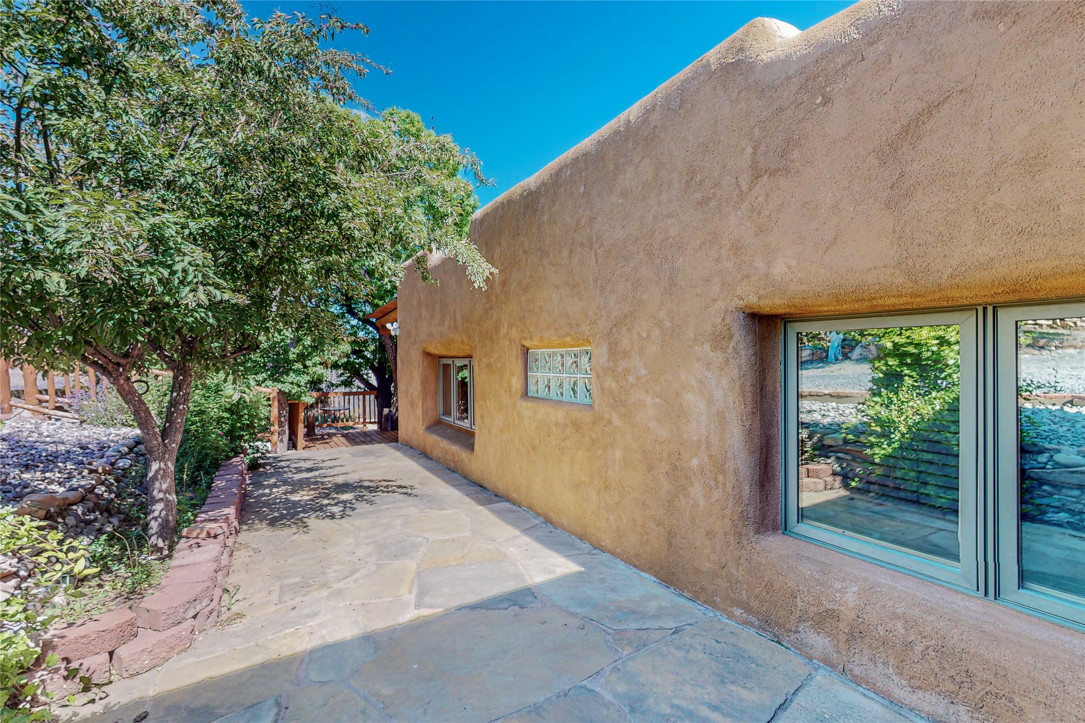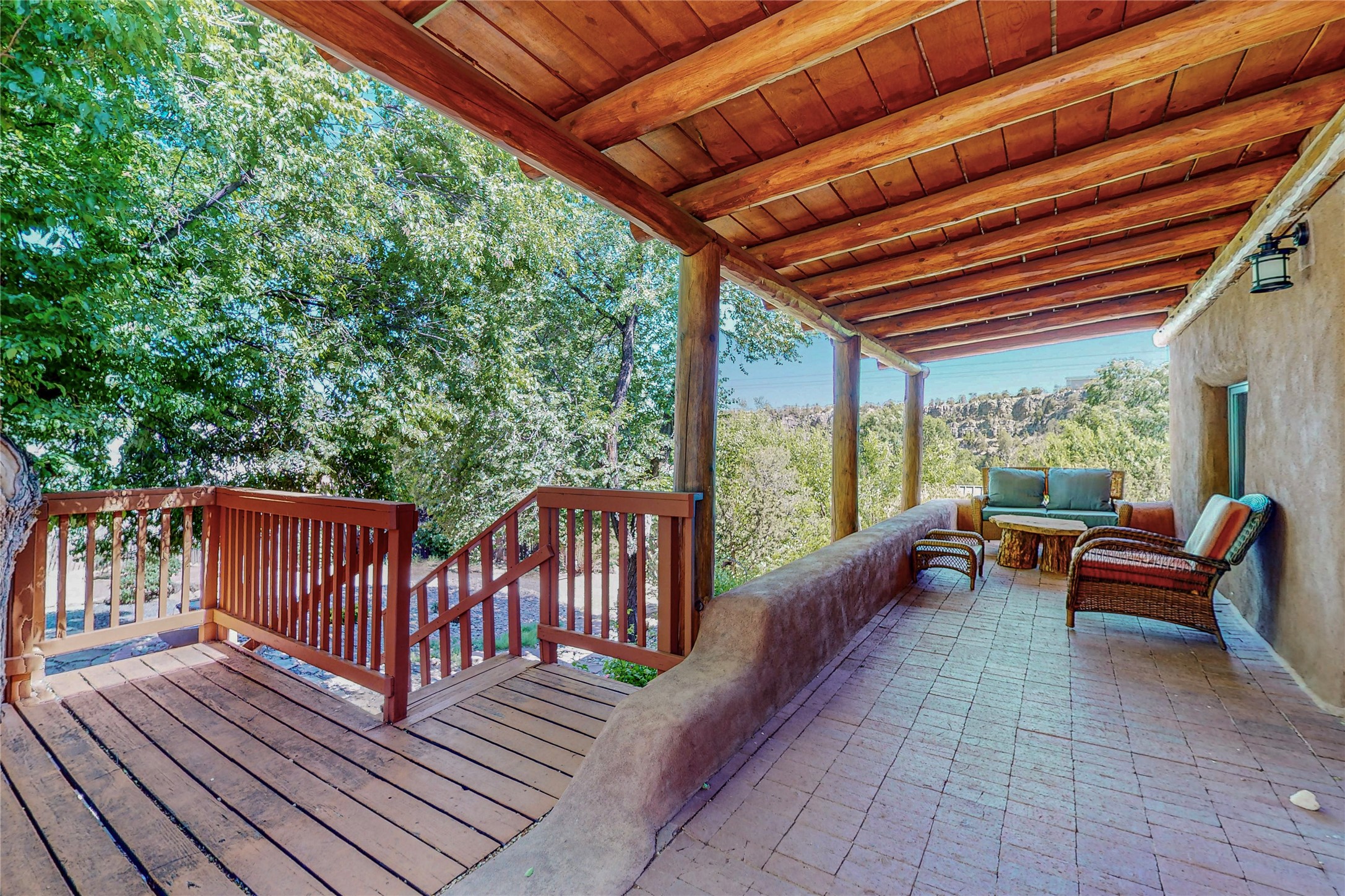 Classic Northern New Mexico style adobe gem listed for sale. The property features many upgrades including a fully fenced/walled lot with two access gates from paved NM Hwy 63, vigas and beams, tongue and groove ceilings, extensive landscaping, a fountain, an horno, a bricked terrace with great views, and a carport. Entering from the graveled driveway to covered porch overlooking one of the gardens and fountain one enters the home through a custom wooden door. The living room has recently sanded and sealed floors, corner kiva fireplace, views to the ridge above the Pecos River, bookshelf and openings to the office/2nd bedroom and dining room. The bathroom has be renovated and adjoins both bedrooms. The large recently remodeled country kitchen has stainless steel appliances - refrigerator/dishwasher/stove, copper sink, expansive seating area, new cabinets and adjoins the laundry room. There is a lower level with a den, bath, a small room that with a closet could be a bedroom or an office, separate entrance as well as a large unfinished "basement" for ample storage or renovation possibilities. There is radon mitigation in place. There is a stand alone shed/work shop that is a bonus. Come see this beautiful property today!