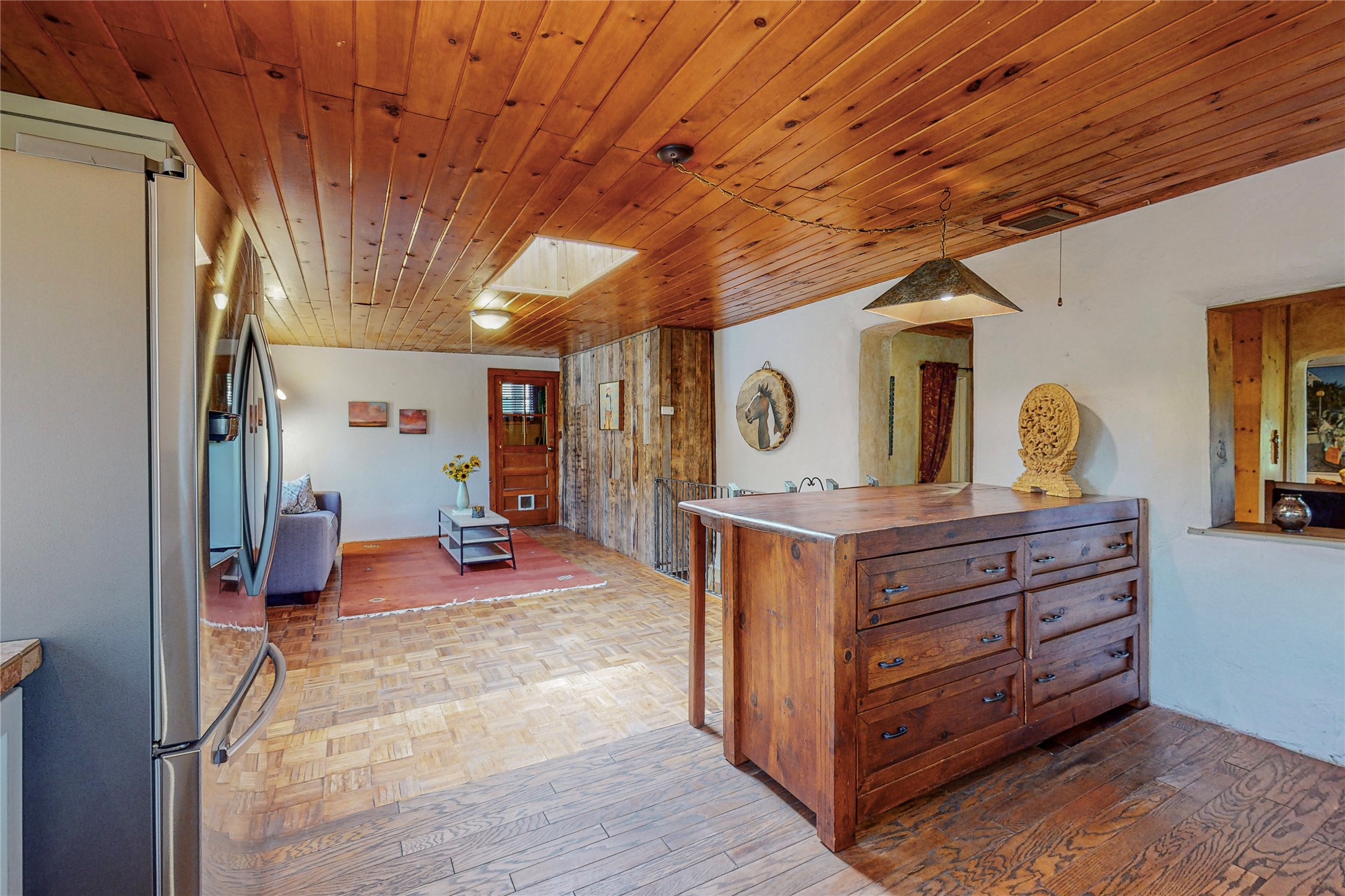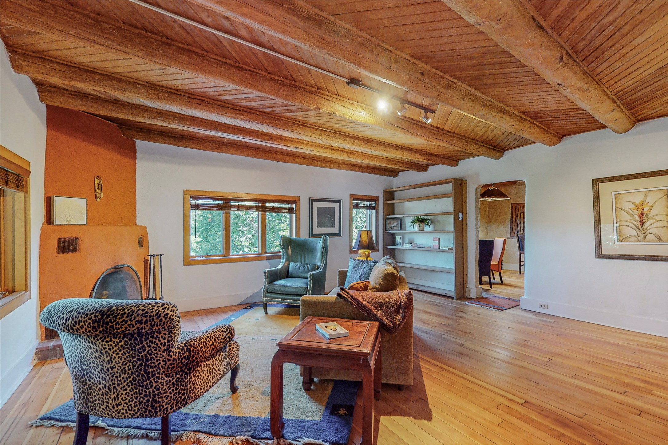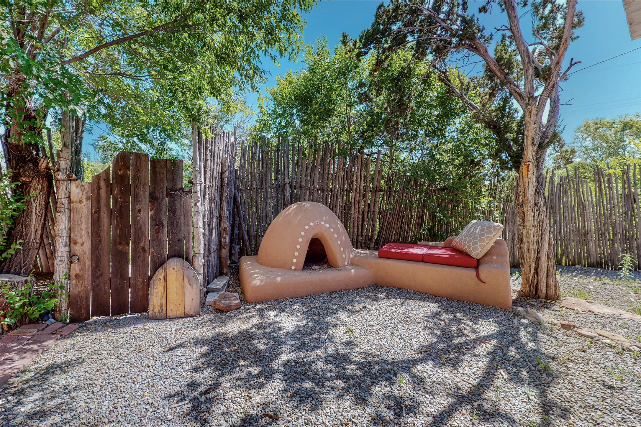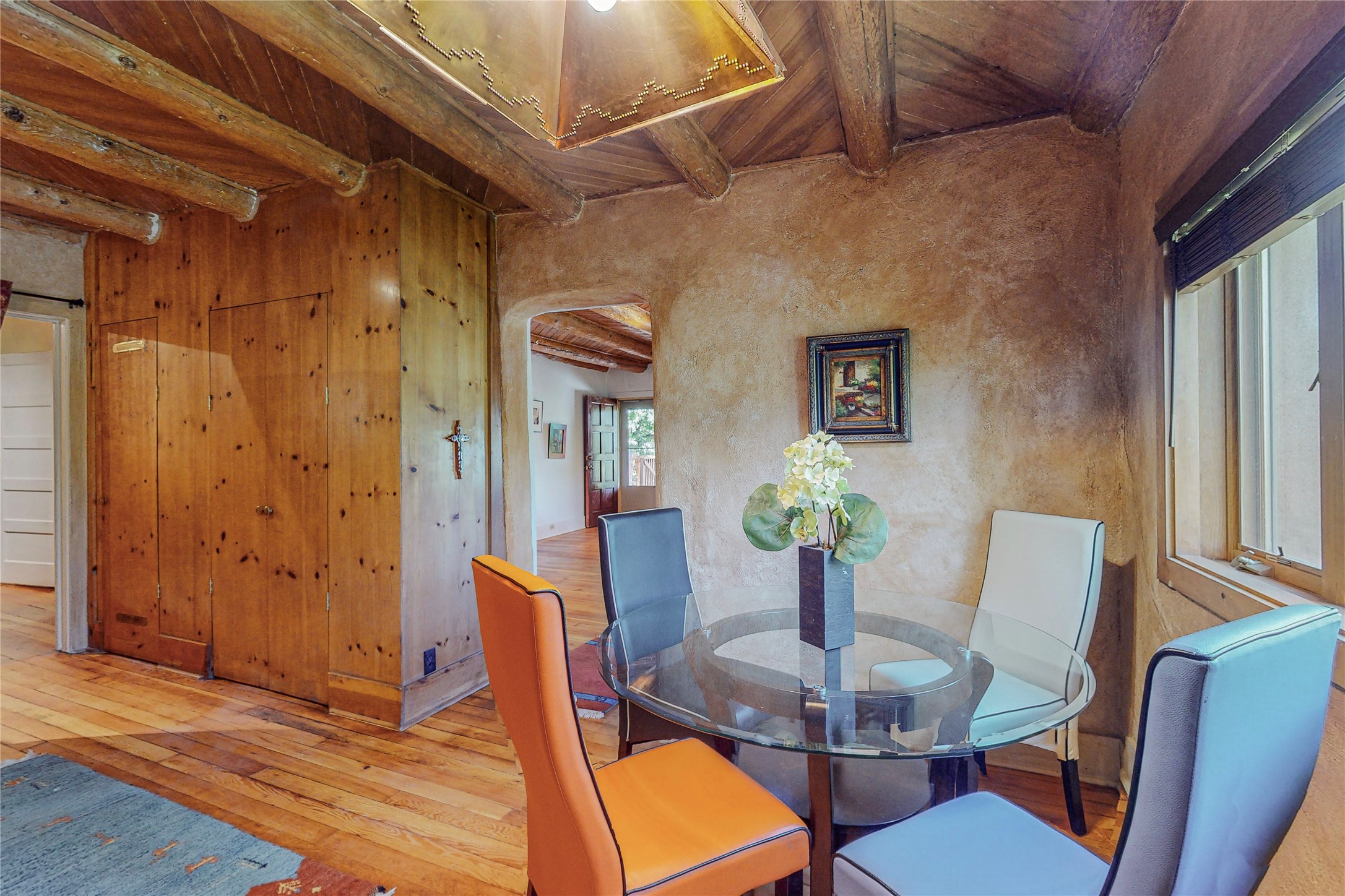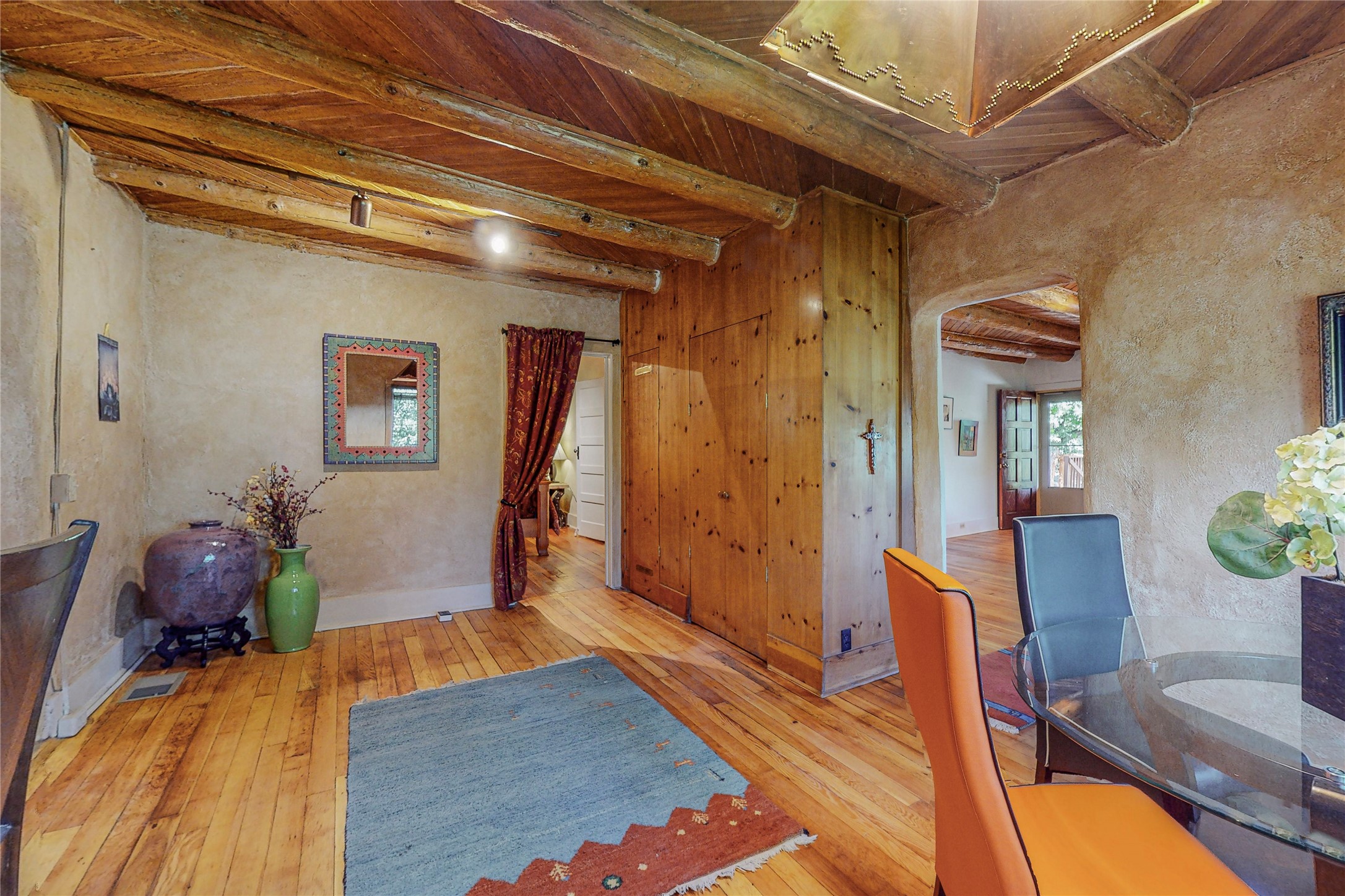 Classic Northern New Mexico style adobe gem listed for sale. The property features many upgrades including a fully fenced/walled lot with two access gates from paved NM Hwy 63, vigas and beams, tongue and groove ceilings, extensive landscaping, a fountain, an horno, a bricked terrace with great views, and a carport. Entering from the graveled driveway to covered porch overlooking one of the gardens and fountain one enters the home through a custom wooden door. The living room has recently sanded and sealed floors, corner kiva fireplace, views to the ridge above the Pecos River, bookshelf and openings to the office/2nd bedroom and dining room. The bathroom has be renovated and adjoins both bedrooms. The large recently remodeled country kitchen has stainless steel appliances - refrigerator/dishwasher/stove, copper sink, expansive seating area, new cabinets and adjoins the laundry room. There is a lower level with a den, bath, a small room that with a closet could be a bedroom or an office, separate entrance as well as a large unfinished "basement" for ample storage or renovation possibilities. There is radon mitigation in place. There is a stand alone shed/work shop that is a bonus. Come see this beautiful property today!